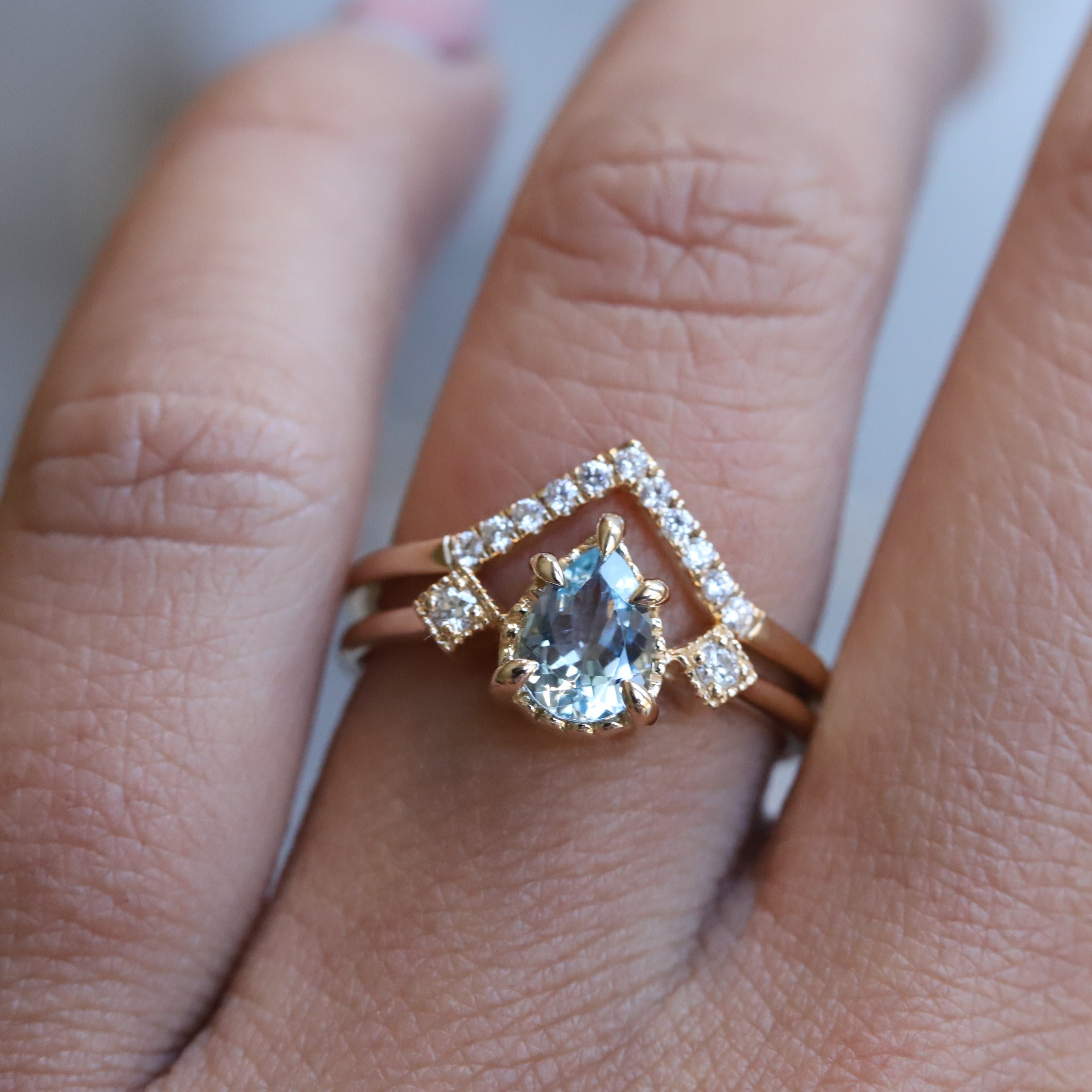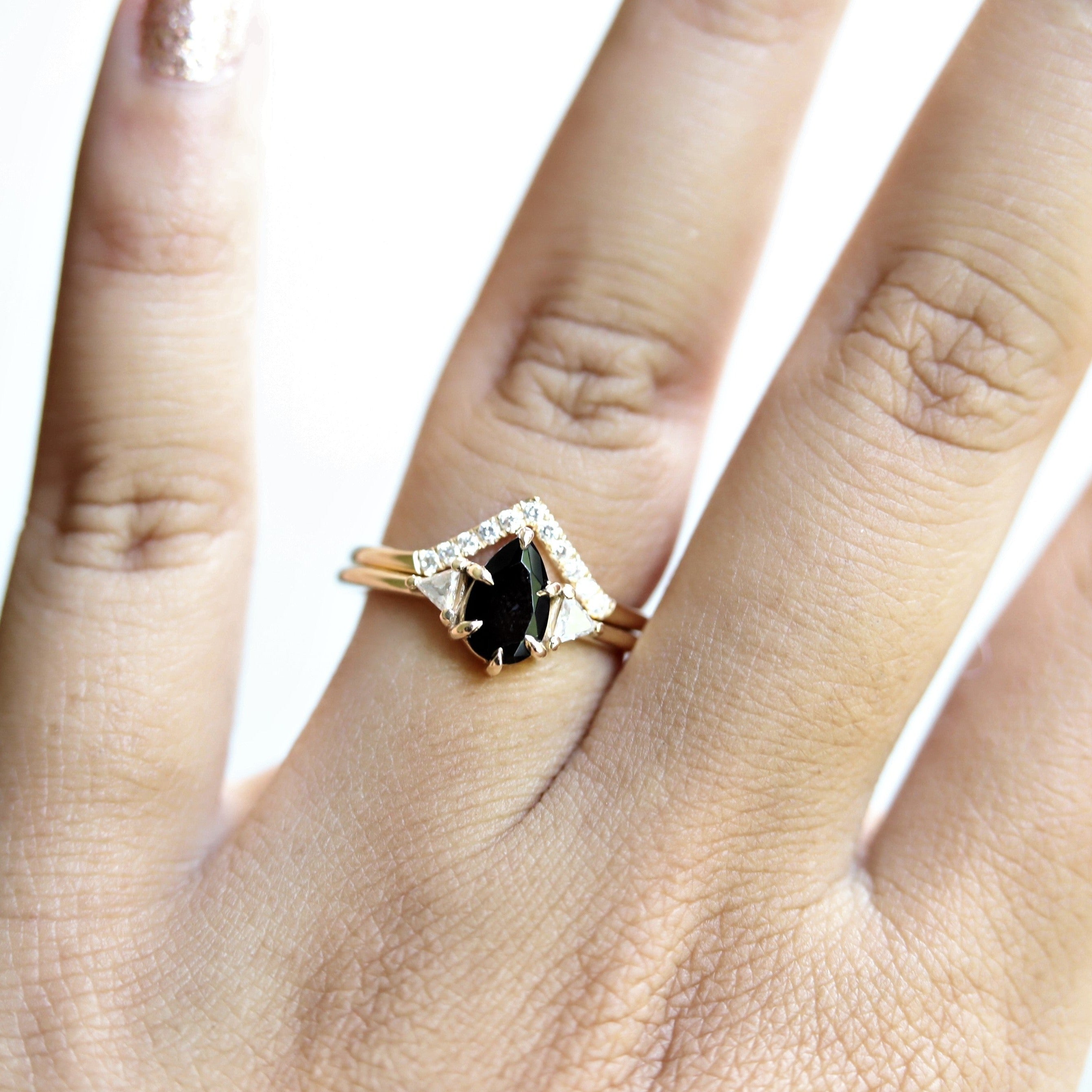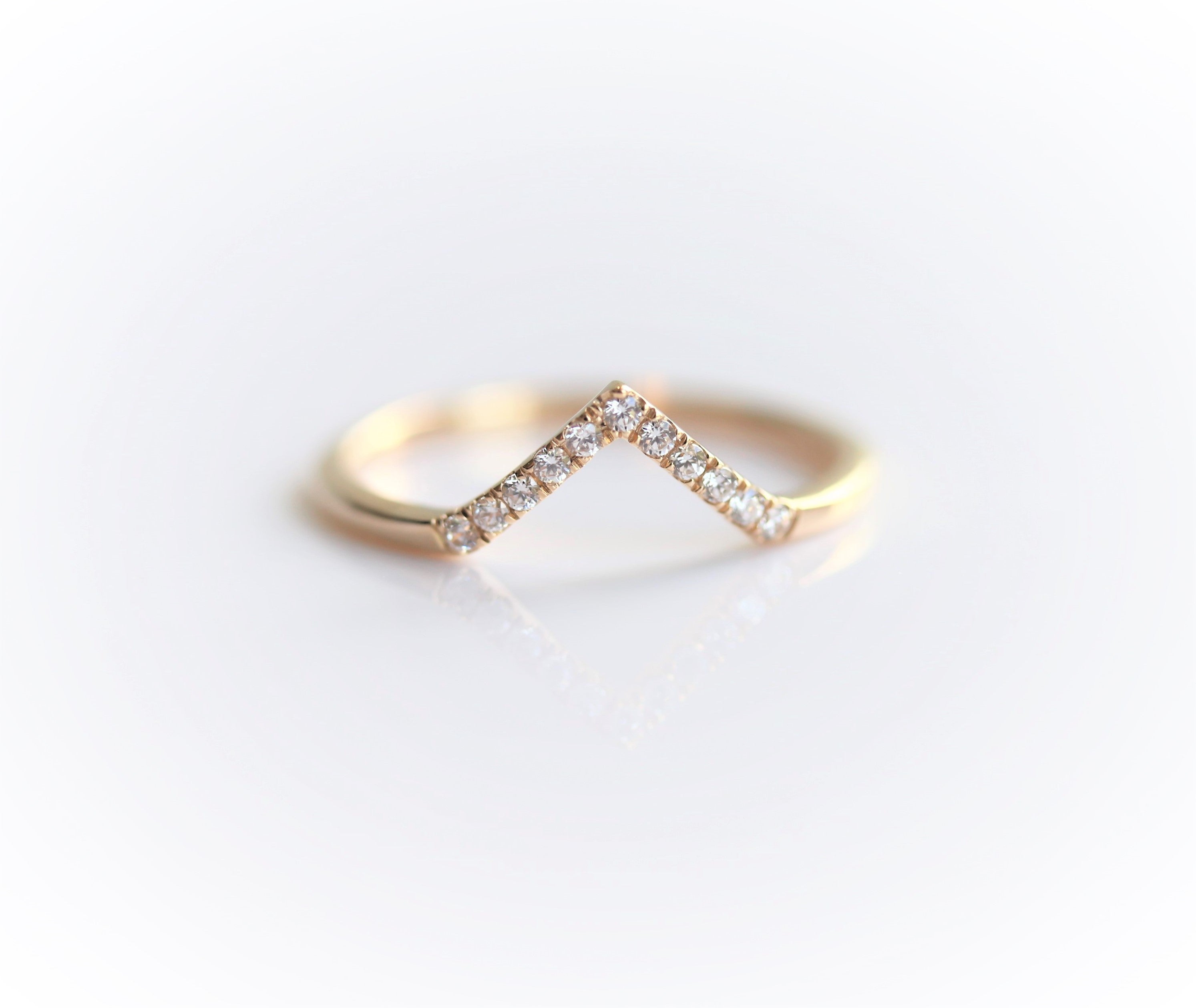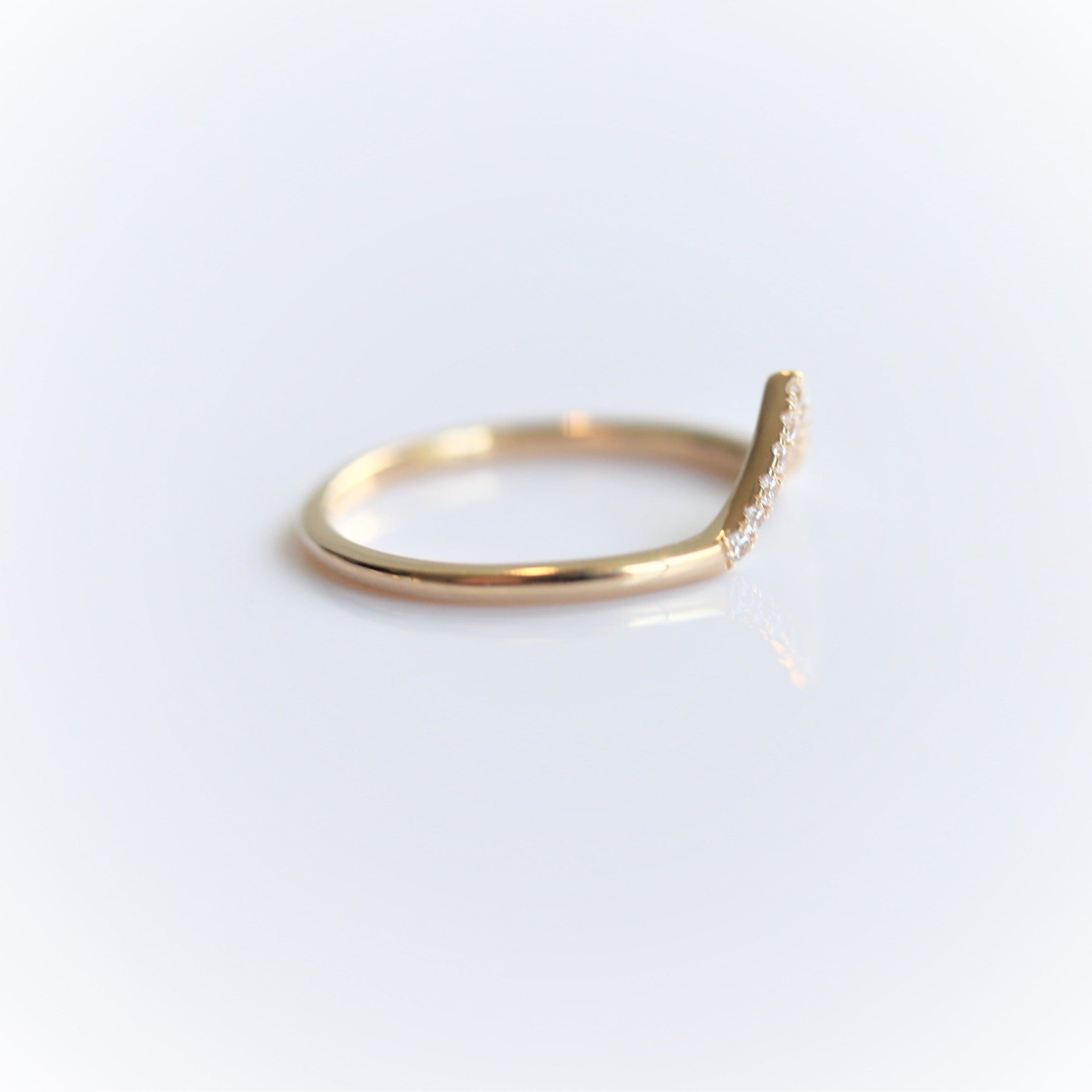 A wedding band set with pavé diamonds on a slim v-shape band. Whether nestle your Alexis Pear Shaped Ring or stack it for a dazzling statement with your pear-shaped engagement ring.