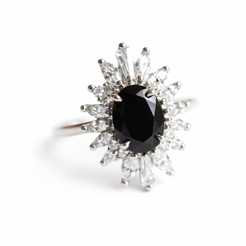 Liana – A unique beauty with a distinctive Art Deco feel, this ring features an oval black onyx stone in a four-prong setting, surrounded by glittering tapered baguette, marquise & round stones of your choice. This ring can be customized with the metal of your choice, making it the perfect fit for any occasion, anniversary, birthday, or engagement.