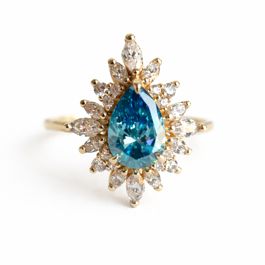 A sparkling blue lab-grown diamond surrounded by a halo of sparkling ✨marquise & round stones of your choice. The center stone is secured in a four-prong setting in the center, framed by a glittering cluster of sparkling side diamonds. Created on a graceful, slim band for a dainty look and comfortable wear. The setting sits on top of the band, allowing a straight wedding band to nest against it for a perfect stack. This handcrafted ring is perfect for engagements, anniversaries, or birthdays, It will surely be treasured for years to come.