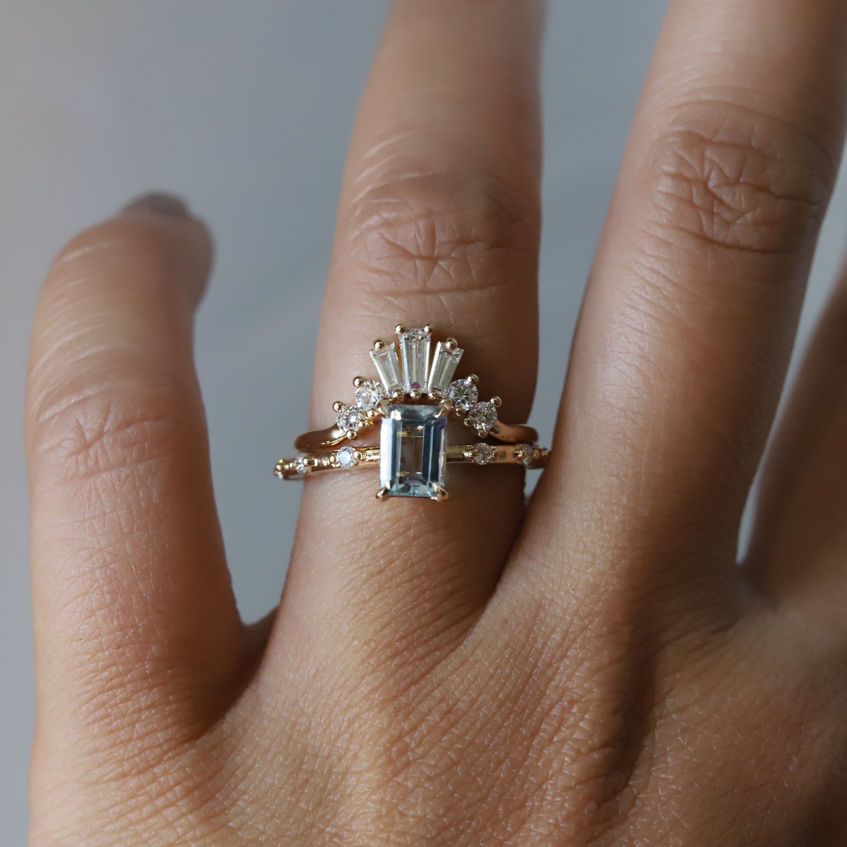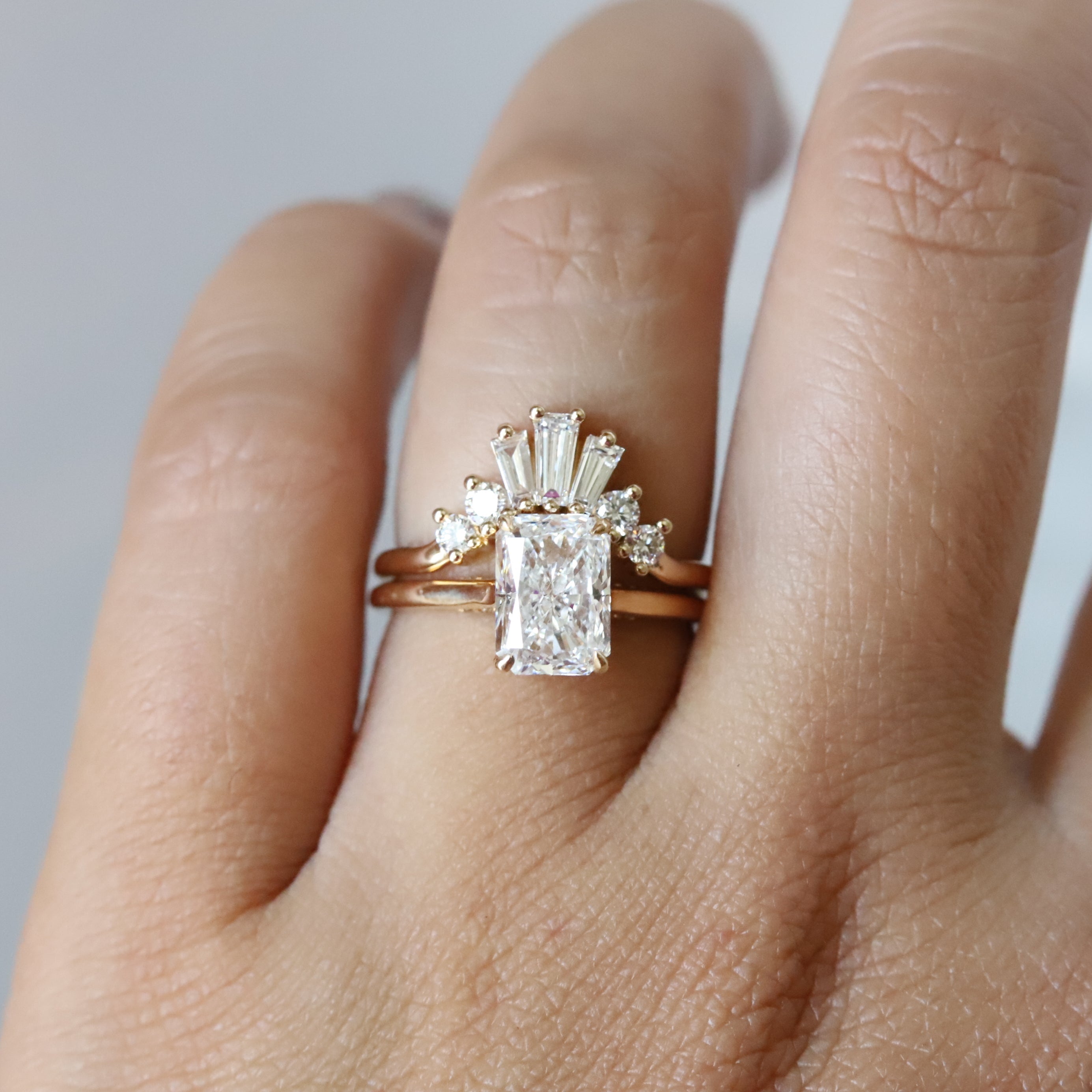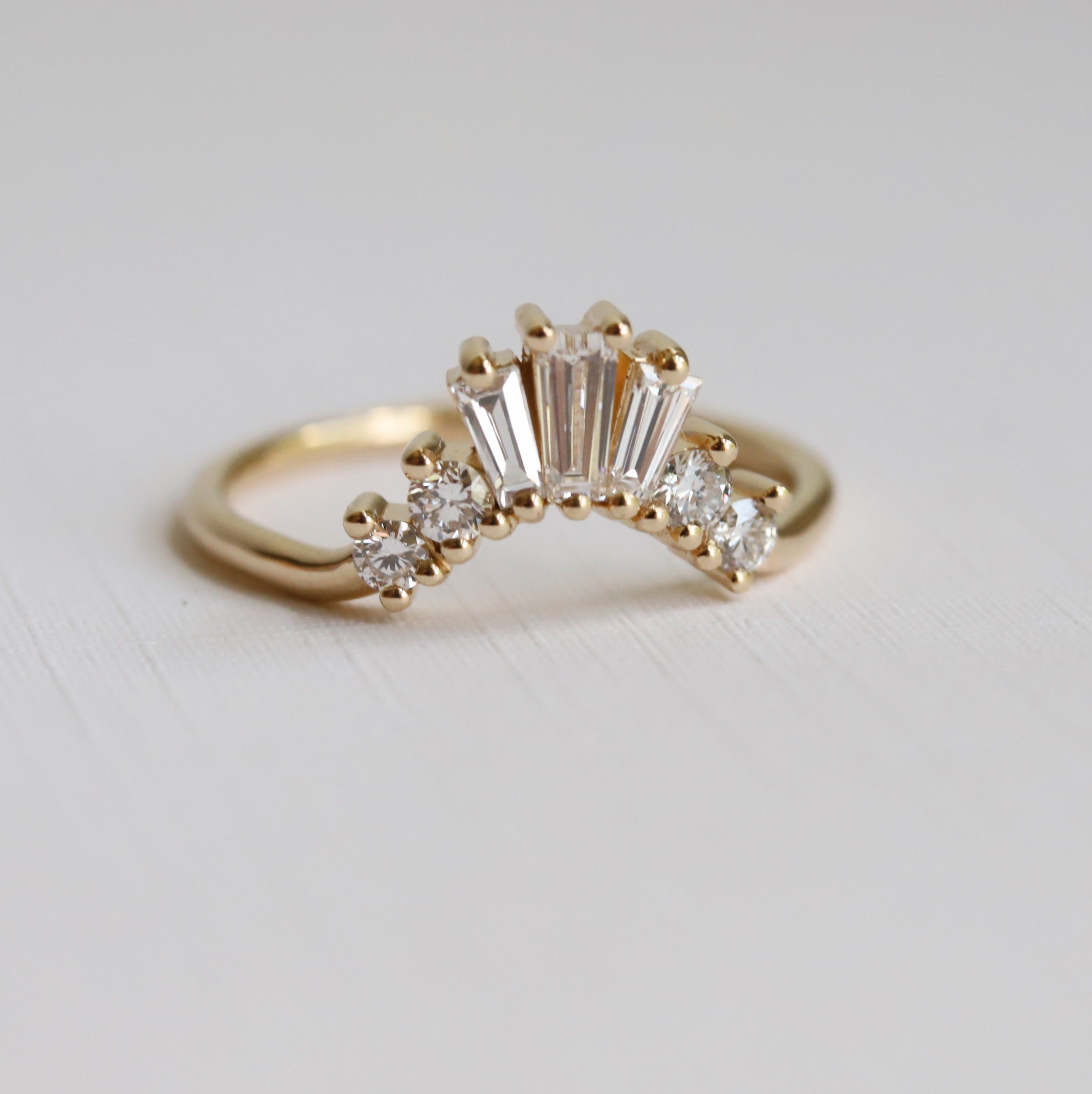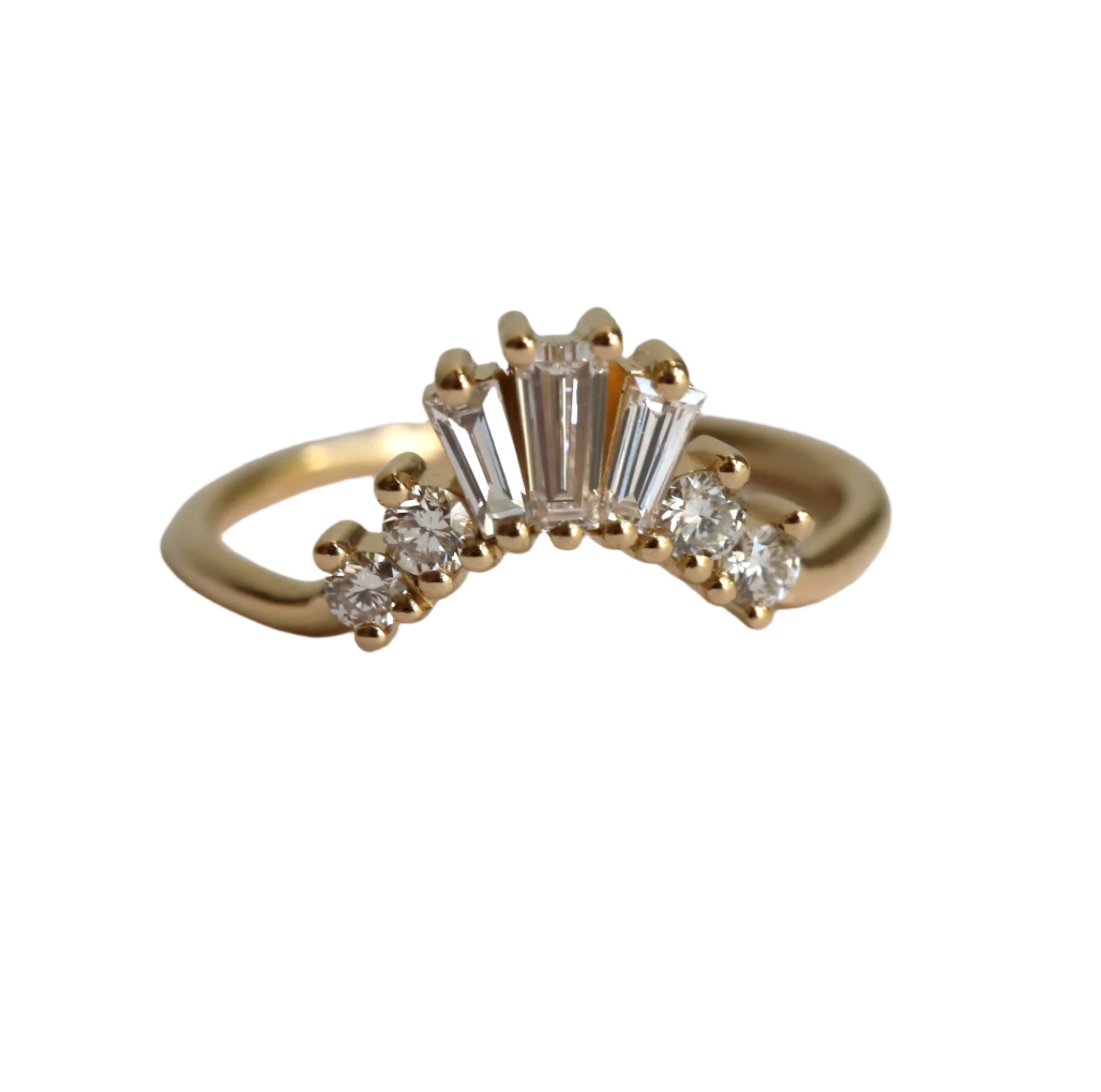 The Empress Crown No.9 is a striking contour band designed to complement substantial center stones of 1.5 carats or larger. Featuring an elegant combination of round and tapered baguette-shaped stones, this statement piece creates a dramatic, layered effect that enhances the brilliance of your focal diamond. The sophisticated architecture of this band makes it an ideal choice for those seeking a bold, coordinated look that elevates any engagement ring setting.