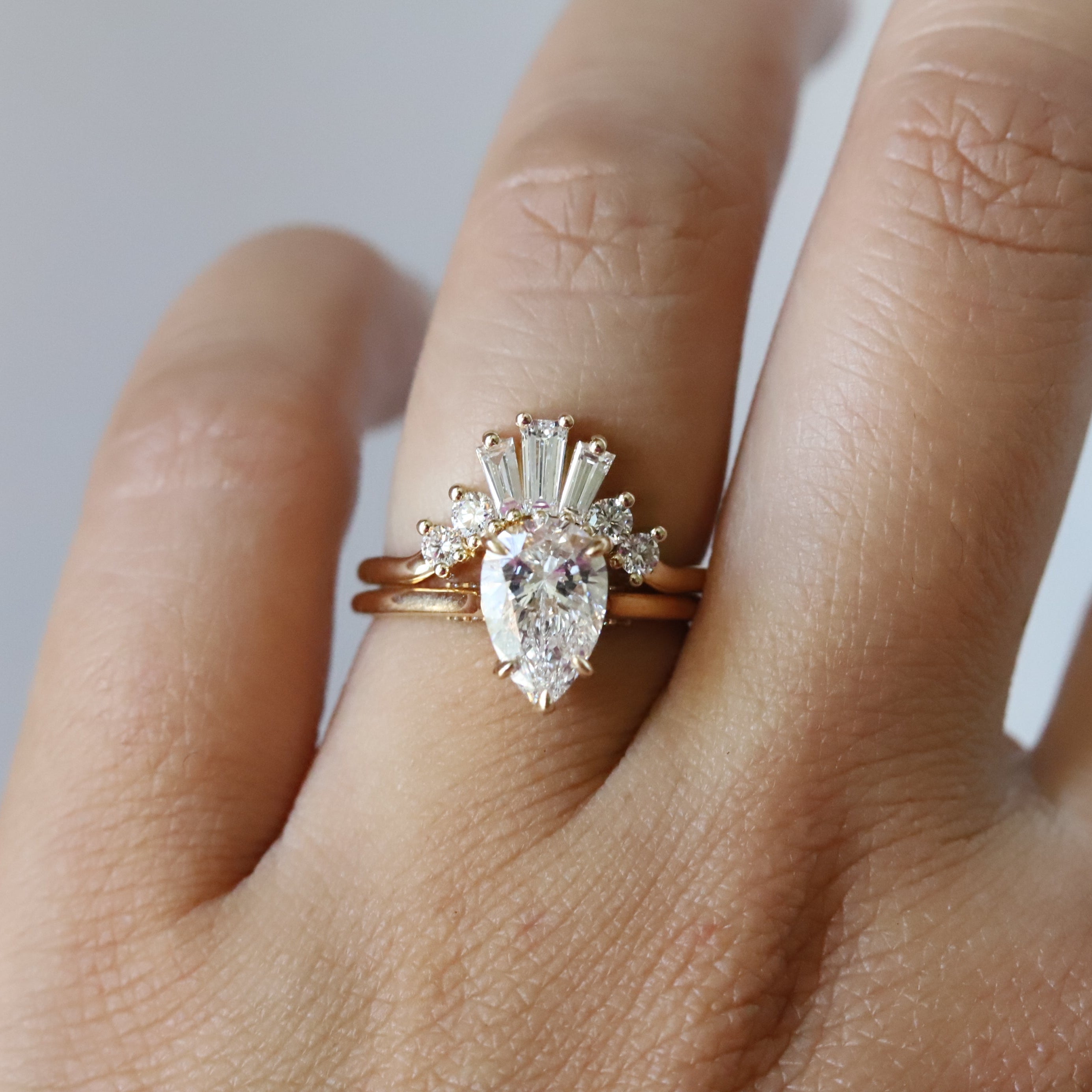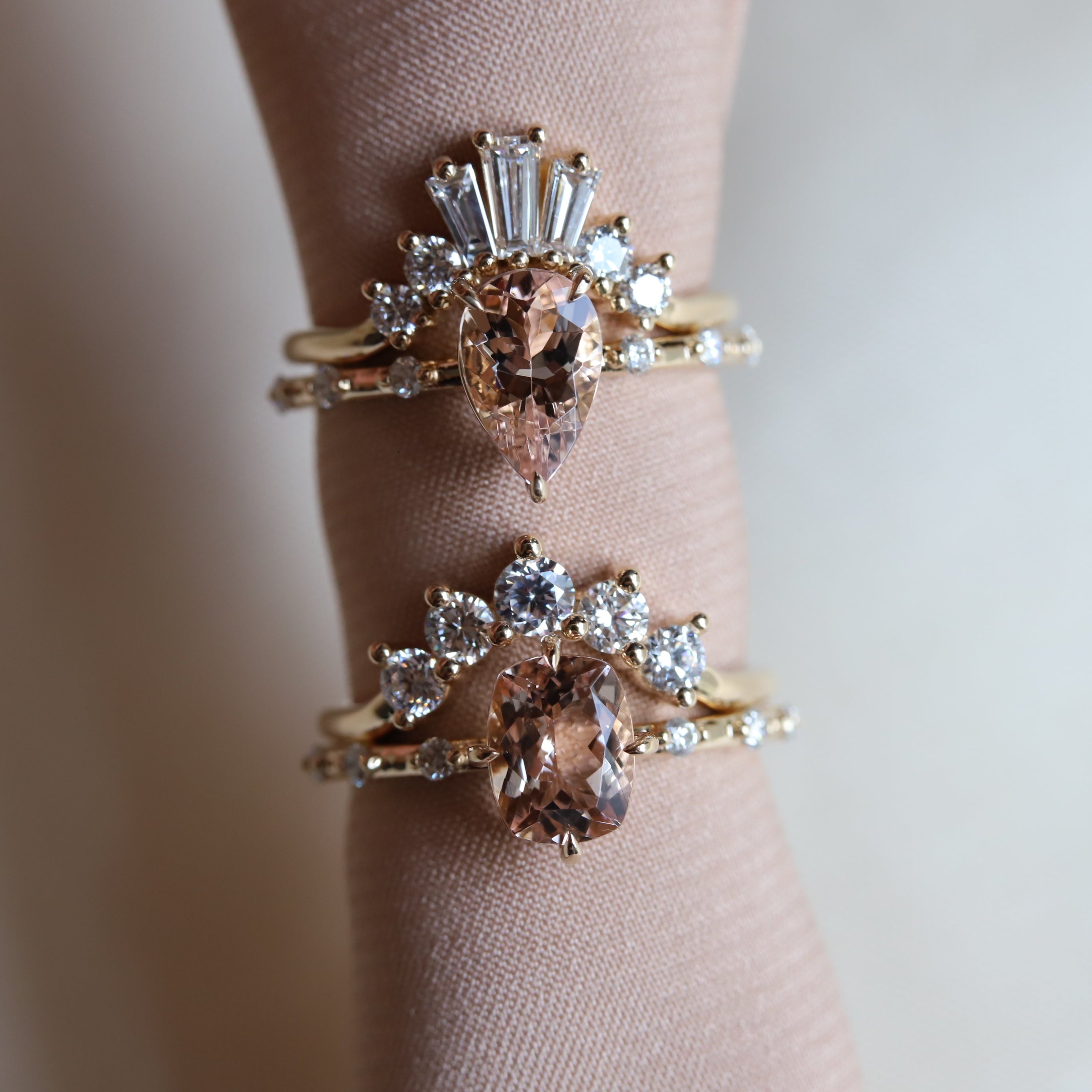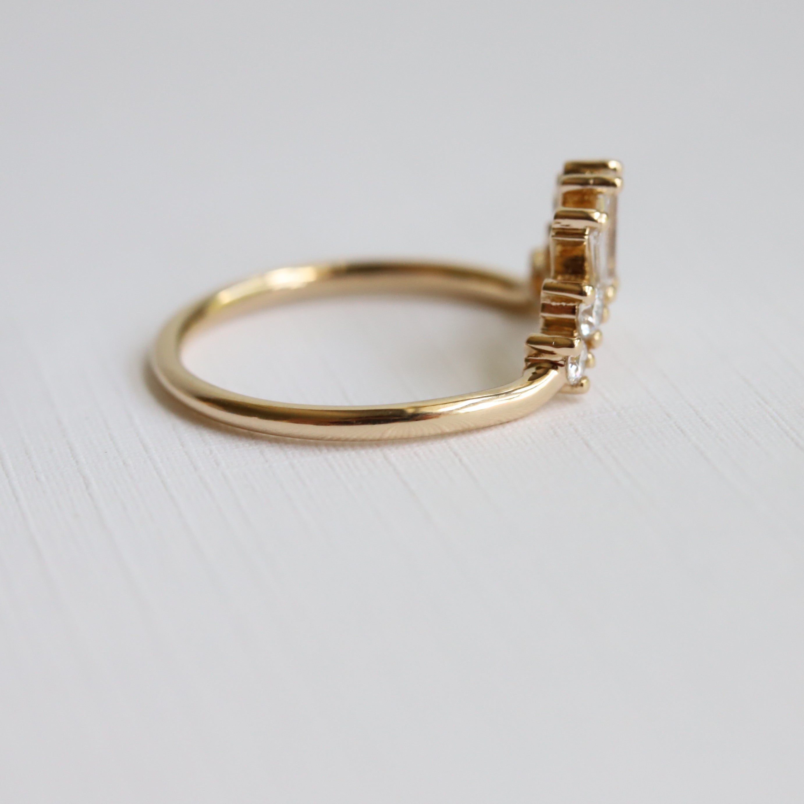 The Empress Crown No.9 is a striking contour band designed to complement substantial center stones of 1.5 carats or larger. Featuring an elegant combination of round and tapered baguette-shaped stones, this statement piece creates a dramatic, layered effect that enhances the brilliance of your focal diamond. The sophisticated architecture of this band makes it an ideal choice for those seeking a bold, coordinated look that elevates any engagement ring setting.