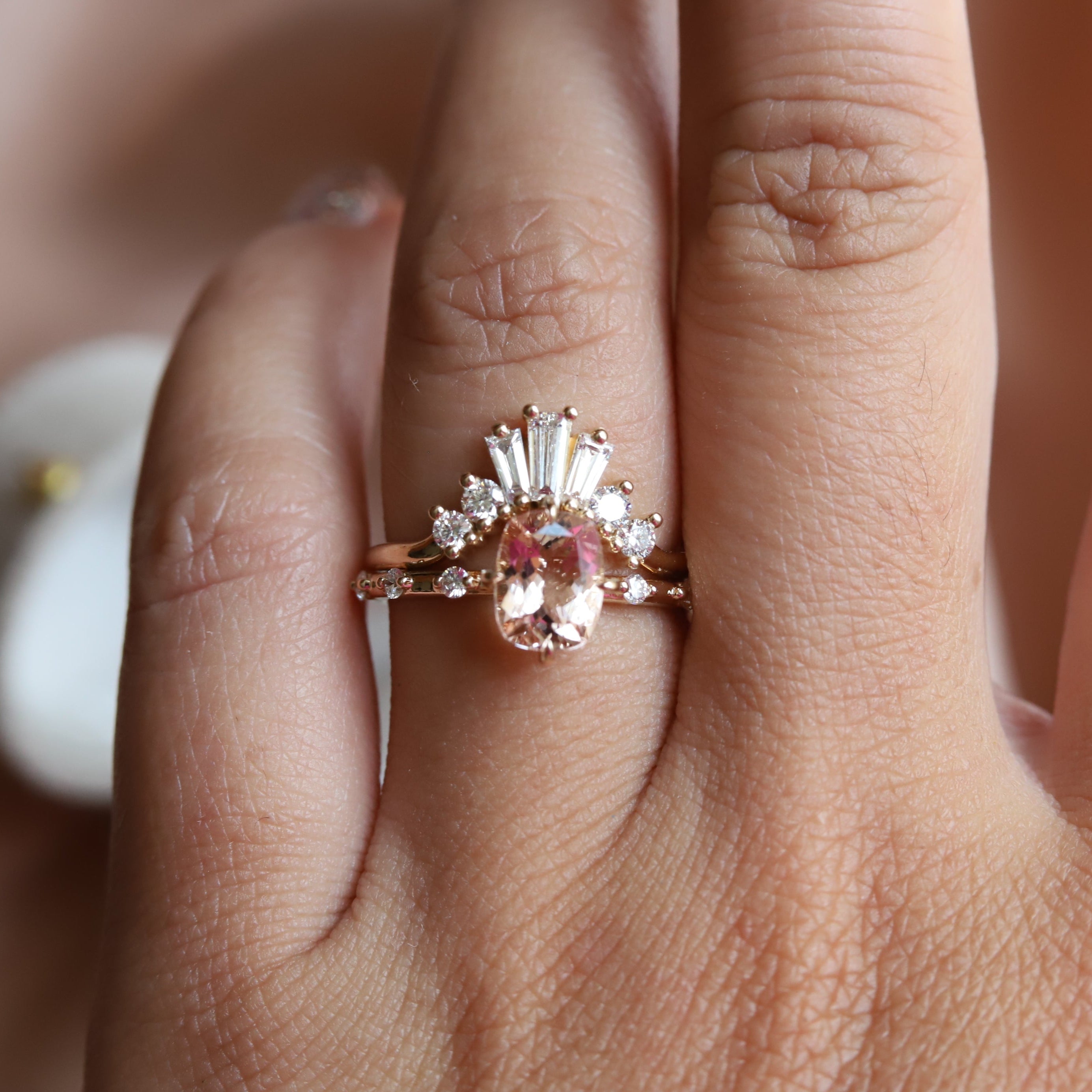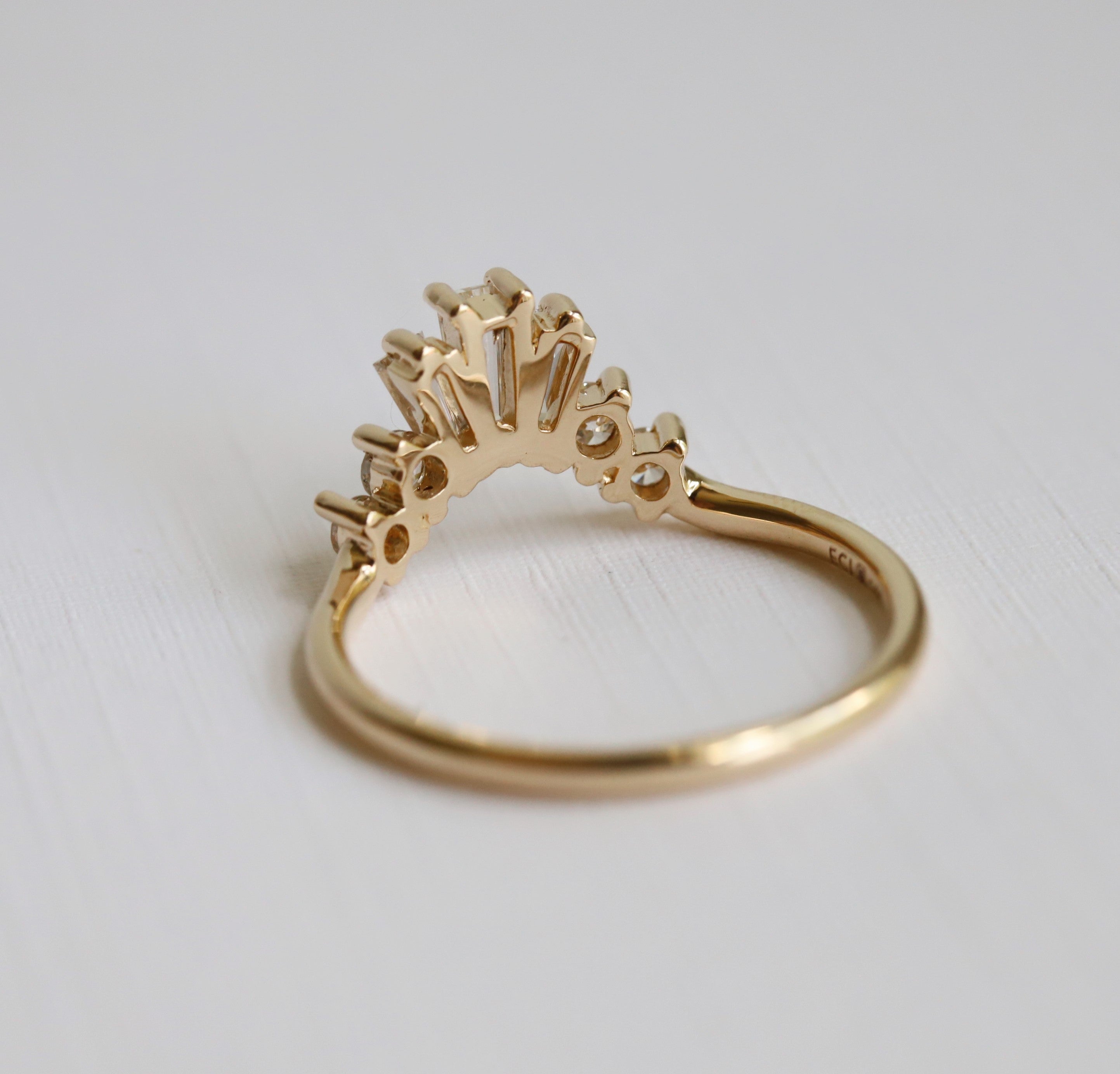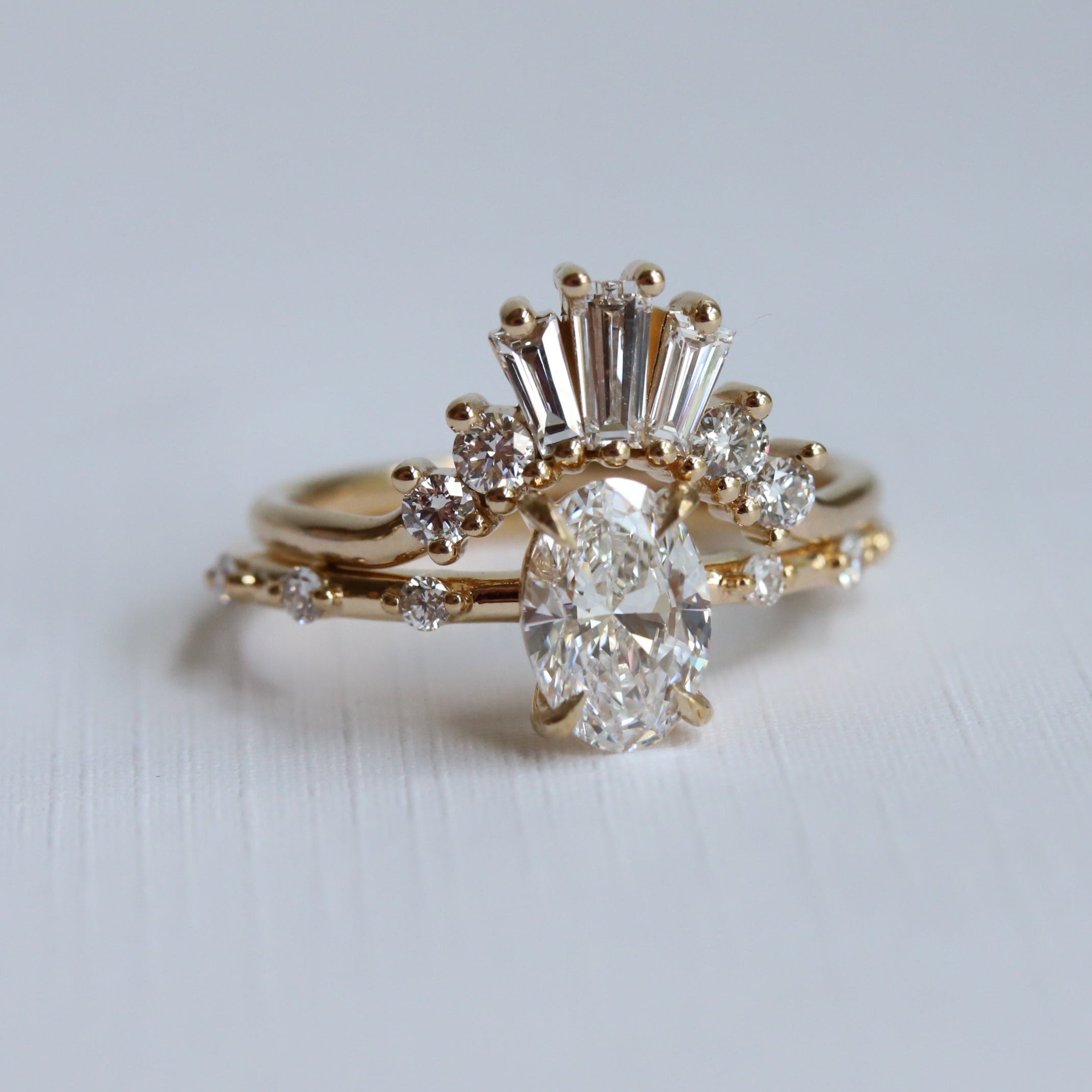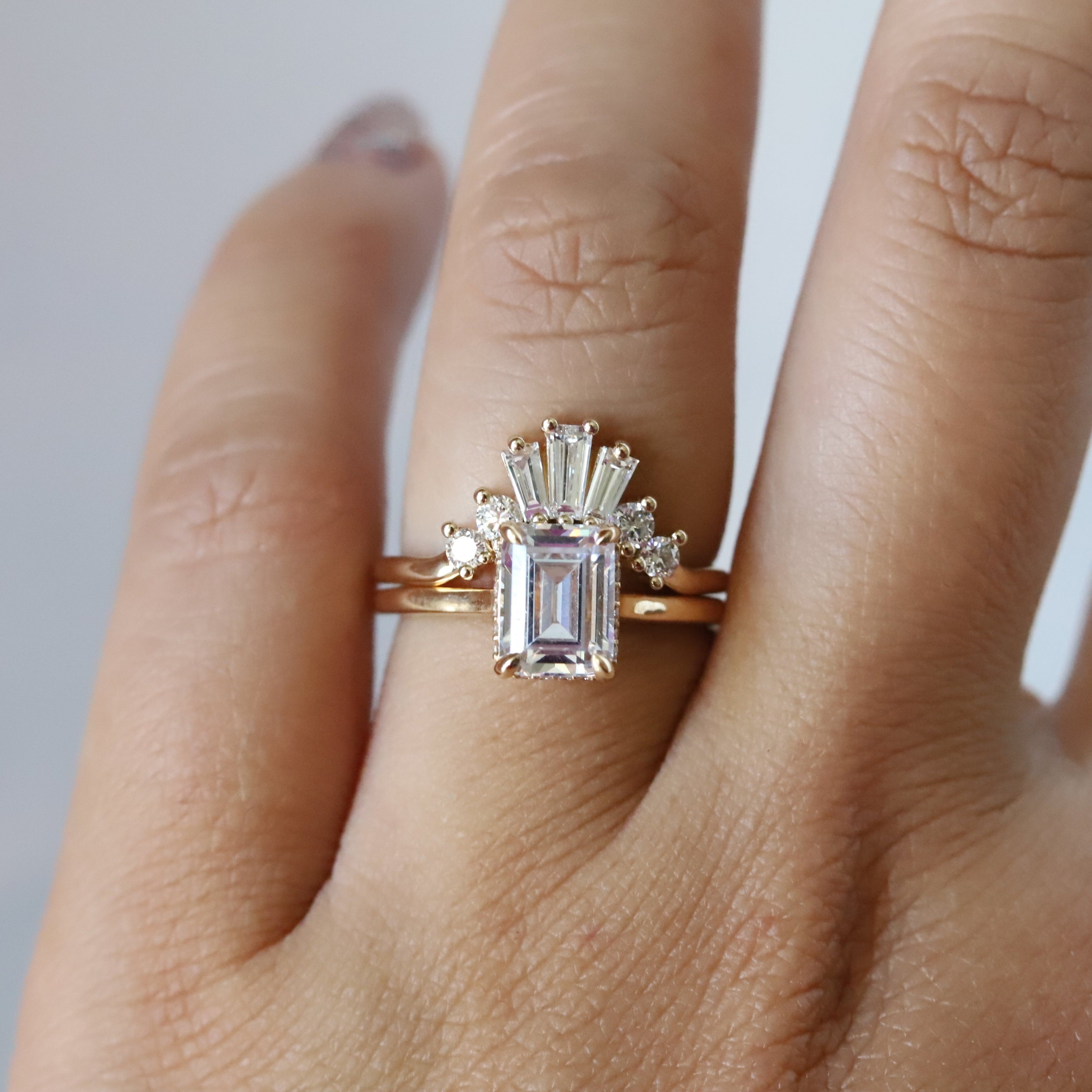 The Empress Crown No.9 is a striking contour band designed to complement substantial center stones of 1.5 carats or larger. Featuring an elegant combination of round and tapered baguette-shaped stones, this statement piece creates a dramatic, layered effect that enhances the brilliance of your focal diamond. The sophisticated architecture of this band makes it an ideal choice for those seeking a bold, coordinated look that elevates any engagement ring setting.