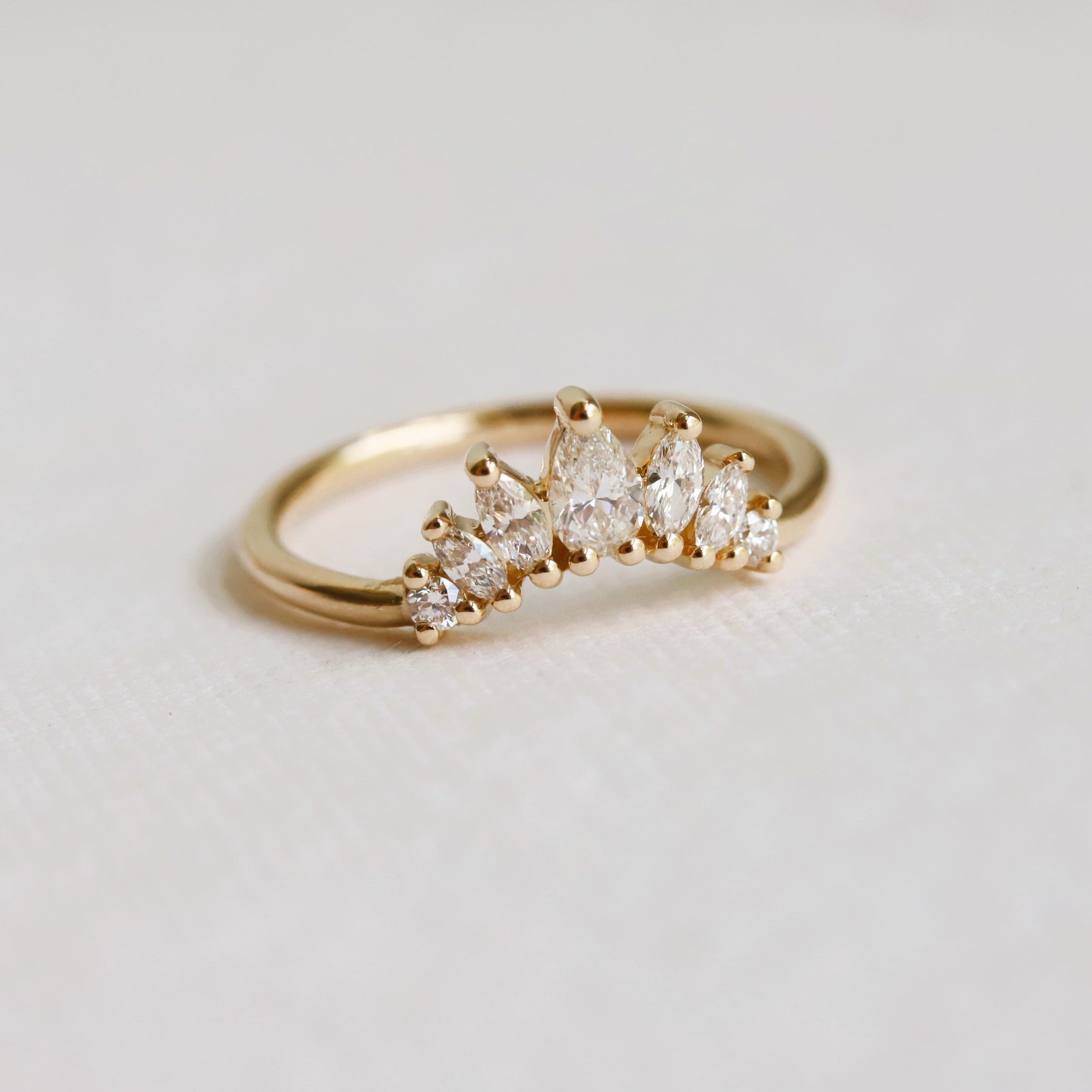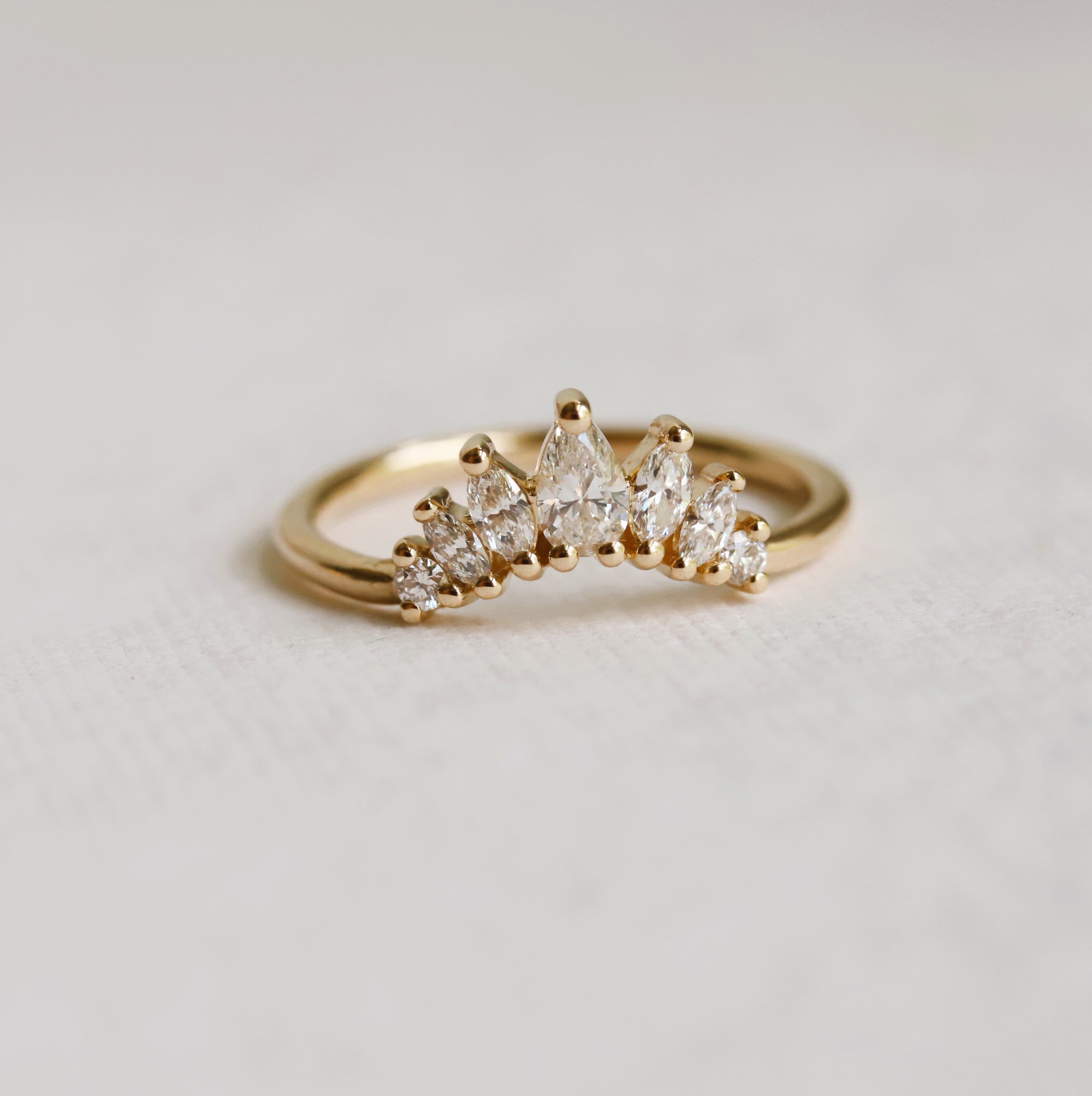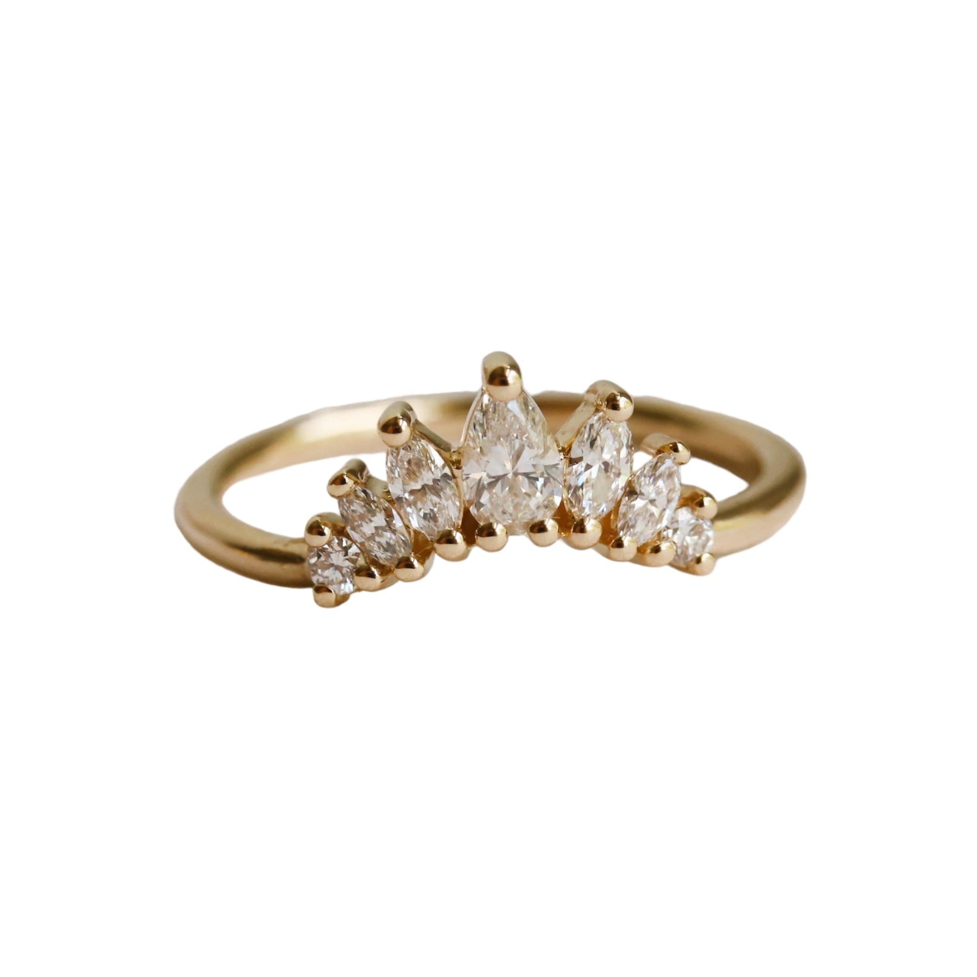 Introducing the elegant Evelina Crown - the perfect addition to any east-west engagement ring. Featuring a contour crown band with a stunning combination of pear, marquise, and round stones, this wedding band adds a touch of sophistication and style. Upgrade your bridal set with this unique and chic contour piece.