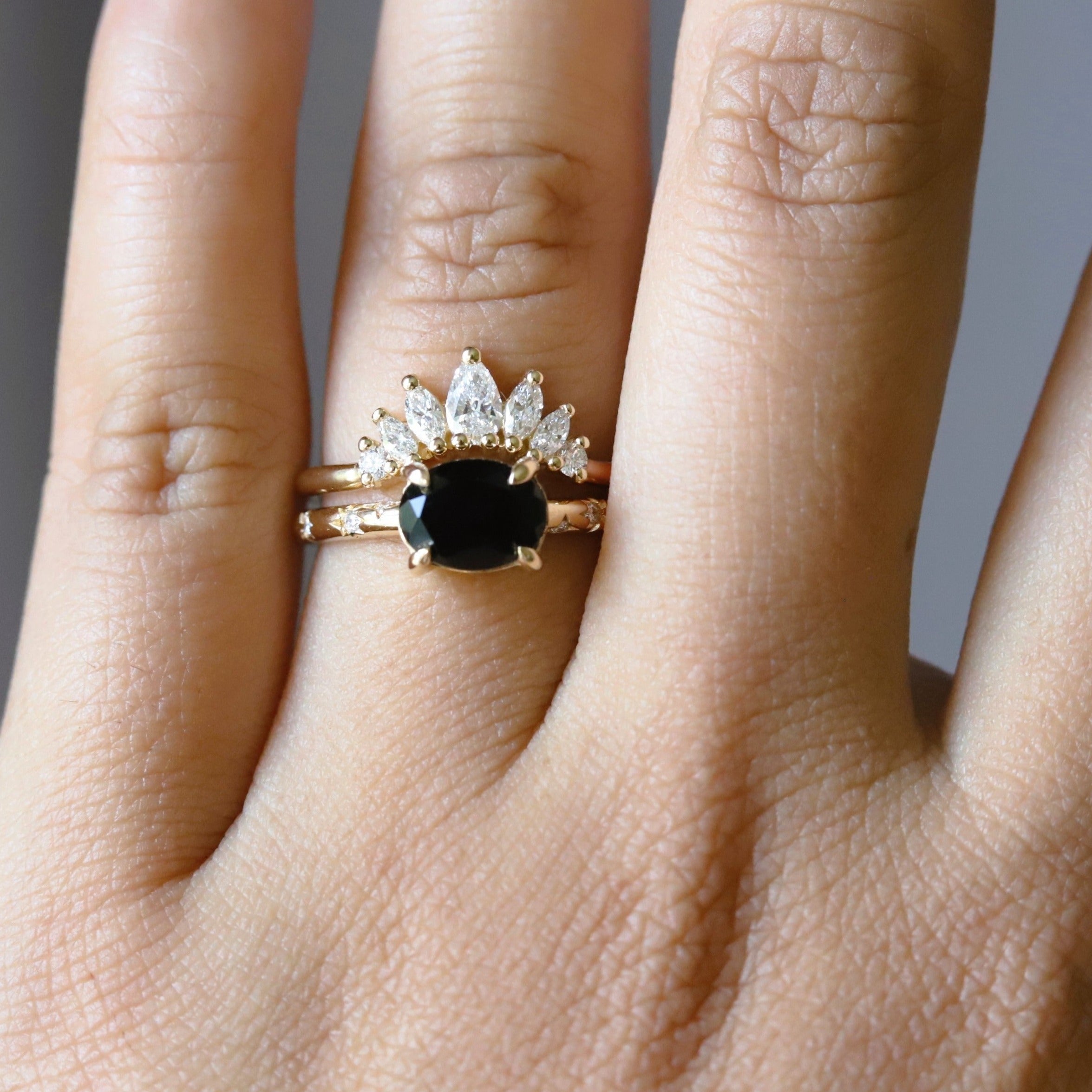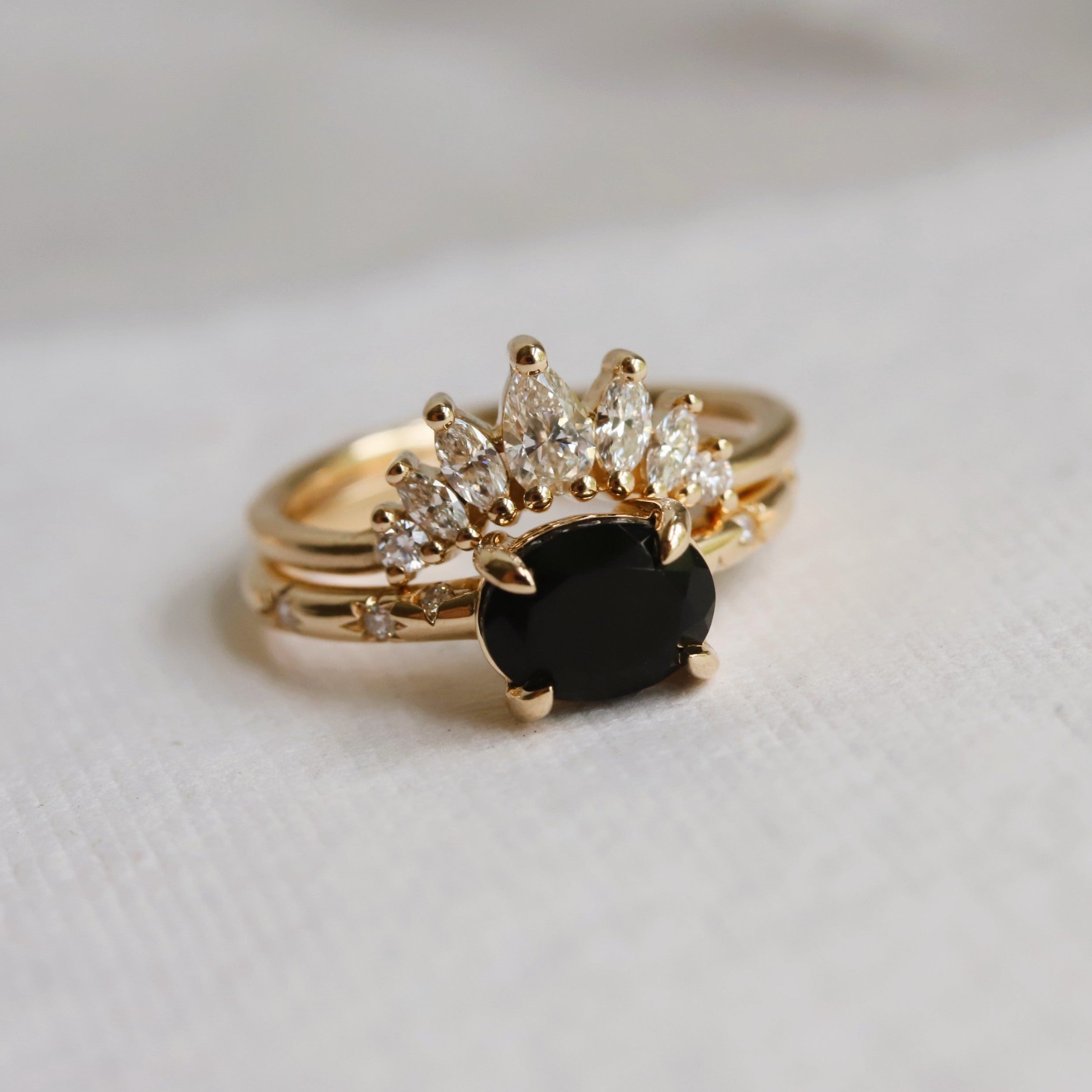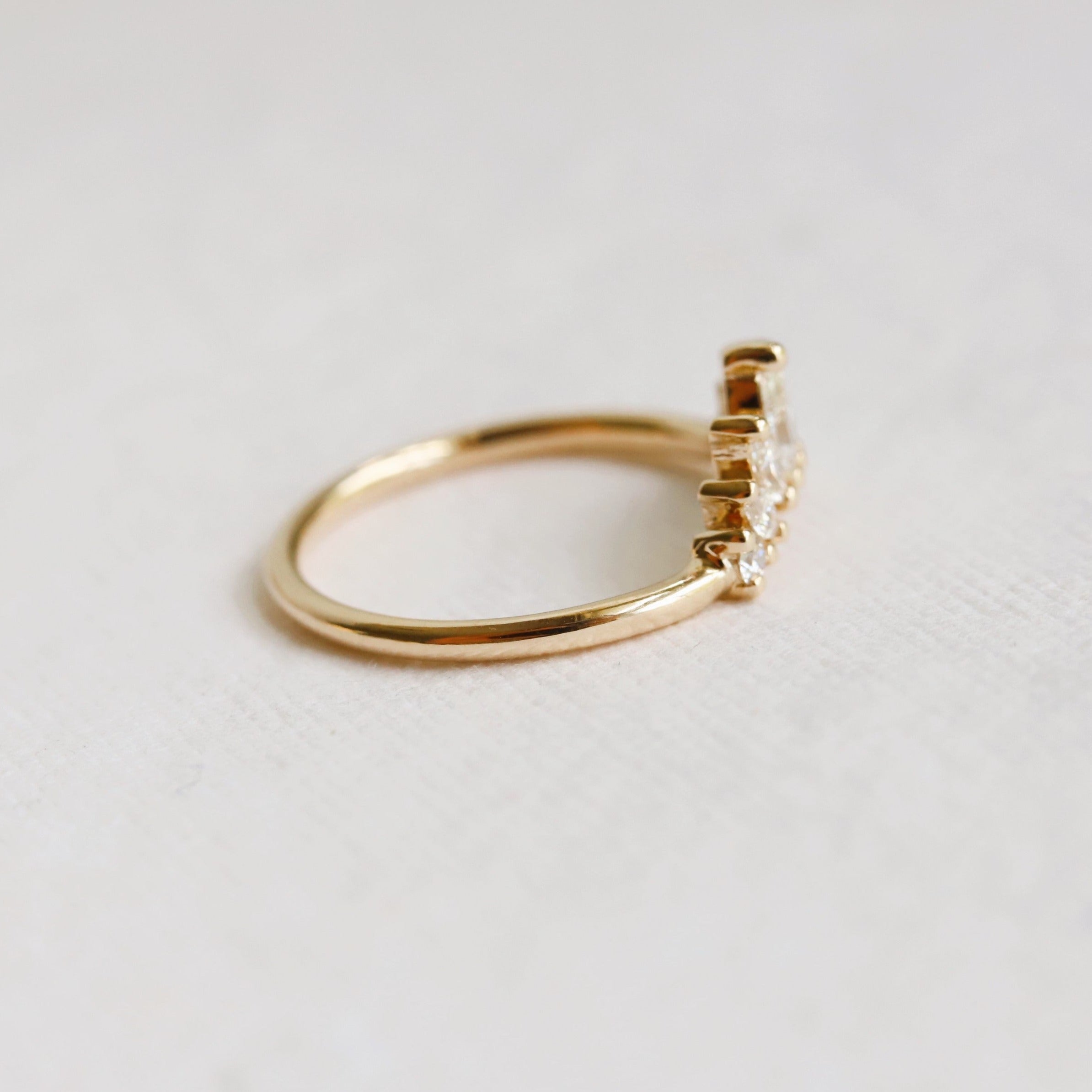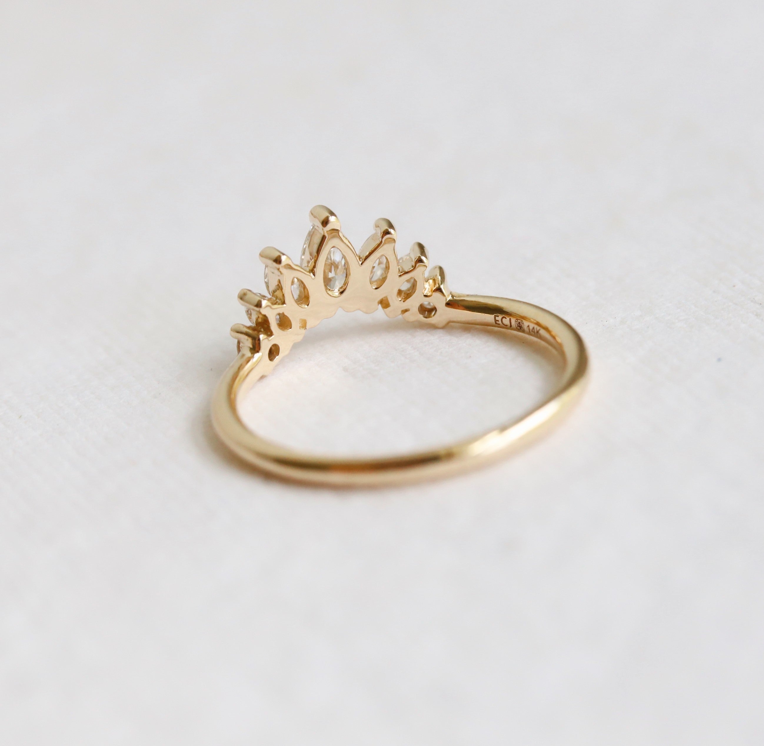 Introducing the elegant Evelina Crown - the perfect addition to any east-west engagement ring. Featuring a contour crown band with a stunning combination of pear, marquise, and round stones, this wedding band adds a touch of sophistication and style. Upgrade your bridal set with this unique and chic contour piece.