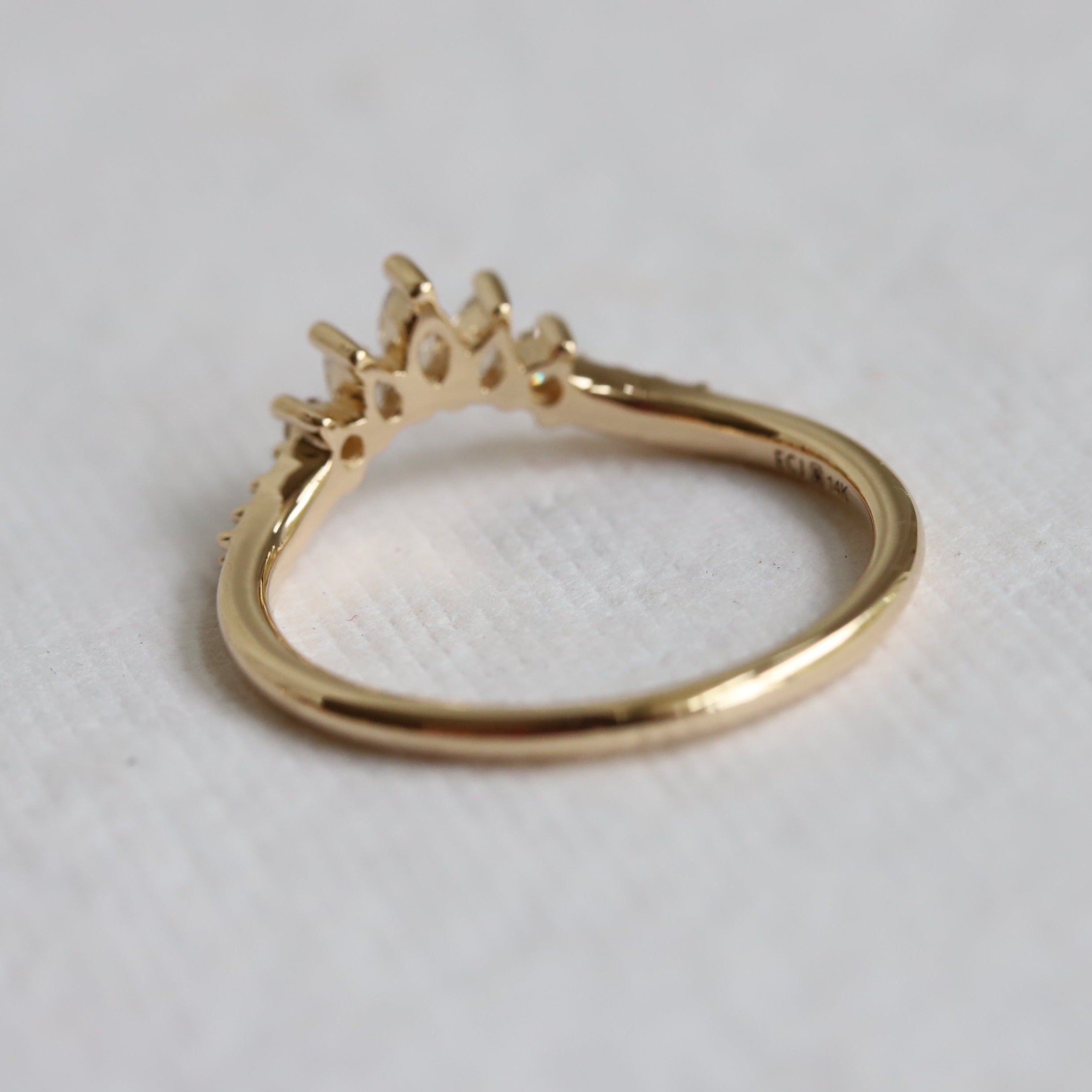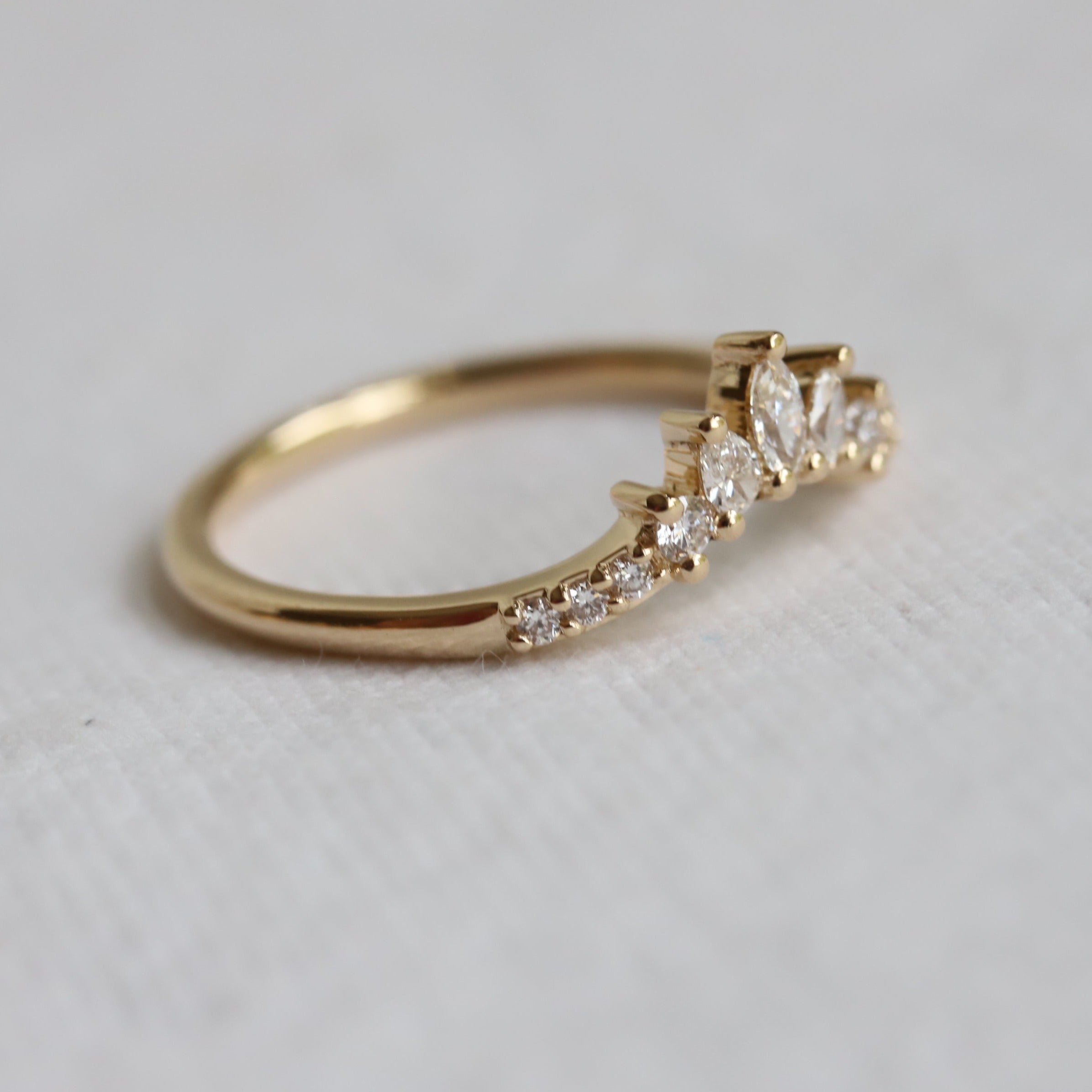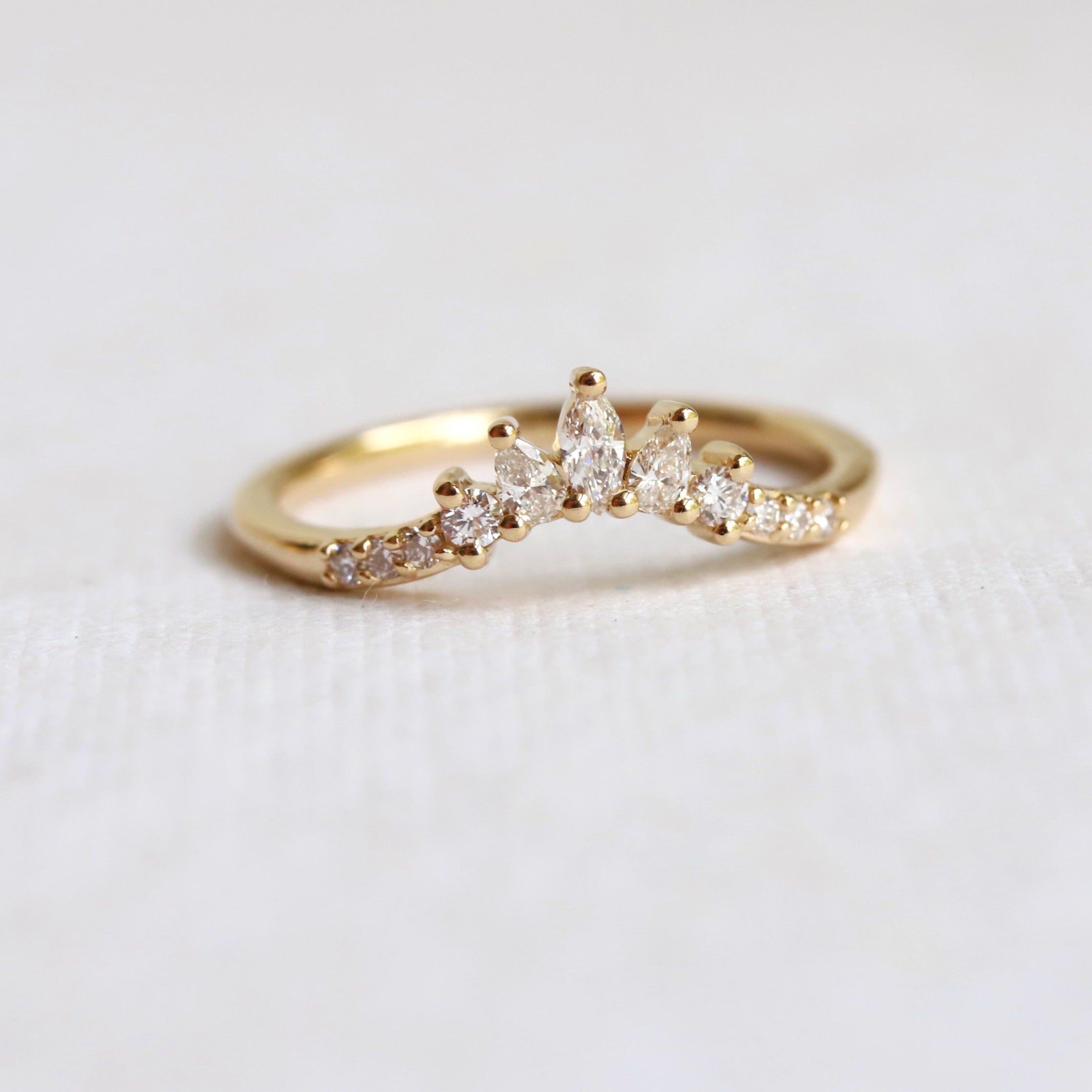 This elegant contour wedding band features a glittering cluster of marquise, pear, and round stones. Perfect for a 0.5-1.5 carat or 4 mm - 7 mm engagement ring.