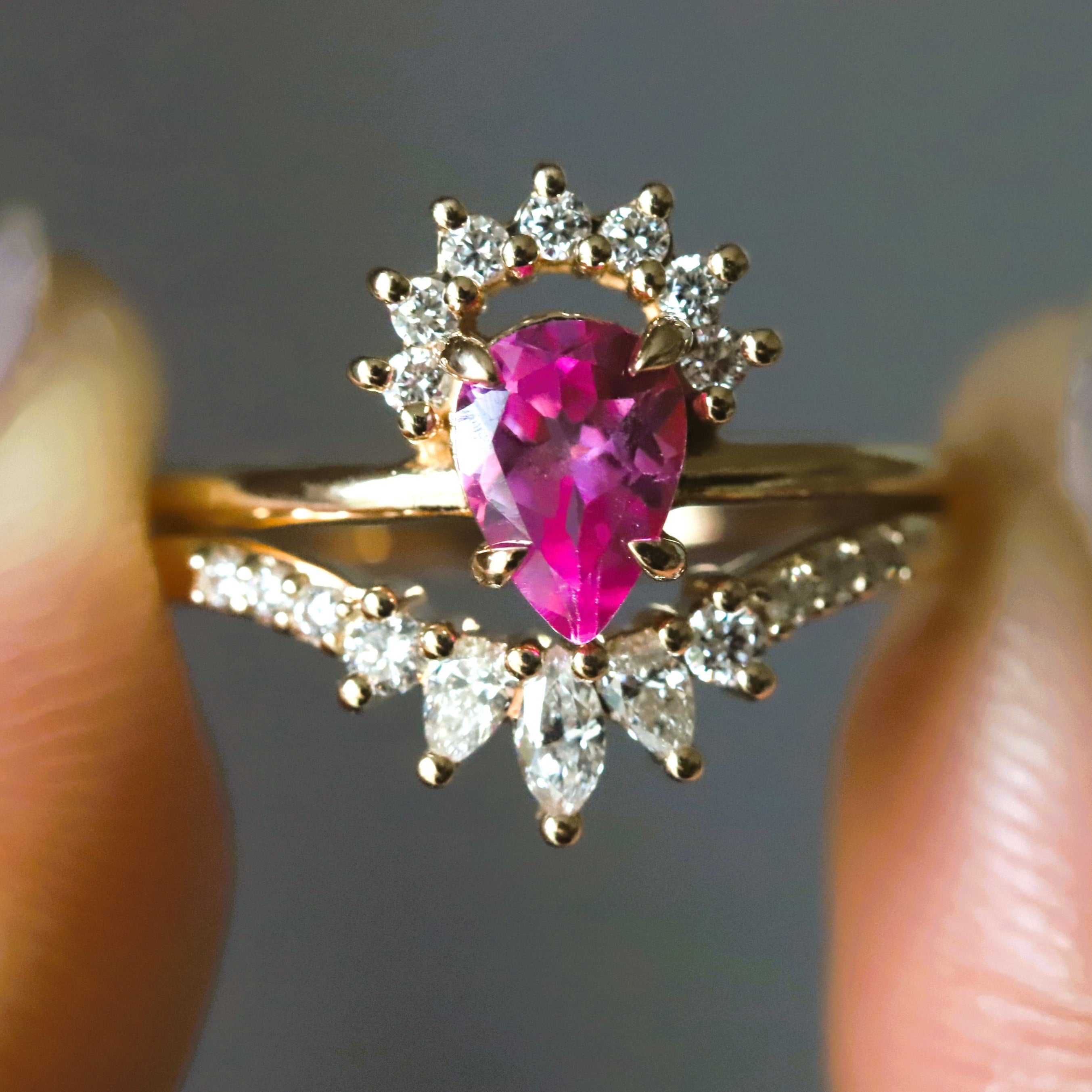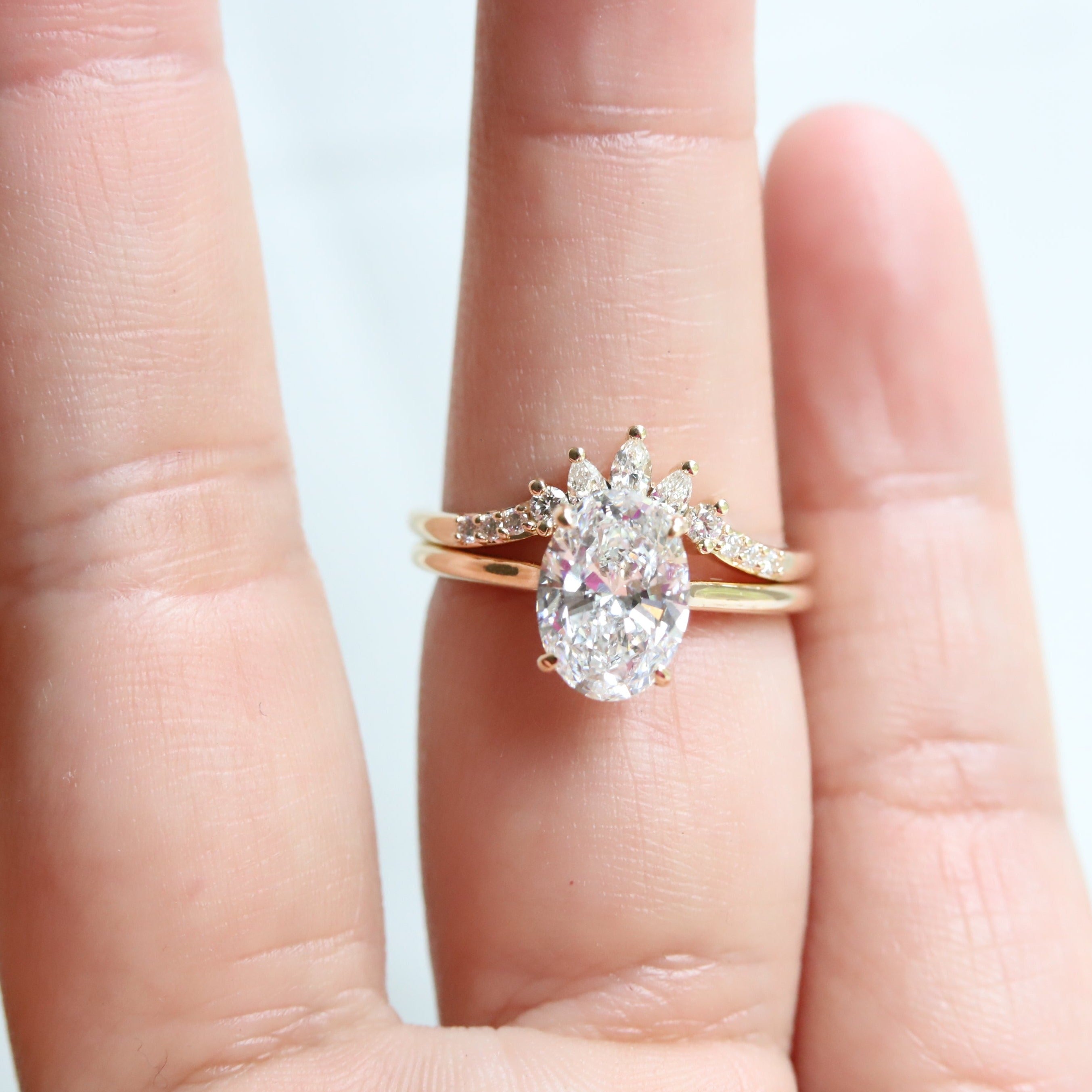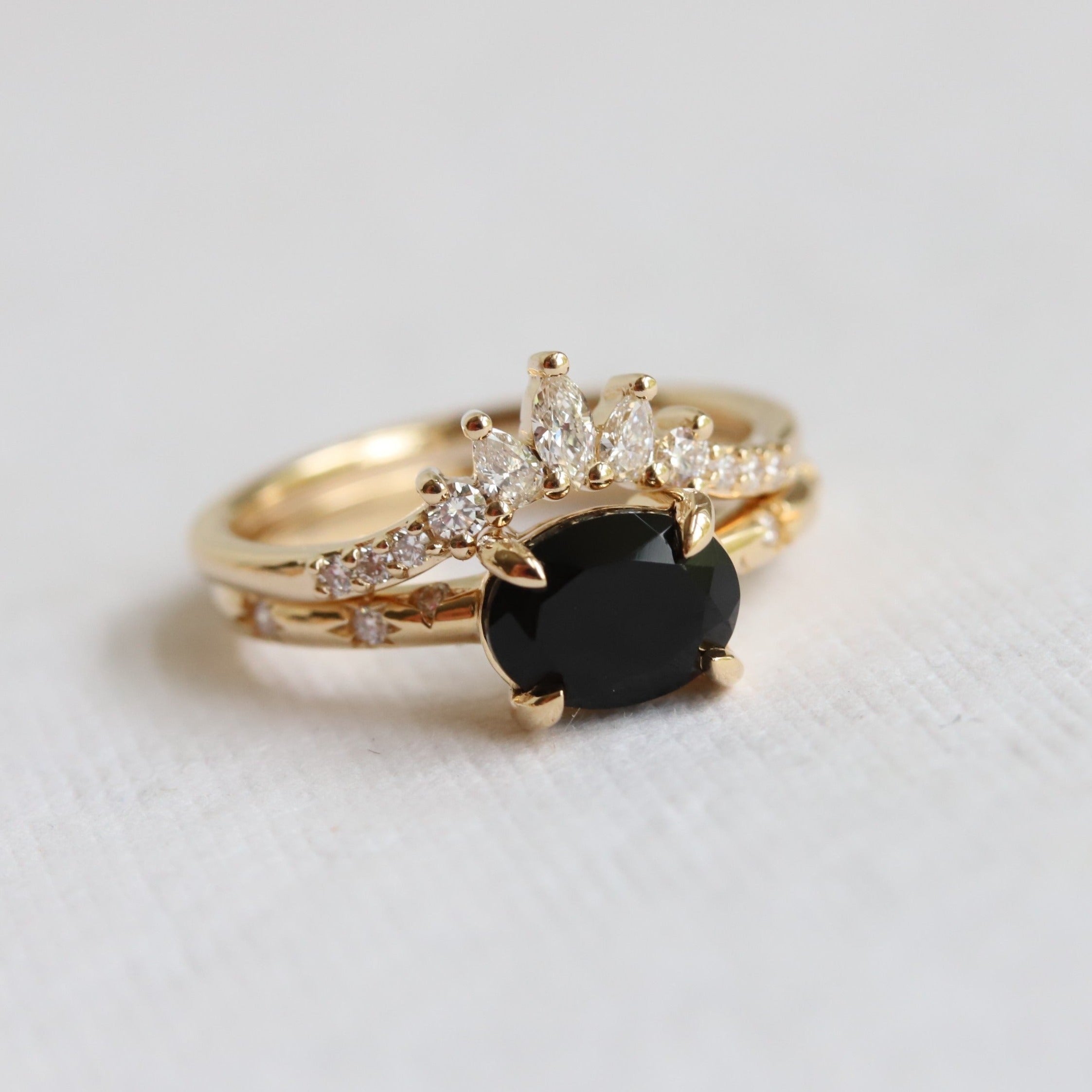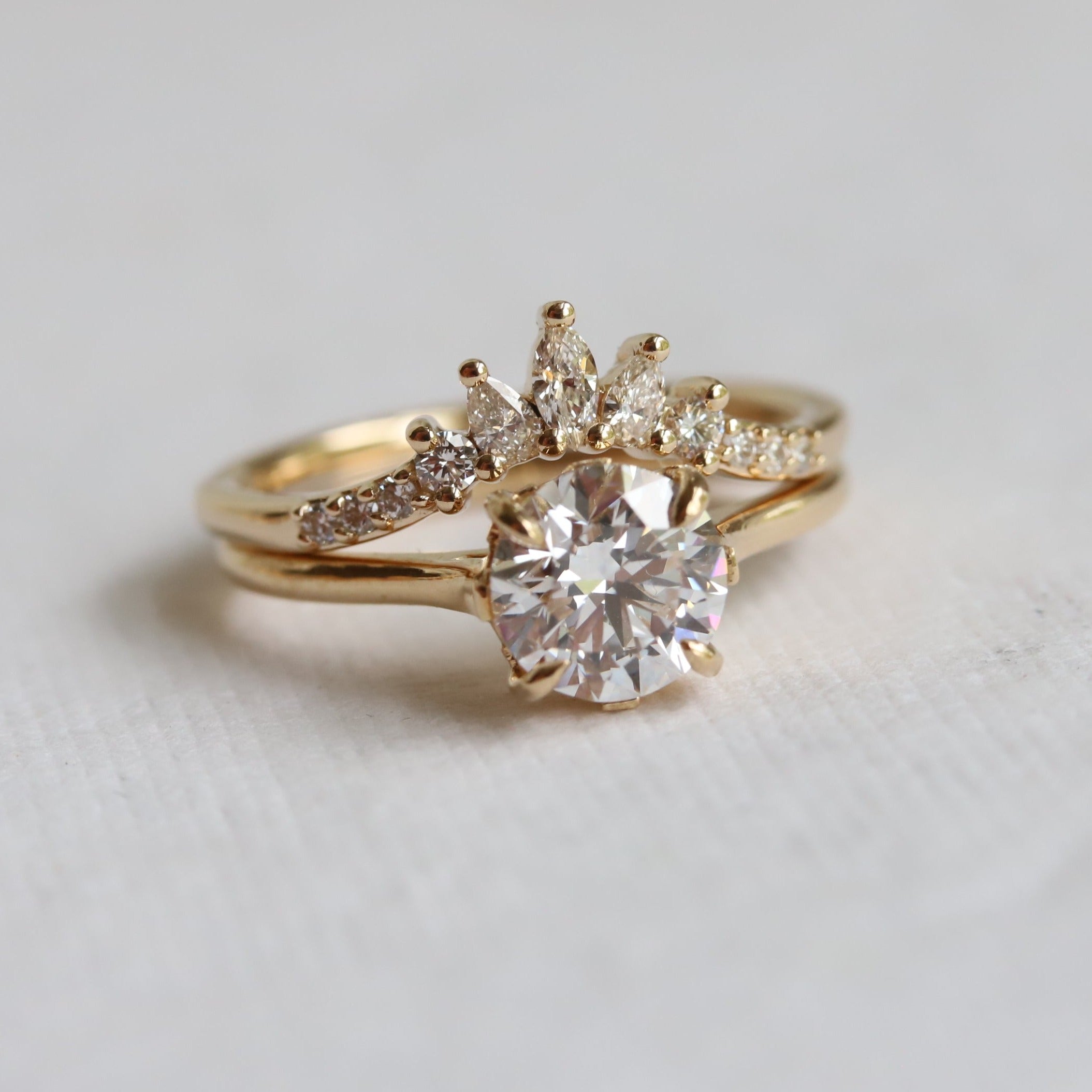 This elegant contour wedding band features a glittering cluster of marquise, pear, and round stones. Perfect for a 0.5-1.5 carat or 4 mm - 7 mm engagement ring.