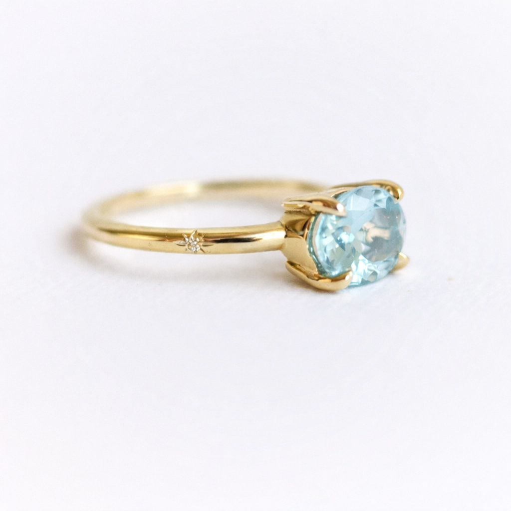 Stella presents a captivating 1.5-carat oval aquamarine in east-west setting, anchored by four claw prongs. Diamond accents frame delicate star engravings along the band, with an additional hidden star detail on the side. Select your preferred metal to complete this refined design.