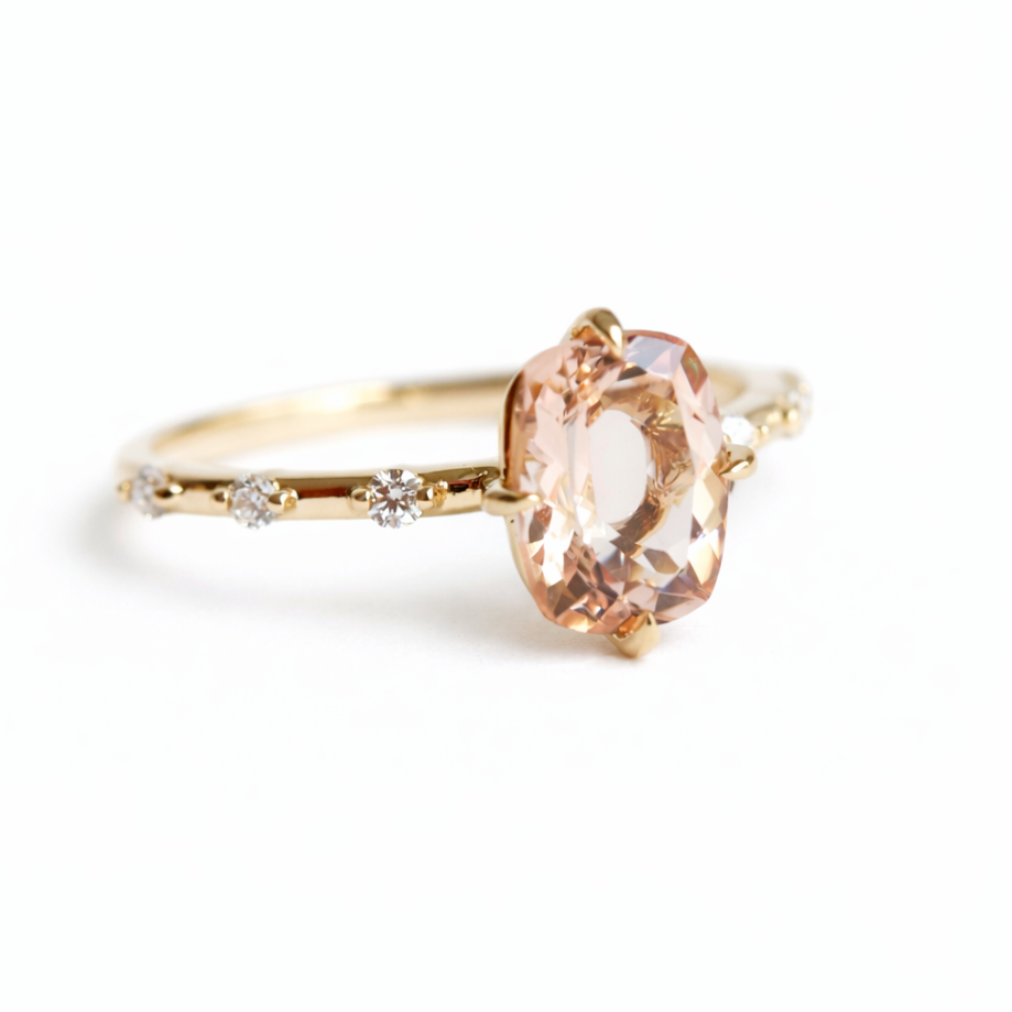 The Aurora ring features a sleek, sturdy band paired with a basket four-prong setting. At its center is an elongated cushion cut Morganite, complemented by three diamonds on each side. This design embodies timeless elegance with a minimalist style, perfect for those looking for a refined and subtle engagement ring.