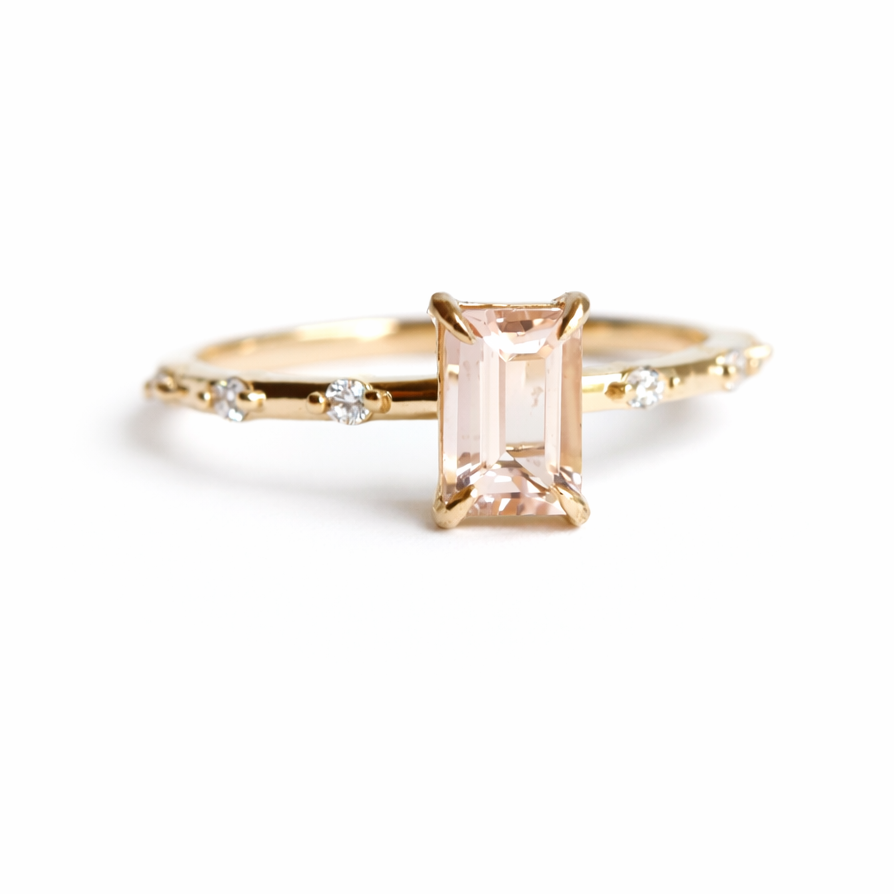 The Aurora ring features a sleek, sturdy band paired with a basket four-prong setting. At its center is an emerald-cut Morganite, complemented by three diamonds on each side. This design embodies timeless elegance with a minimalist style, perfect for those looking for a refined and subtle engagement ring.