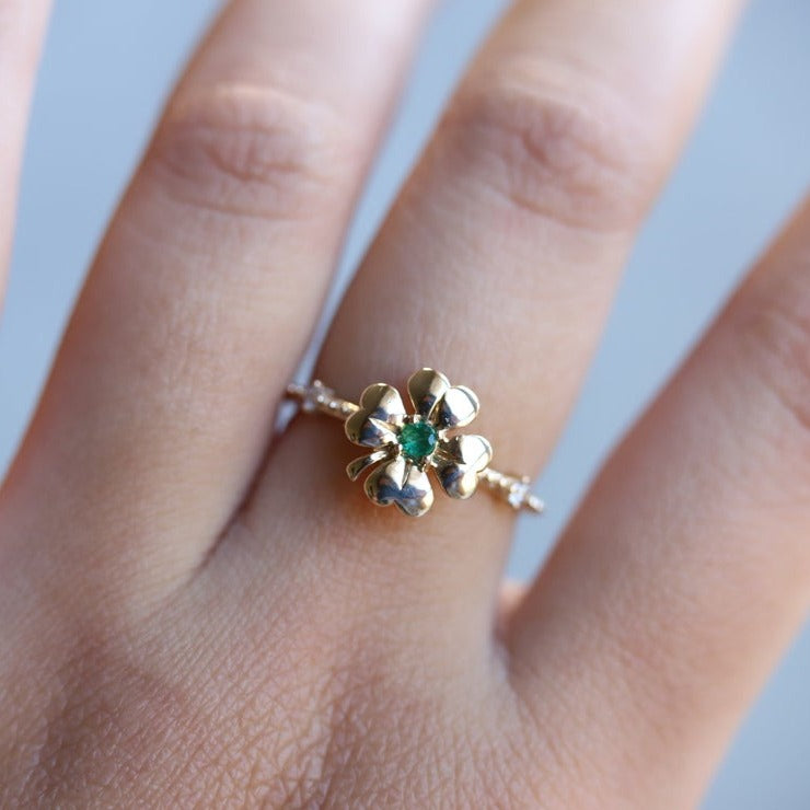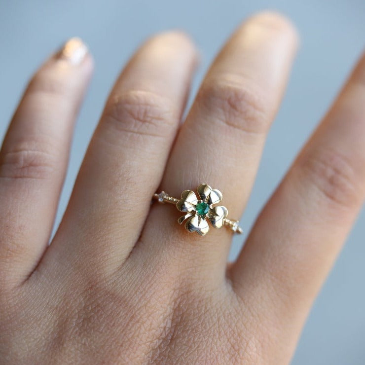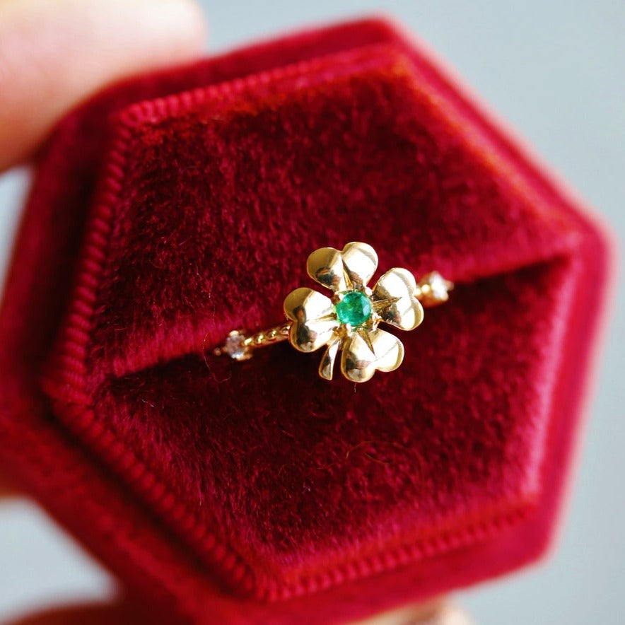 This Four Leaf Clover Emerald and Diamond Stacking ring is a modern-classic must-have! The luxe emerald and sparkling diamonds add a touch of luck and greens to any look. Whether paired with other rings or as a statement-maker alone - this ring is sure to bring you admiration.