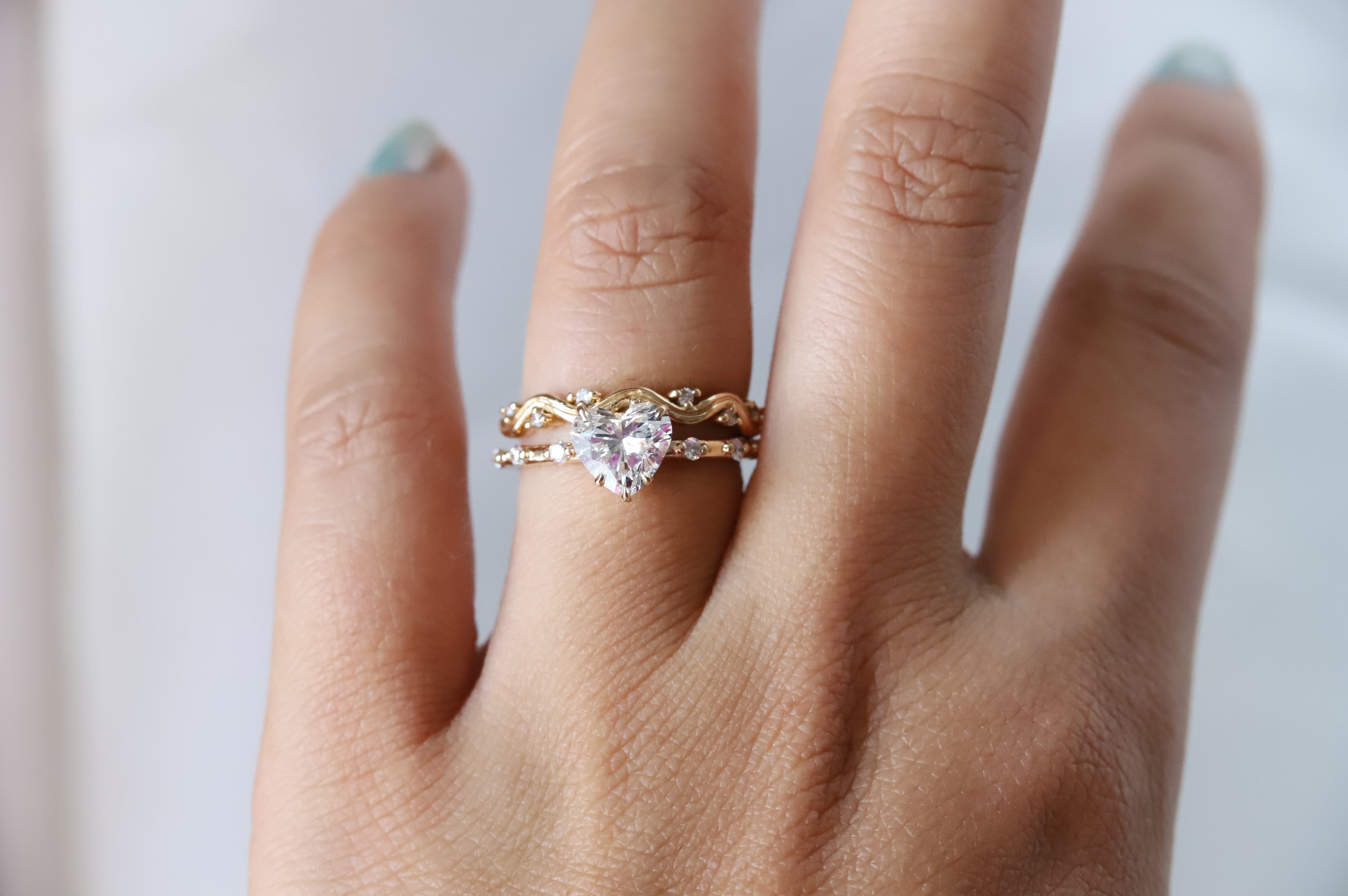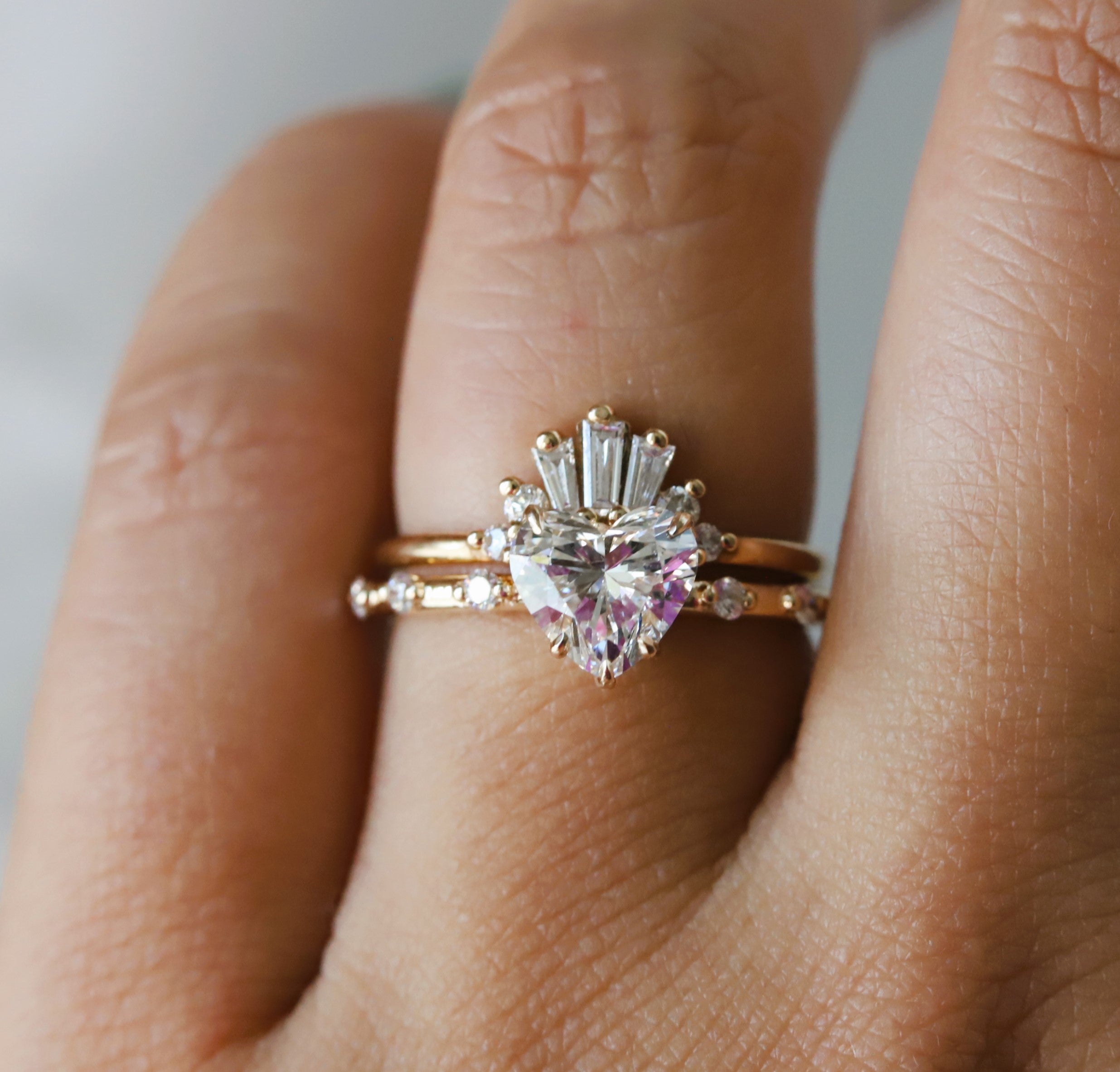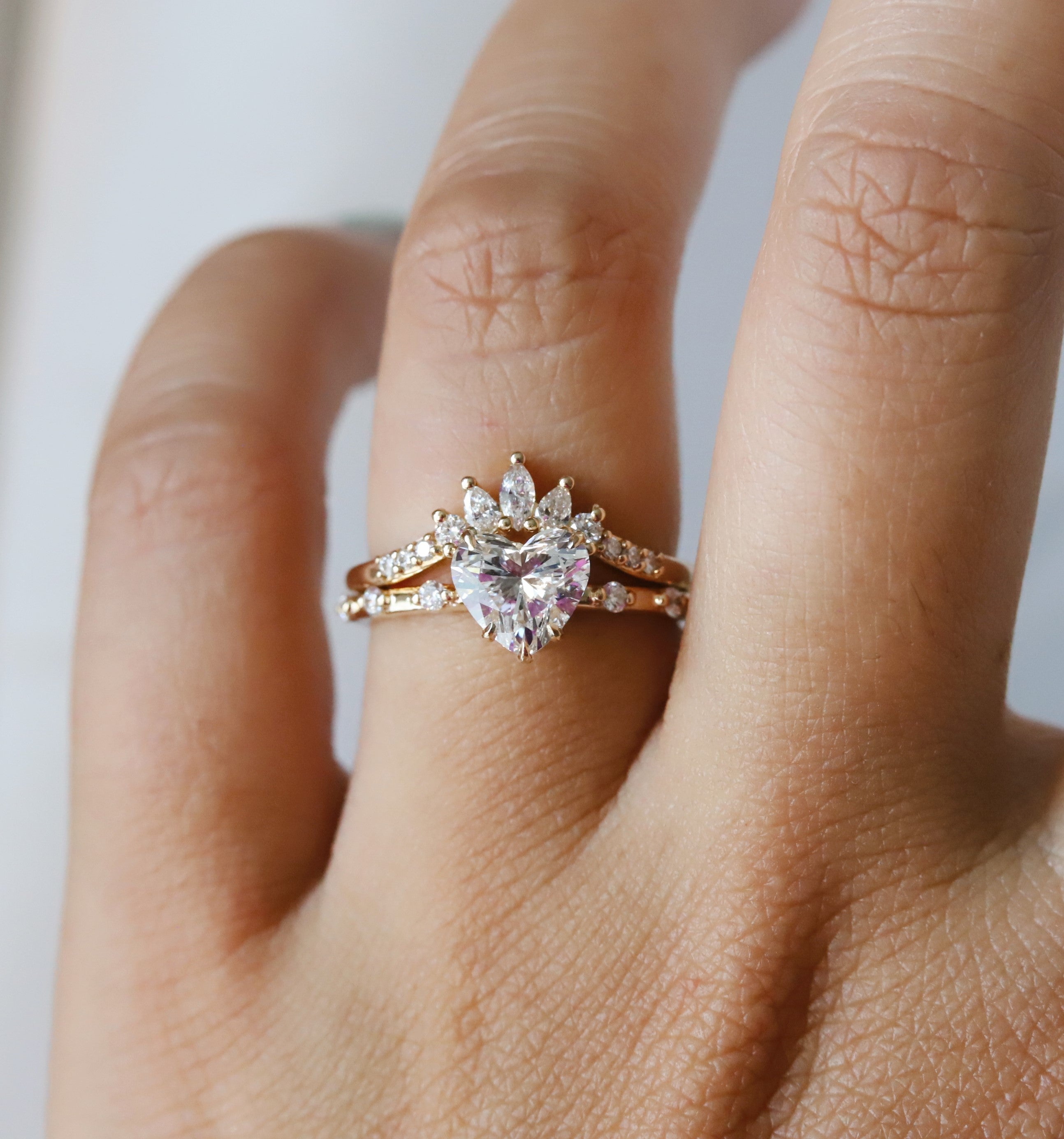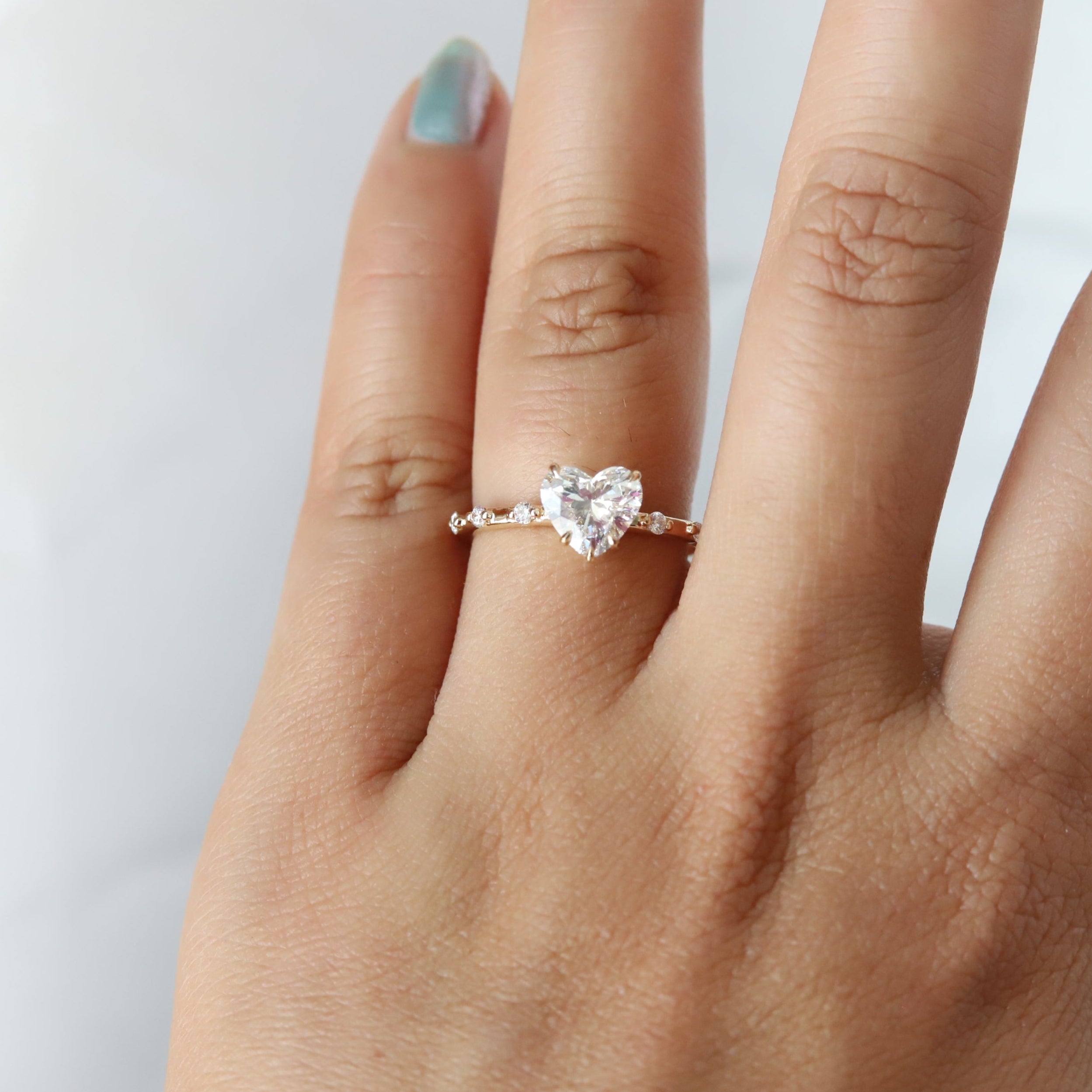 The Aurora ring pairs a sleek, sturdy band with a low-profile basket setting. It showcases a 1 ct. Heart cut center stone, available in Natural Diamond, Lab-Grown Diamond, or Moissanite. Accented by three diamonds on each side, this design delivers timeless sophistication with a minimalist aesthetic, making it perfect for those seeking a refined and subtle engagement ring. (Shown here in Lab-Grown Diamond)