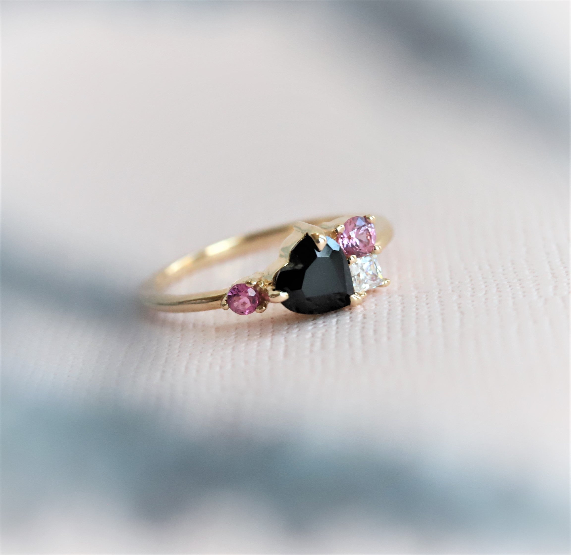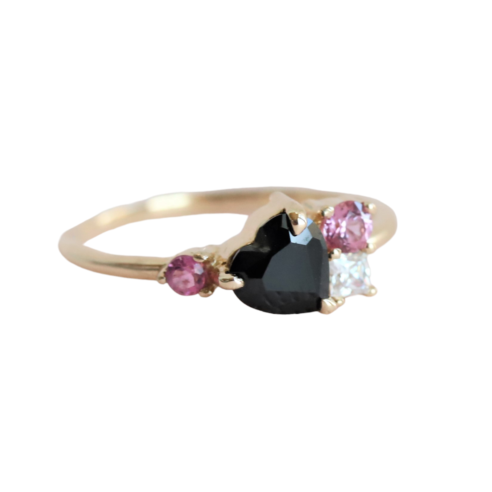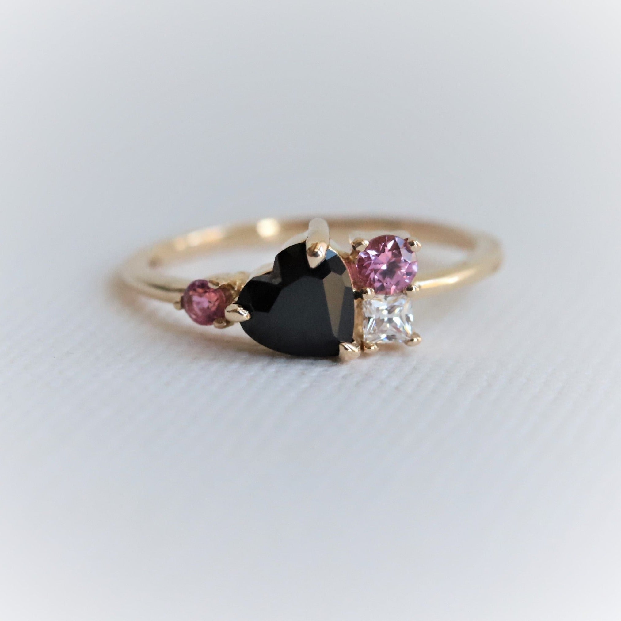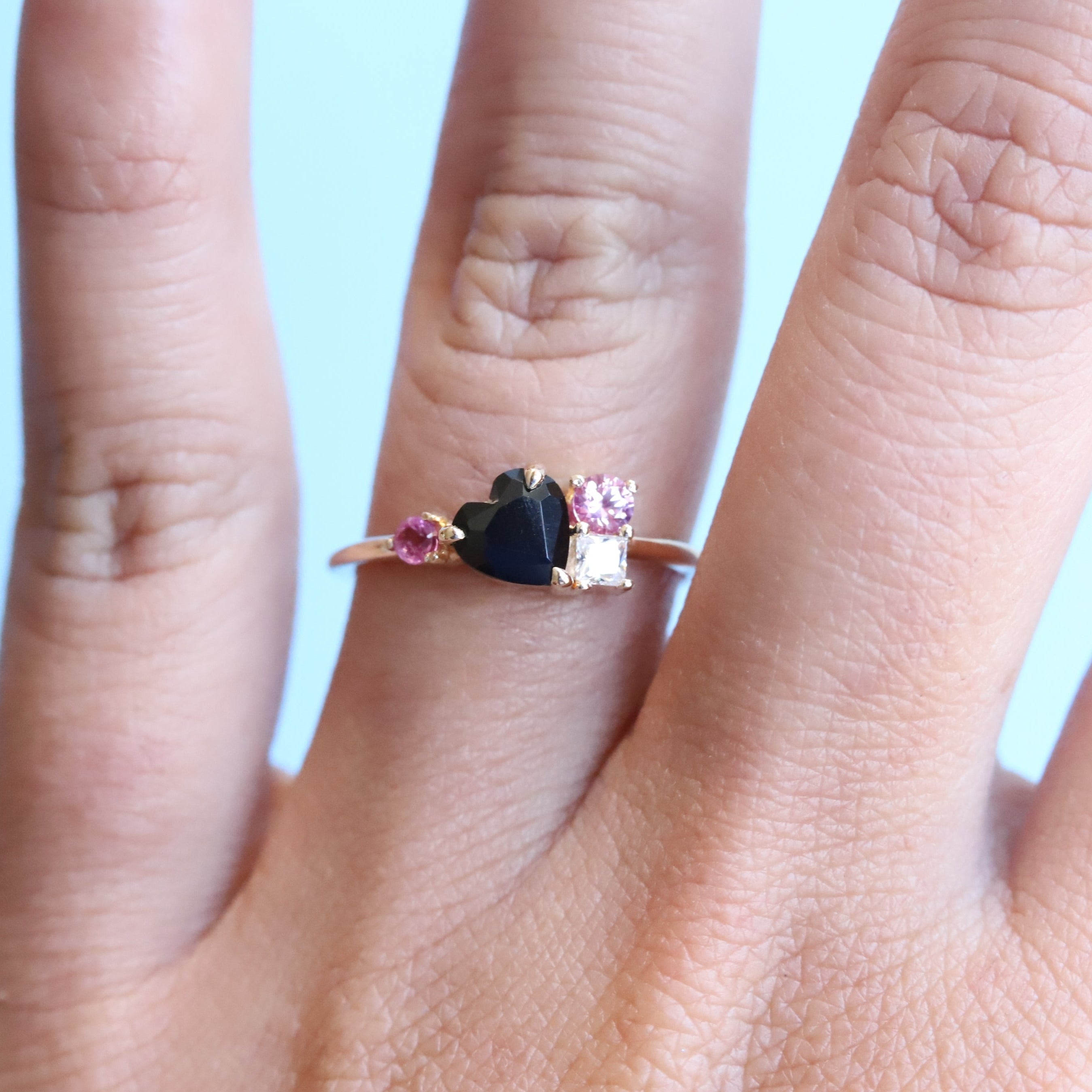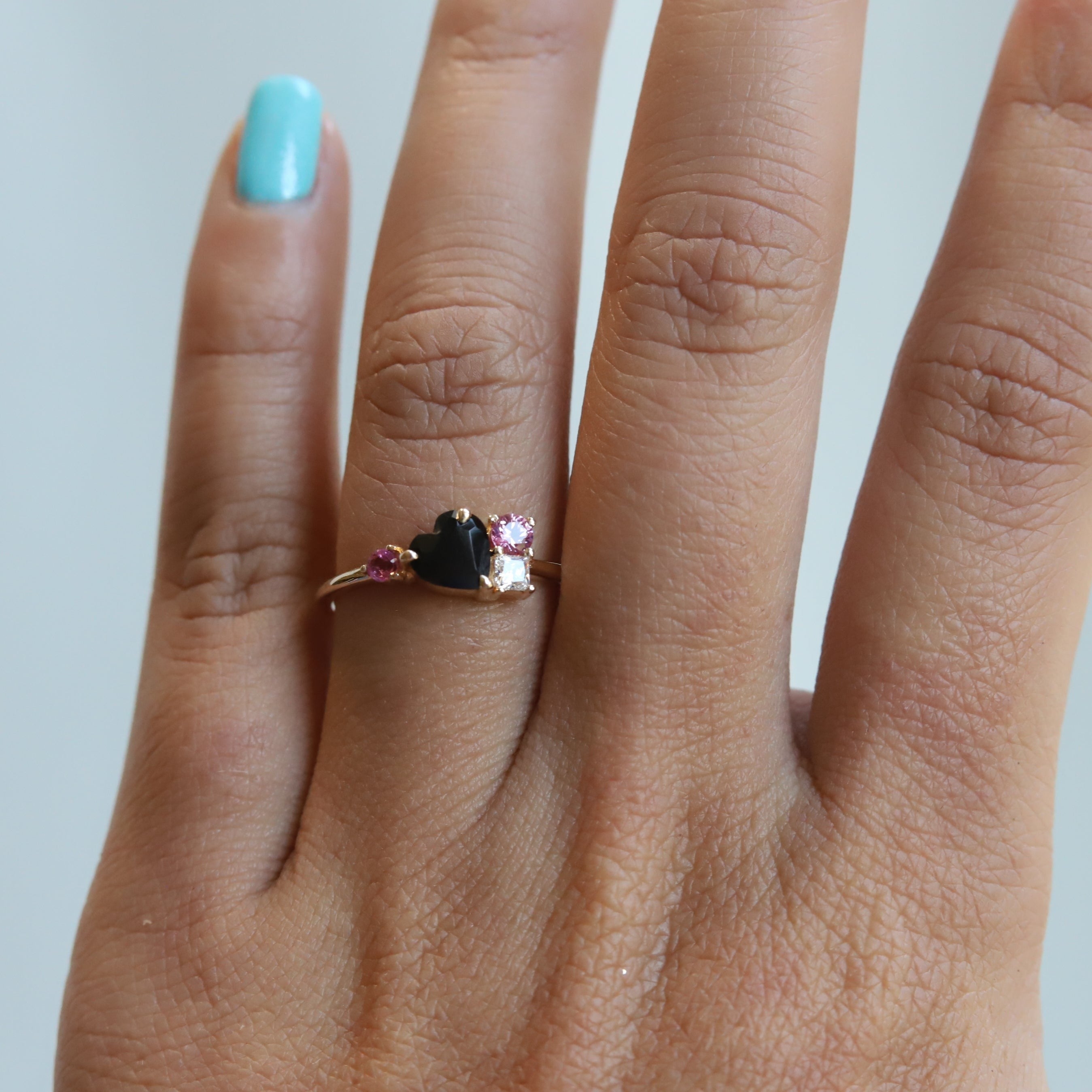This one-of-a-kind Brie Ring offers an exciting, yet elegant expression of love. Crafted with a heart-shaped cluster of black onyx, sparkling moissanite, pink tourmaline, and pink sapphire. This beautiful piece of jewelry adds a touch of whimsy and sophistication to any ensemble. A unique accessory with a hint of playfulness, this stunning ring is sure to make a statement.