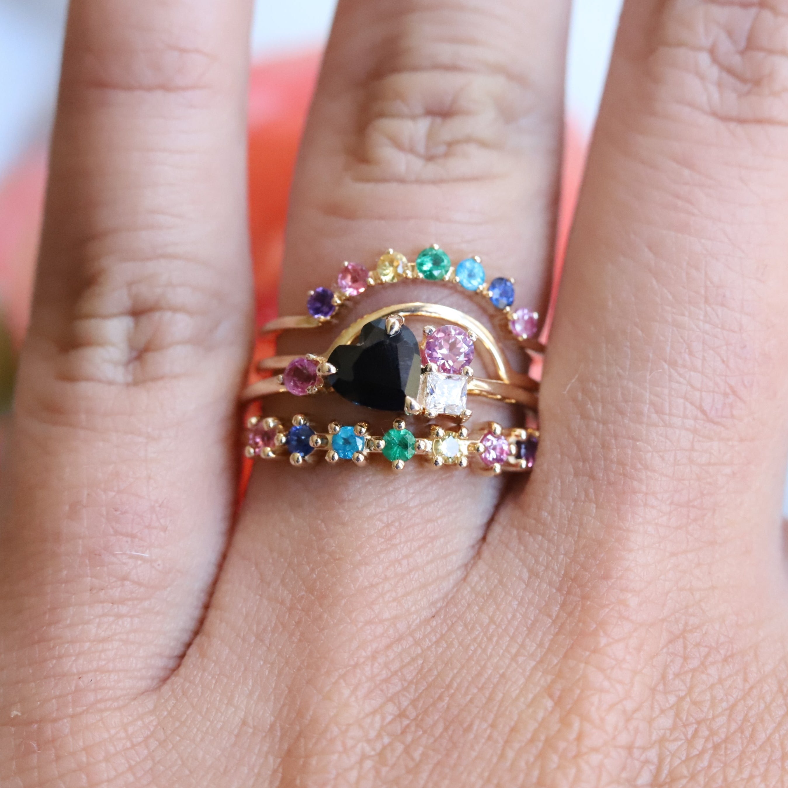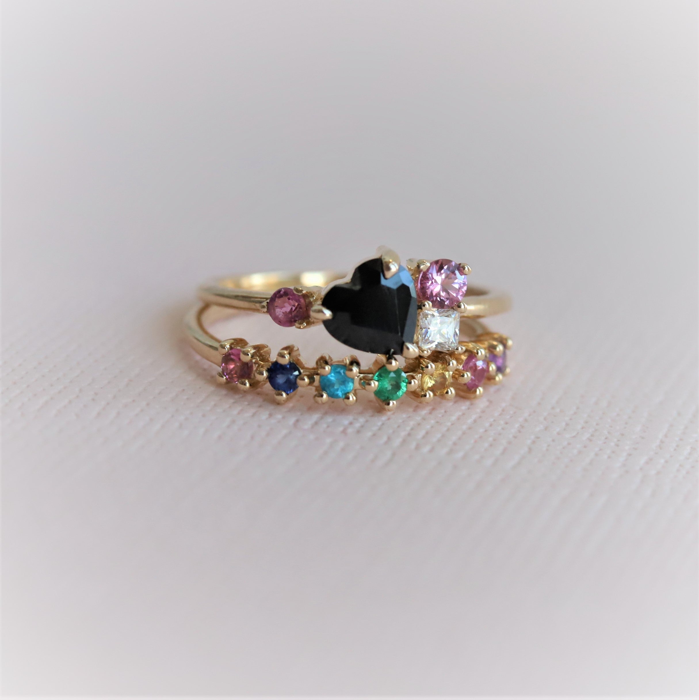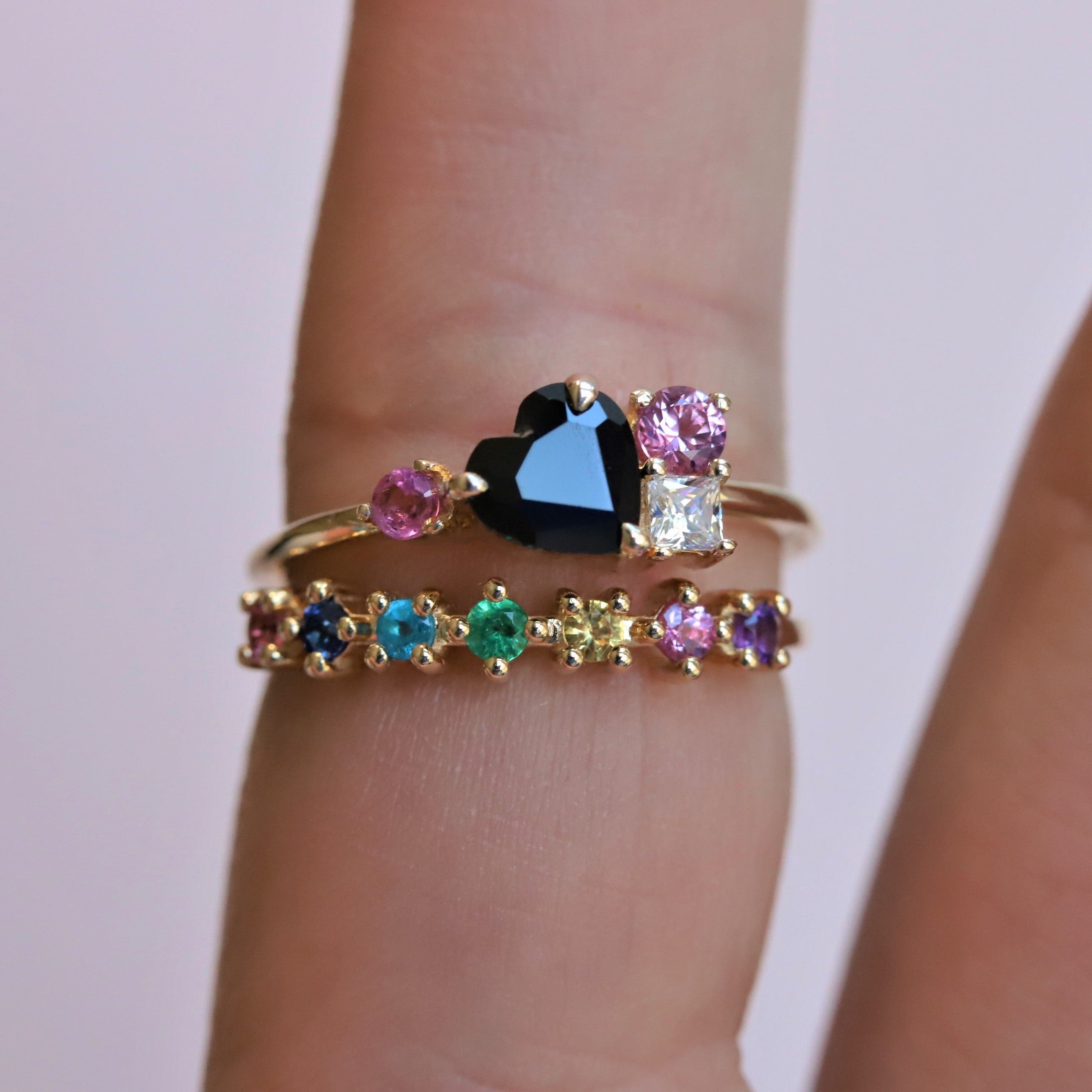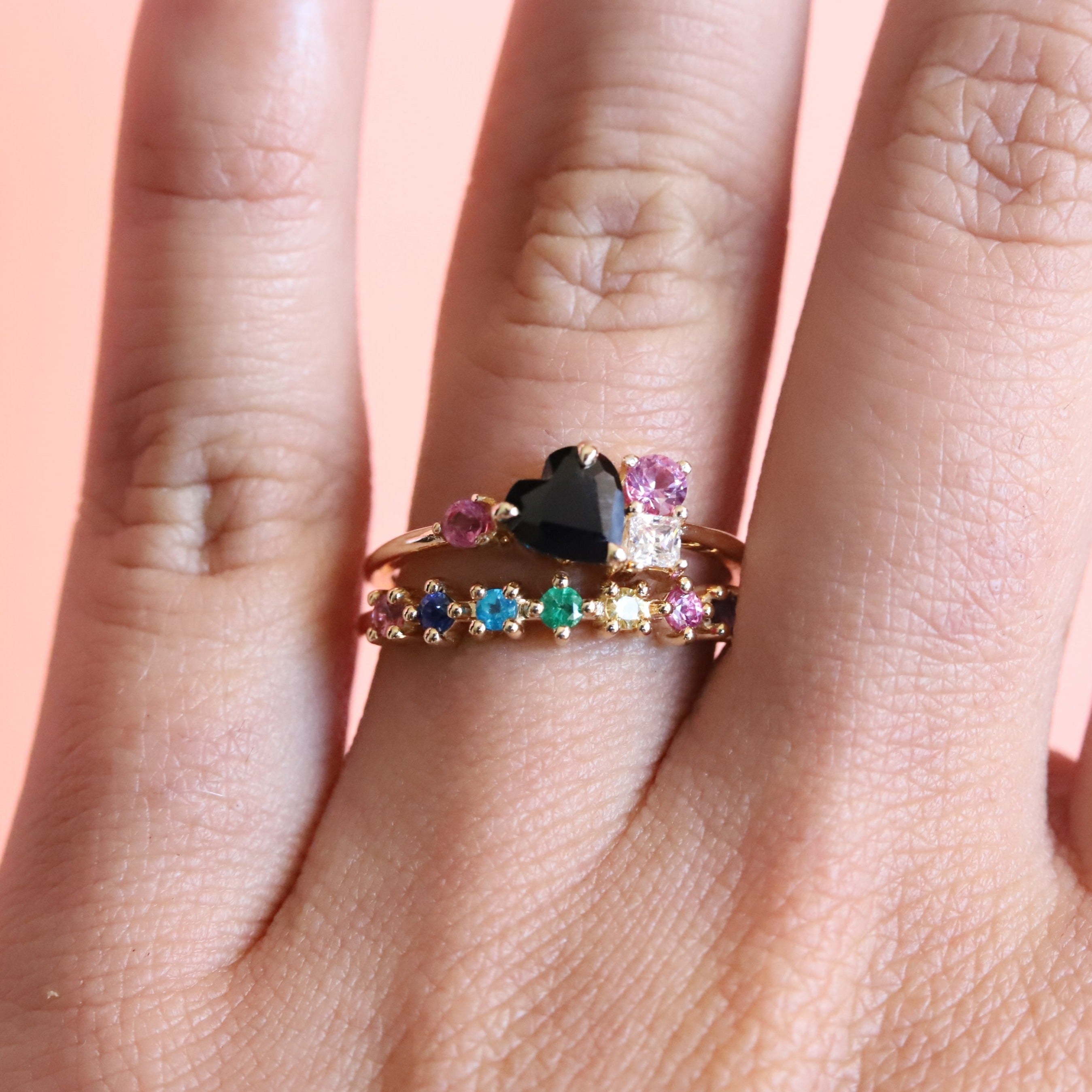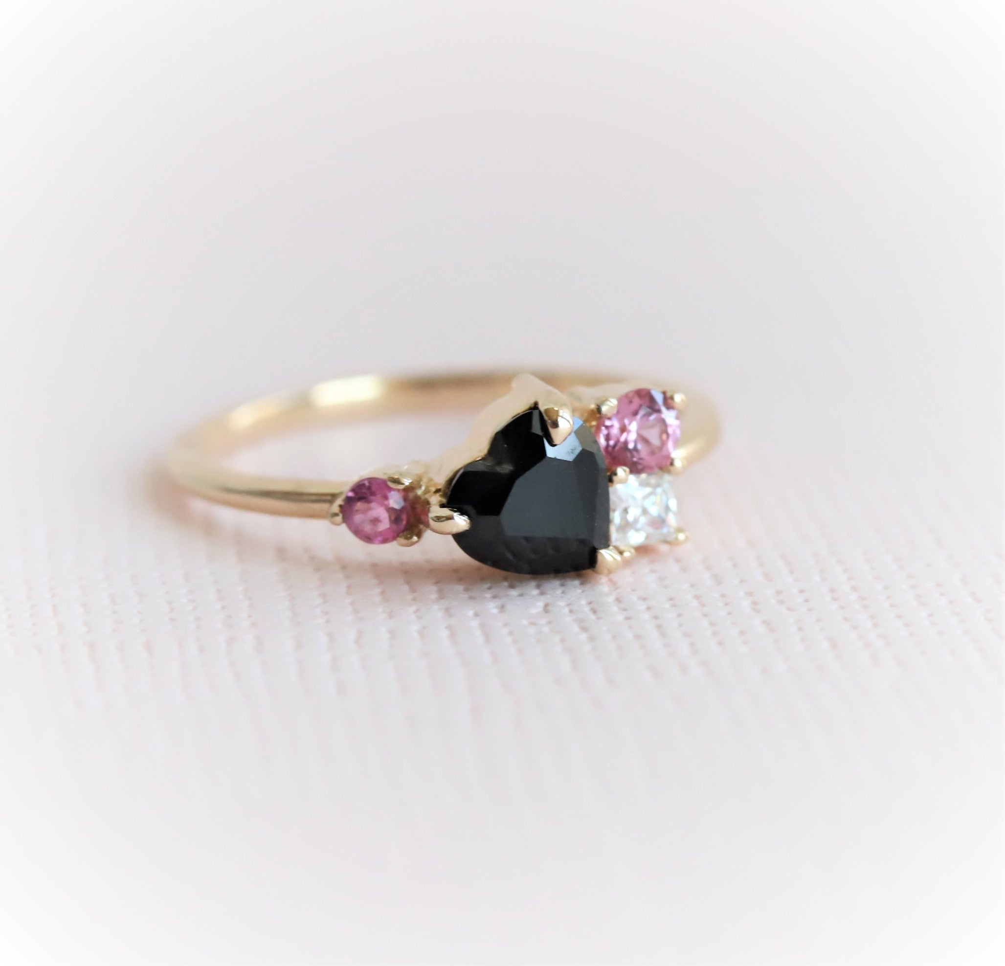 This one-of-a-kind Brie Ring offers an exciting, yet elegant expression of love. Crafted with a heart-shaped cluster of black onyx, sparkling moissanite, pink tourmaline, and pink sapphire. This beautiful piece of jewelry adds a touch of whimsy and sophistication to any ensemble. A unique accessory with a hint of playfulness, this stunning ring is sure to make a statement.