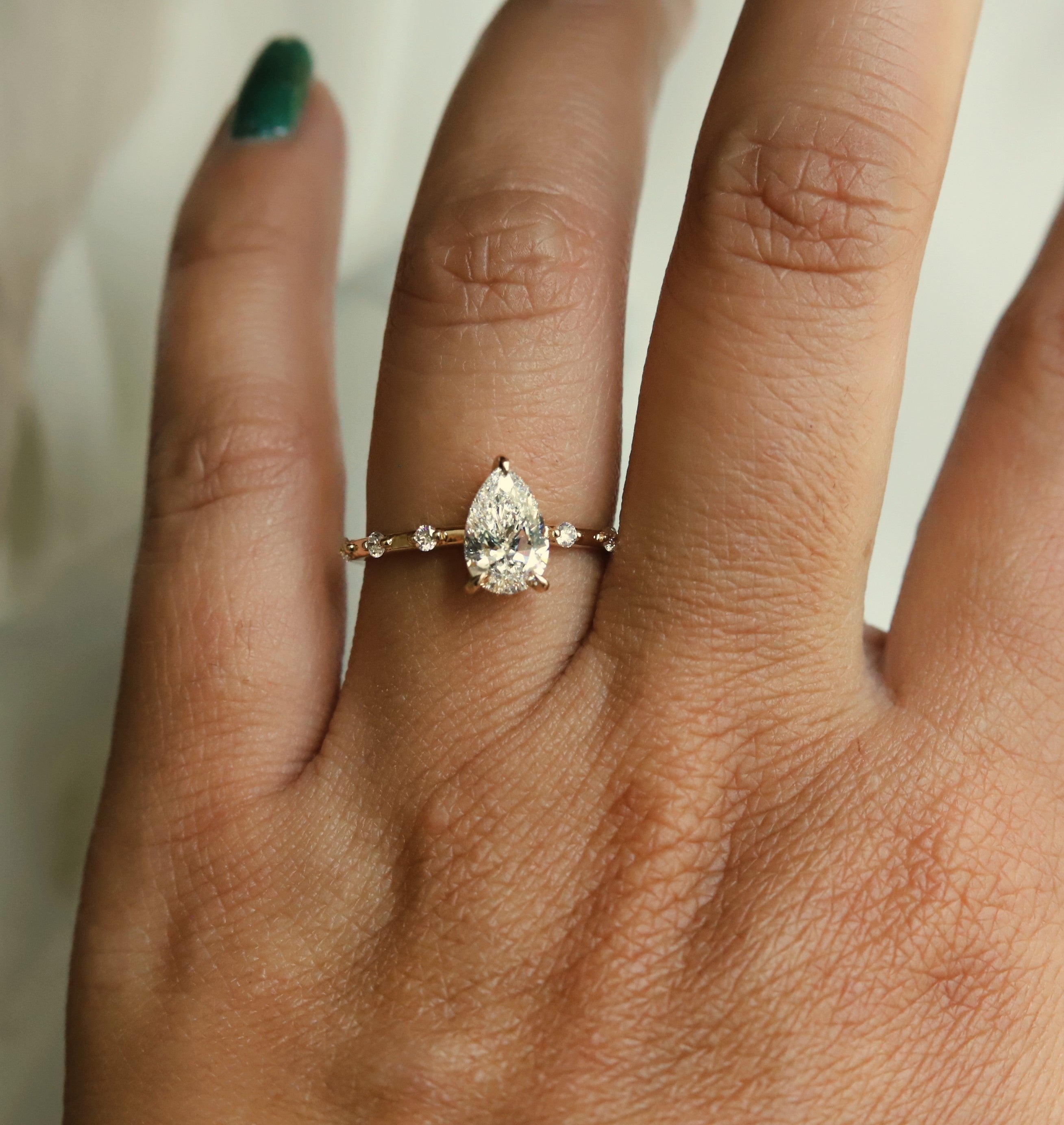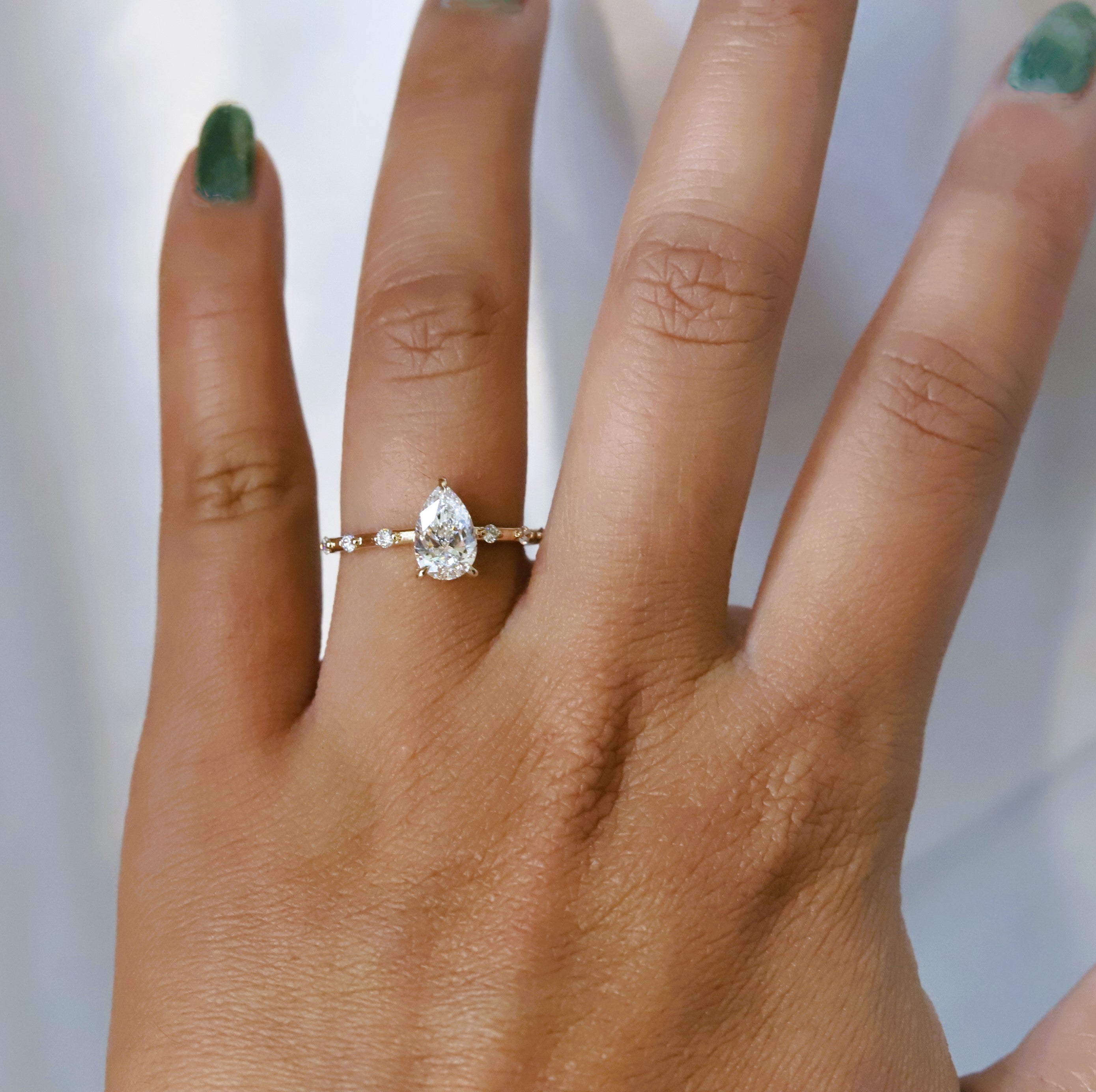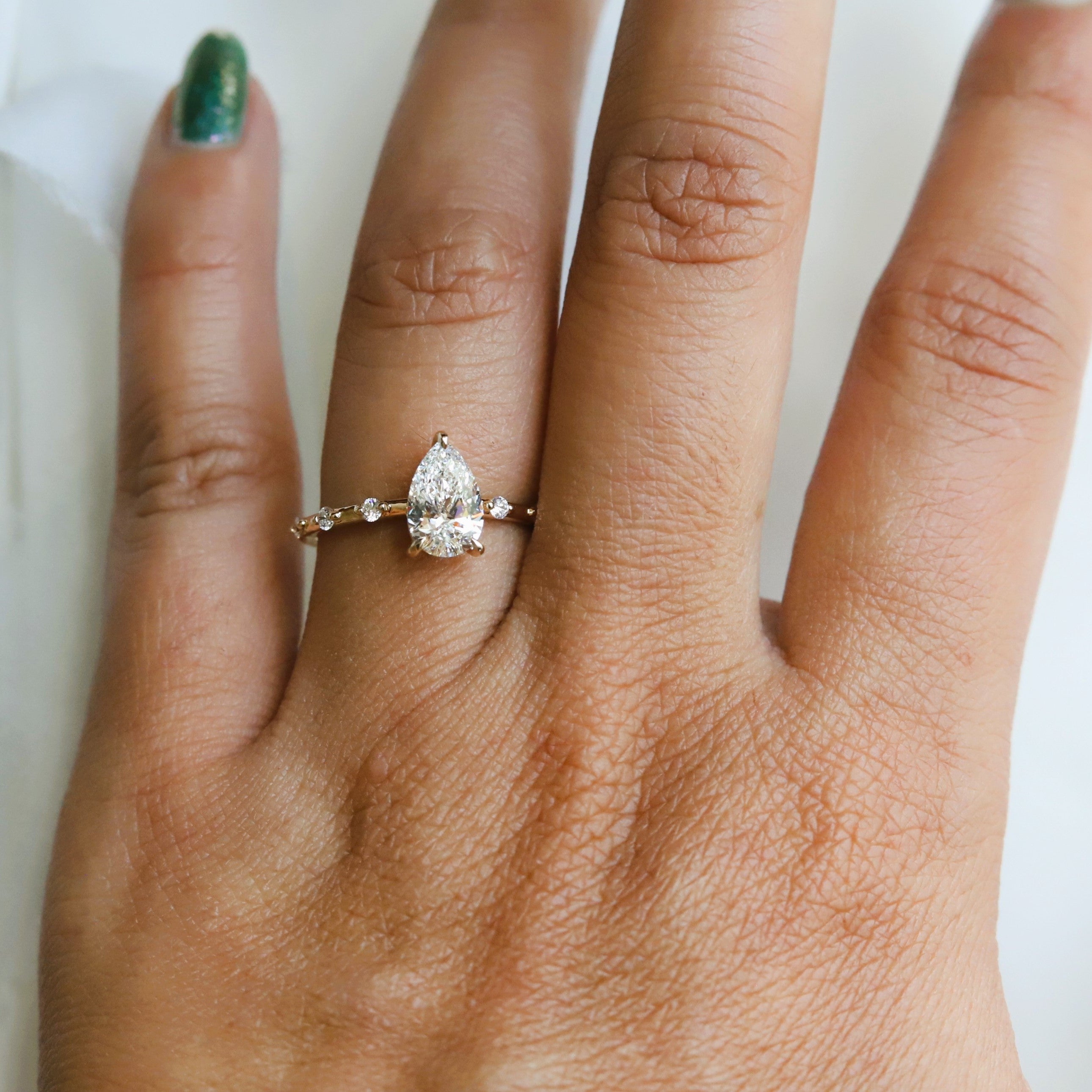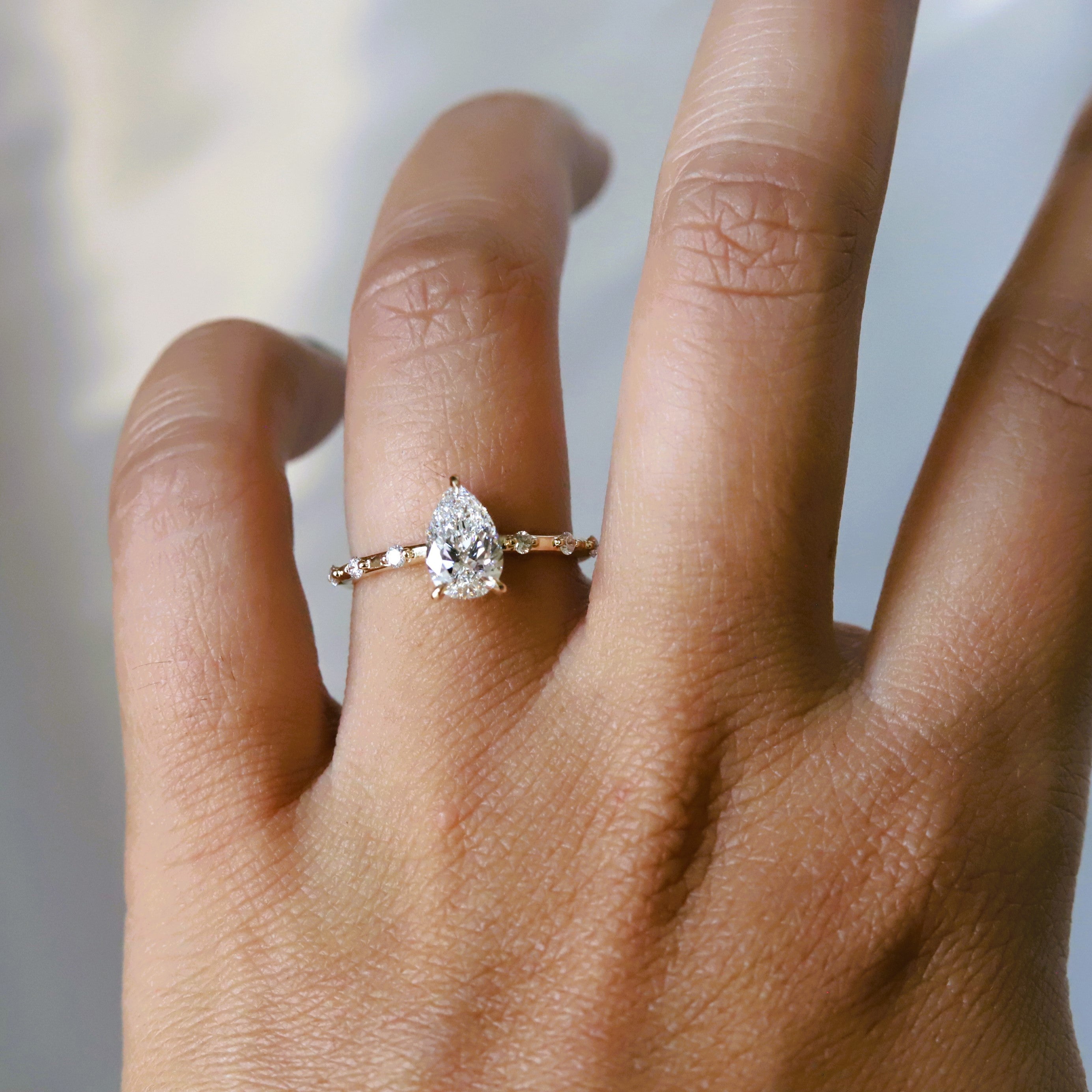 The Aurora ring pairs a sleek, sturdy band with a low-profile basket setting. It showcases a 1 ct. Pear shape center stone, available in Natural Diamond, Lab-Grown Diamond, or Moissanite. Accented by three diamonds on each side, this design delivers timeless sophistication with a minimalist aesthetic, perfect for those desiring a refined and subtle engagement ring. (Shown In Lab-Grown Diamond)