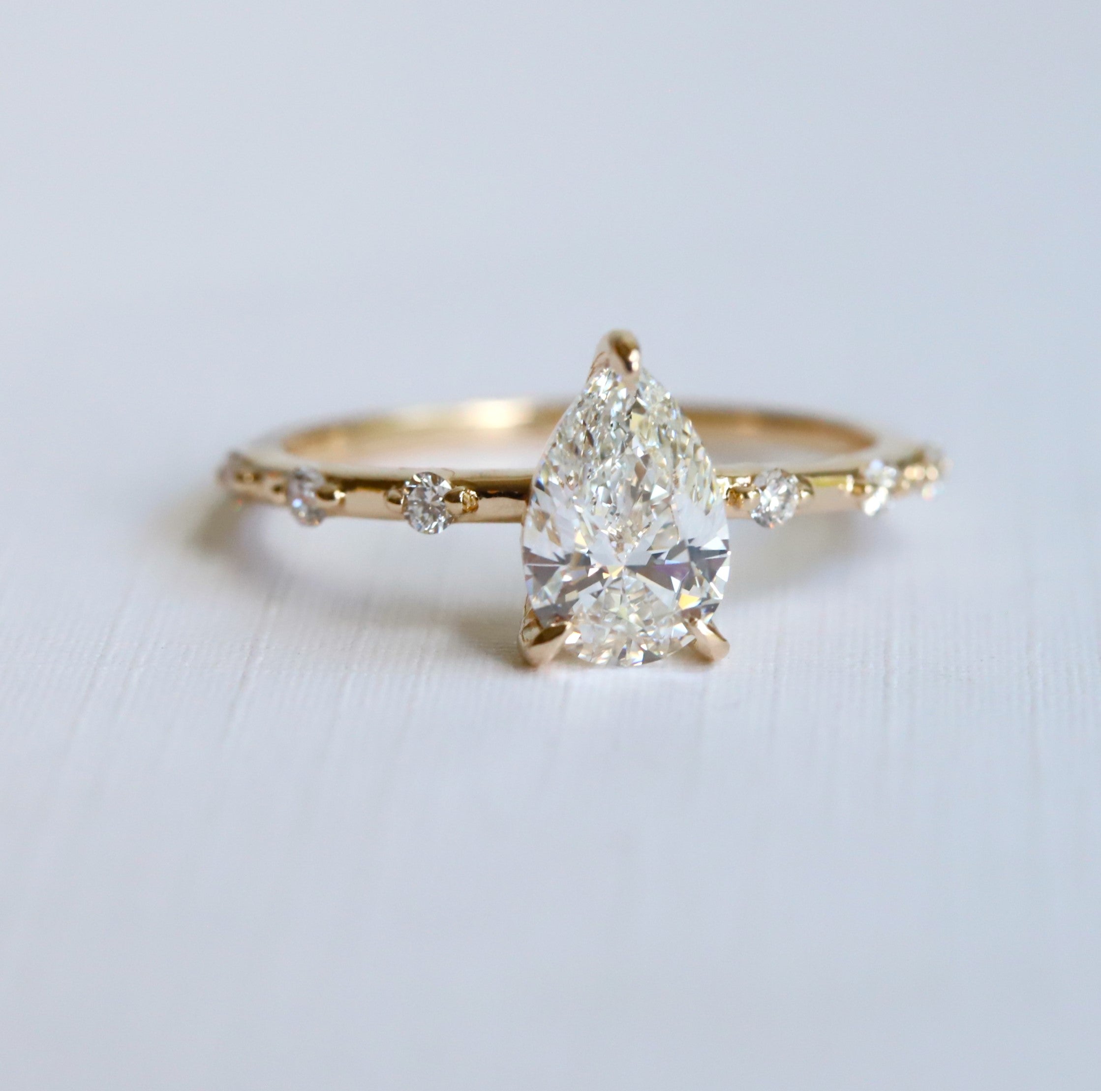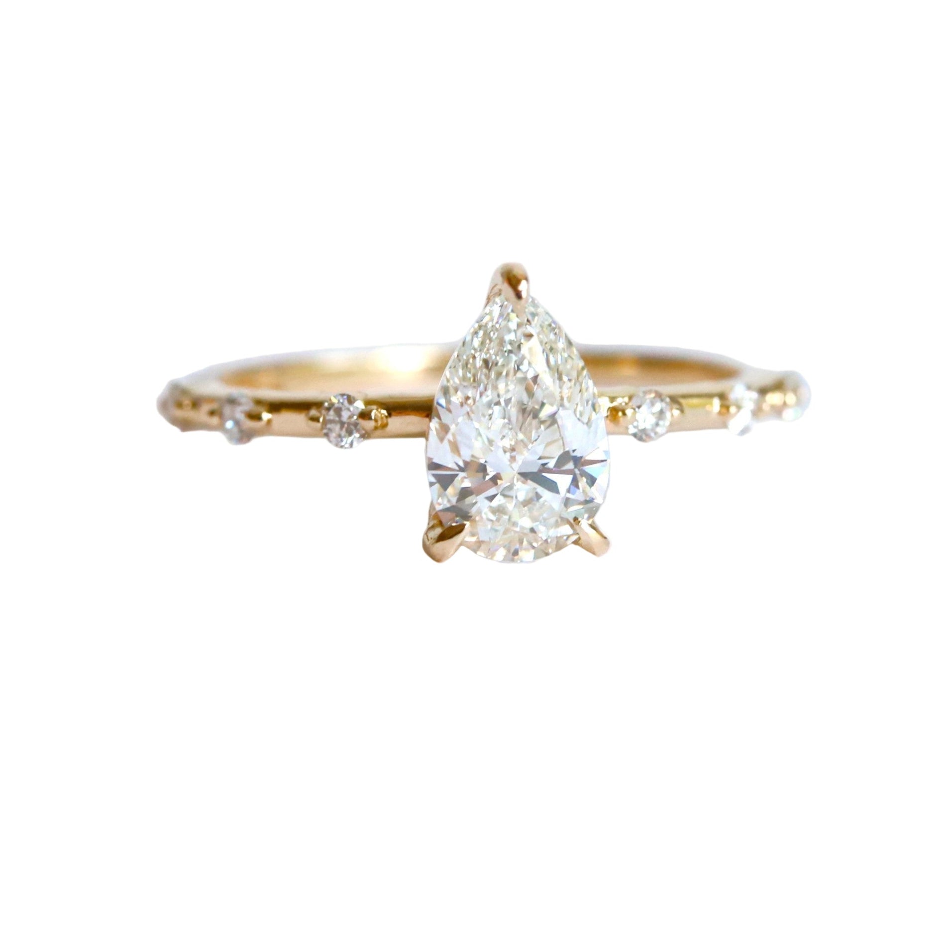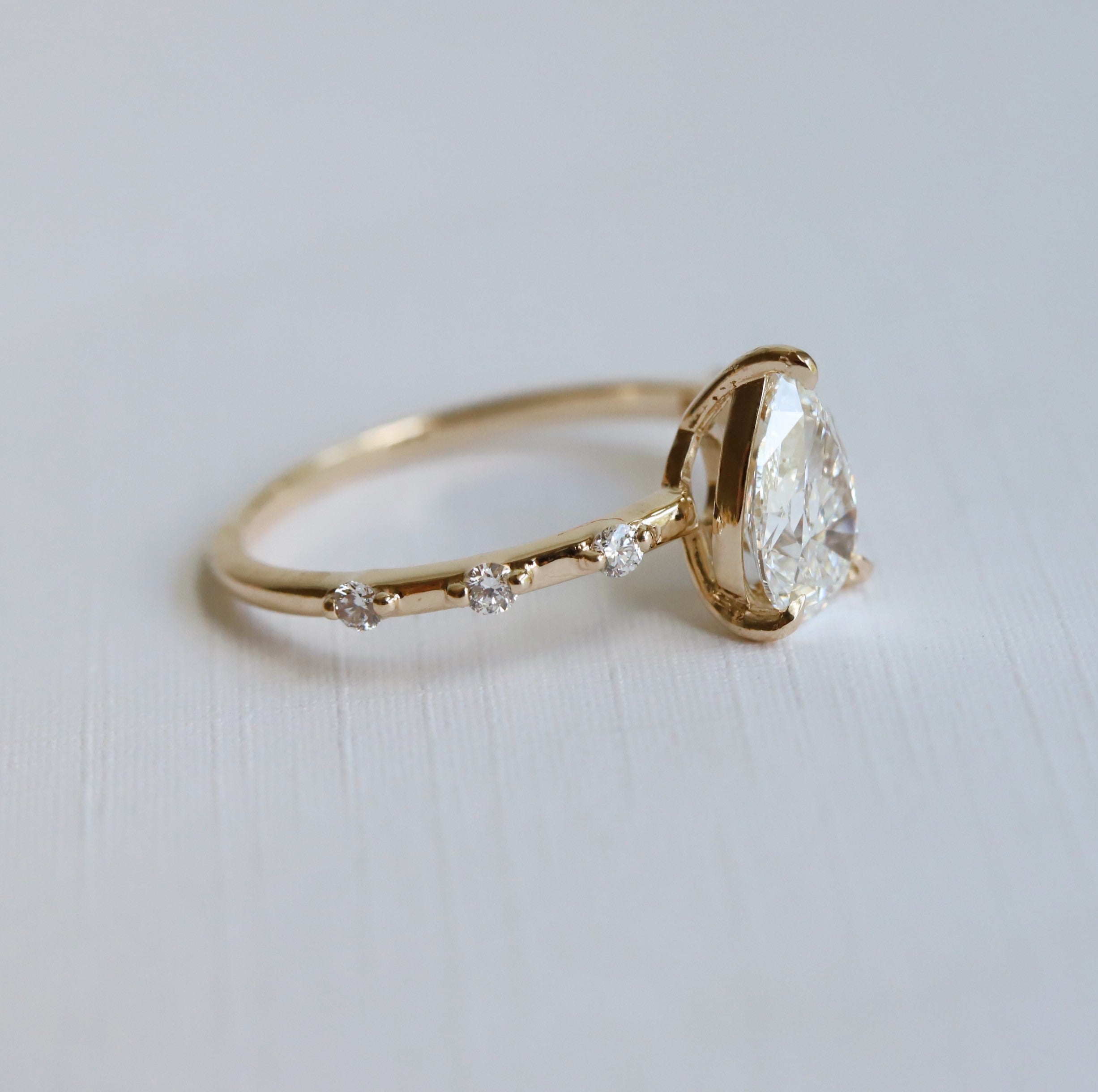 The Aurora ring pairs a sleek, sturdy band with a low-profile basket setting. It showcases a 1 ct. Pear shape center stone, available in Natural Diamond, Lab-Grown Diamond, or Moissanite. Accented by three diamonds on each side, this design delivers timeless sophistication with a minimalist aesthetic, perfect for those desiring a refined and subtle engagement ring. (Shown In Lab-Grown Diamond)
