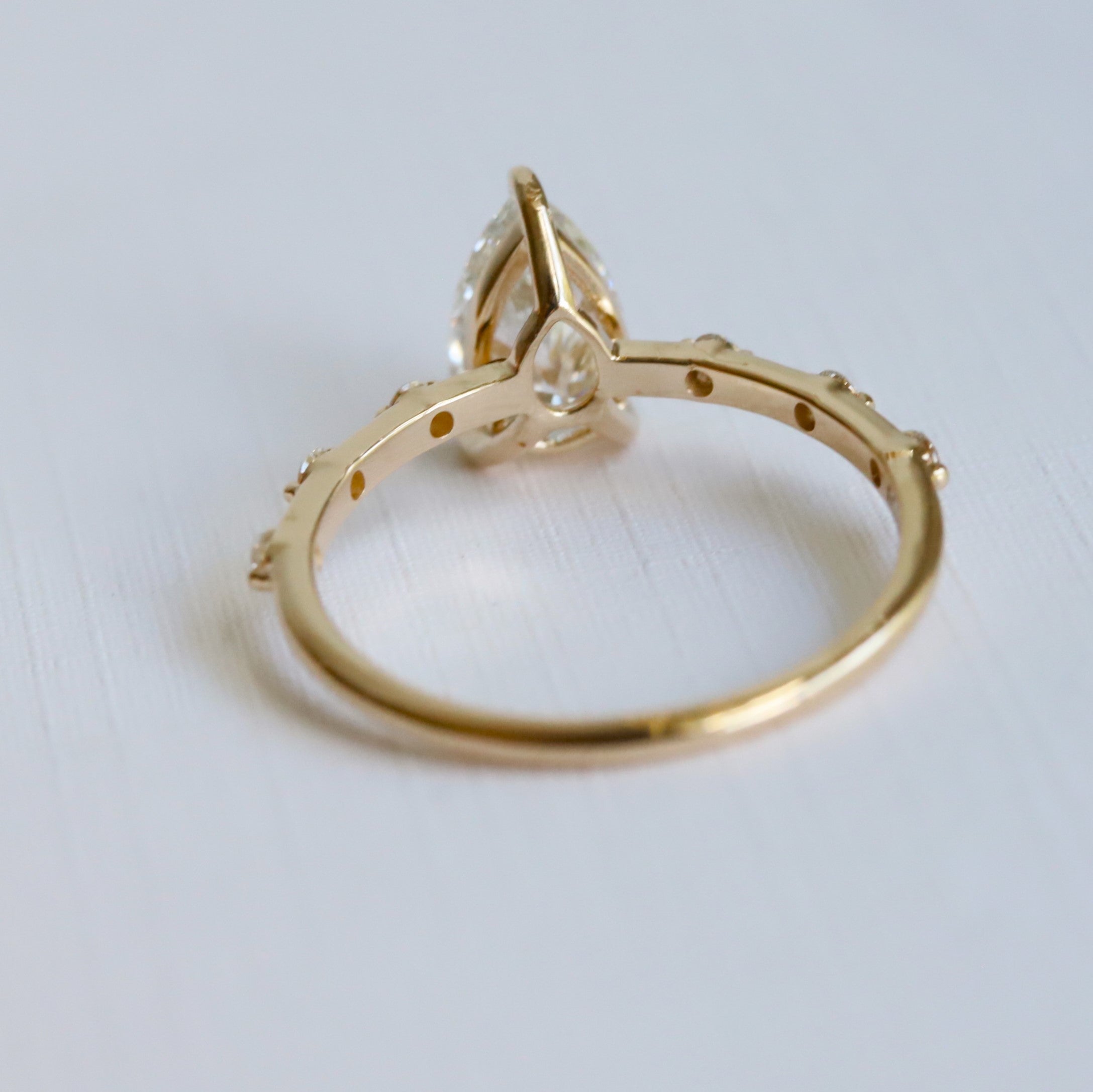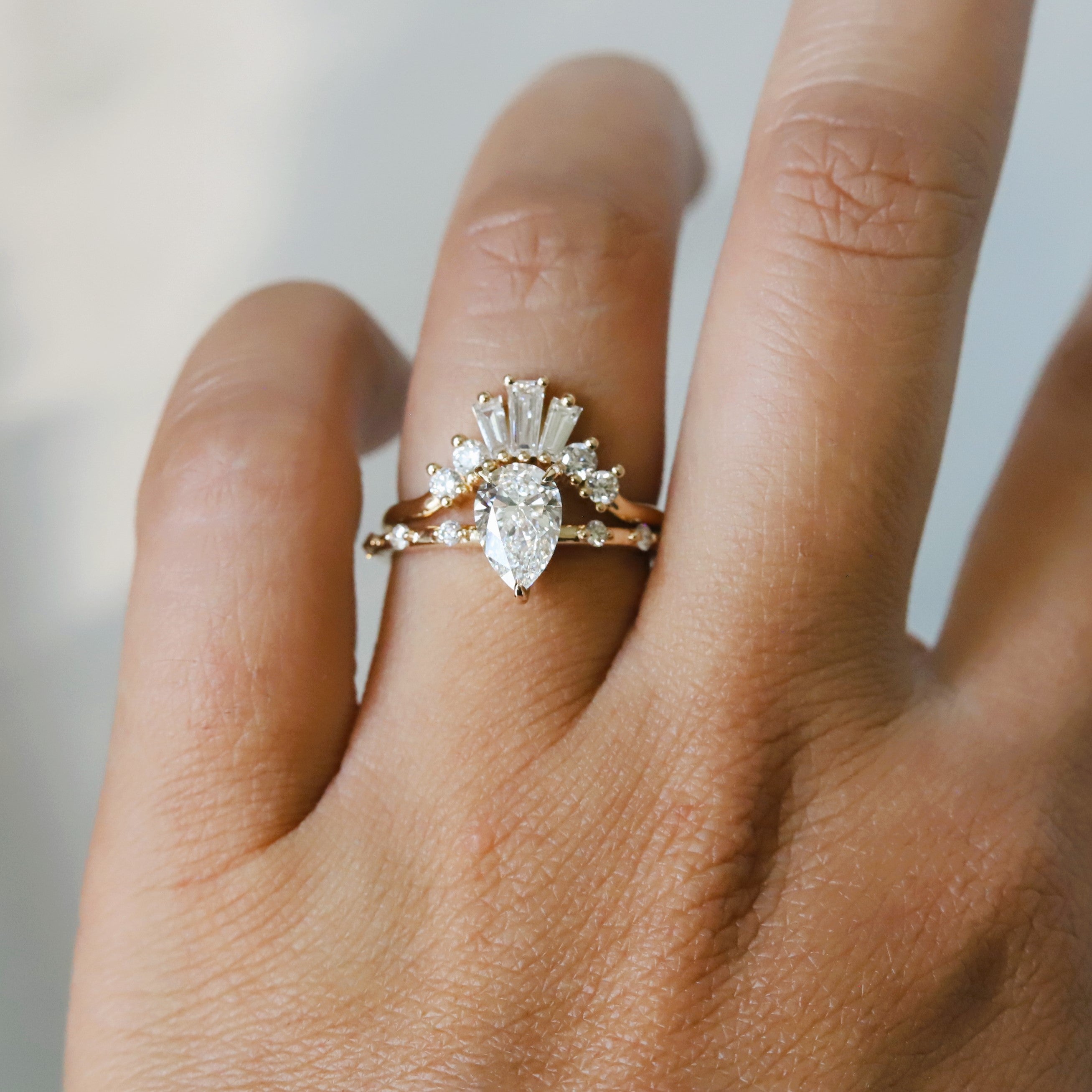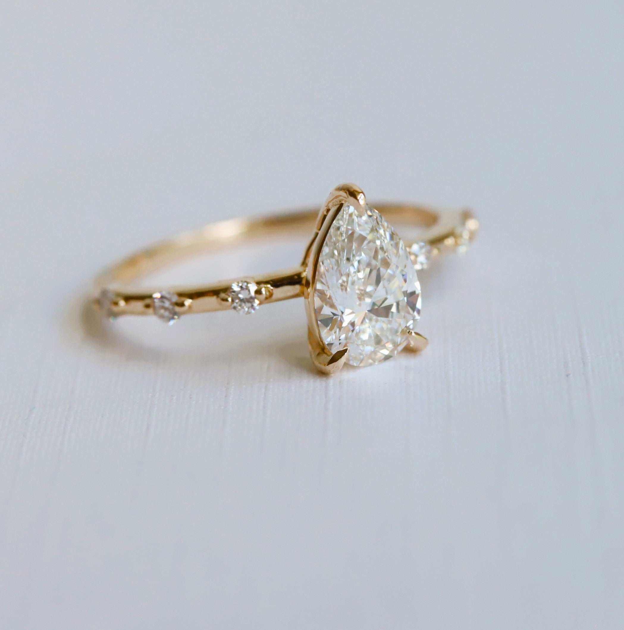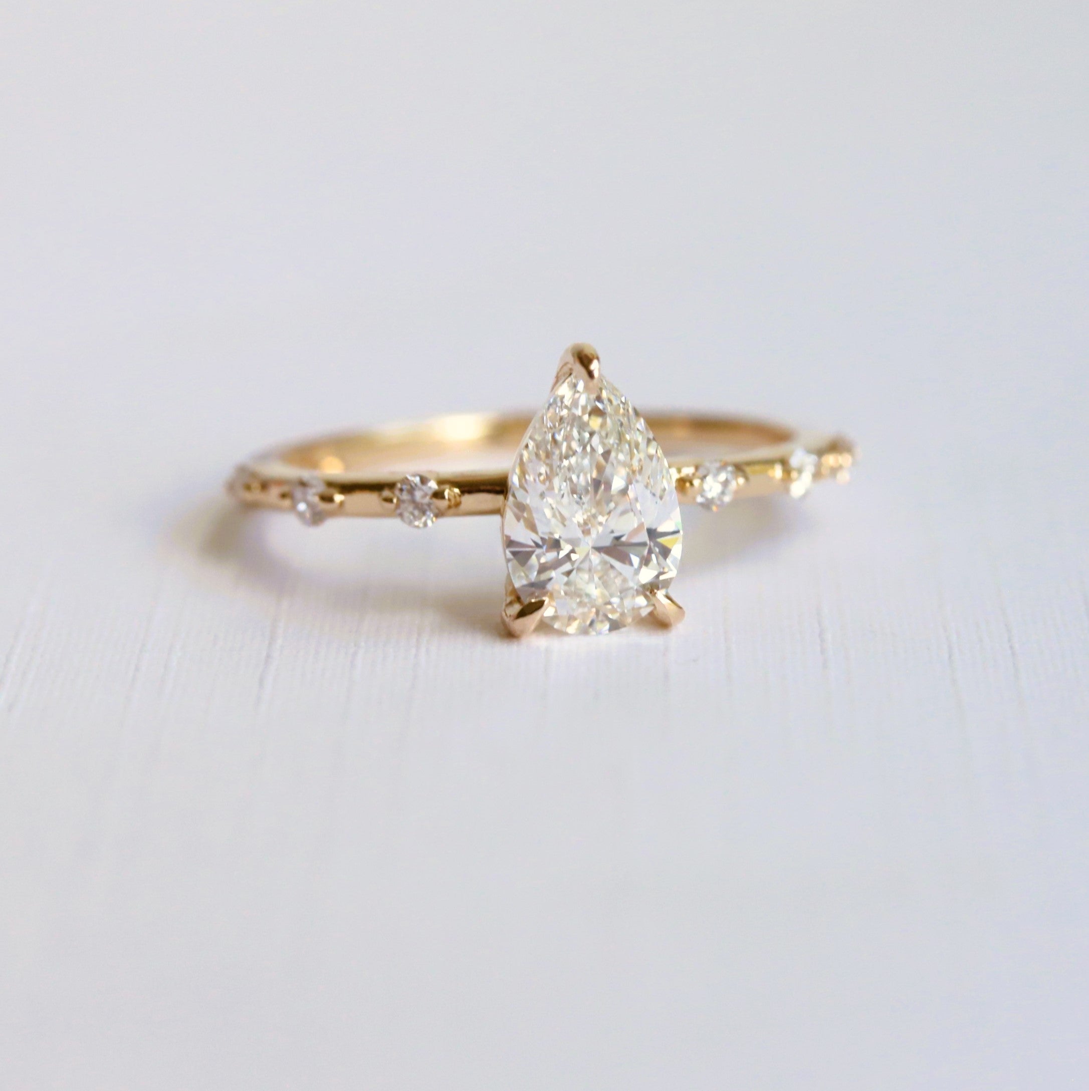 The Aurora ring pairs a sleek, sturdy band with a low-profile basket setting. It showcases a 1 ct. Pear shape center stone, available in Natural Diamond, Lab-Grown Diamond, or Moissanite. Accented by three diamonds on each side, this design delivers timeless sophistication with a minimalist aesthetic, perfect for those desiring a refined and subtle engagement ring. (Shown In Lab-Grown Diamond)