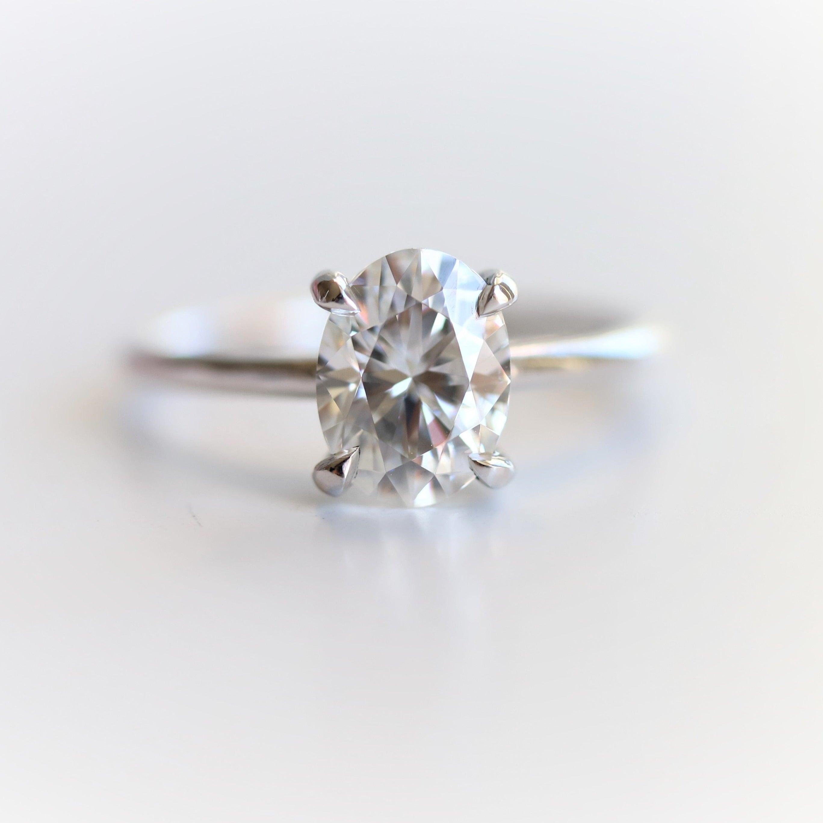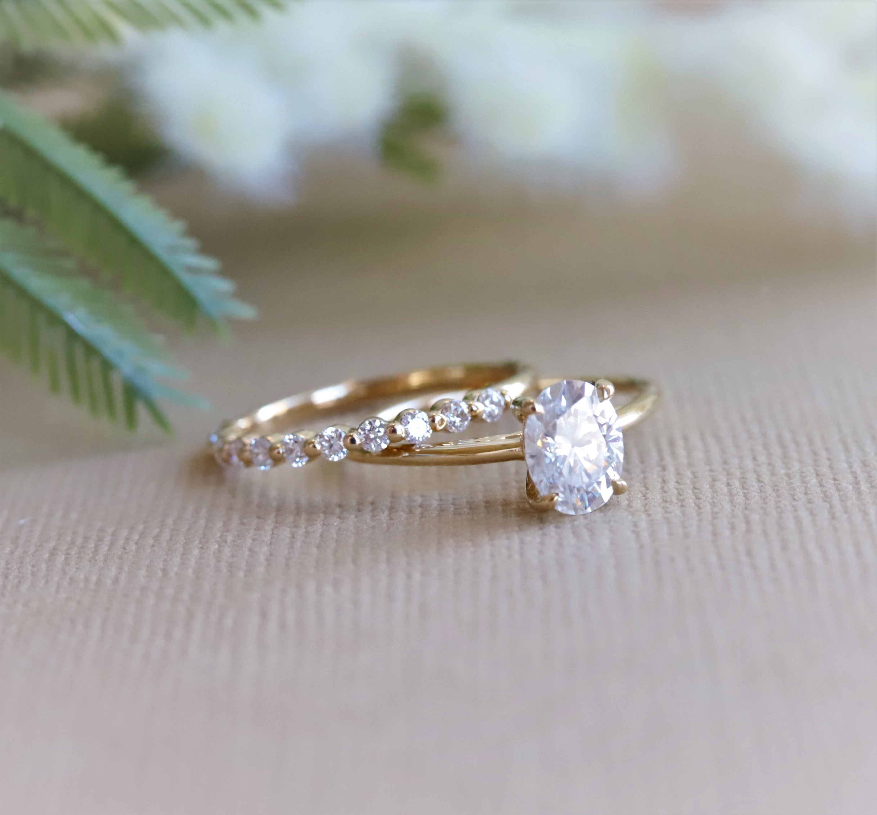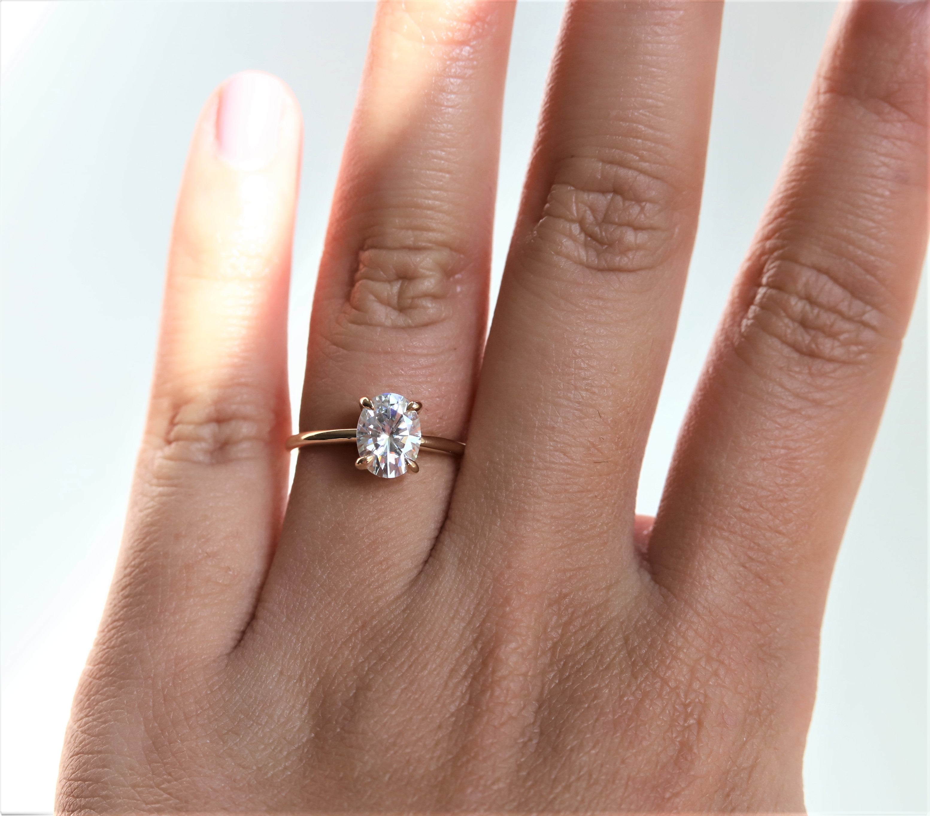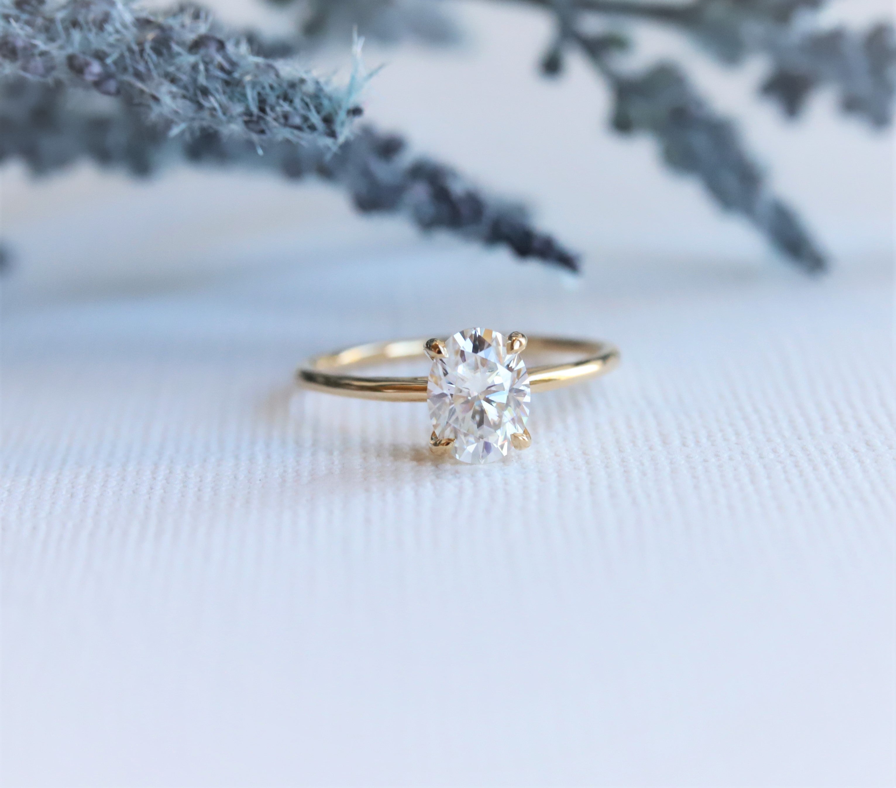 AVA oval-shaped four-prong classic cathedral solitaire ring. A classic setting design with a slim band for a dainty style. It’s set with your choice of lab-created Moissanite or Lab-Grown Diamond. A durable beauty, moissanite, and lab-grown diamond make a brilliant alternative for engagement rings. A less costly substitute for natural earth-mined diamonds.