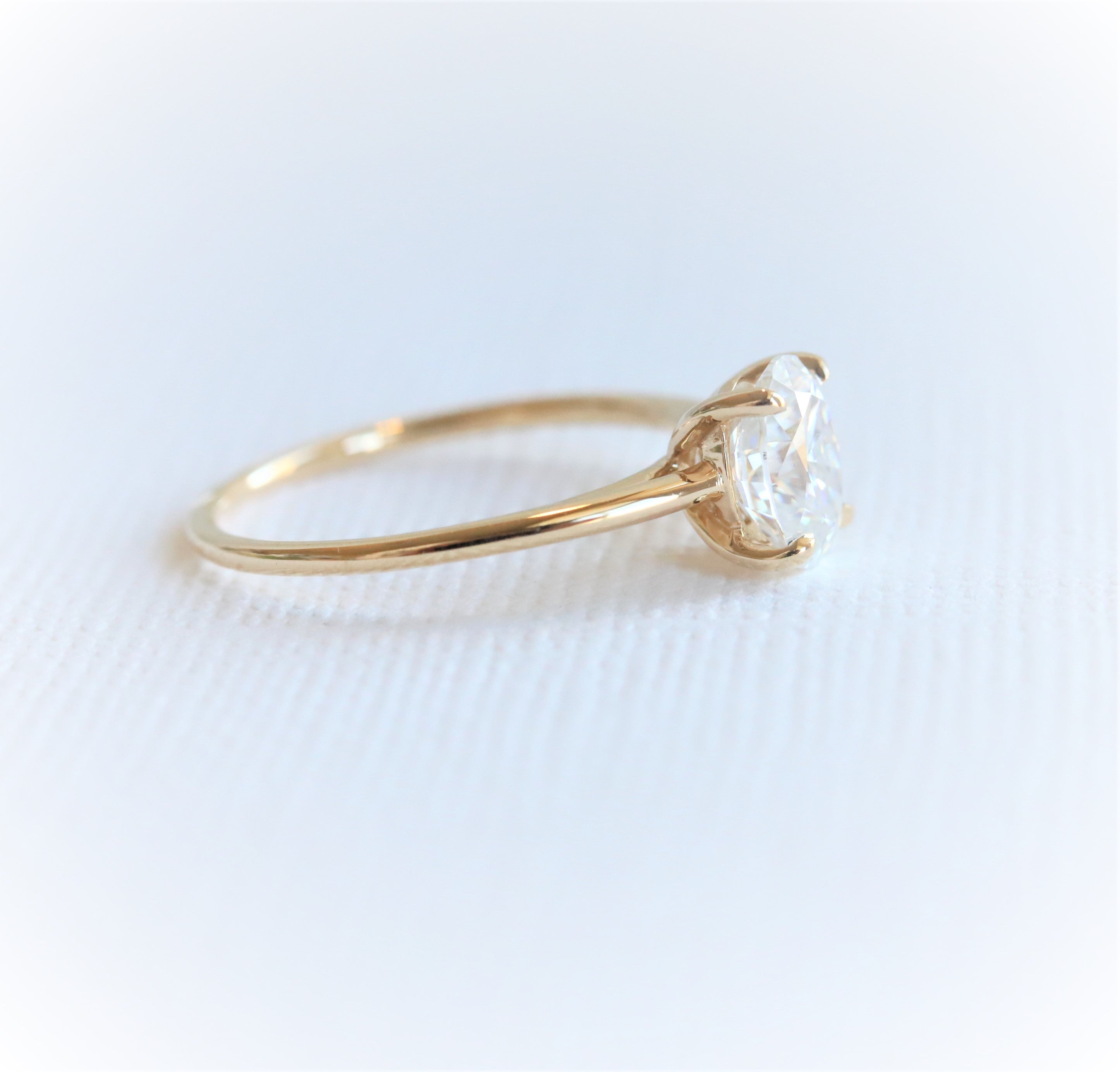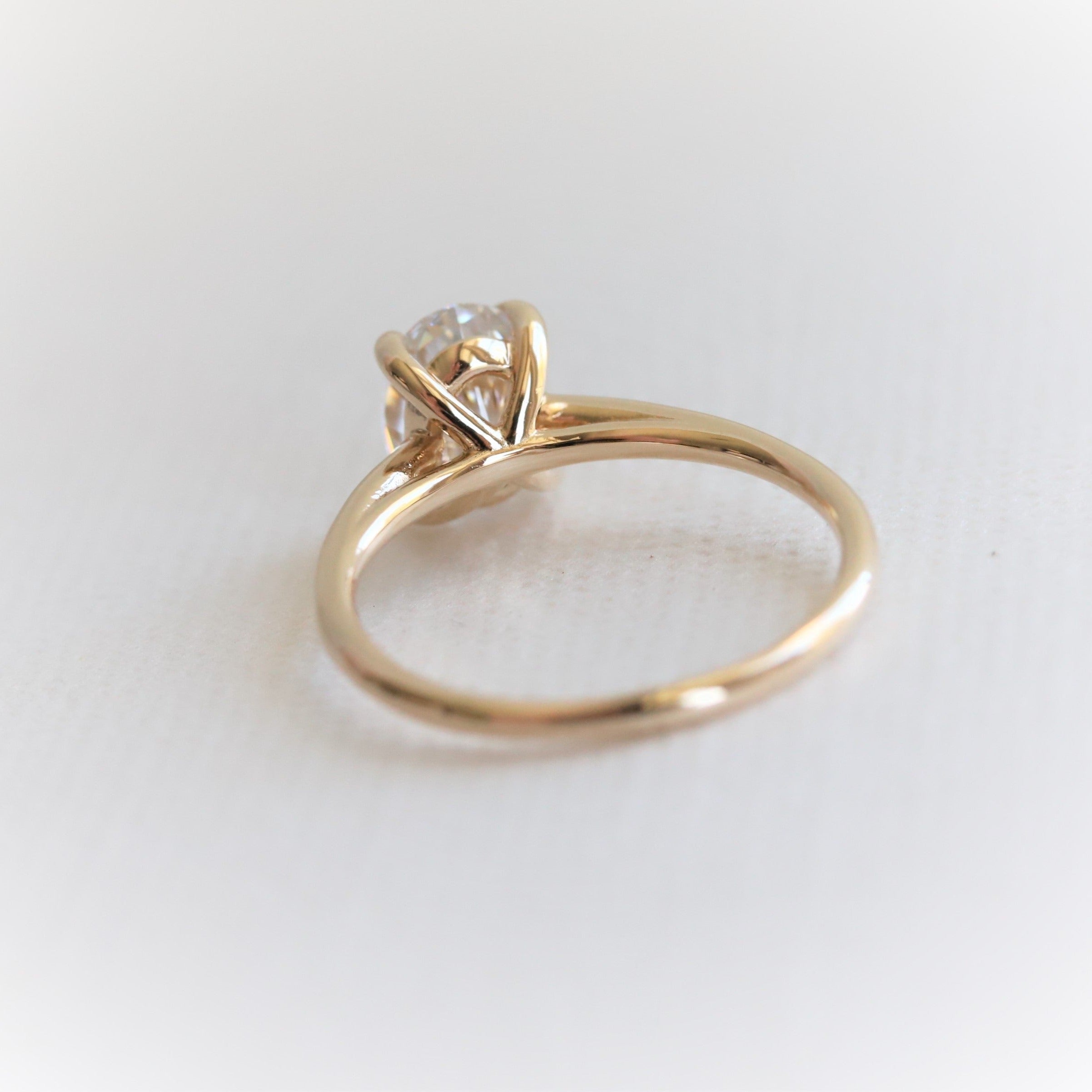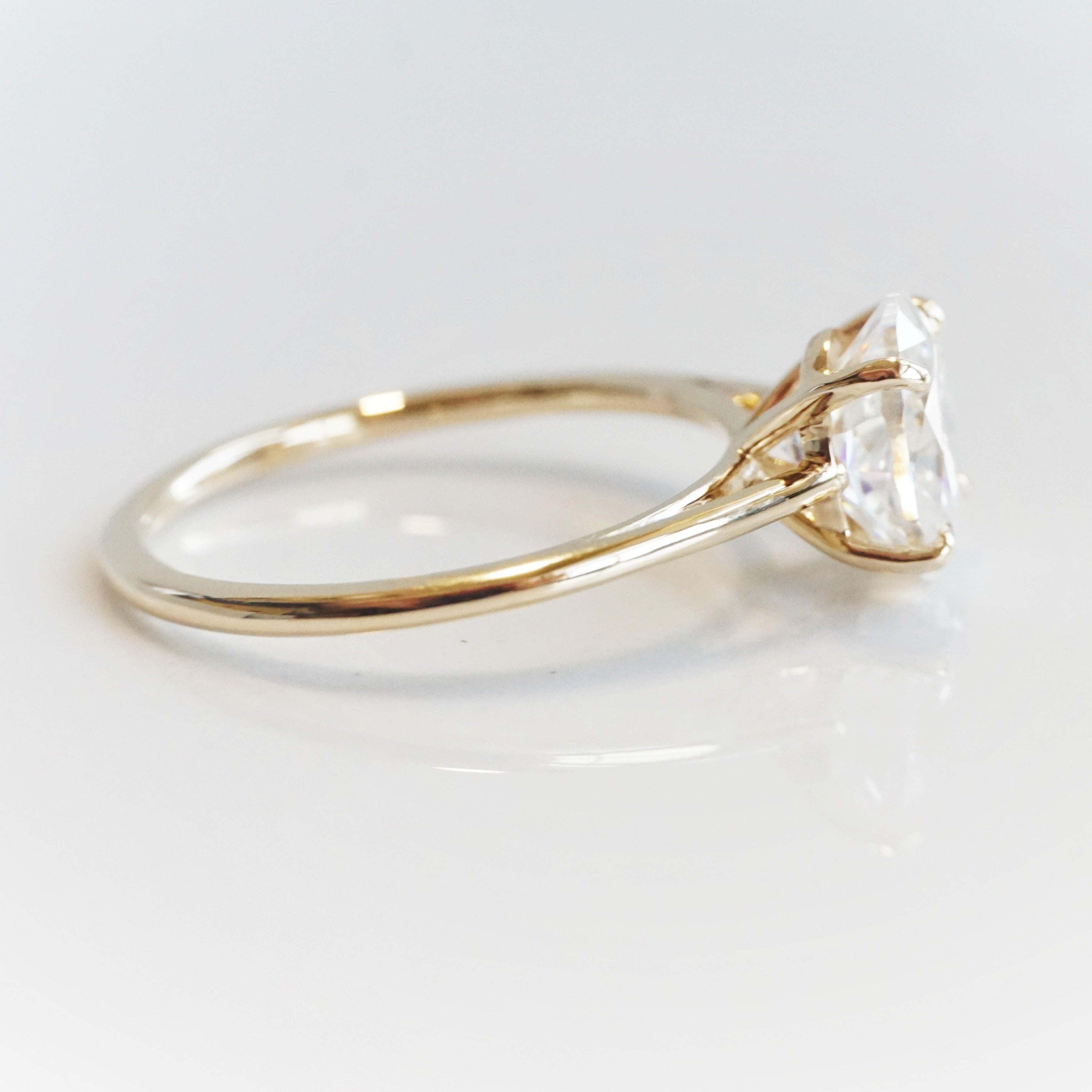 AVA oval-shaped four-prong classic cathedral solitaire ring. A classic setting design with a slim band for a dainty style. It’s set with your choice of lab-created Moissanite or Lab-Grown Diamond. A durable beauty, moissanite, and lab-grown diamond make a brilliant alternative for engagement rings. A less costly substitute for natural earth-mined diamonds.