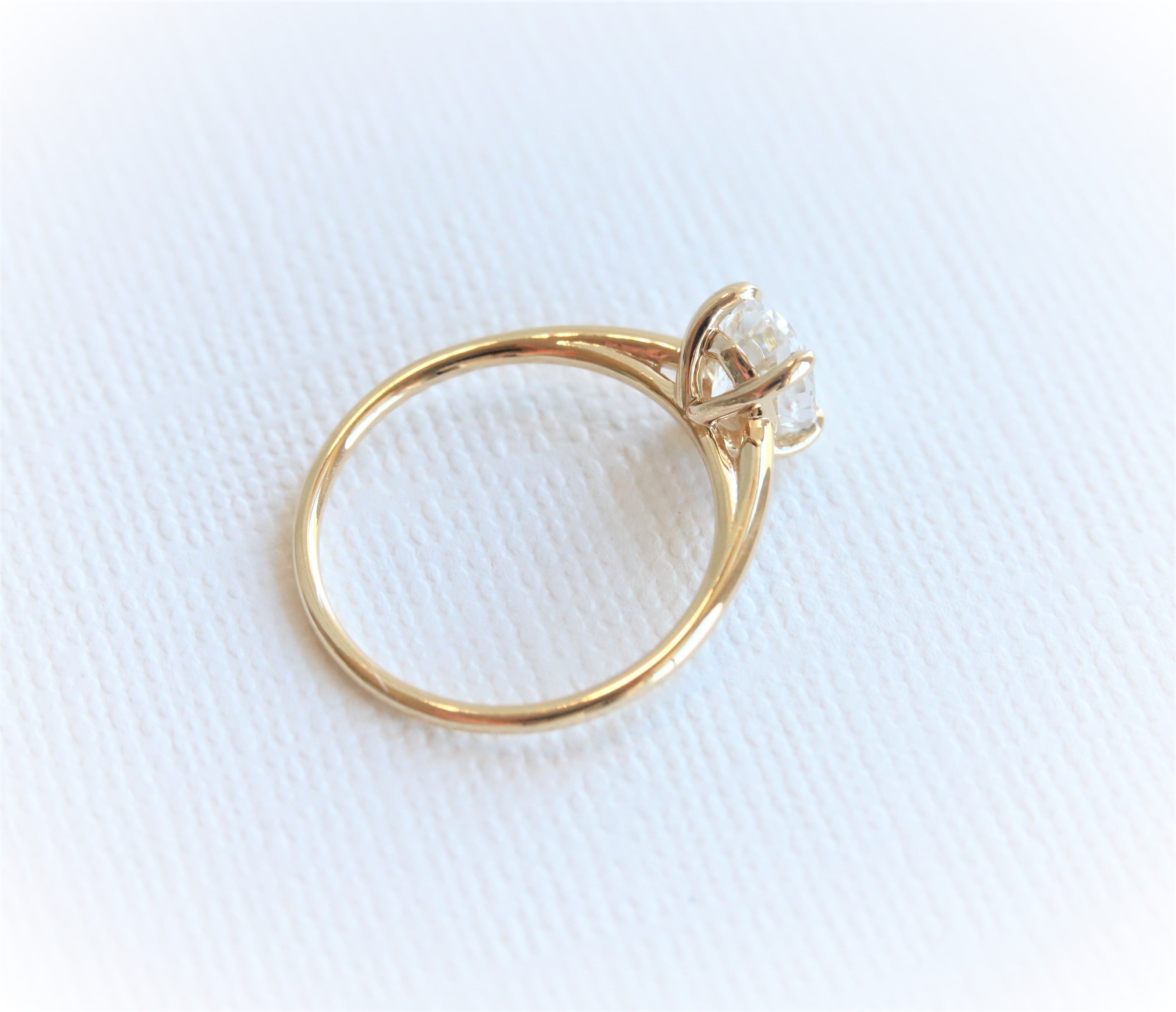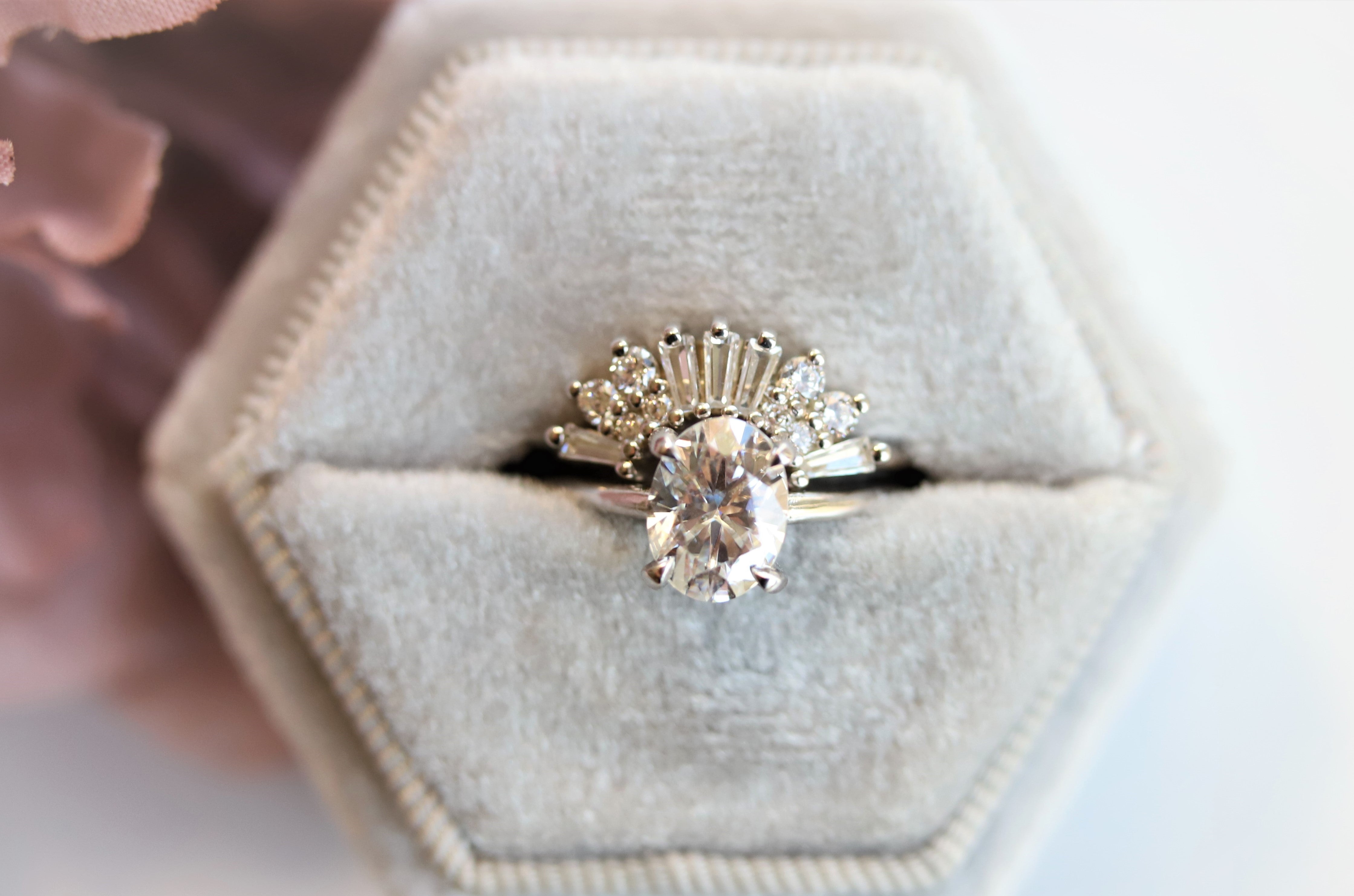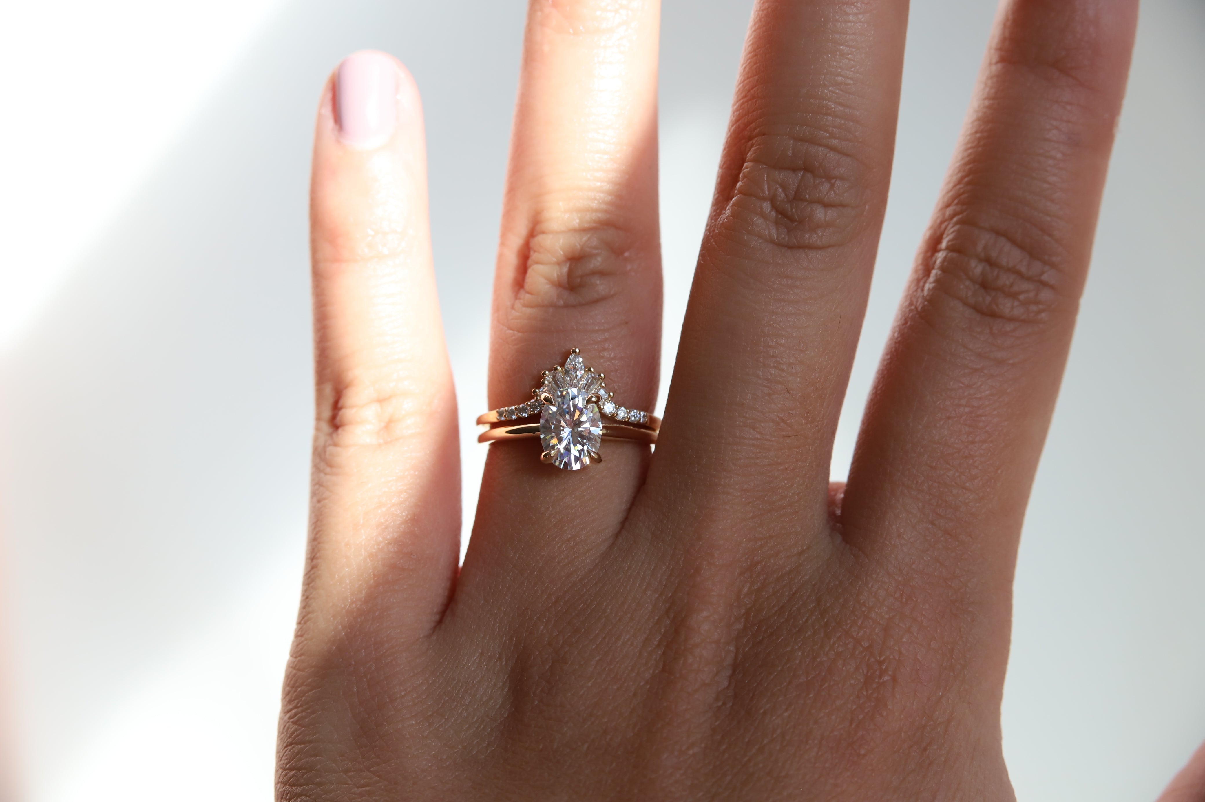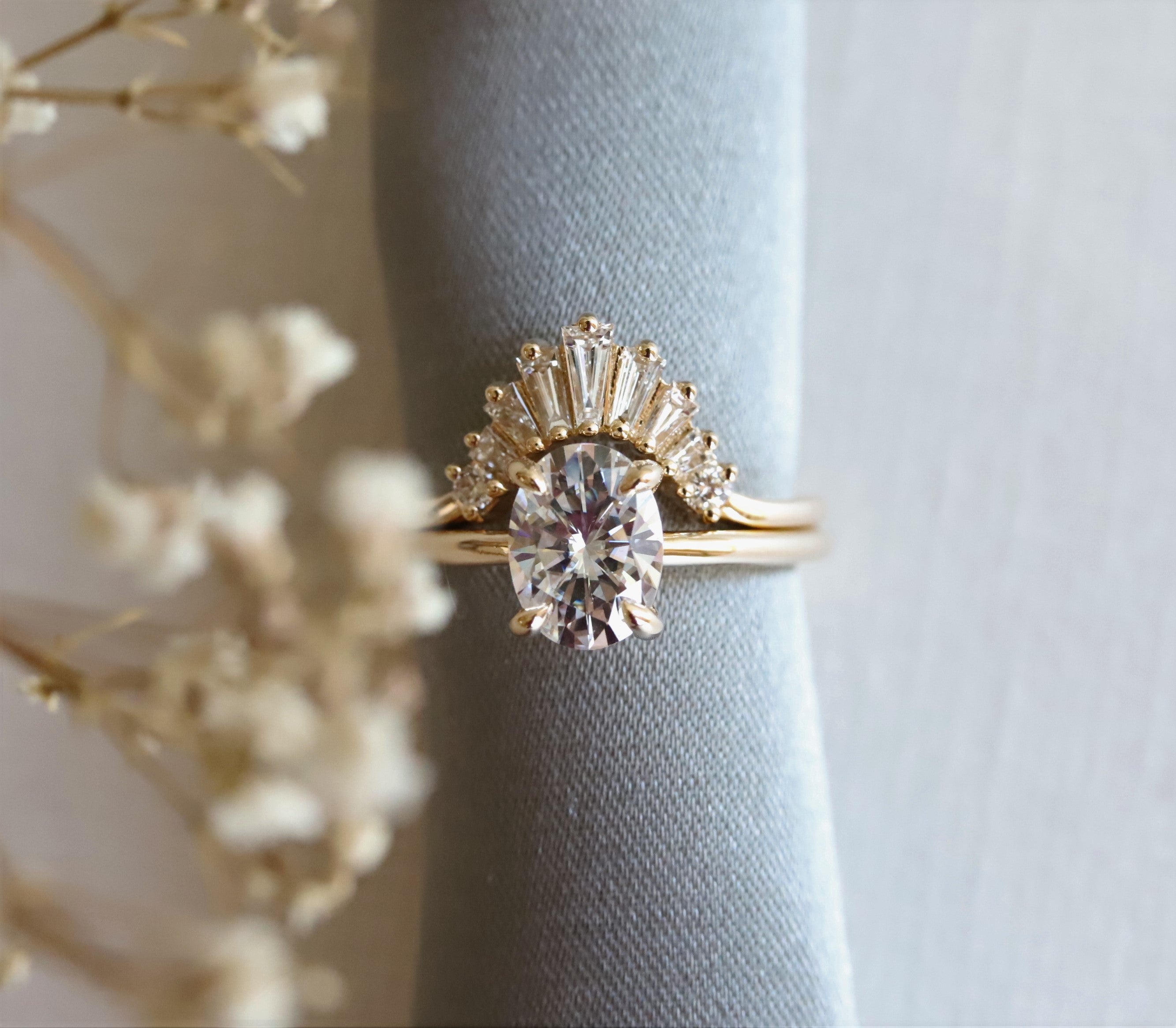 AVA oval-shaped four-prong classic cathedral solitaire ring. A classic setting design with a slim band for a dainty style. It’s set with your choice of lab-created Moissanite or Lab-Grown Diamond. A durable beauty, moissanite, and lab-grown diamond make a brilliant alternative for engagement rings. A less costly substitute for natural earth-mined diamonds.