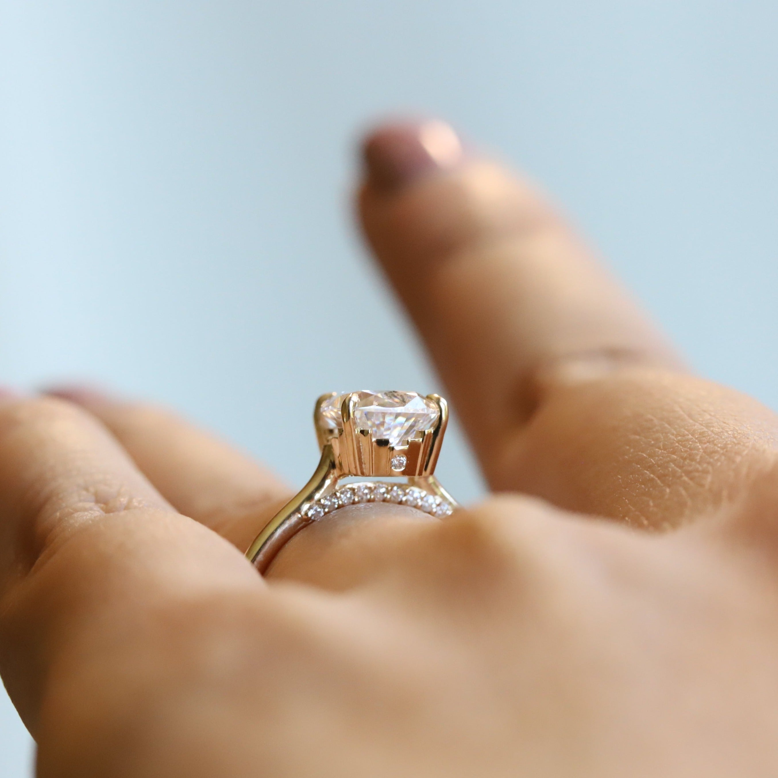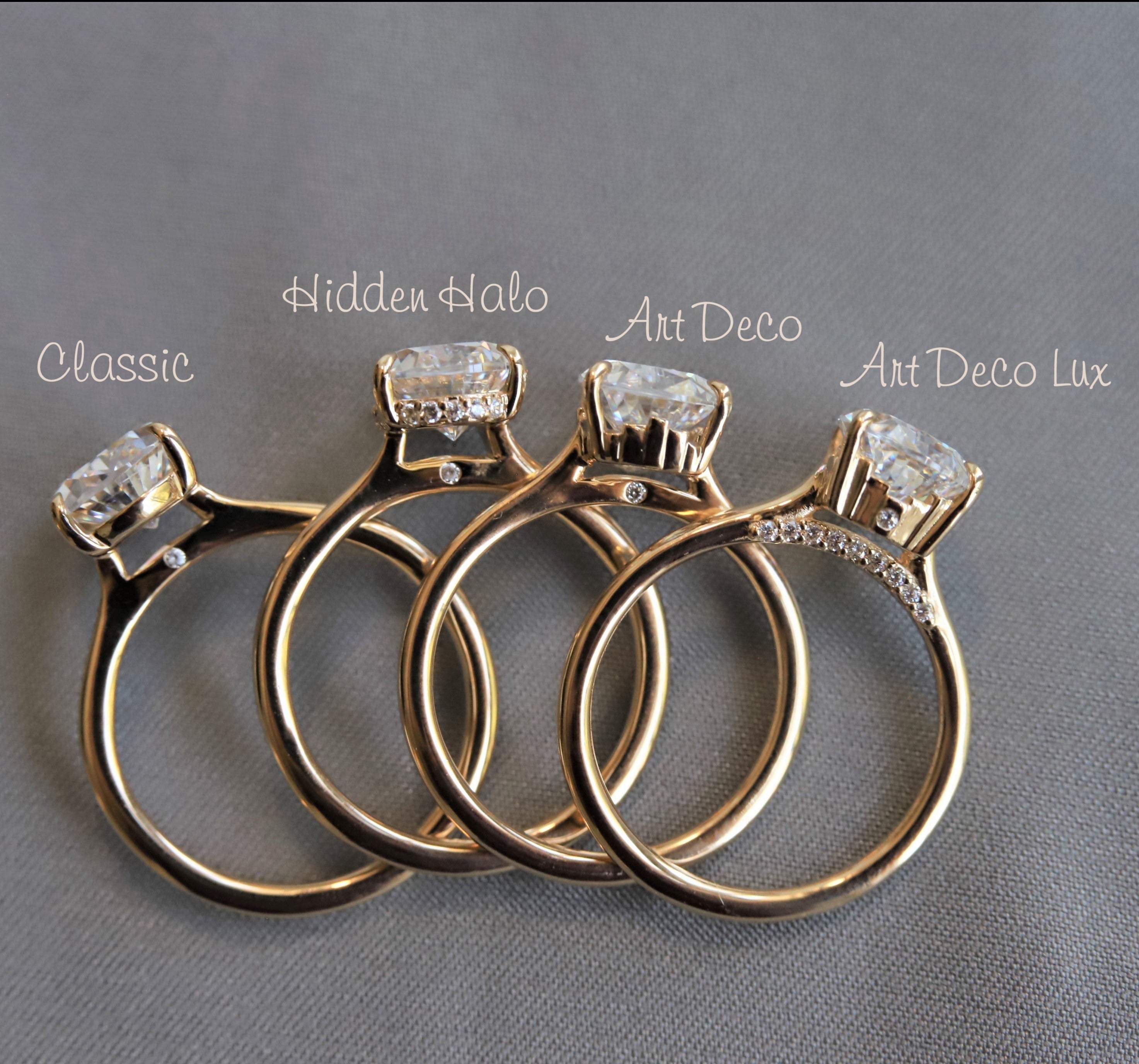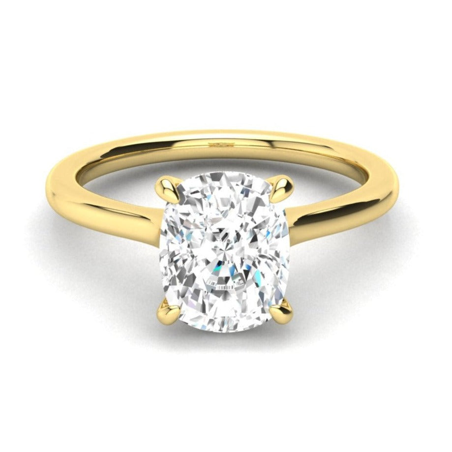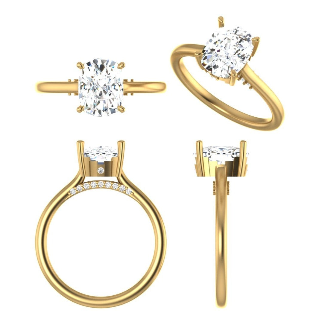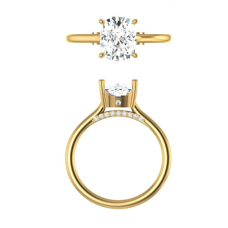 This customized diamond engagement ring features a sparkling, brilliant-cut diamond nestled in a contemporary Cathedral setting underneath the mounting. An elongated cushion cut diamond solitaire sits secured in a classic claw-prong setting with an Art Deco-inspired design on each side. A smooth, half-rounded shank amplifies this unique diamond engagement ring. Blend vintage inspiration with modern design elements with this stunning ring. Dainty yet durable, elegant, and unique. This ring is designed to stack with straight or contour bands