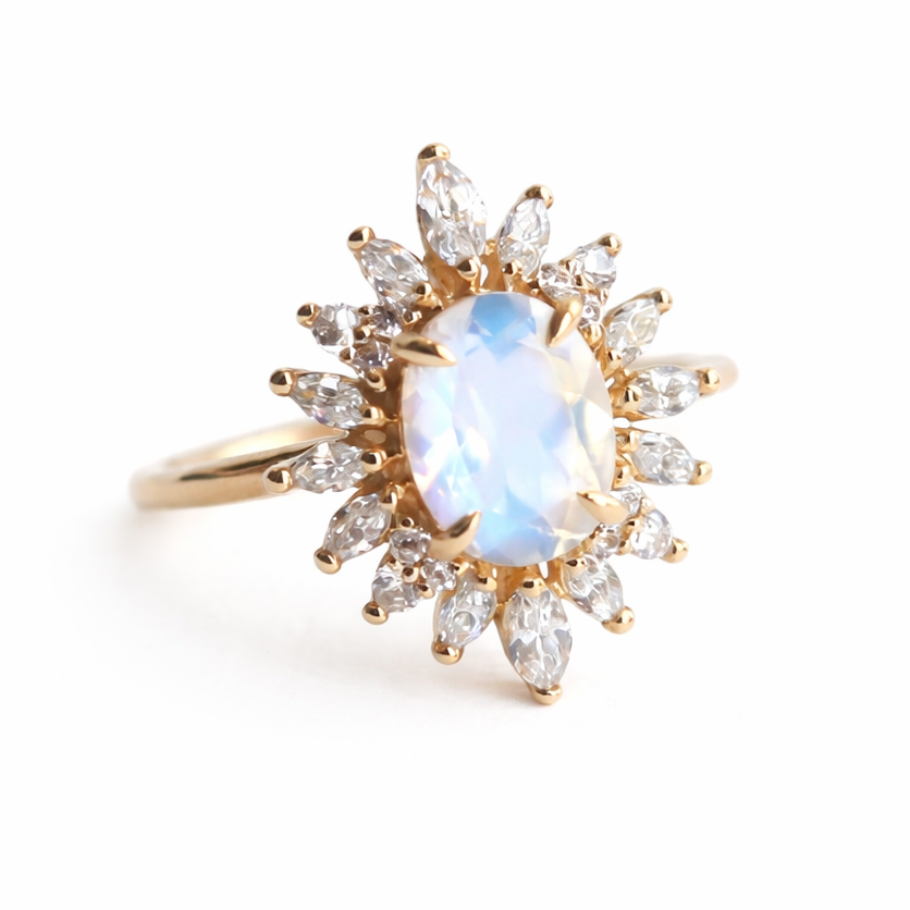 A flashy natural rainbow moonstone surrounded by a halo of sparkling ✨marquise & round stones. This elegantly vintage-inspired ring features one hand-selected natural rainbow moonstone, secured in a four-prong setting in the center, framed by a glittering cluster of sparkling side stones of your selection. Created on a graceful slim band for a dainty look and comfortable wear. This handcrafted ring is perfect for anniversaries or birthdays, it will surely be treasured for years to come.