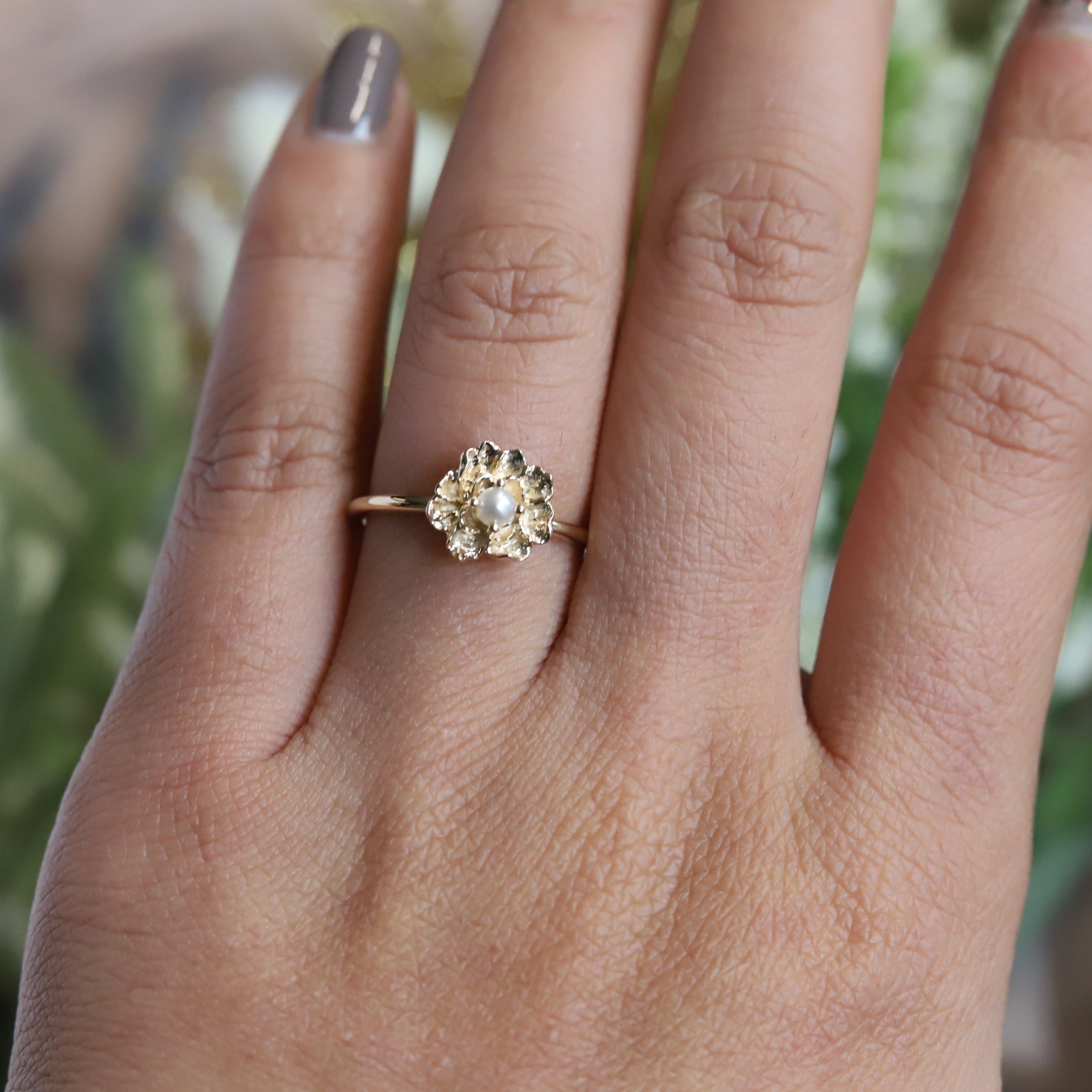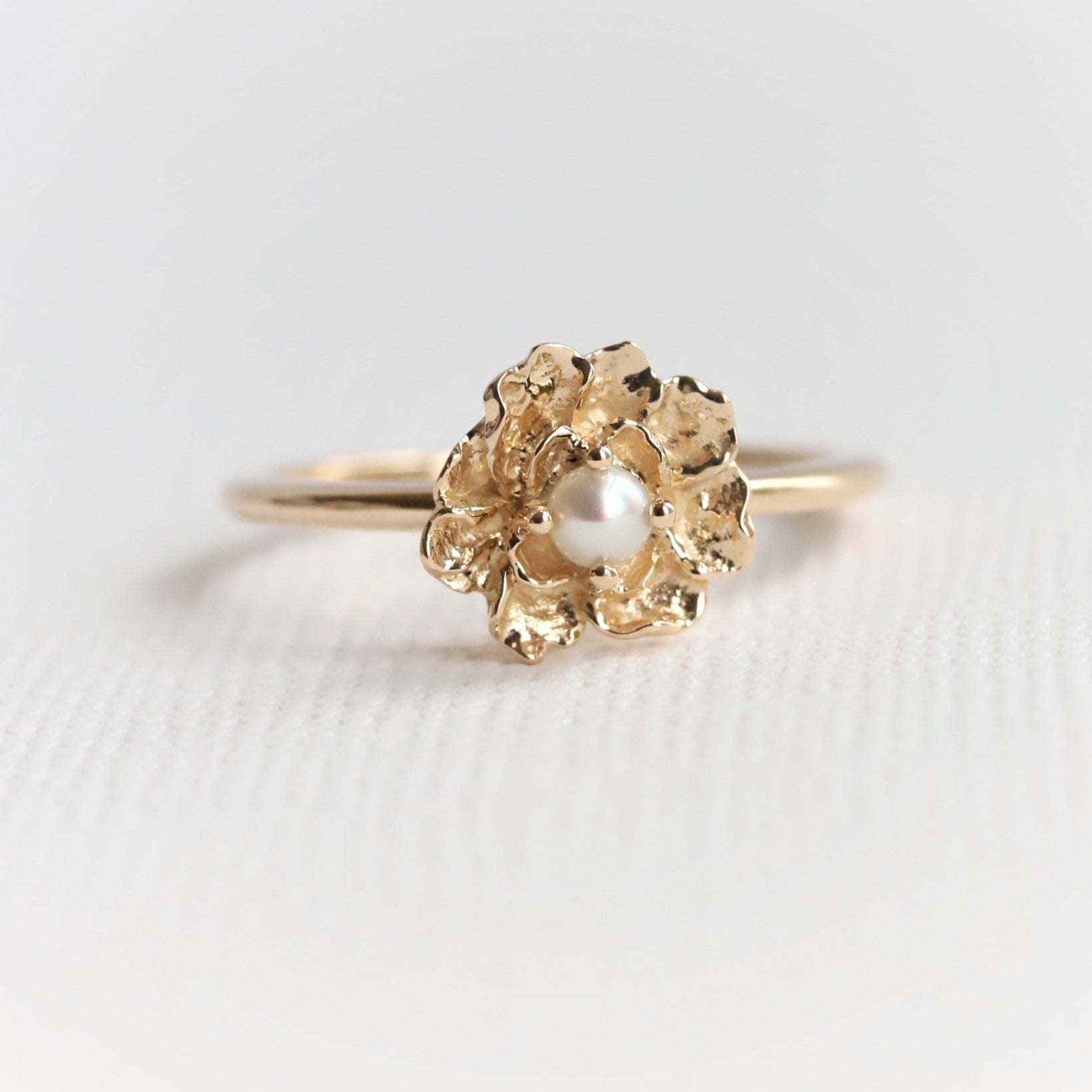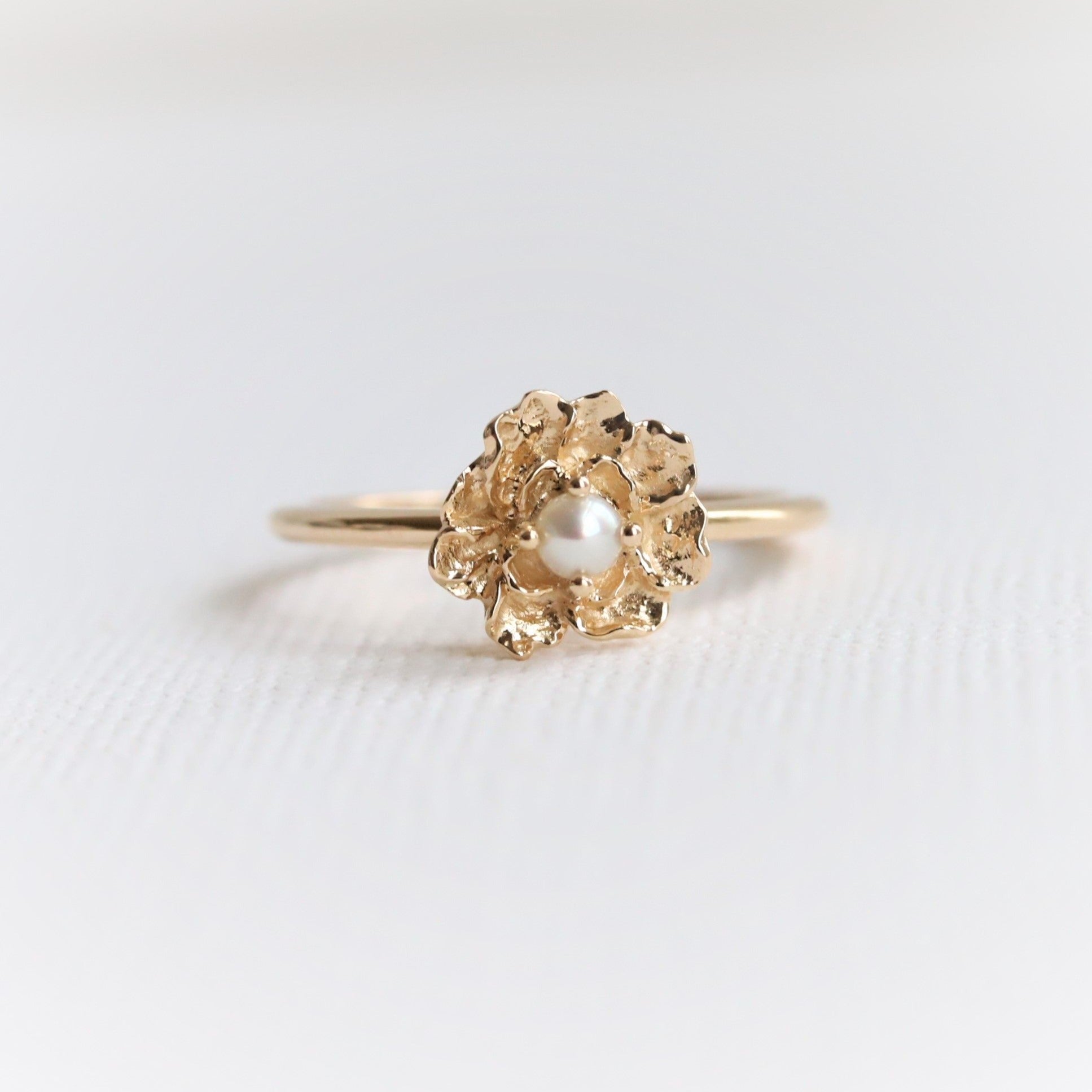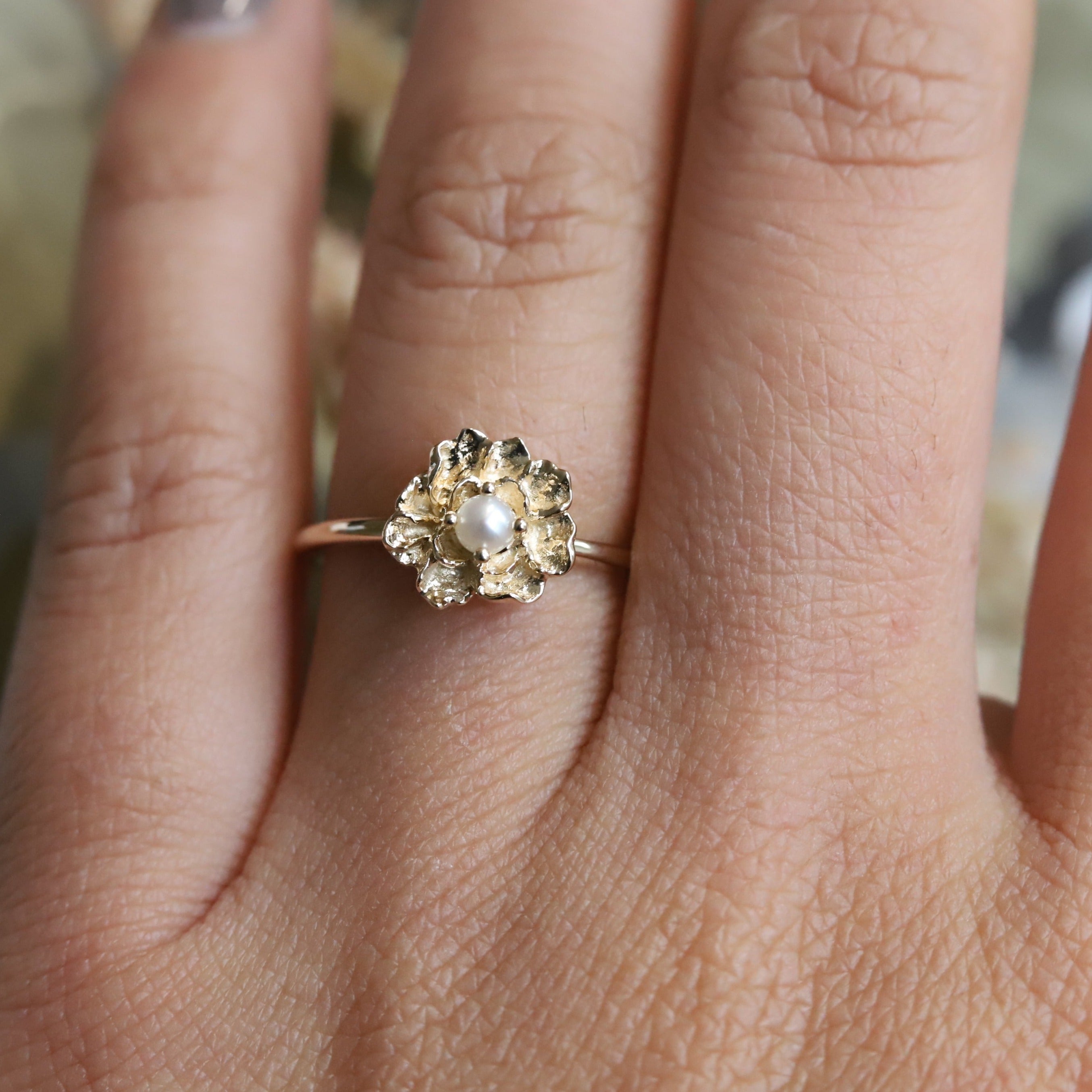 This Peony ring combines the elegance of a peony with the feminine touch of a shimmering pearl center. The slim band is perfect for stacking, adding a touch of sophistication to any outfit. Enhance your style with this unique and timeless piece.