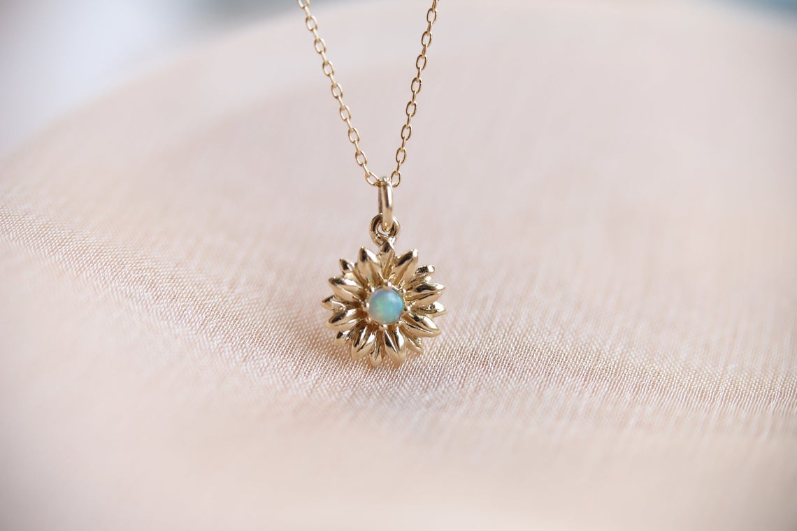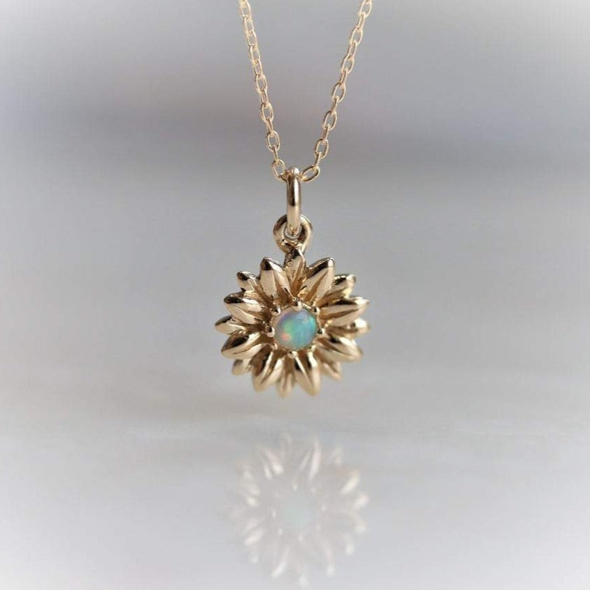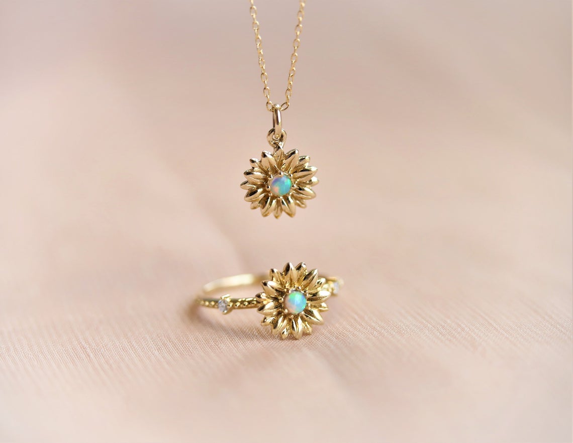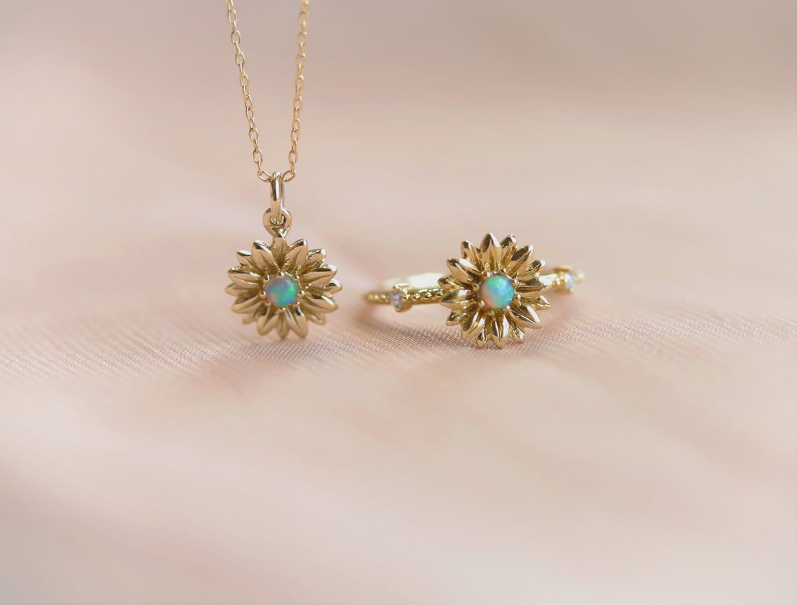 Inspired by the vibrancy of nature and the delicate petals of the sunflower—a timeless symbol of happiness and hope—the Sunflower Pendant celebrates joy, innocence, and inner strength. At its center, a luminous Australian opal glows with soft, natural fire.