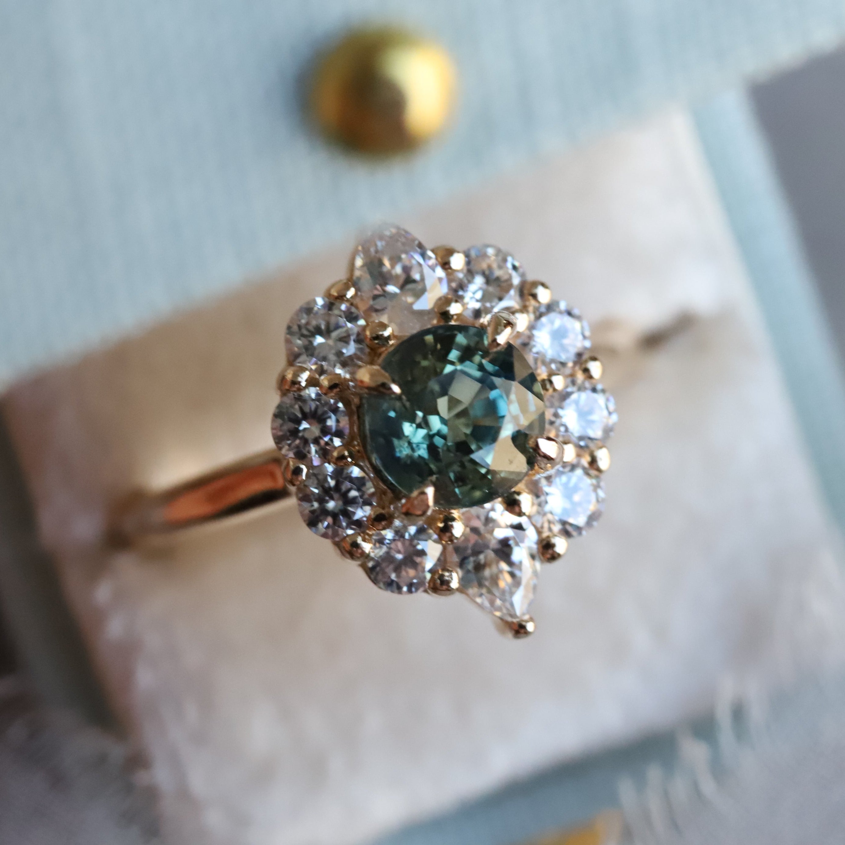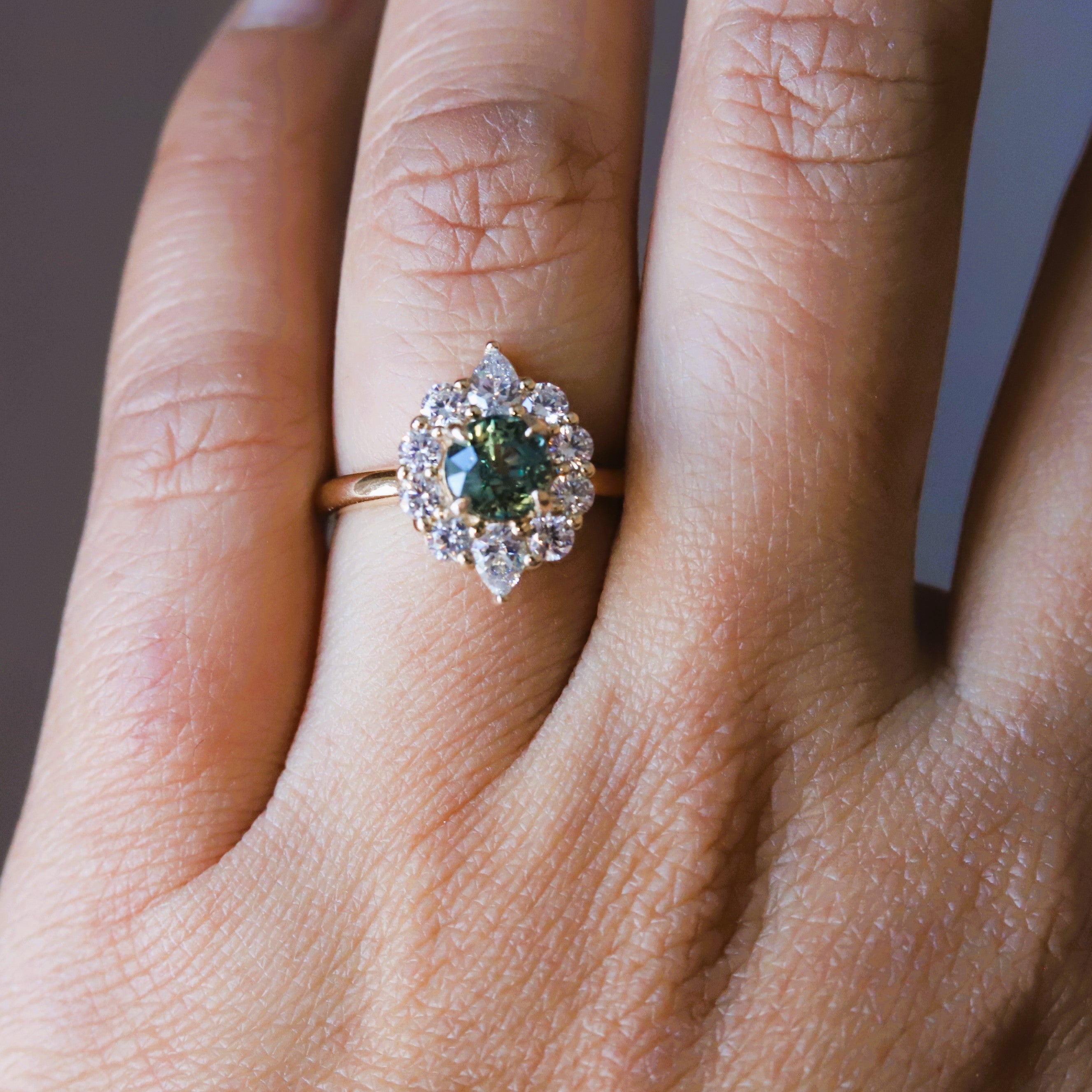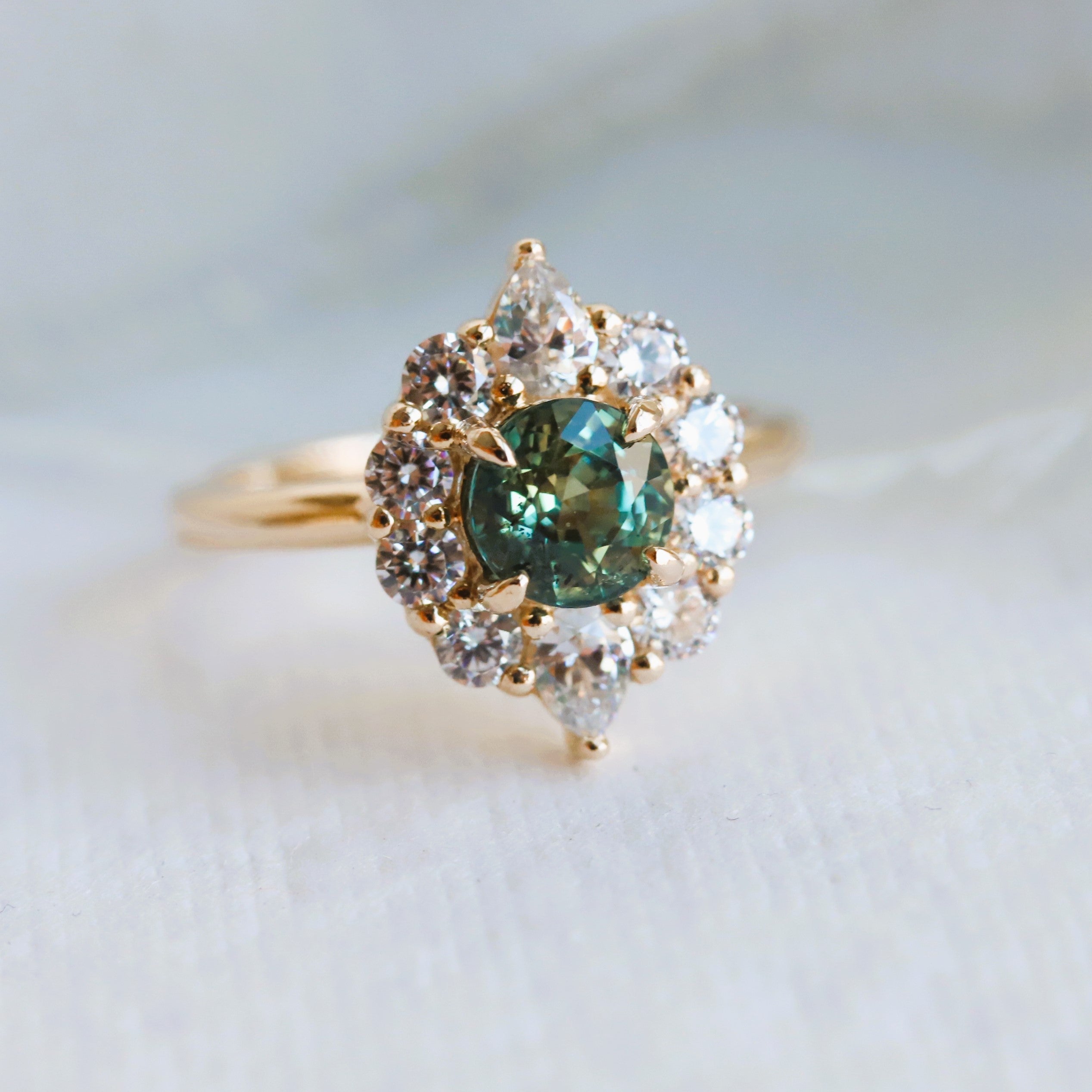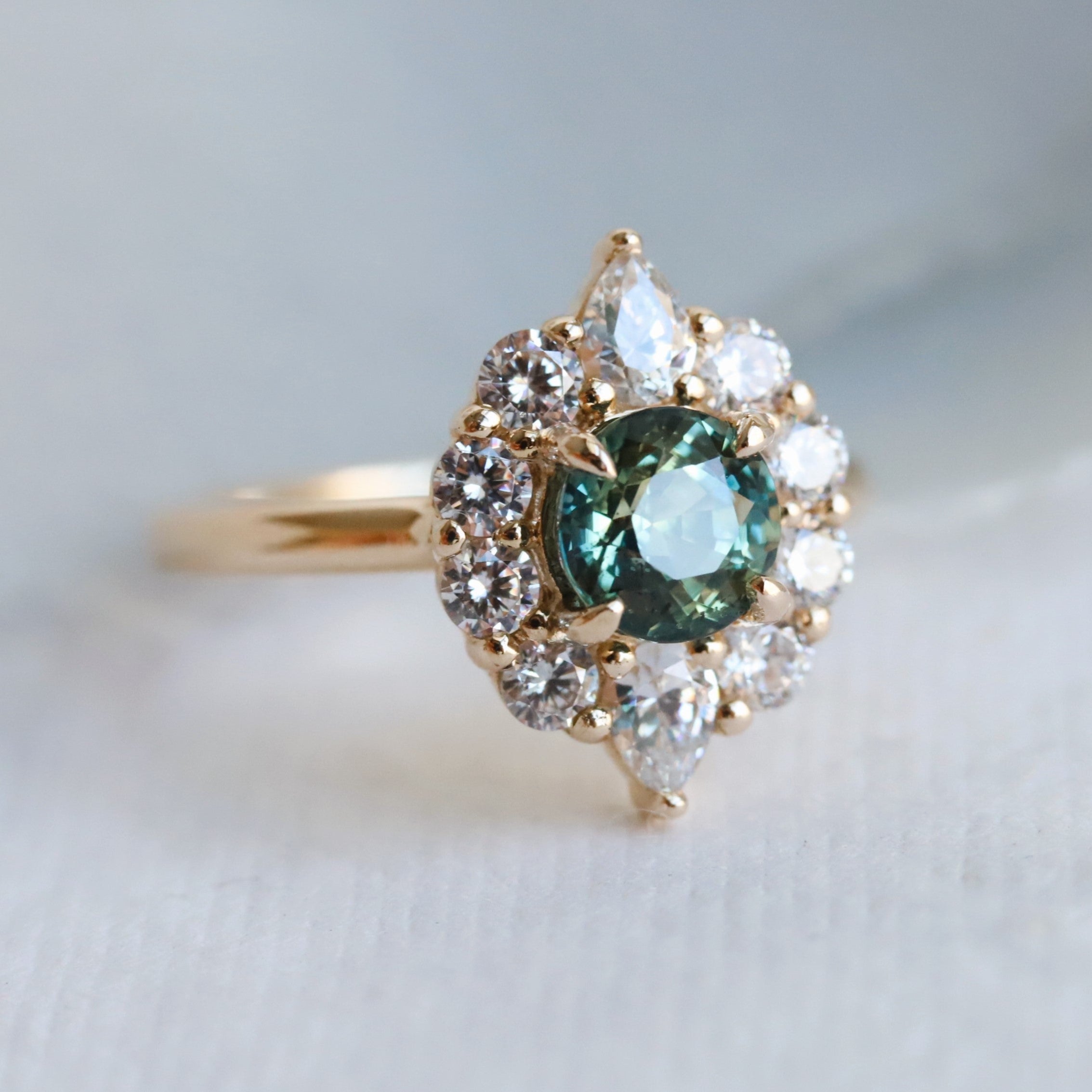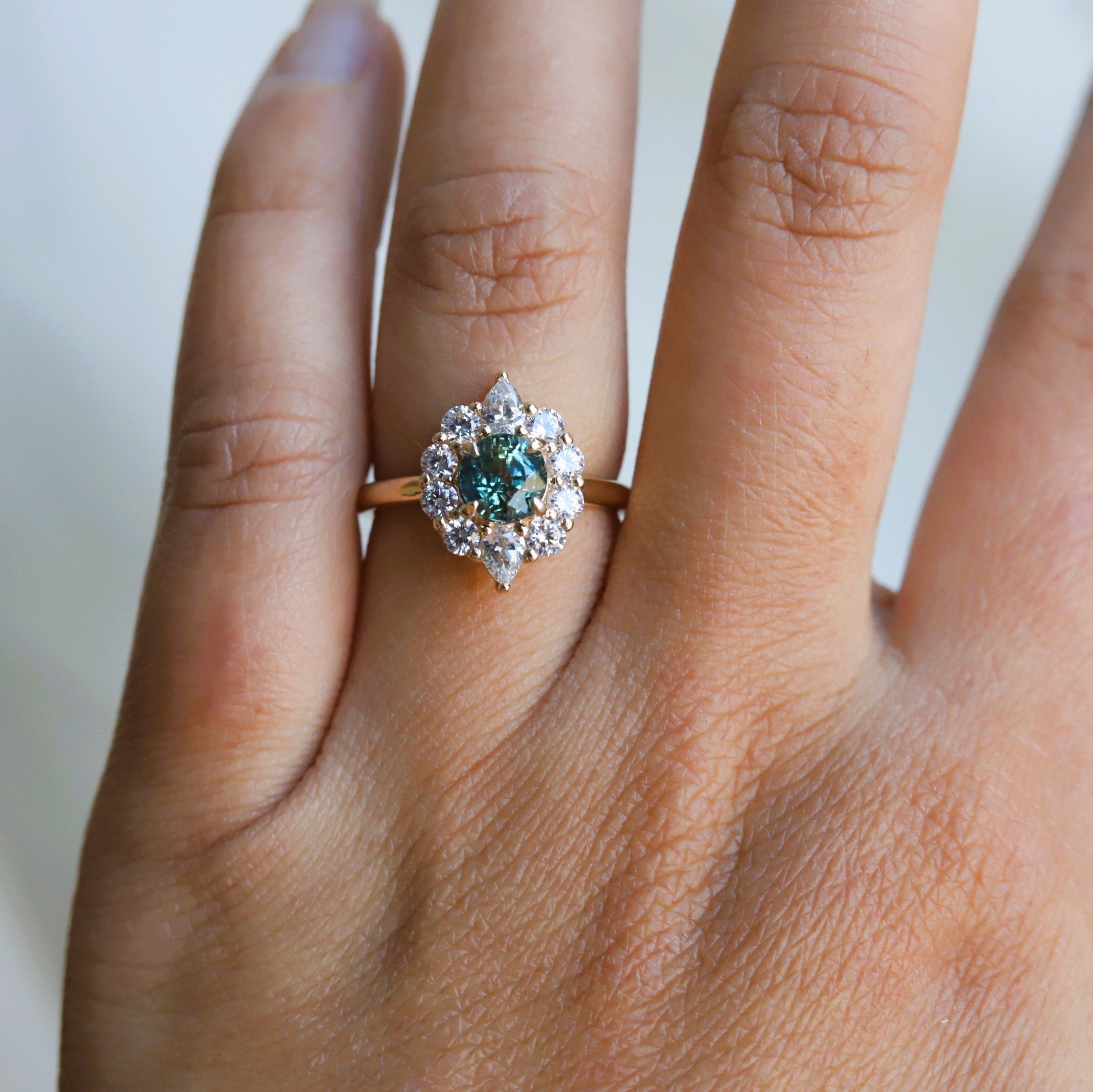 Expertly crafted, the Jazlyn ring features a stunning round-cut natural one-of-a-kind green sapphire, encircled by a dazzling halo of round and pear stones in a shared prong setting. The raised cathedral design allows for seamless stacking with a straight wedding band, making it an ideal choice for an engagement ring.
