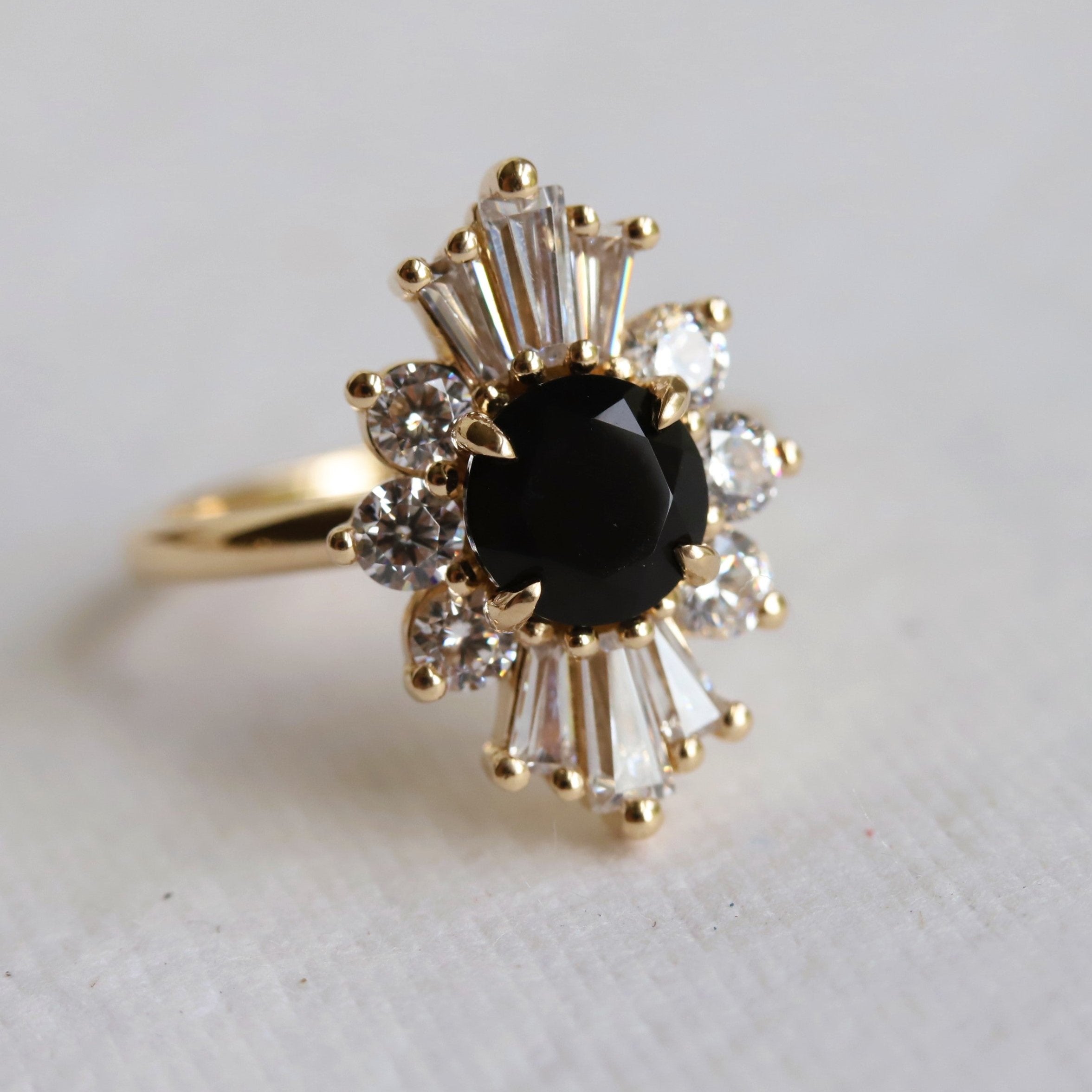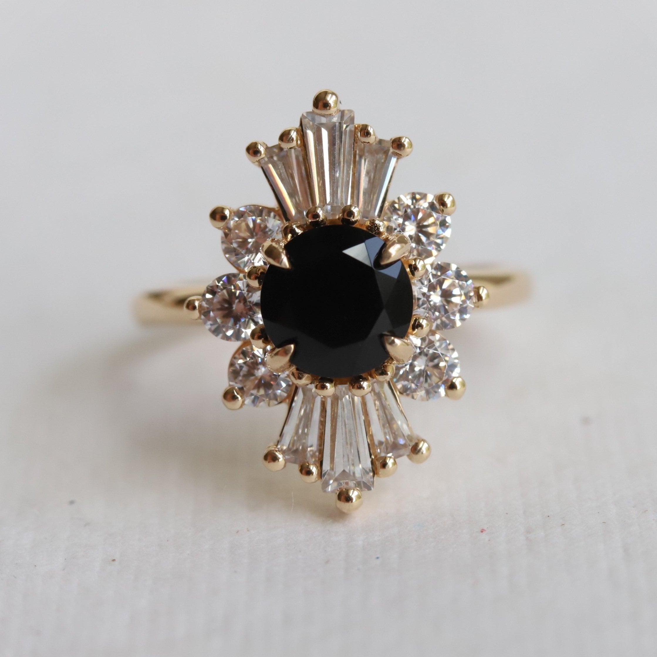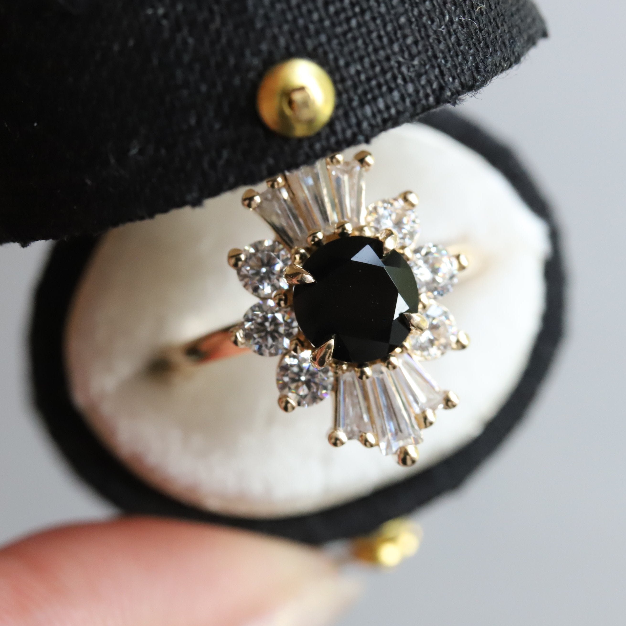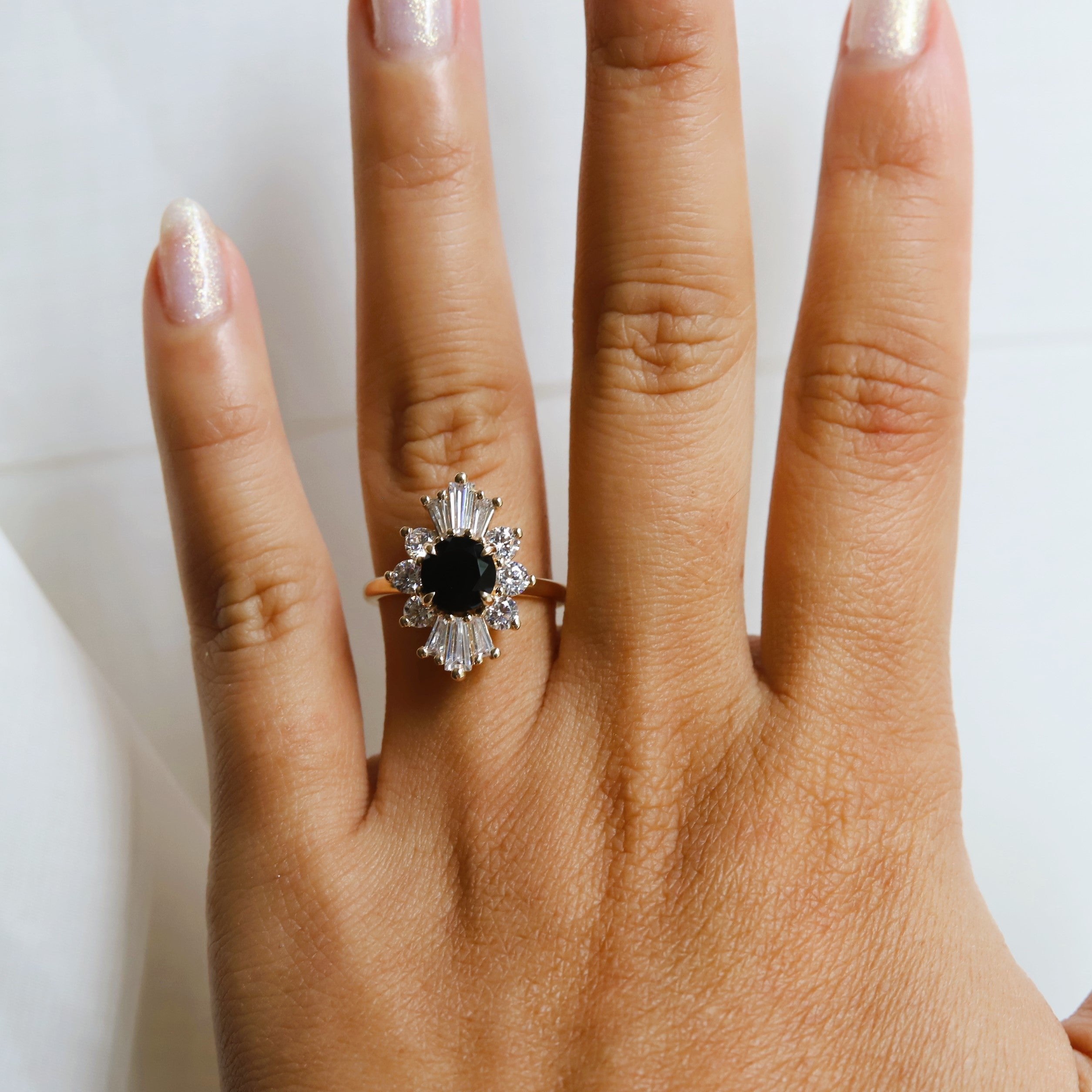The Decora Round Halo Ring is a true statement of elegance and sophistication, expertly crafted in a vintage-inspired design. She is boasting a stunning 1 ct. round black onyx, complemented by a delicate halo of tapered baguette and round diamonds, The raised cathedral design allows for seamless stacking with a straight wedding band, making it an ideal choice for an engagement ring. This engagement ring is sure to capture everyone's attention. Upgrade your proposal with a touch of timeless beauty.
