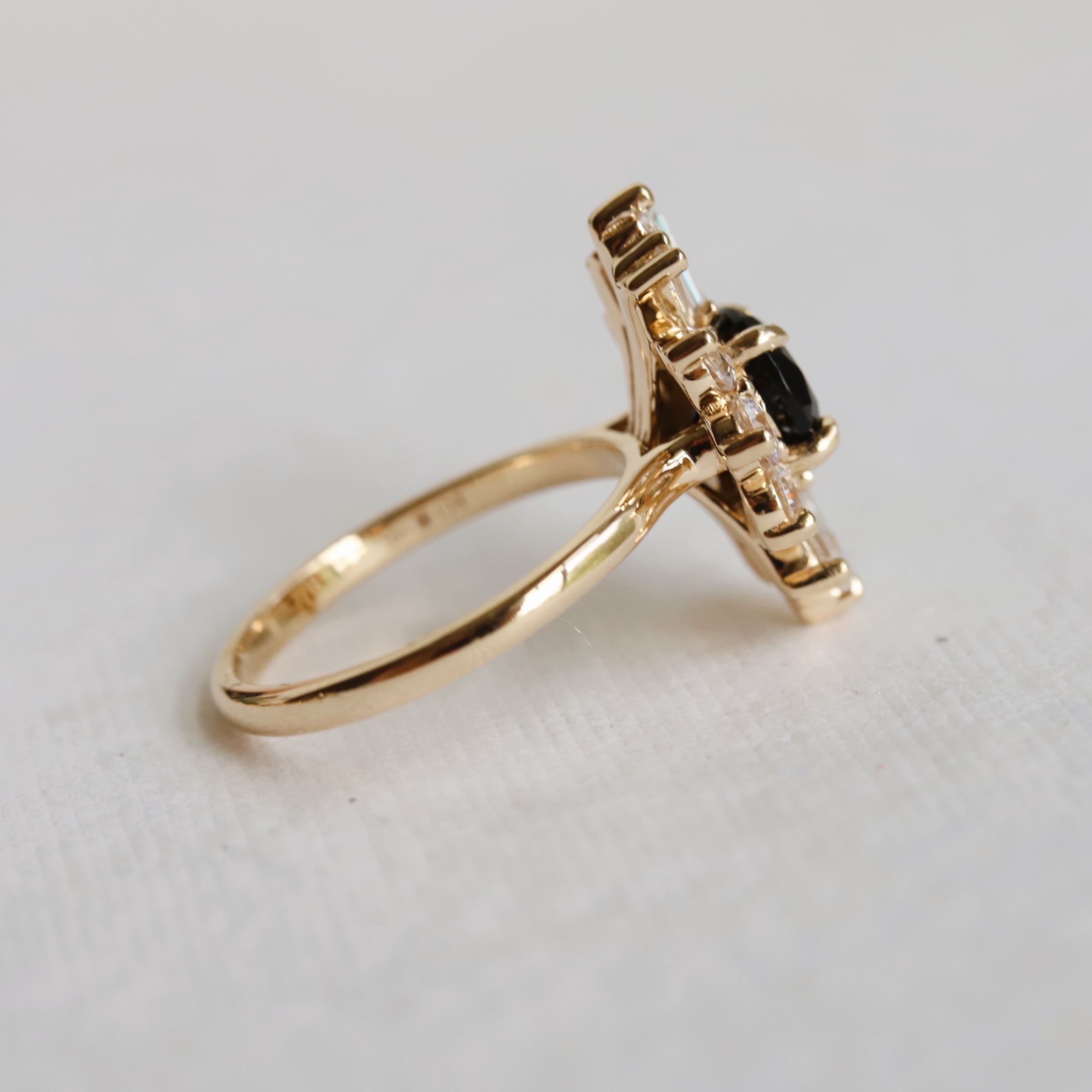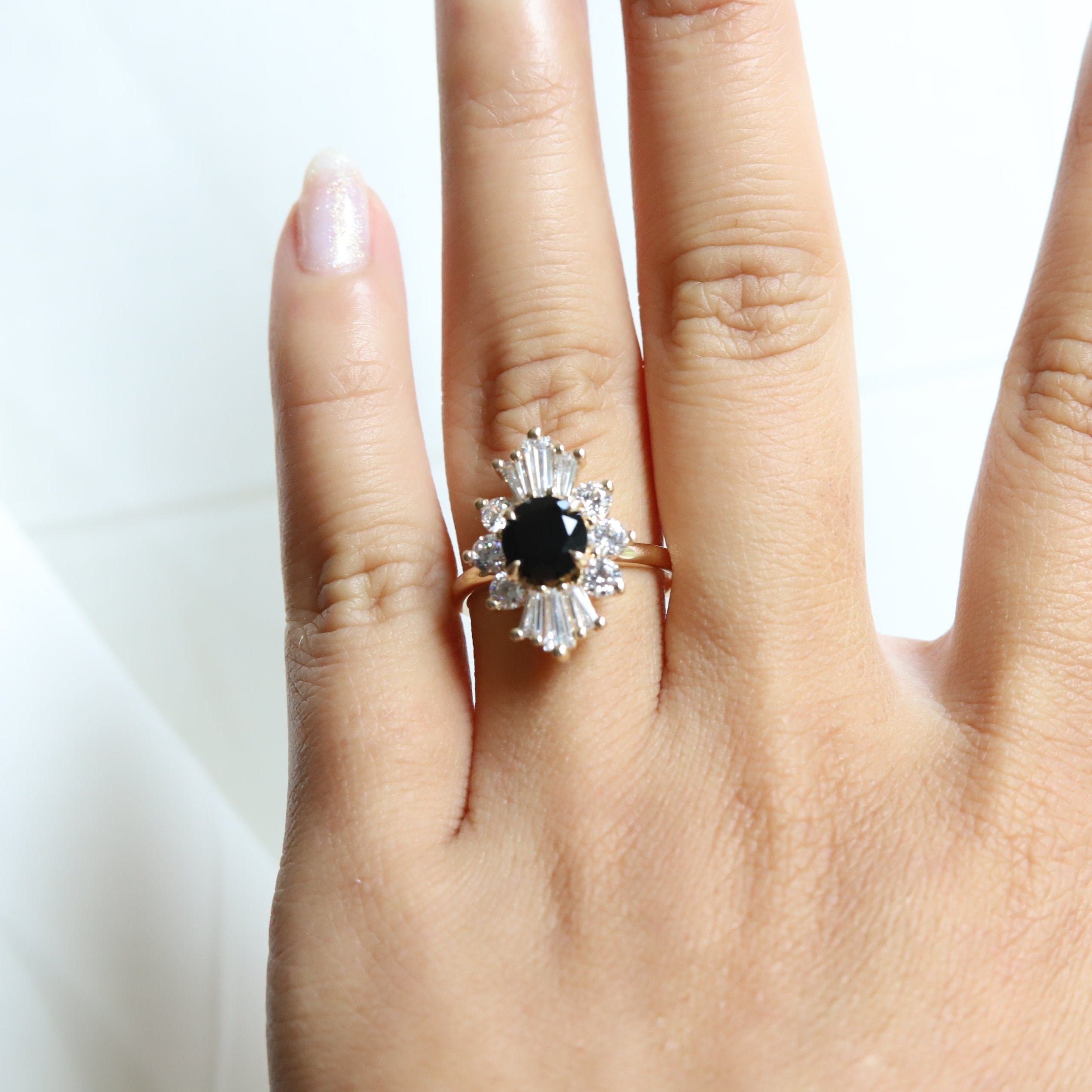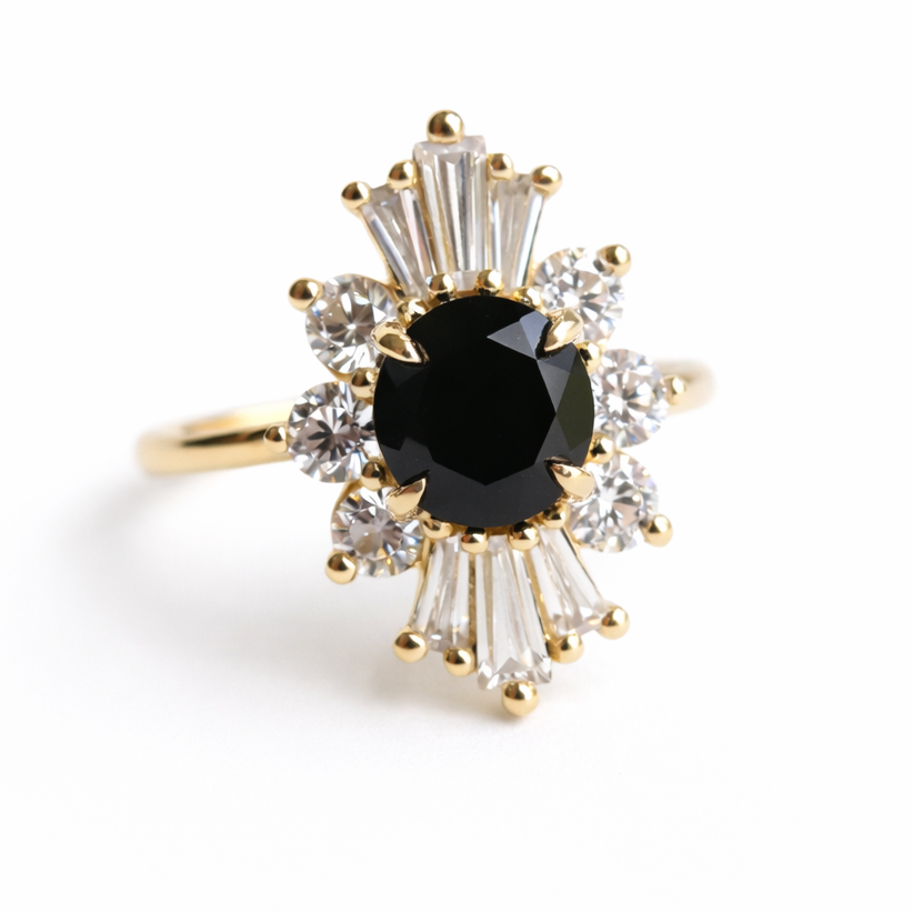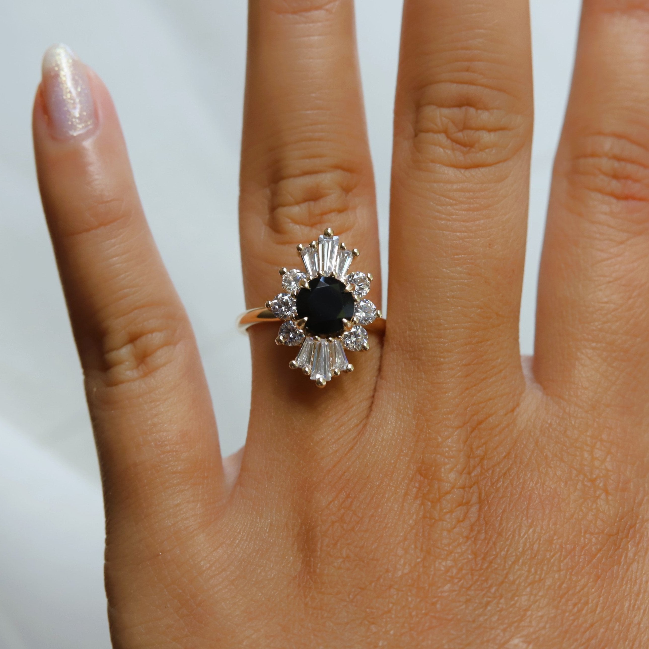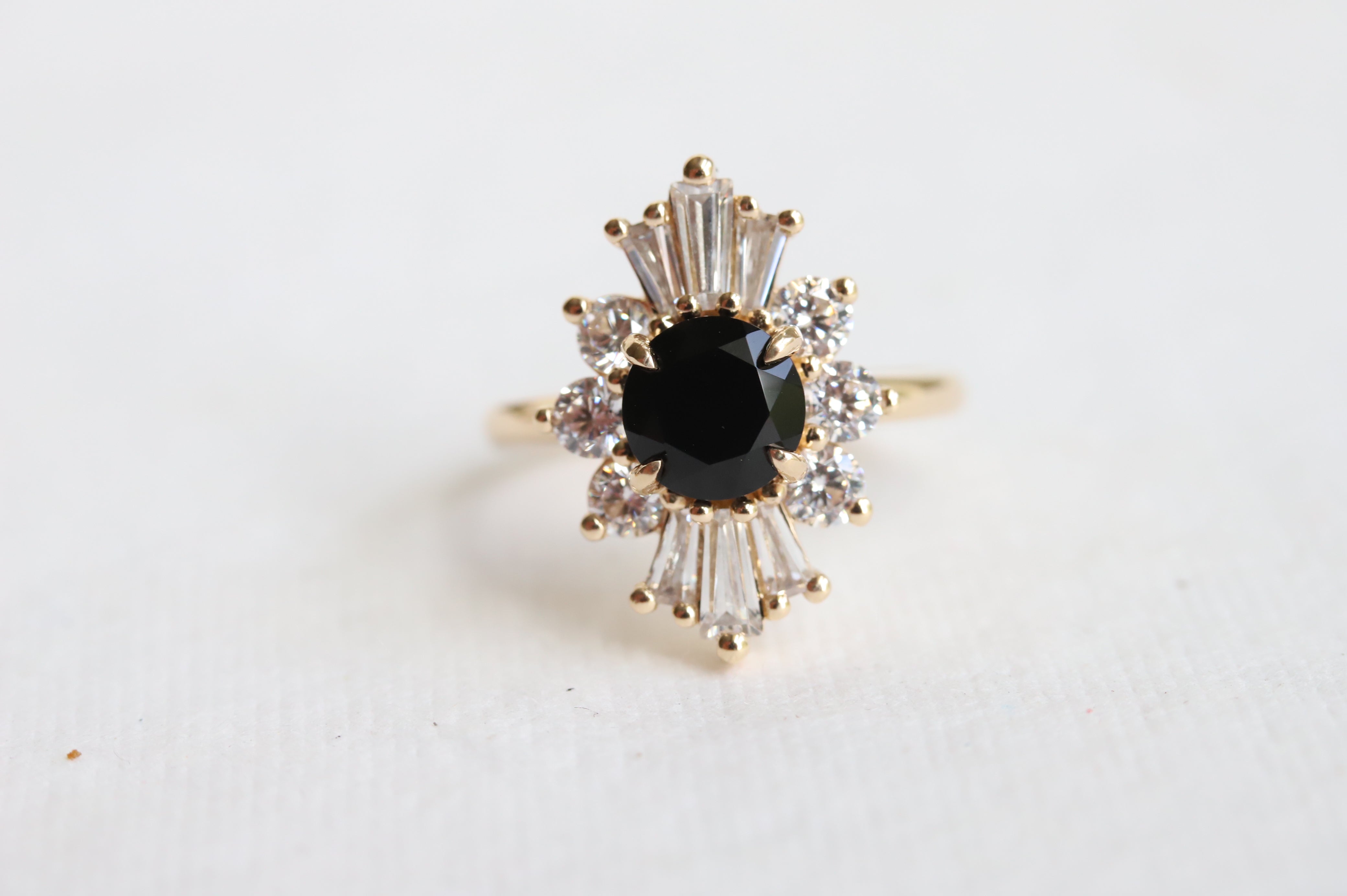 The Decora Round Halo Ring is a true statement of elegance and sophistication, expertly crafted in a vintage-inspired design. She is boasting a stunning 1 ct. round black onyx, complemented by a delicate halo of tapered baguette and round diamonds, The raised cathedral design allows for seamless stacking with a straight wedding band, making it an ideal choice for an engagement ring. This engagement ring is sure to capture everyone's attention. Upgrade your proposal with a touch of timeless beauty.