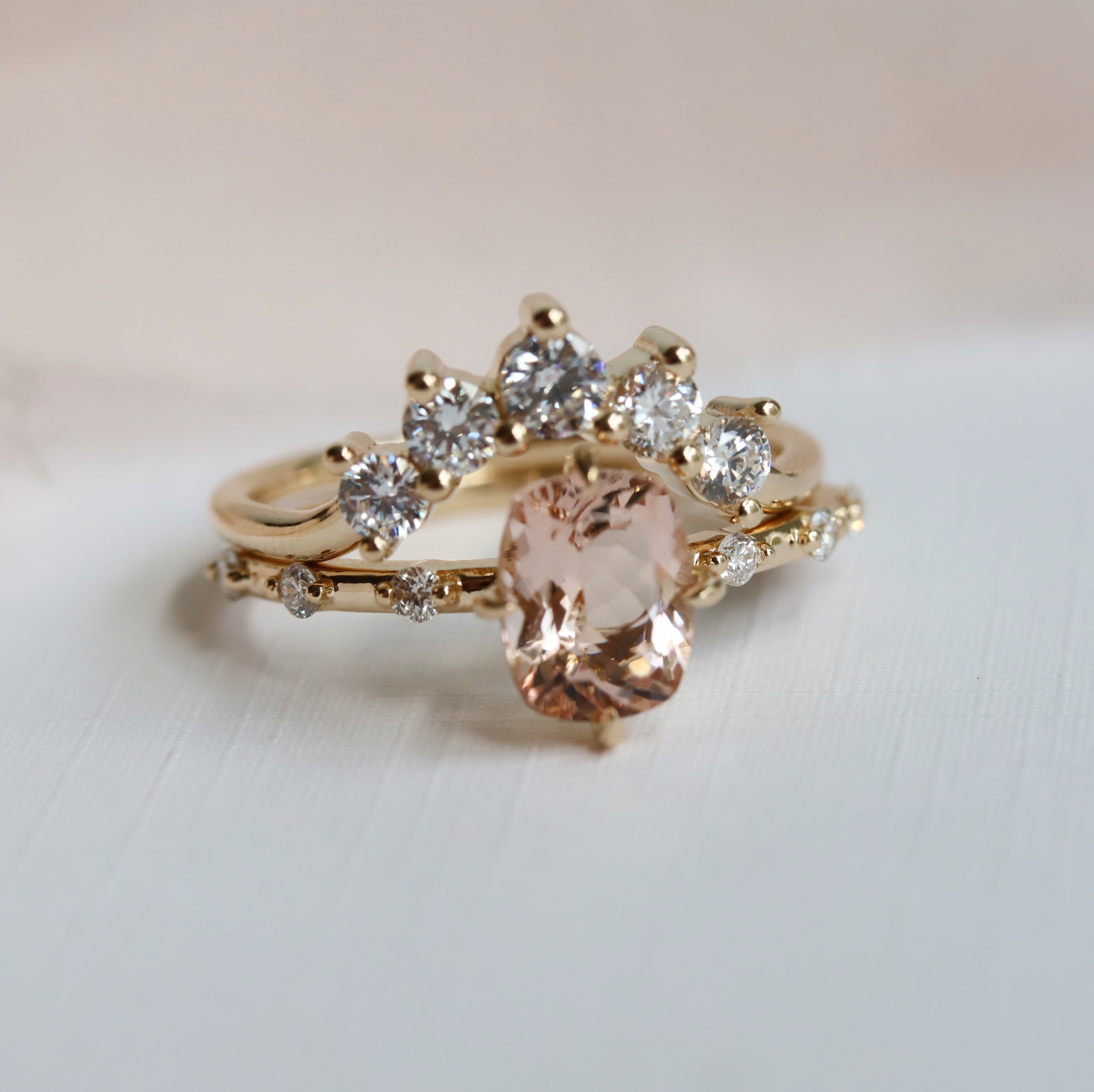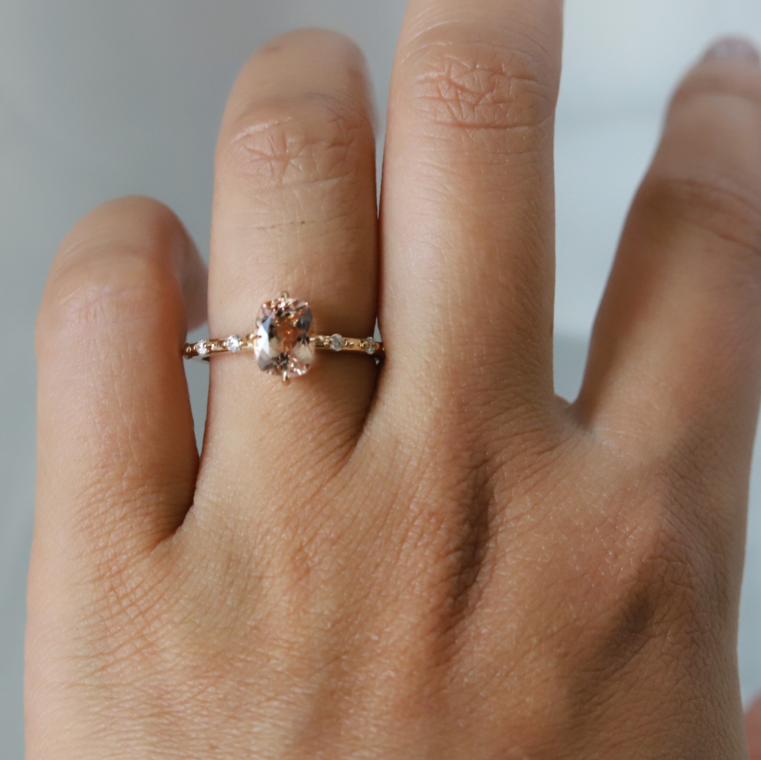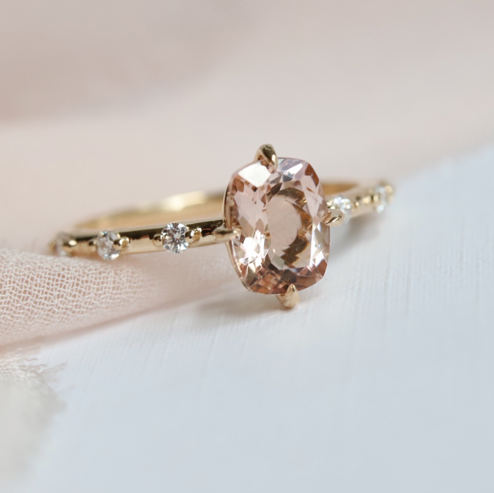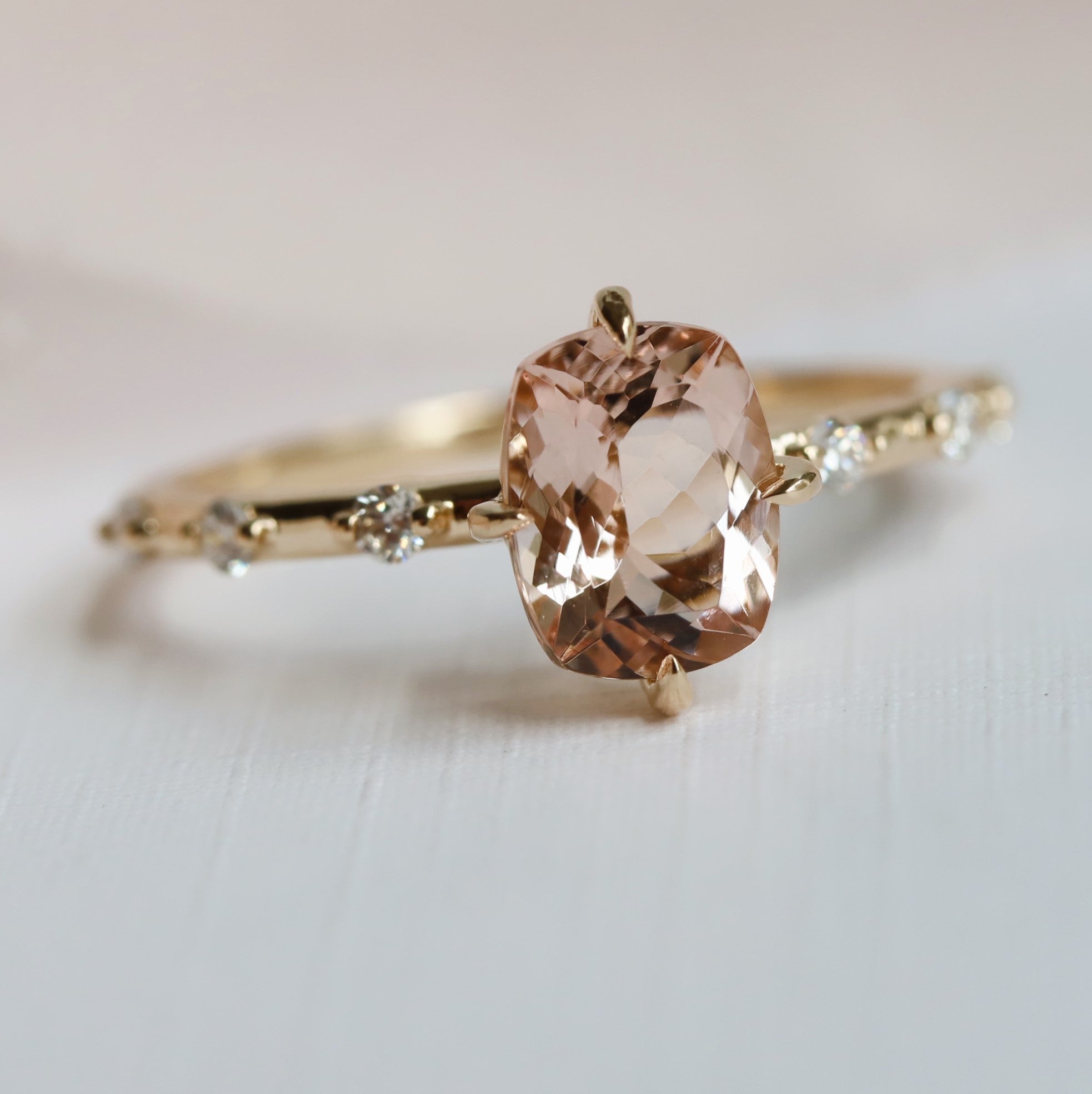 The Aurora ring features a sleek, sturdy band paired with a basket four-prong setting. At its center is an elongated cushion cut Morganite, complemented by three diamonds on each side. This design embodies timeless elegance with a minimalist style, perfect for those looking for a refined and subtle engagement ring.