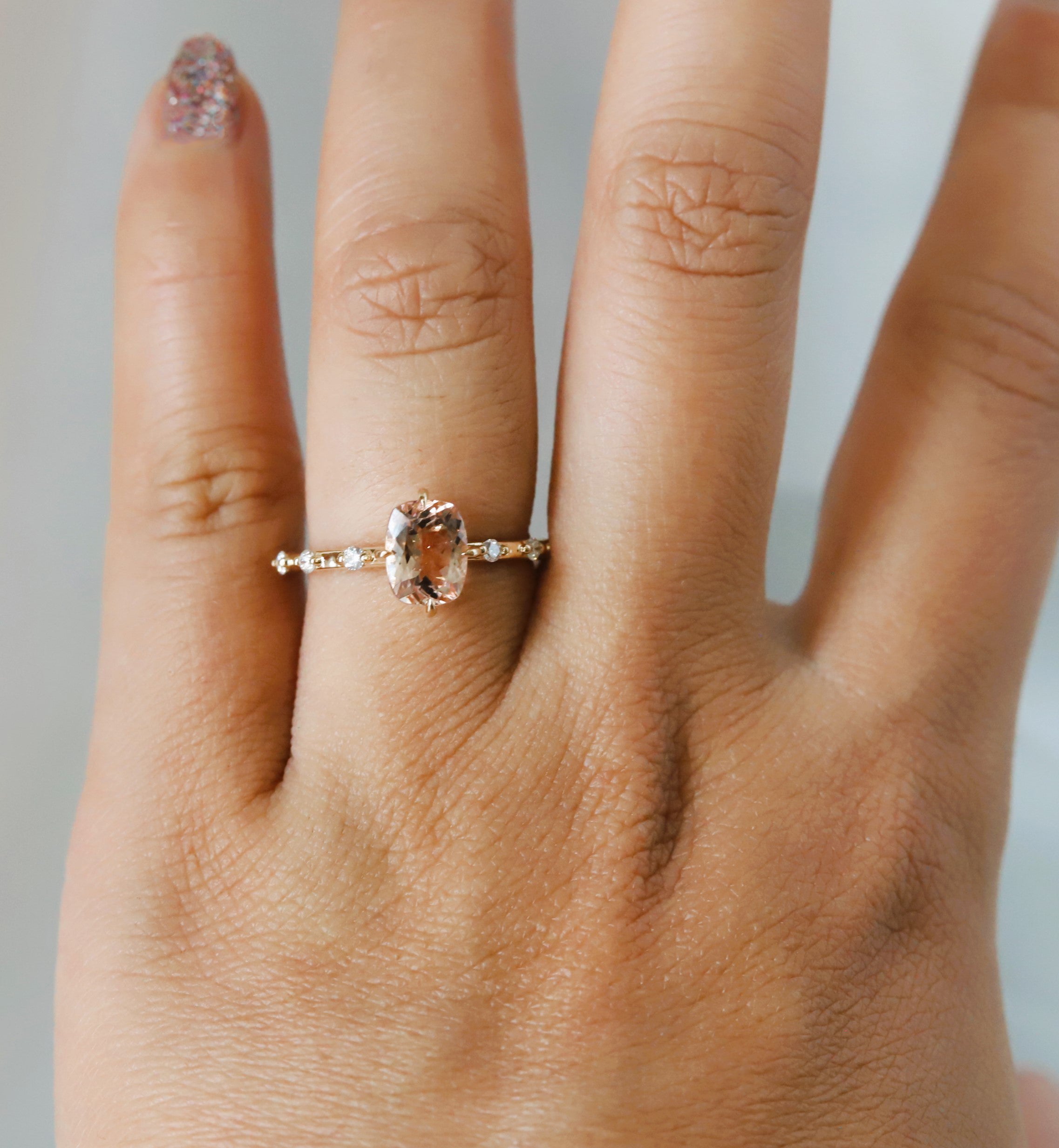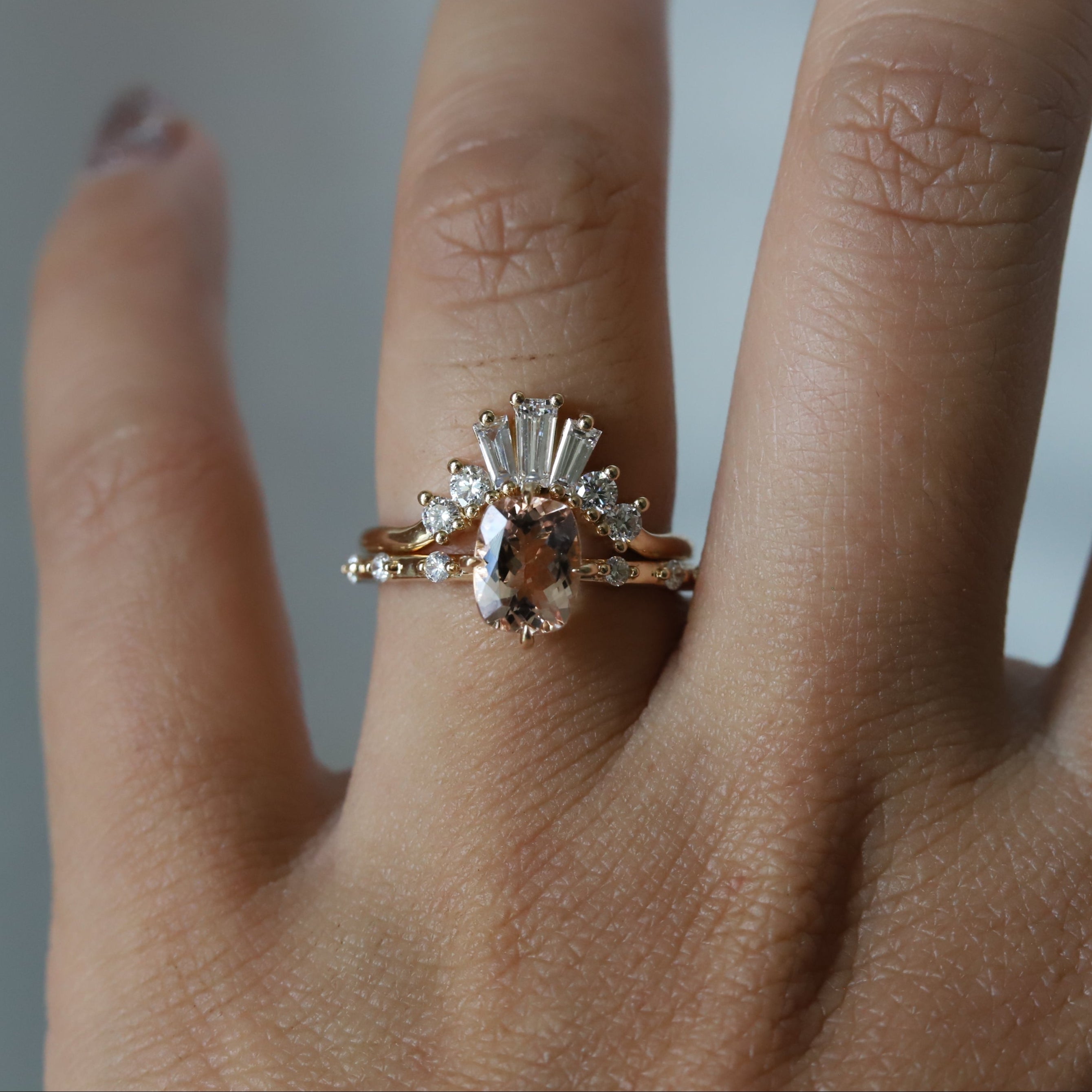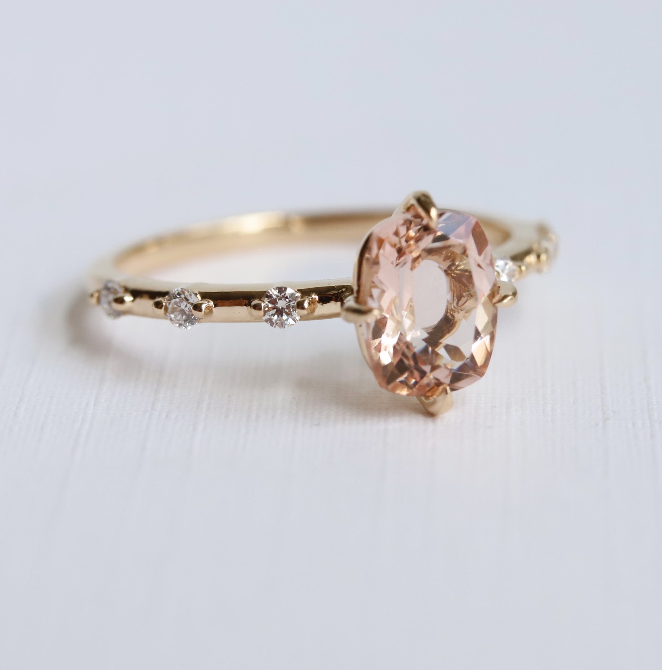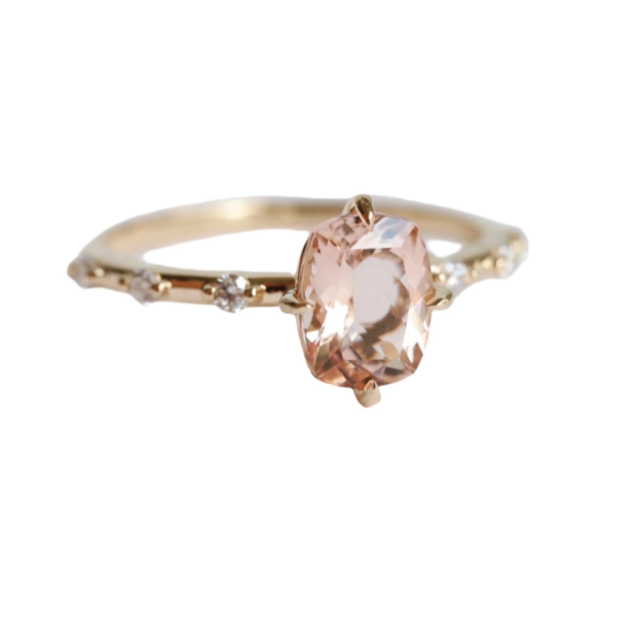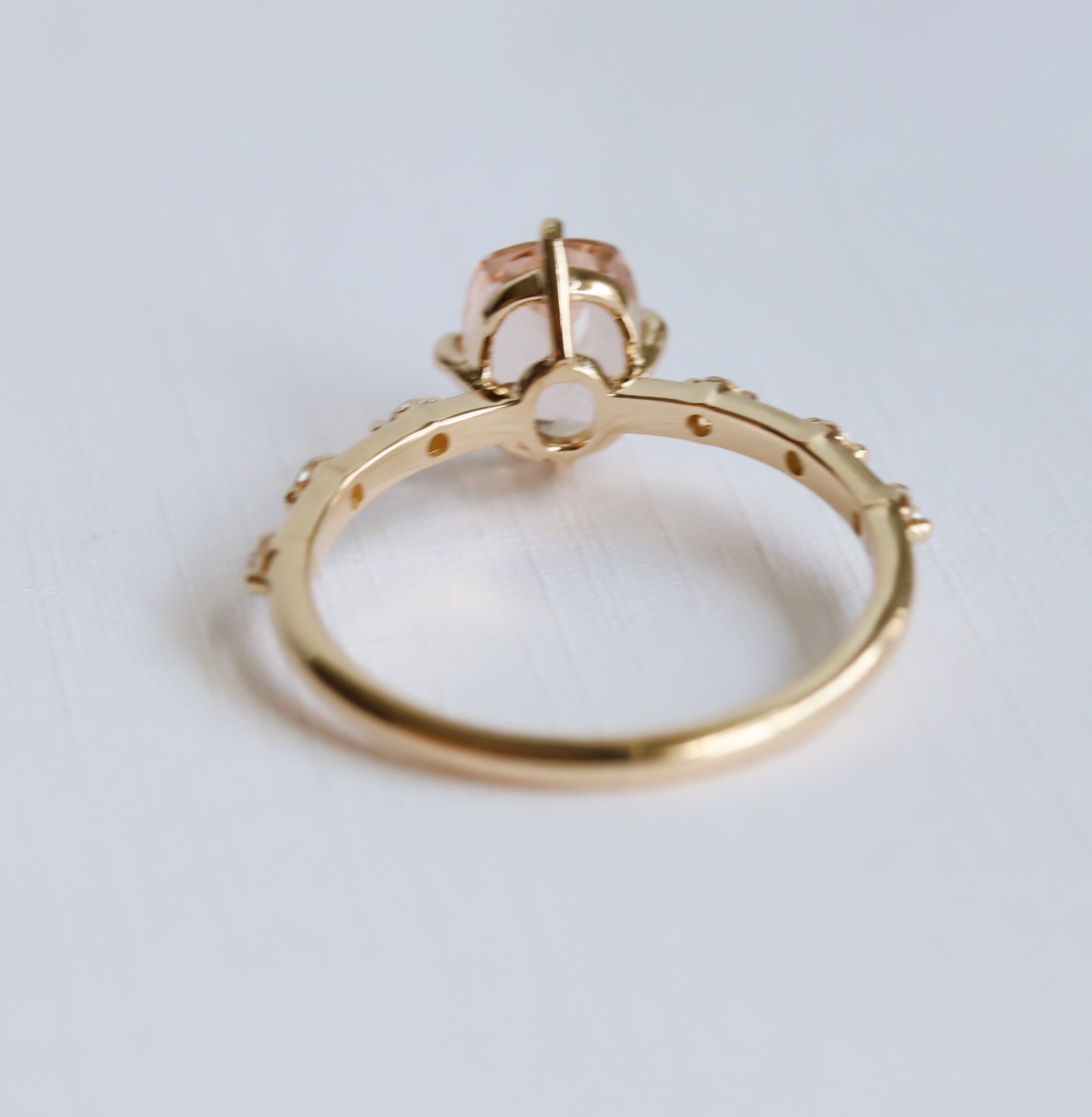 The Aurora ring features a sleek, sturdy band paired with a basket four-prong setting. At its center is an elongated cushion cut Morganite, complemented by three diamonds on each side. This design embodies timeless elegance with a minimalist style, perfect for those looking for a refined and subtle engagement ring.