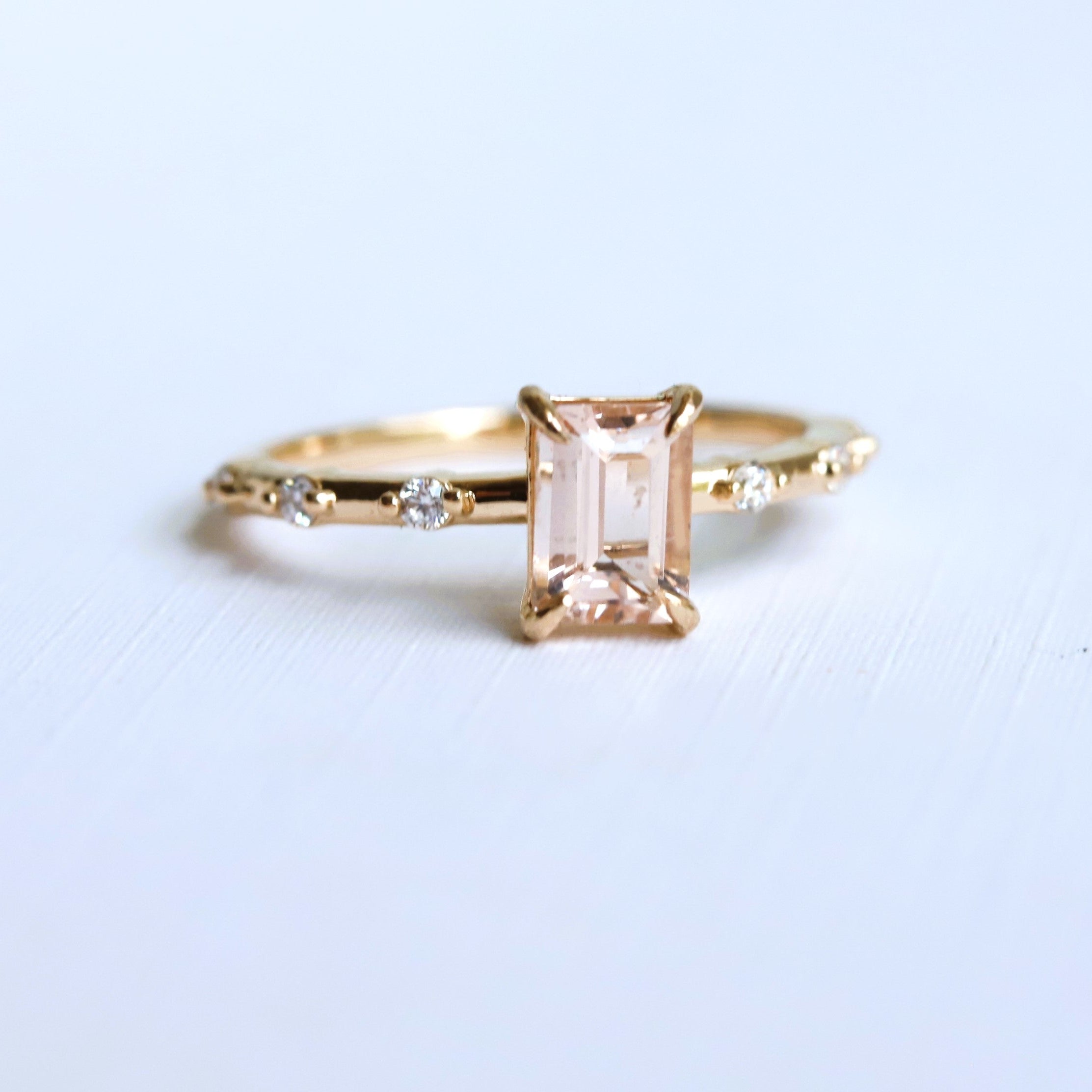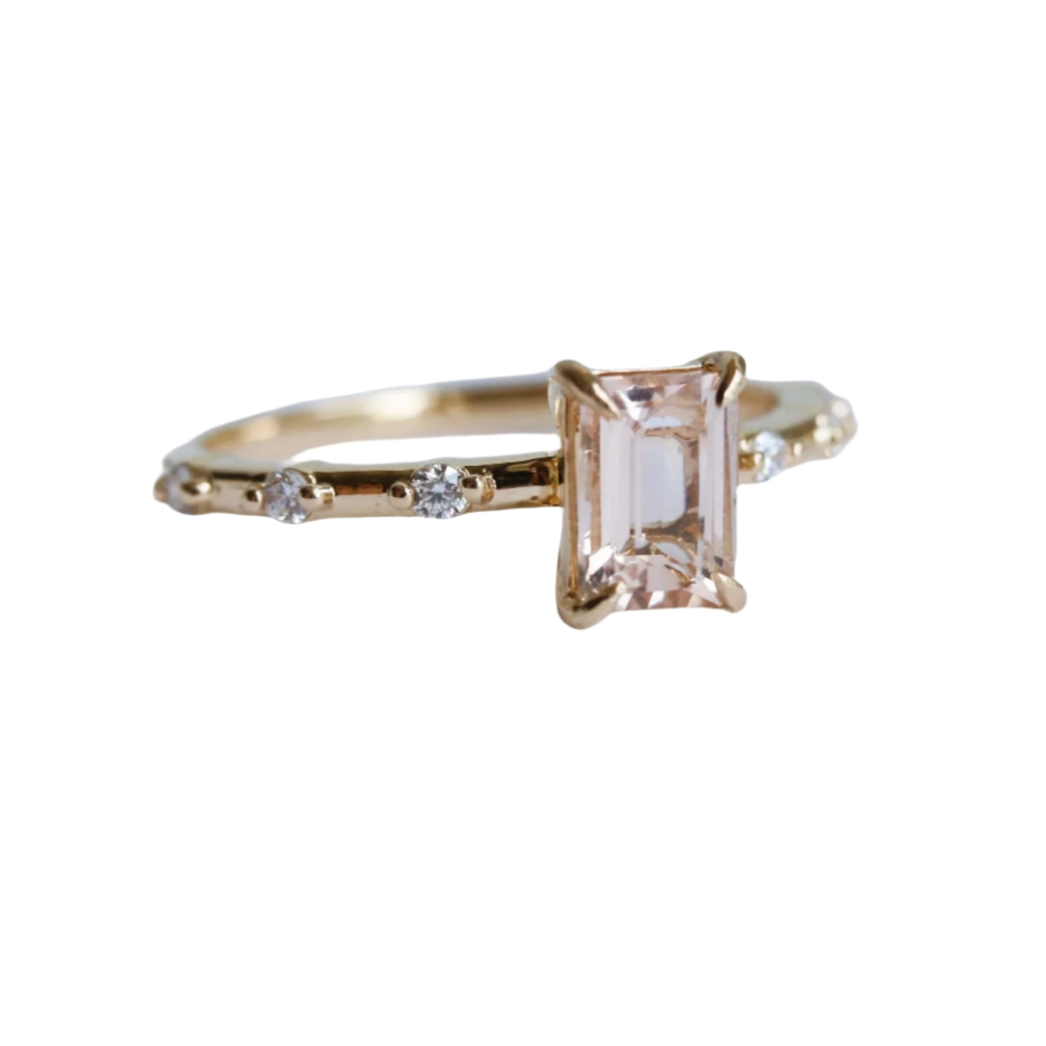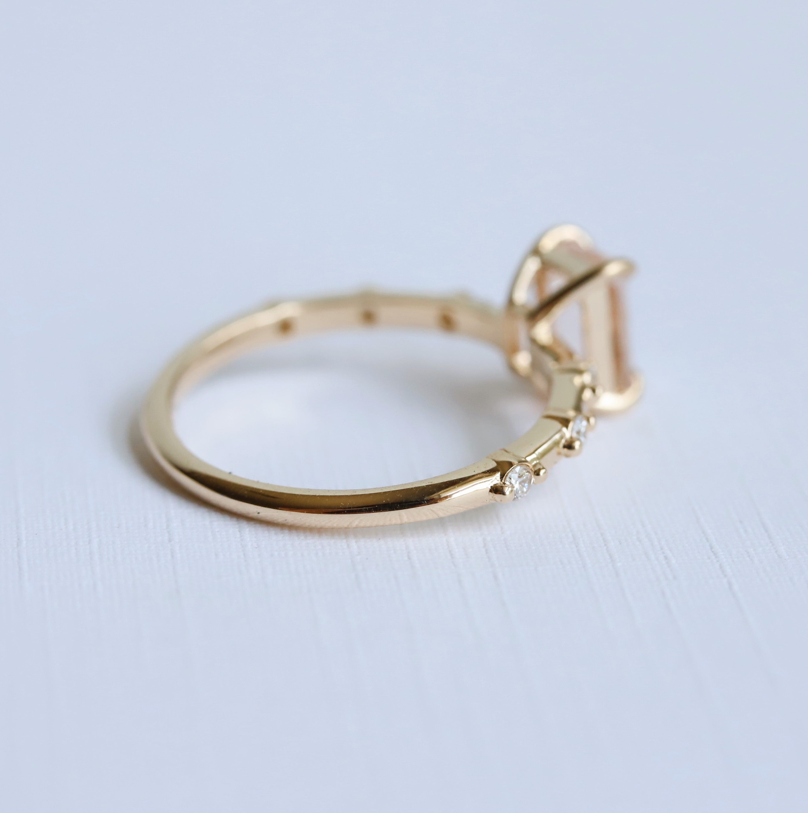 The Aurora ring features a sleek, sturdy band paired with a basket four-prong setting. At its center is an emerald-cut Morganite, complemented by three diamonds on each side. This design embodies timeless elegance with a minimalist style, perfect for those looking for a refined and subtle engagement ring.