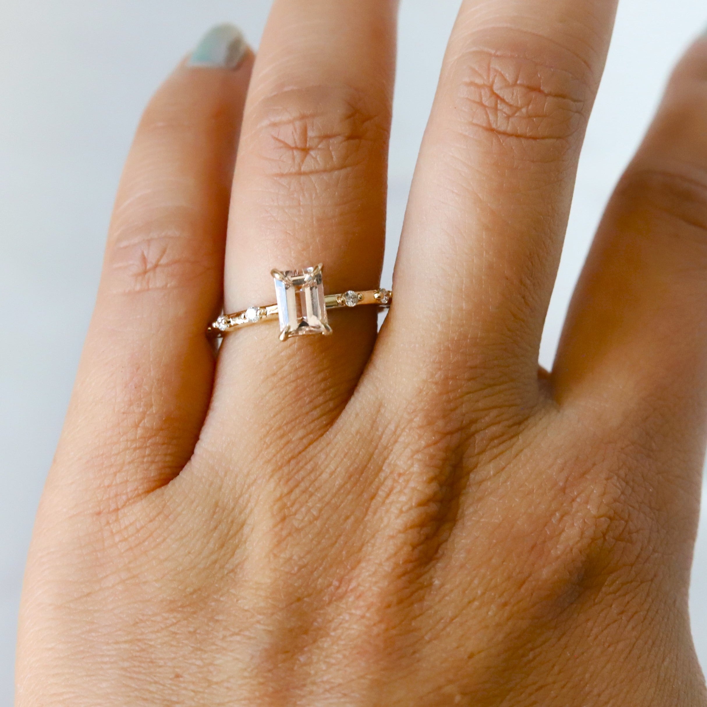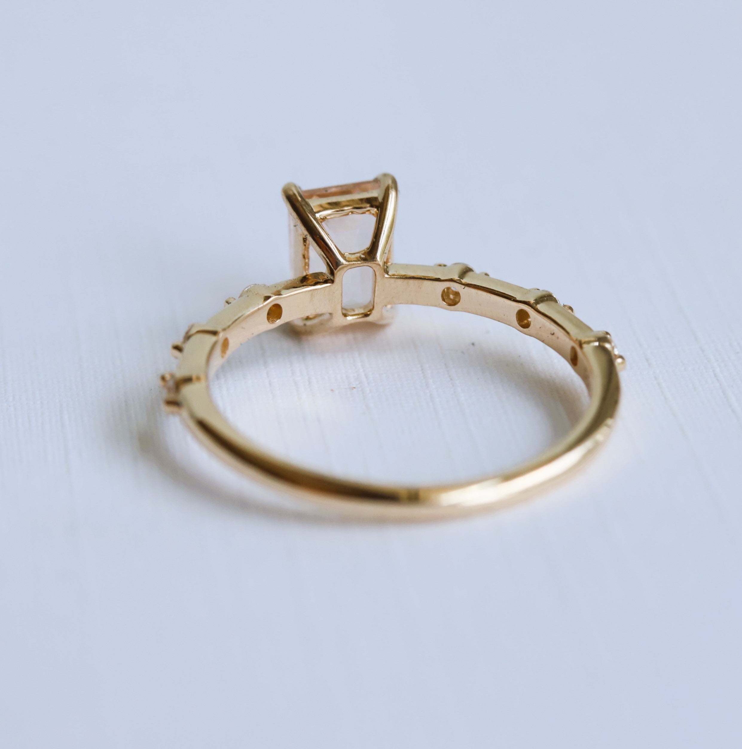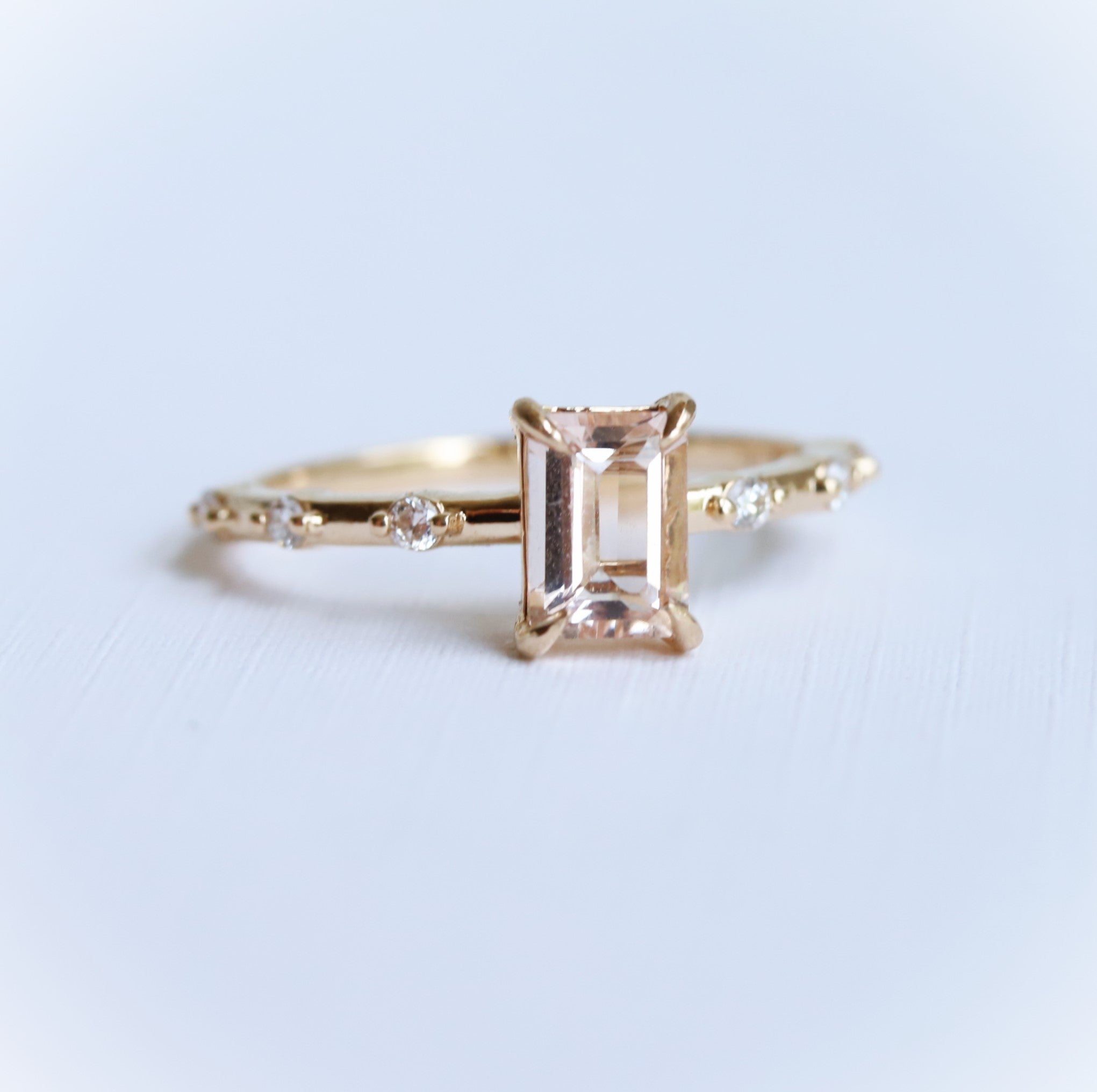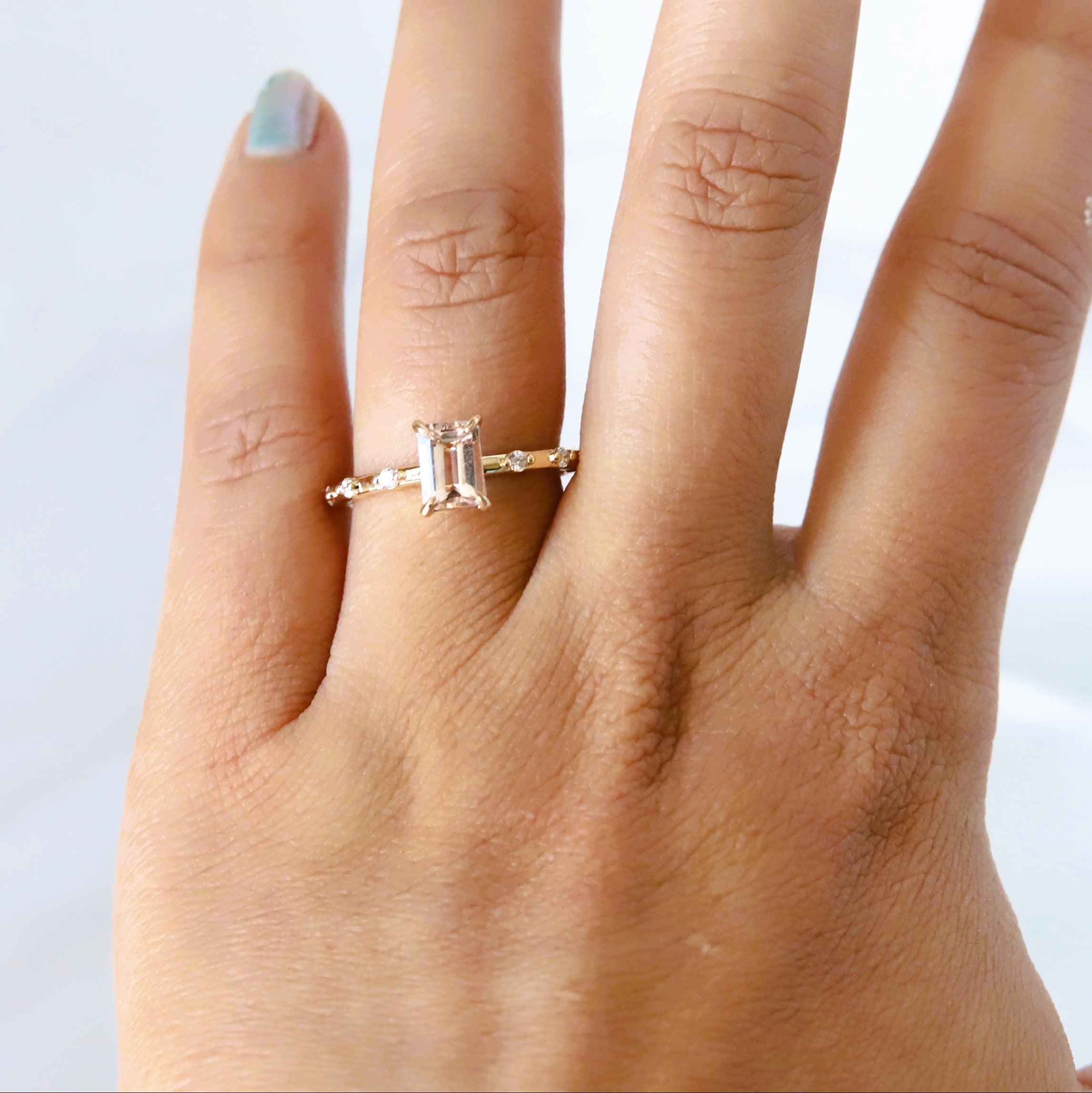 The Aurora ring features a sleek, sturdy band paired with a basket four-prong setting. At its center is an emerald-cut Morganite, complemented by three diamonds on each side. This design embodies timeless elegance with a minimalist style, perfect for those looking for a refined and subtle engagement ring.