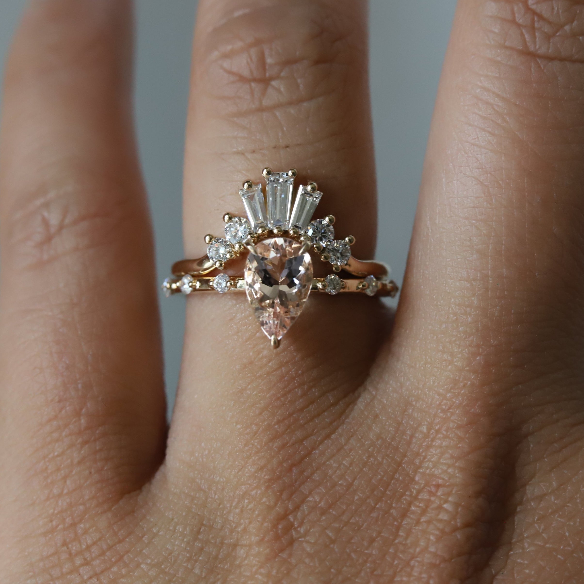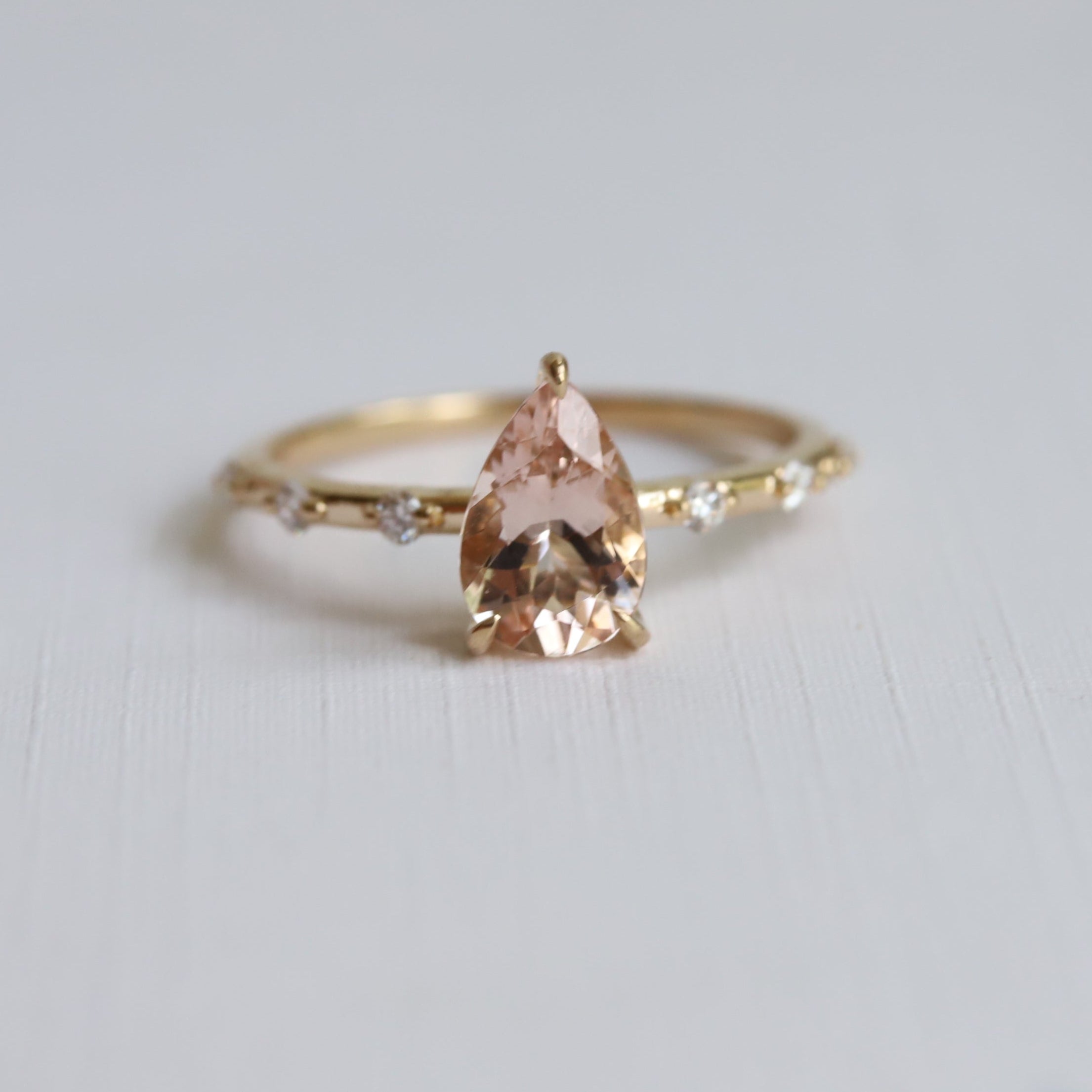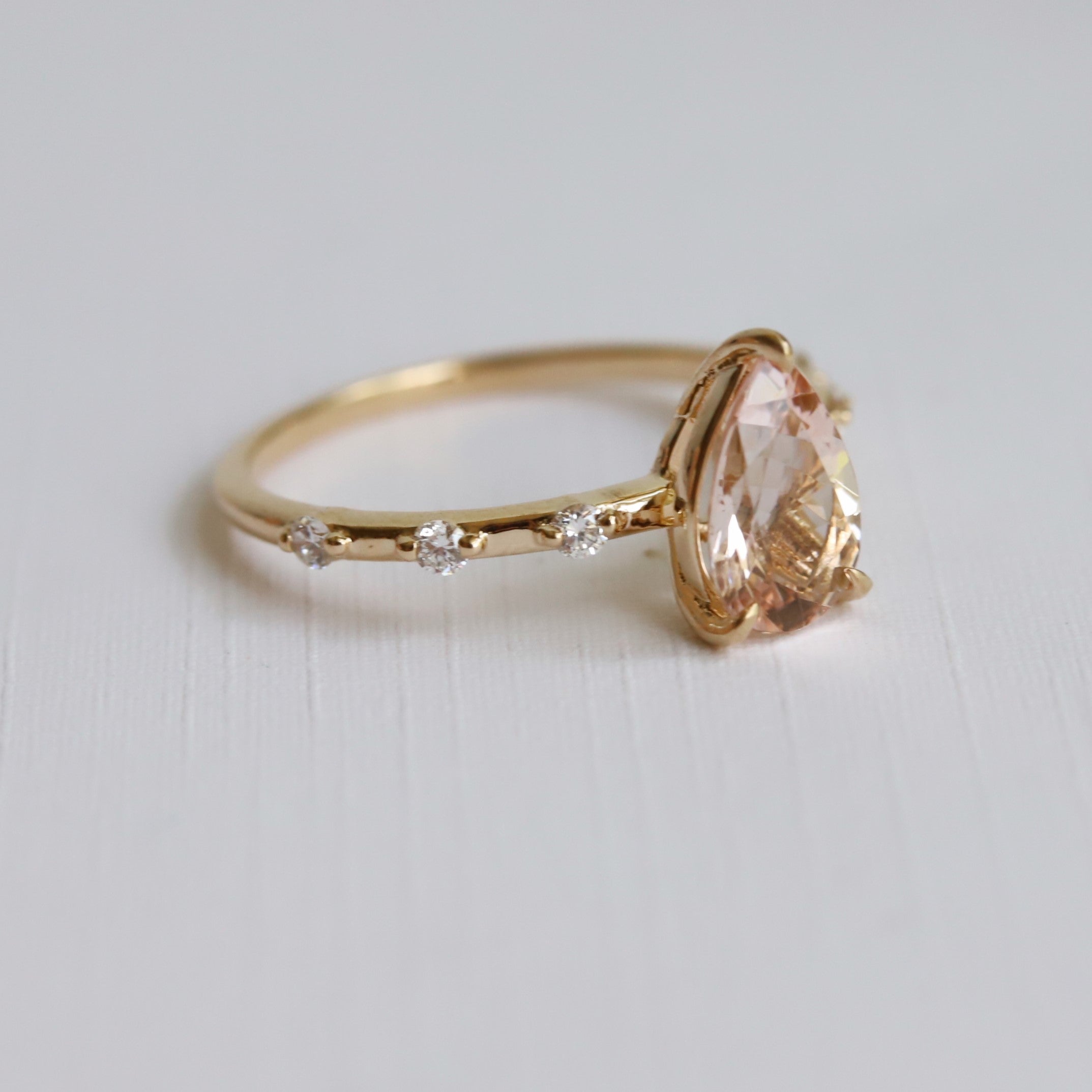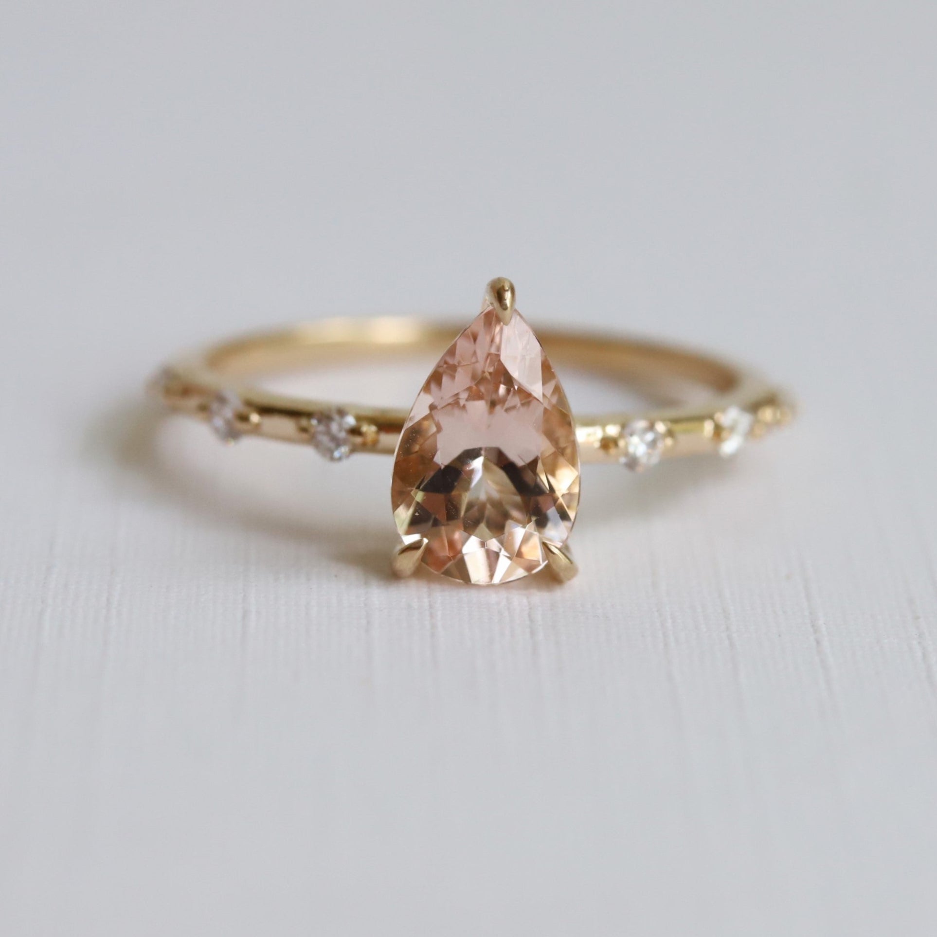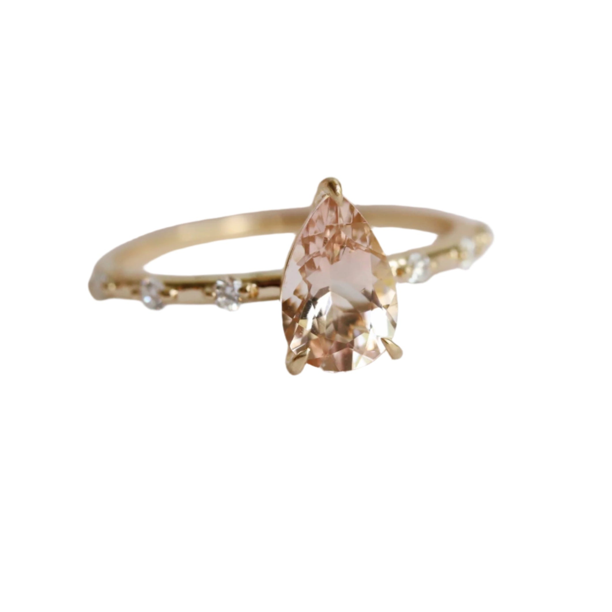 The Aurora ring features a sleek, sturdy band paired with a basket four-prong setting. At its center is a 1 ct. pear natural Morganite, complemented by three diamonds on each side. This design embodies timeless elegance with a minimalist style, making it perfect for those seeking a refined, subtle engagement ring.
