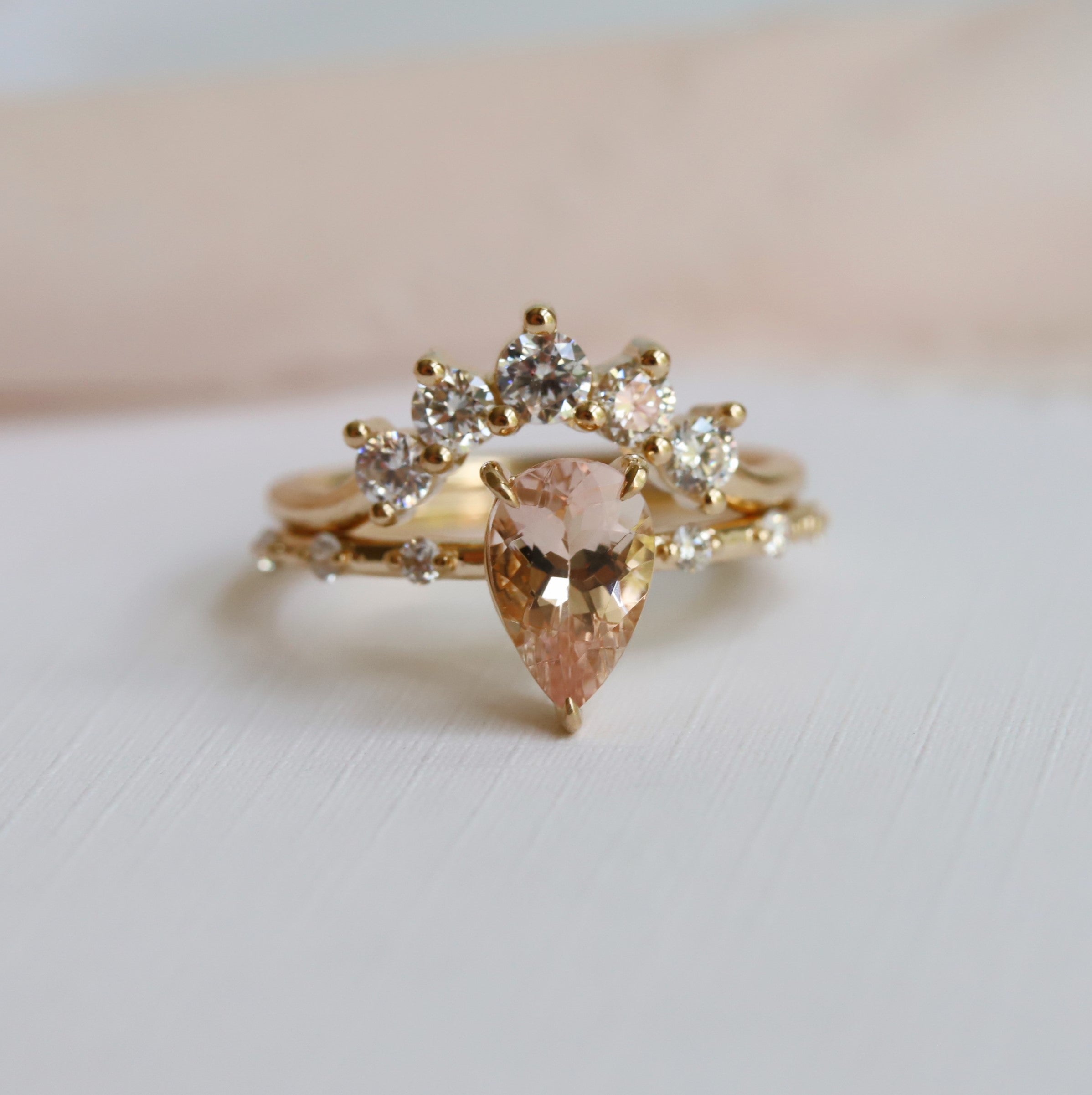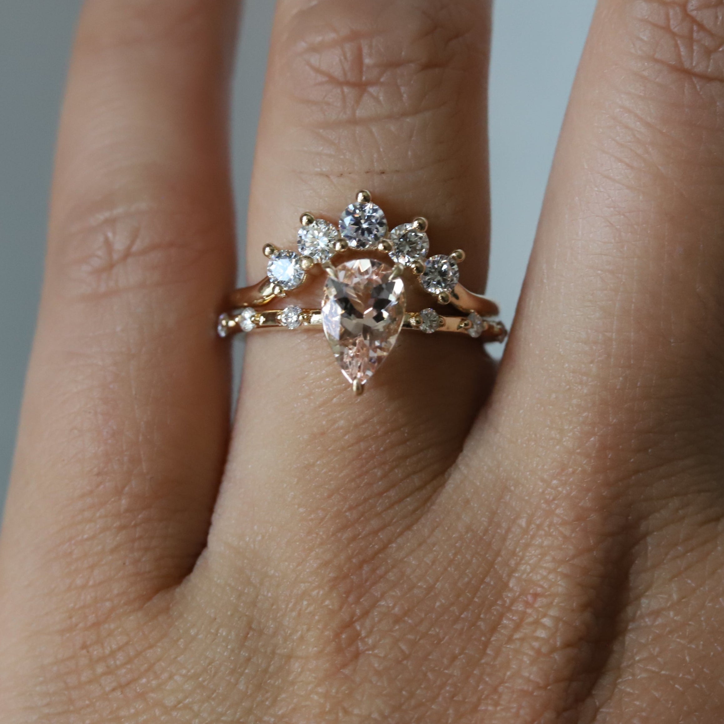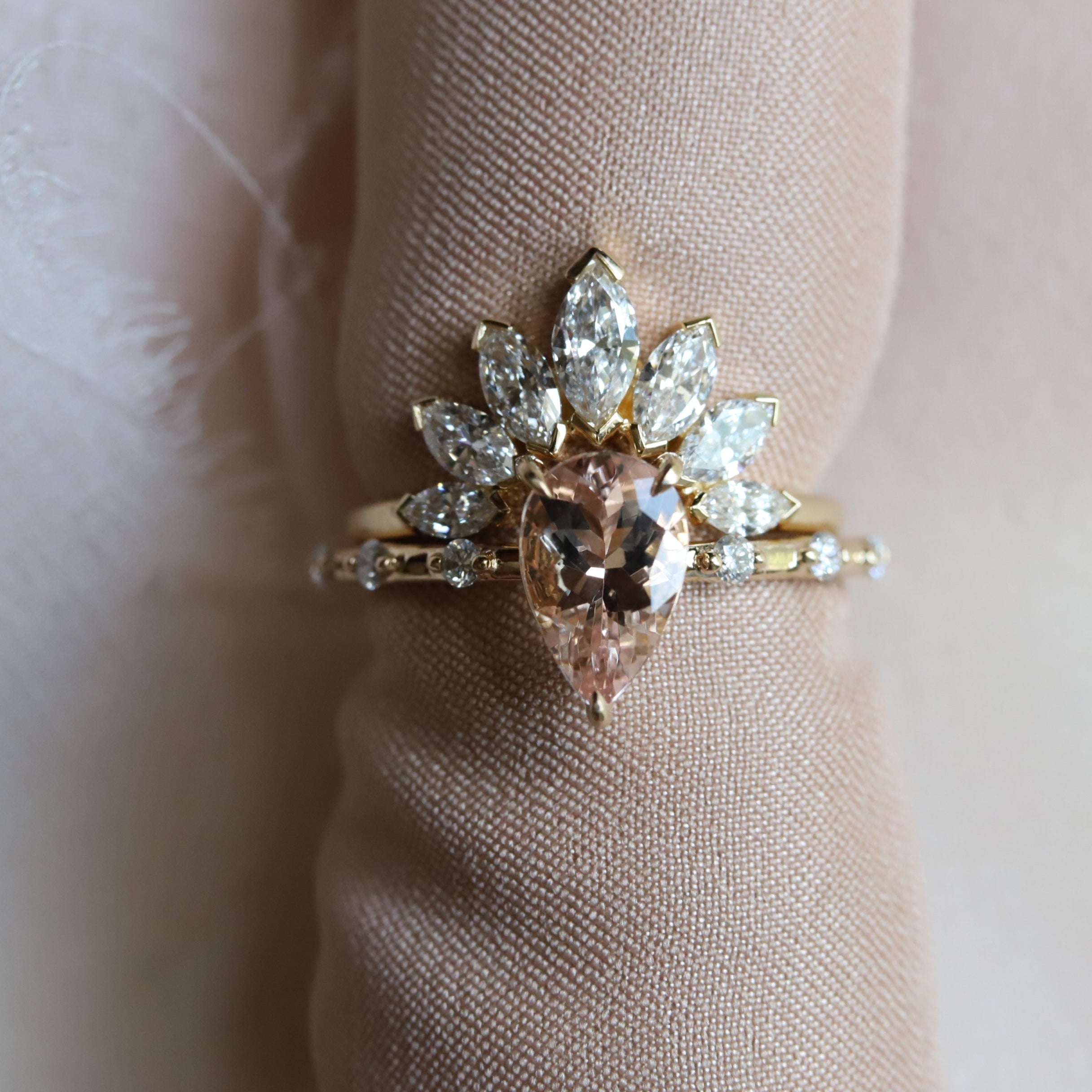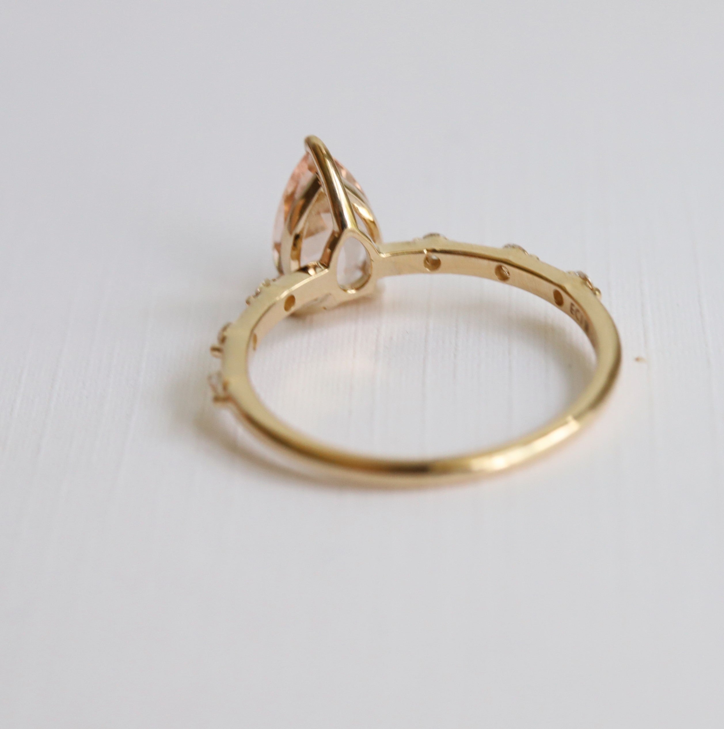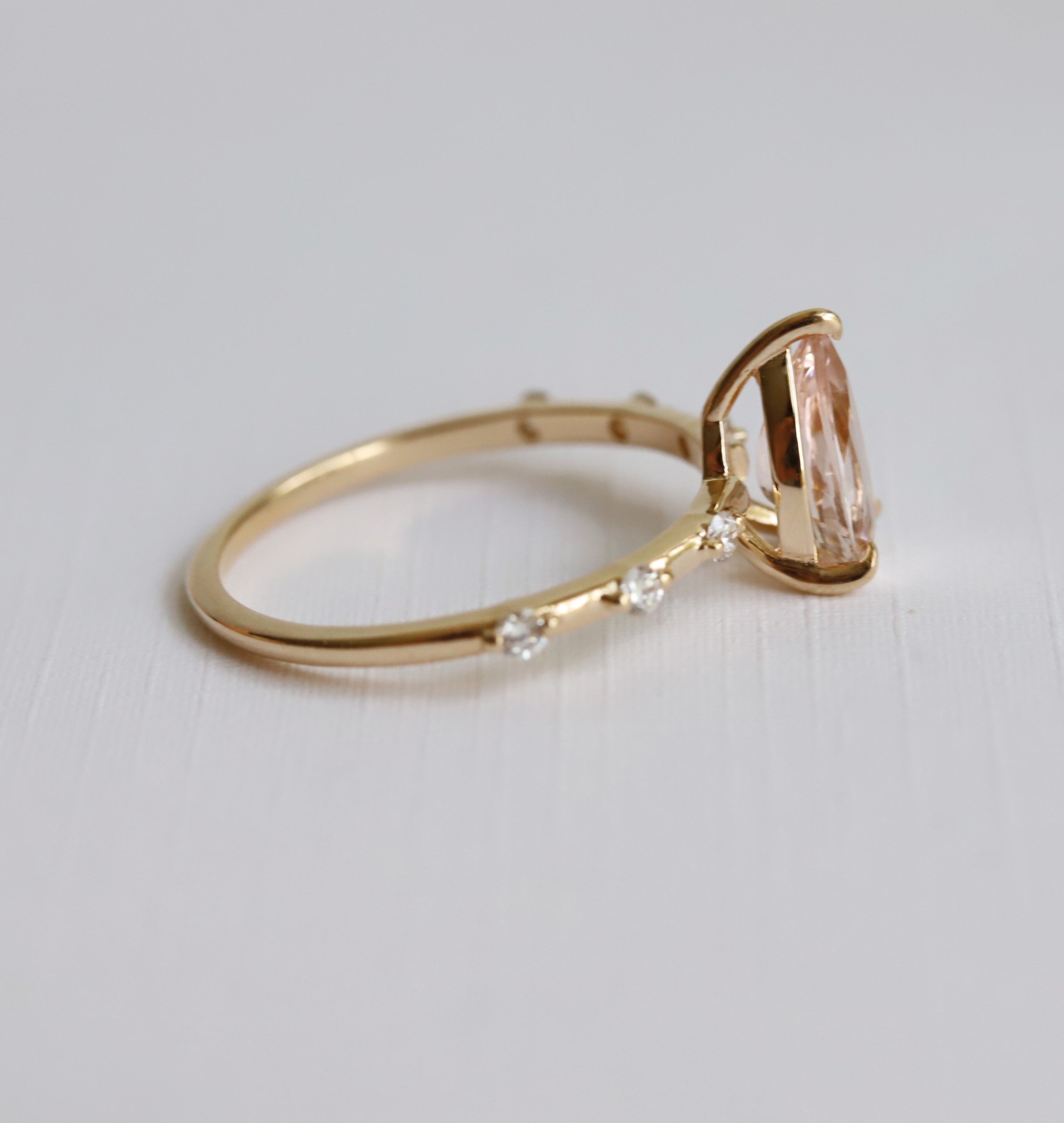 The Aurora ring features a sleek, sturdy band paired with a basket four-prong setting. At its center is a 1 ct. pear natural Morganite, complemented by three diamonds on each side. This design embodies timeless elegance with a minimalist style, making it perfect for those seeking a refined, subtle engagement ring.
