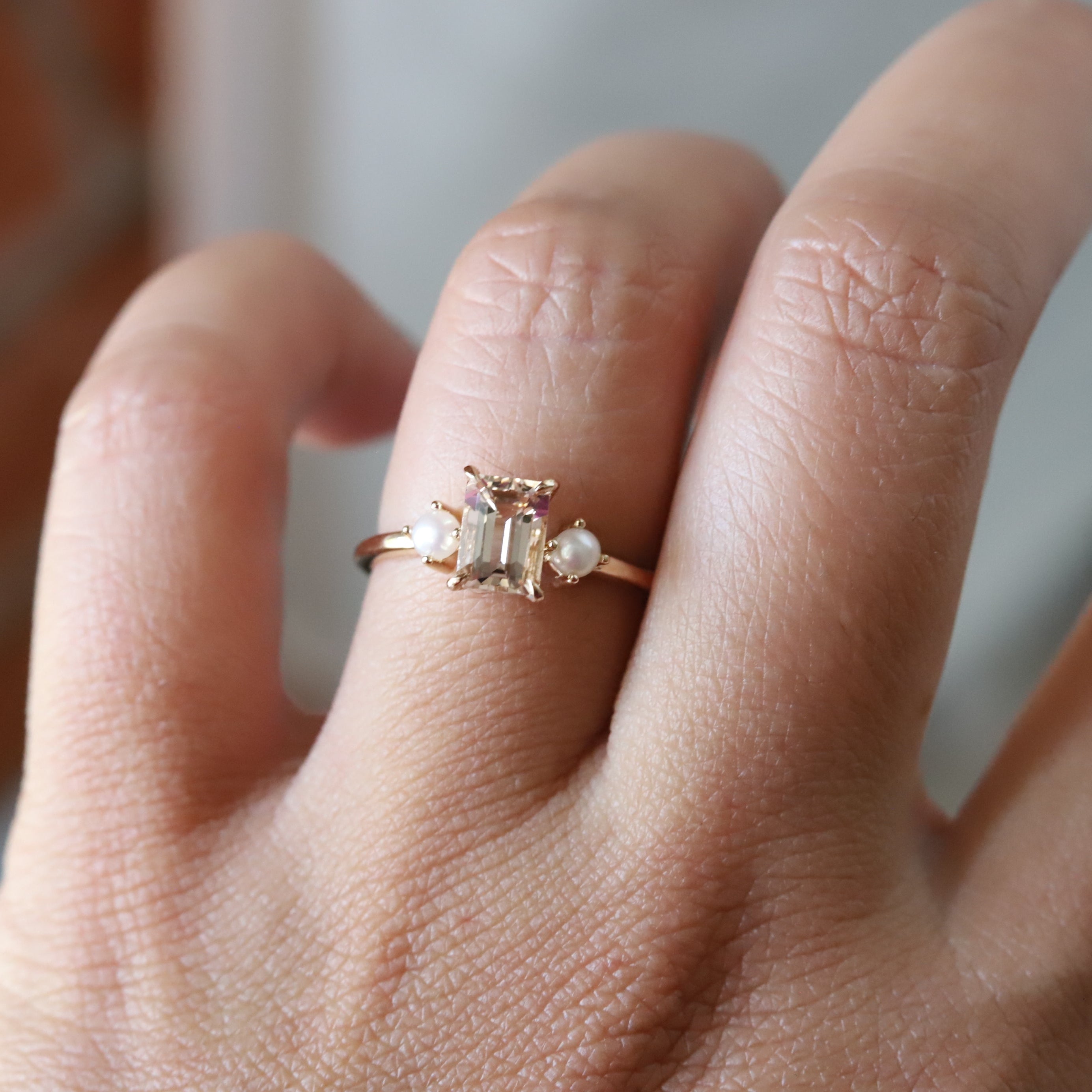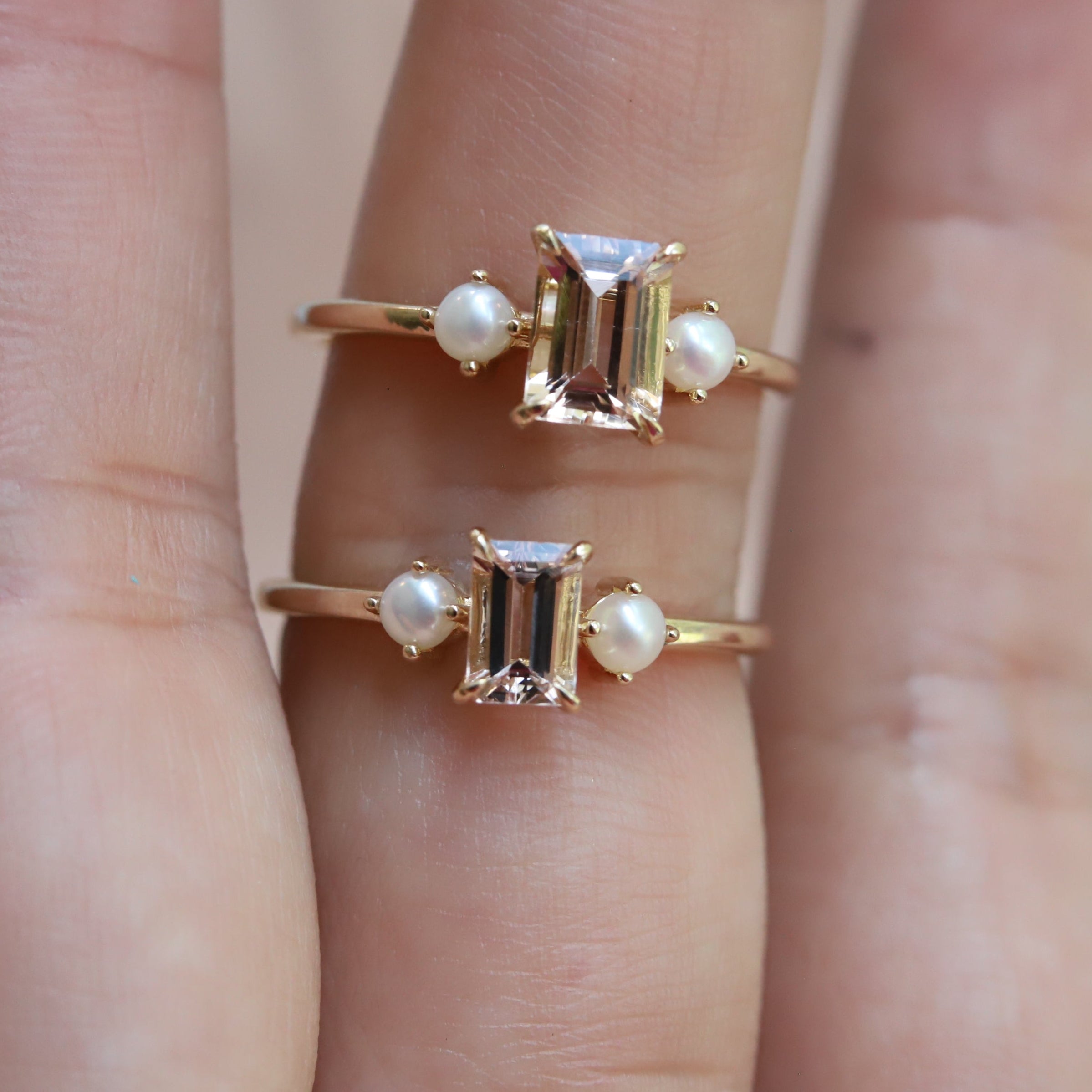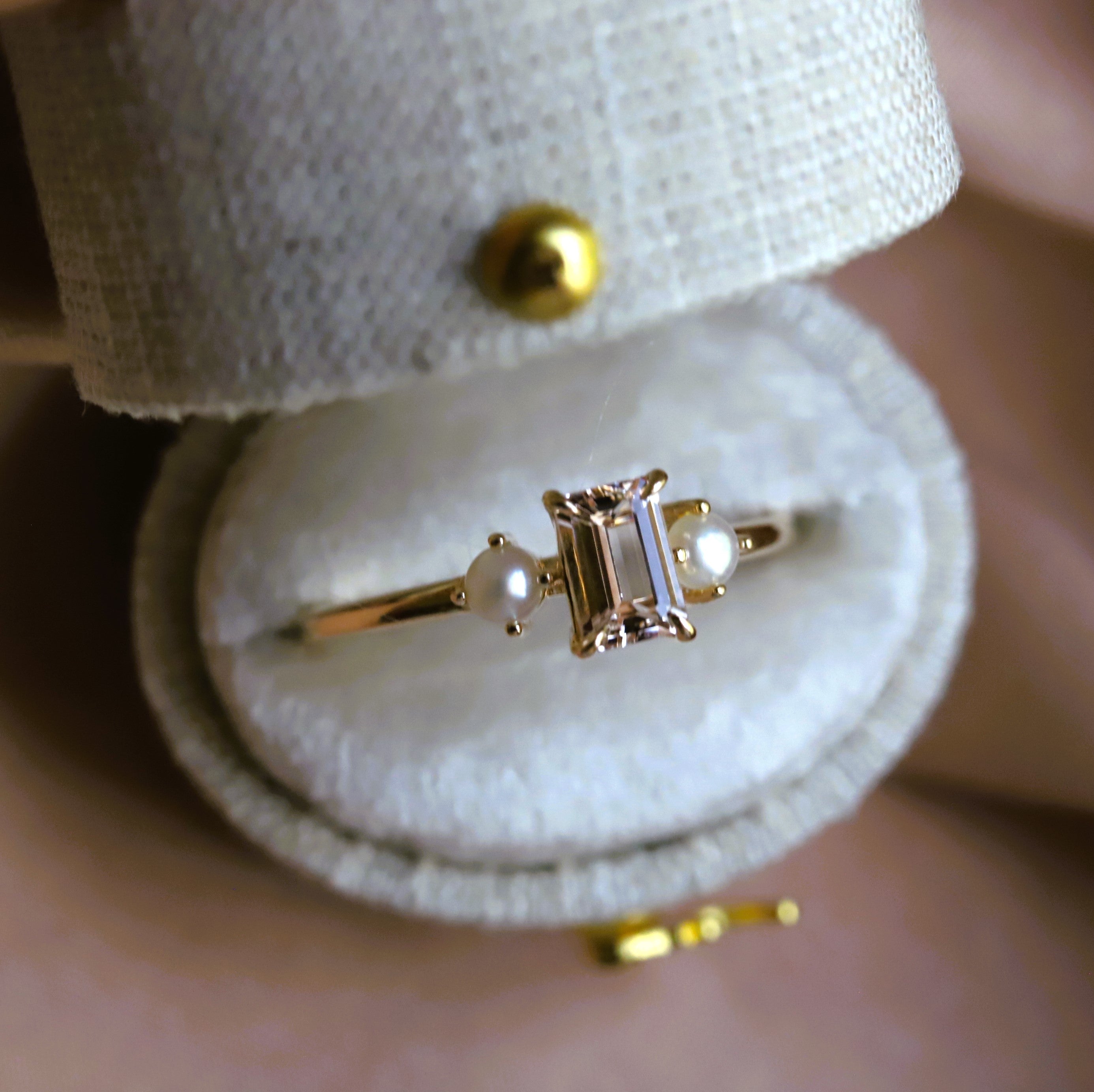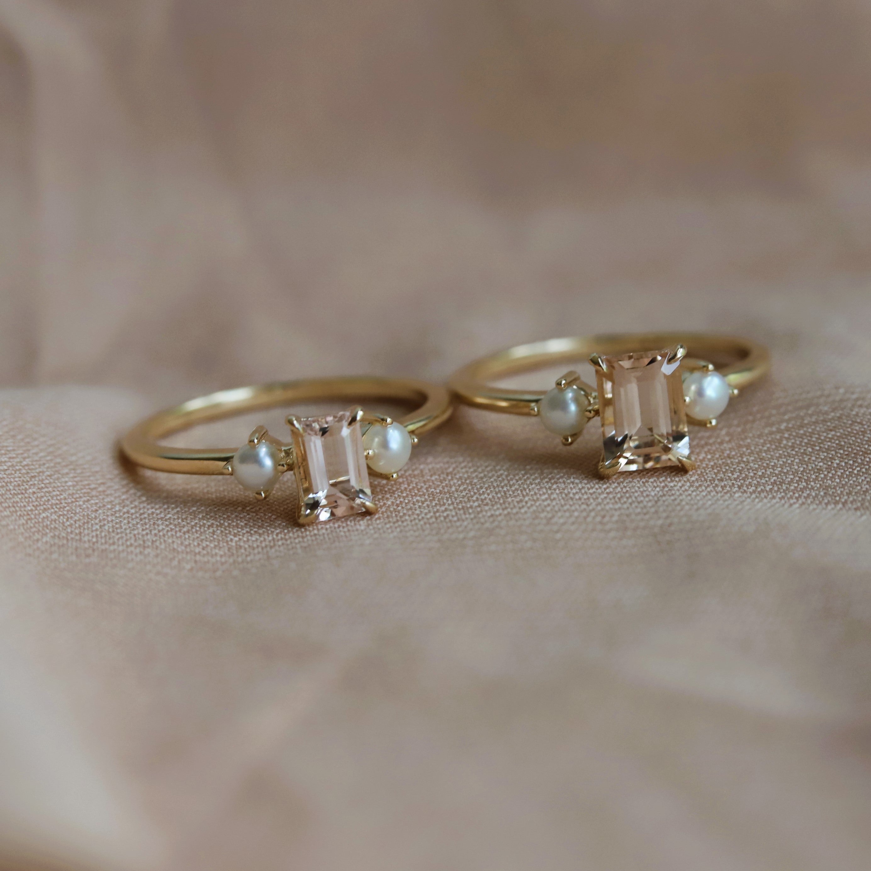 EVA | 1 ct. Emerald Cut Peach Morganite and Pearl Ring