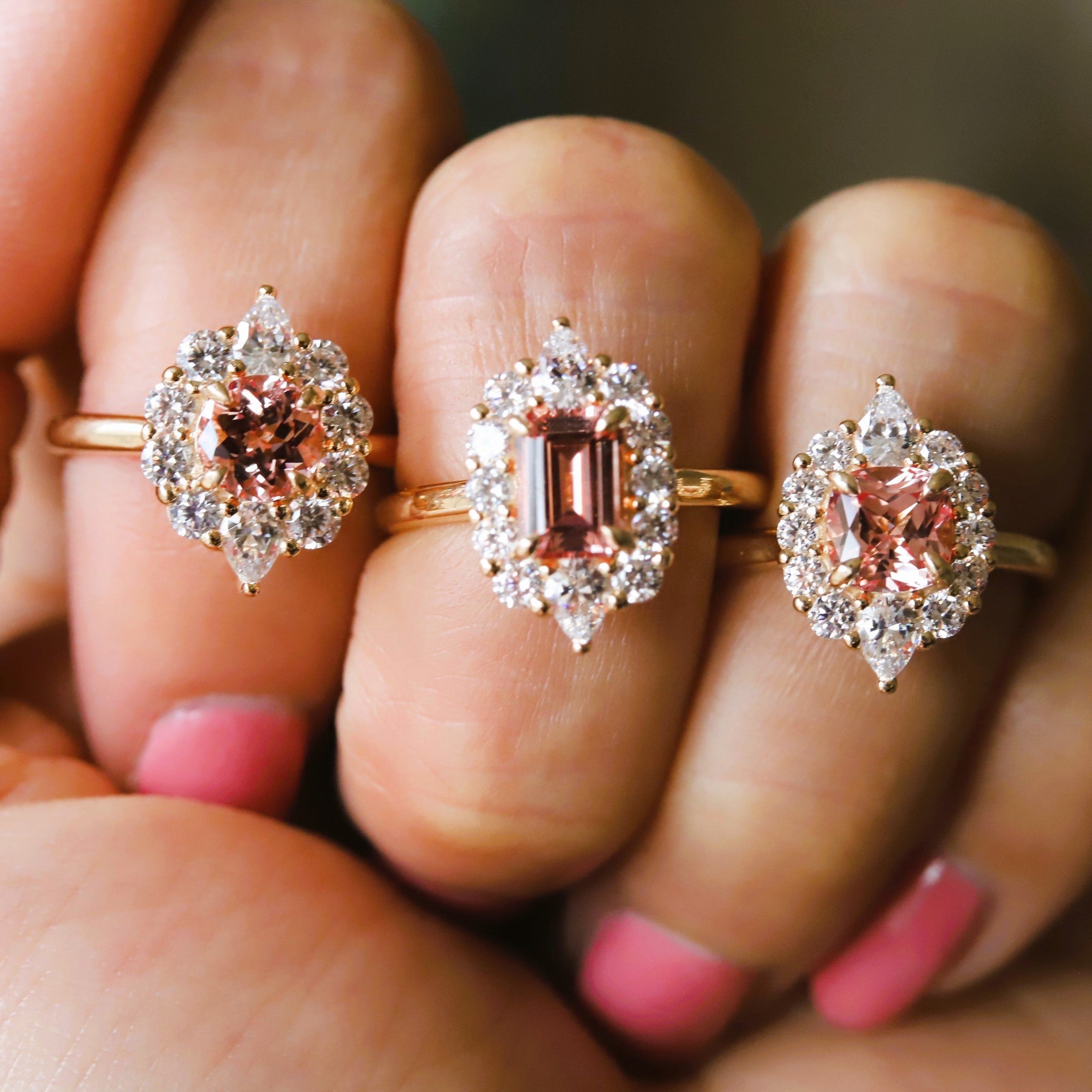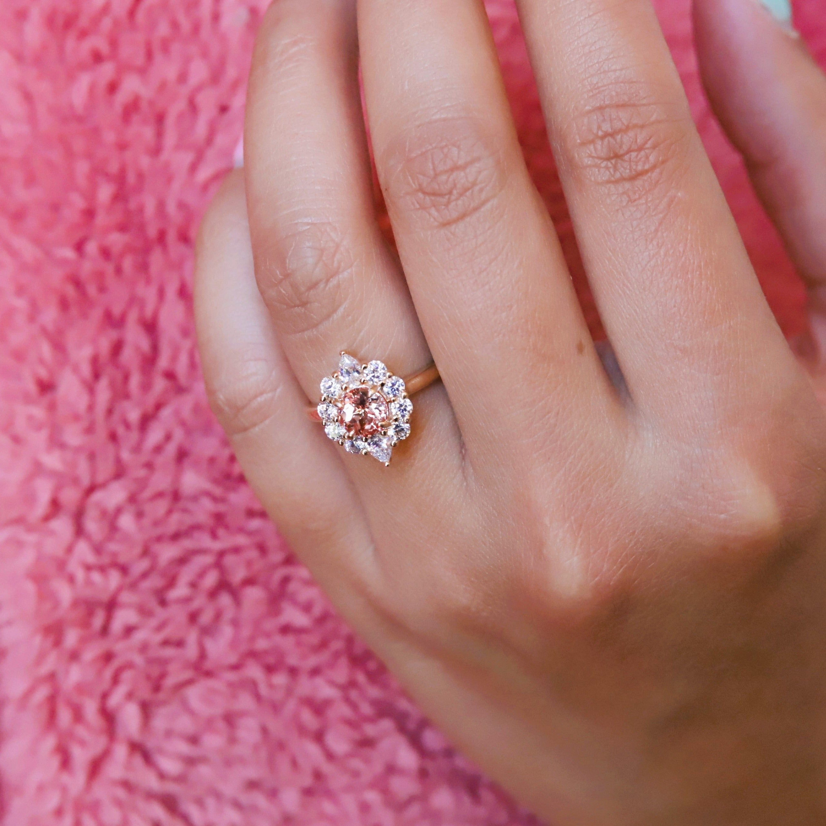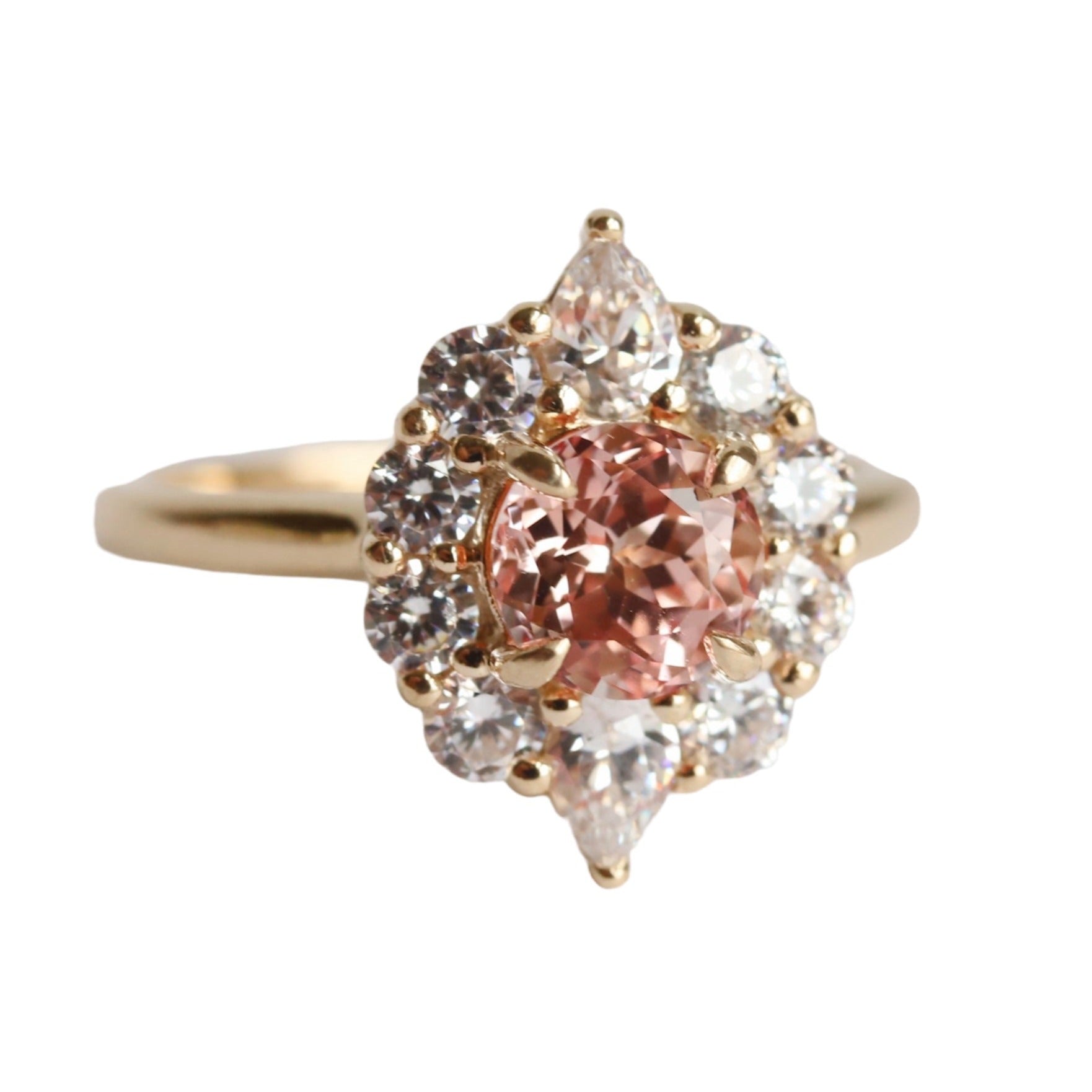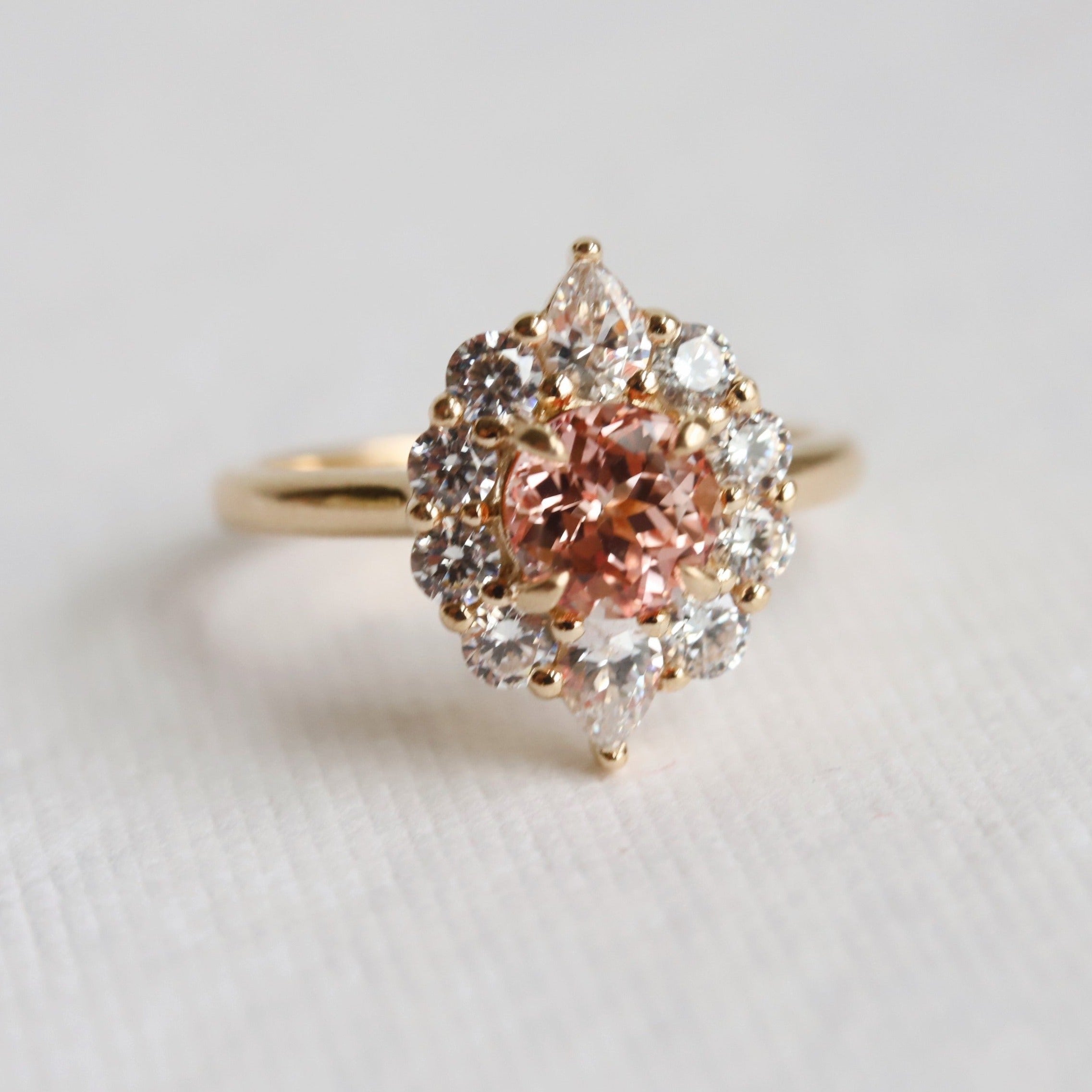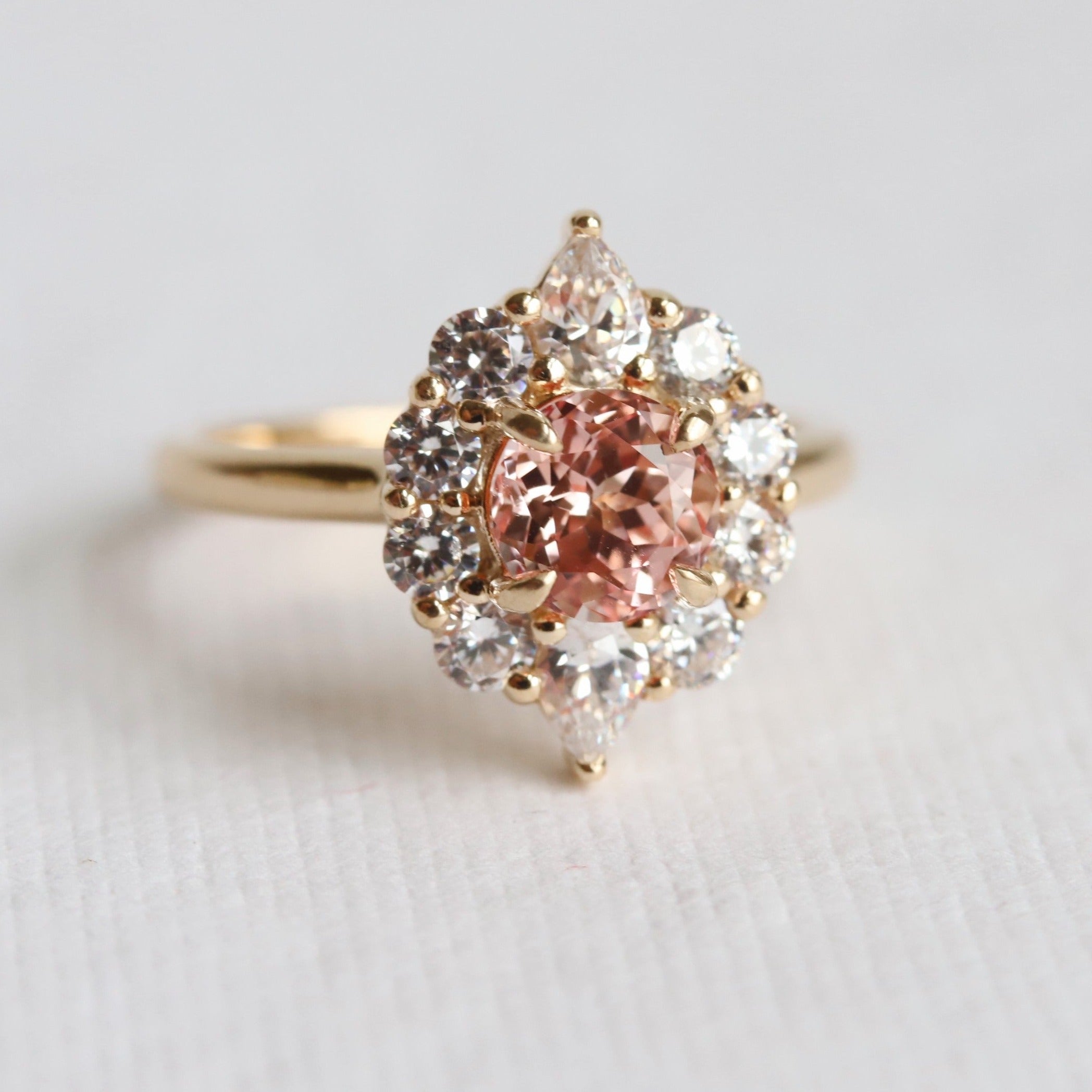 An affordable alternative to natural peach sapphire, and a more durable alternative to morganite. This Chatham™ Lab Created Champagne Sapphire is set encircled by a dazzling halo of round and pear stones in a shared prong setting. The raised cathedral design allows for seamless stacking with a straight wedding band, making it an ideal choice for an engagement ring.