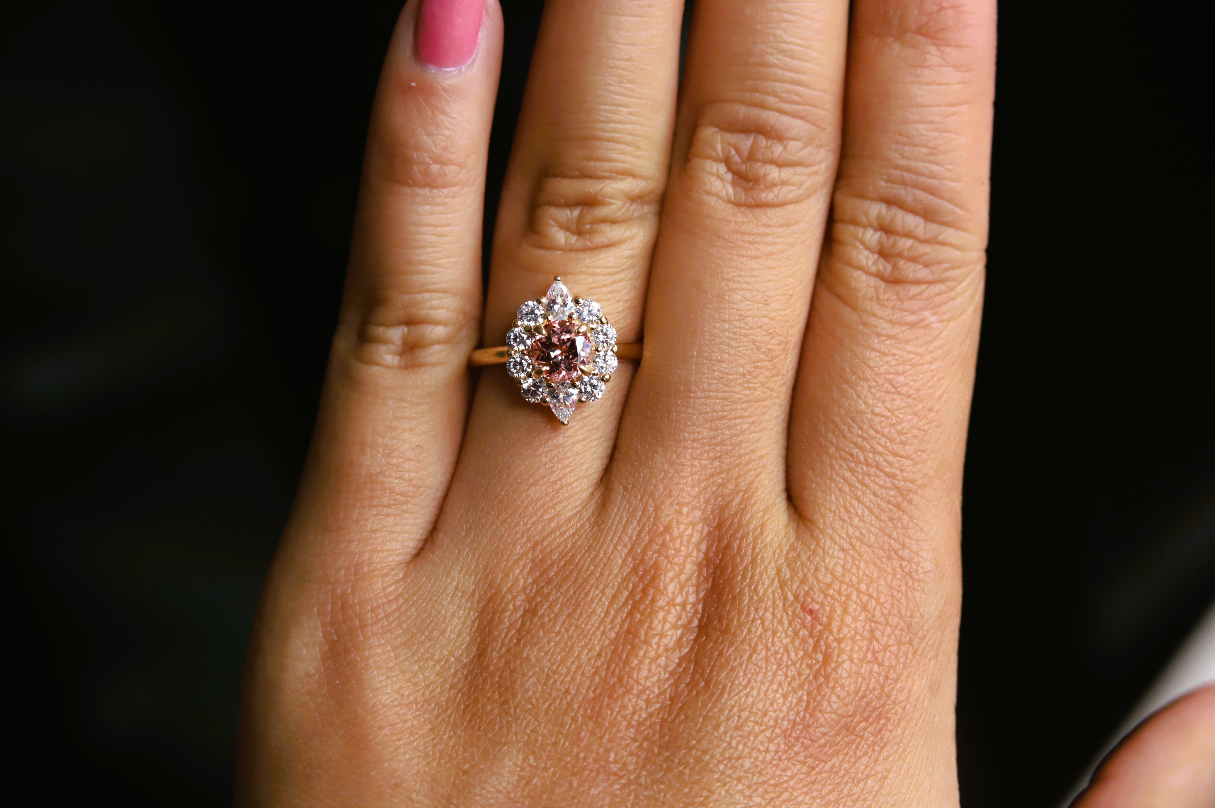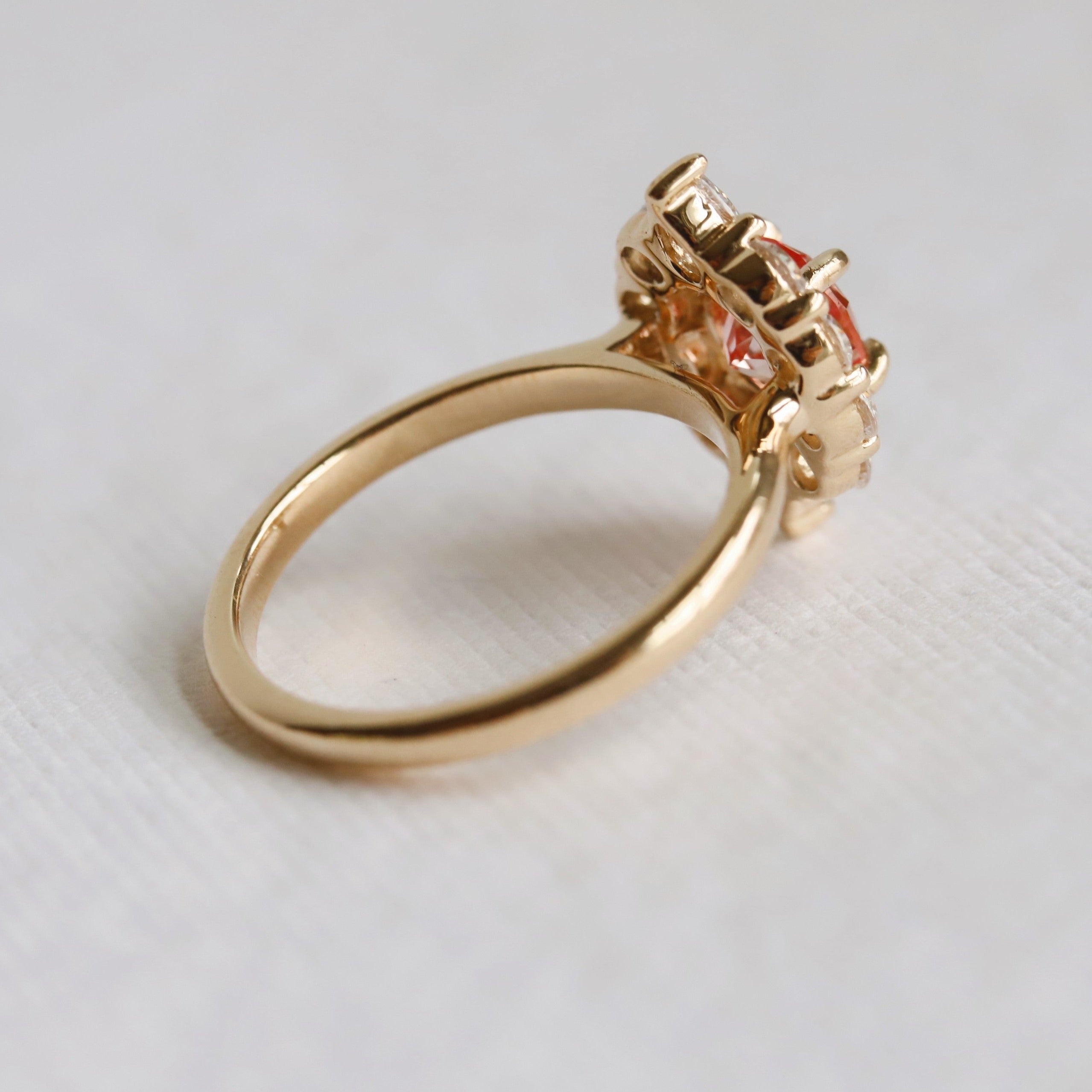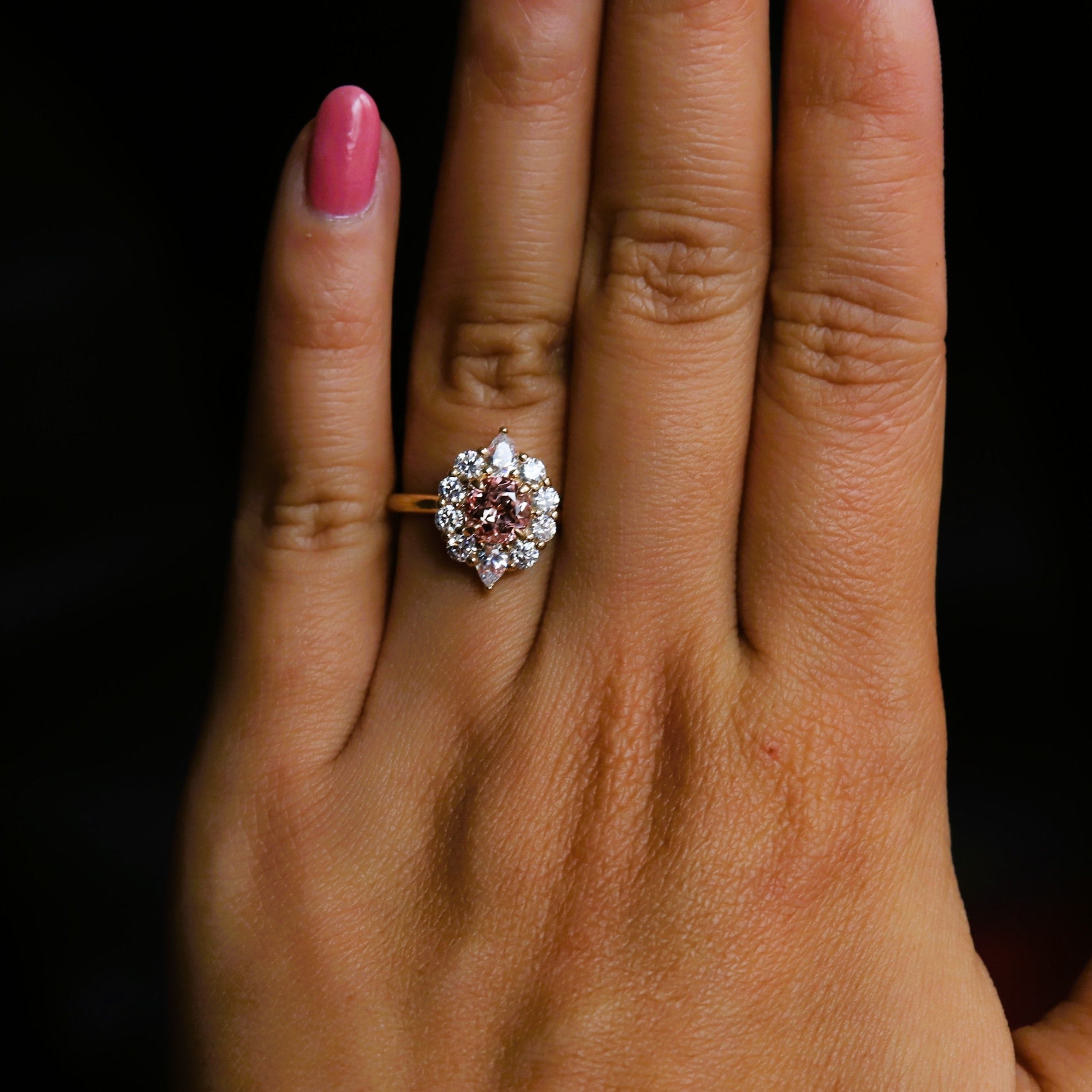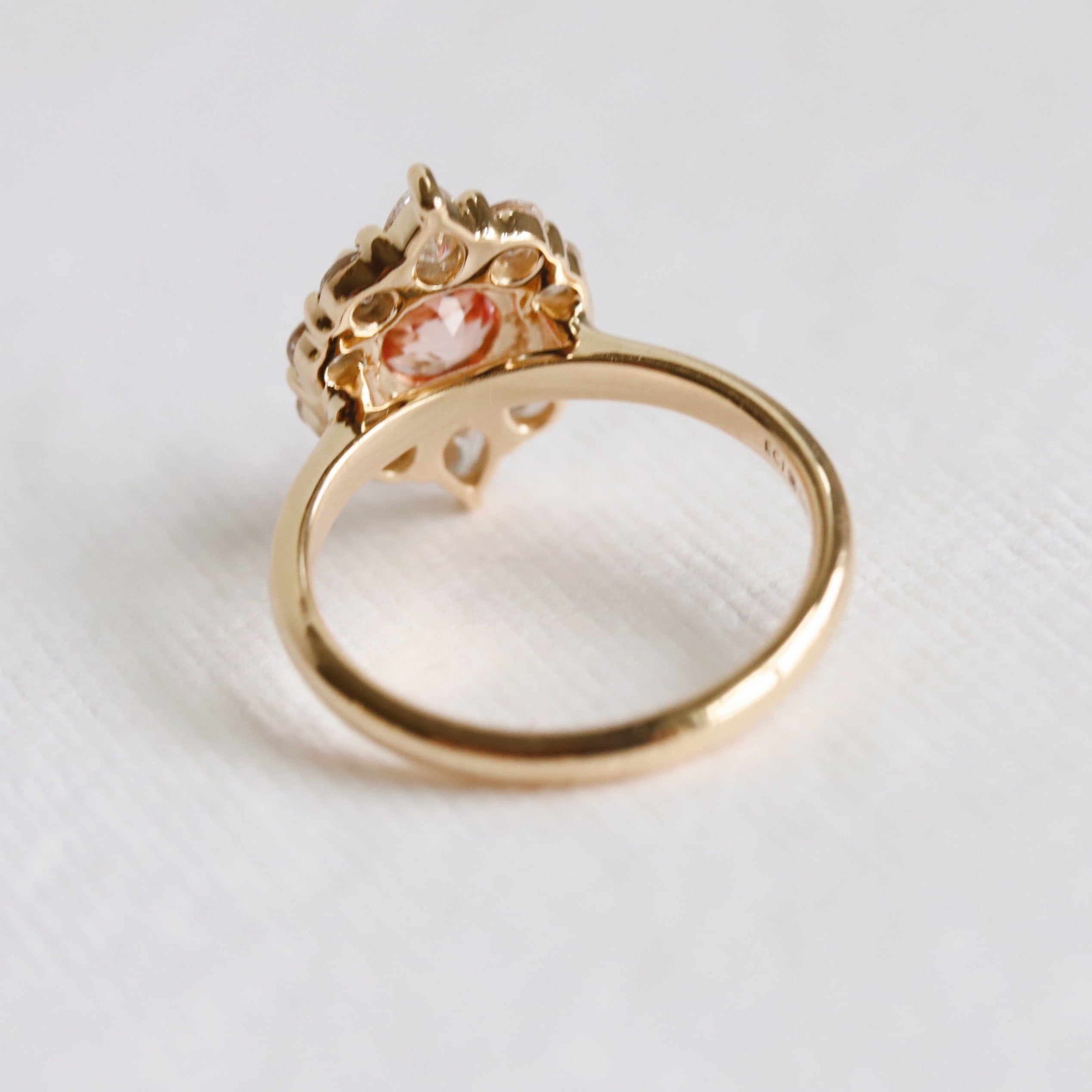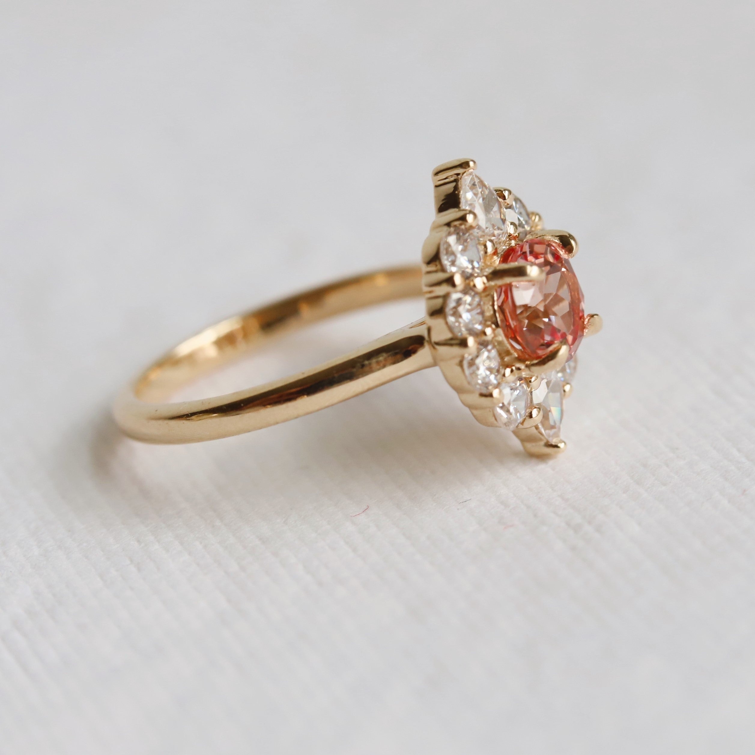 An affordable alternative to natural peach sapphire, and a more durable alternative to morganite. This Chatham™ Lab Created Champagne Sapphire is set encircled by a dazzling halo of round and pear stones in a shared prong setting. The raised cathedral design allows for seamless stacking with a straight wedding band, making it an ideal choice for an engagement ring.