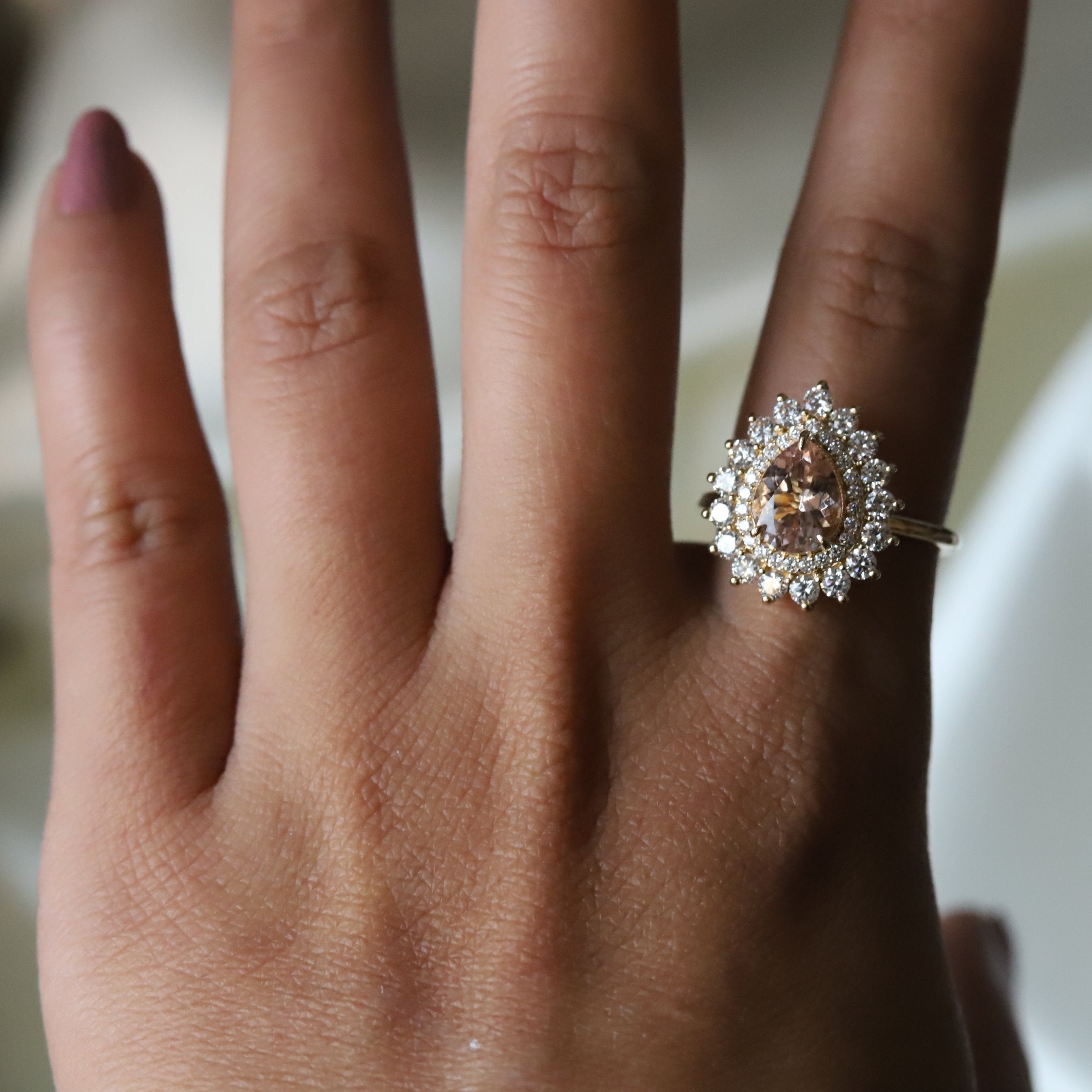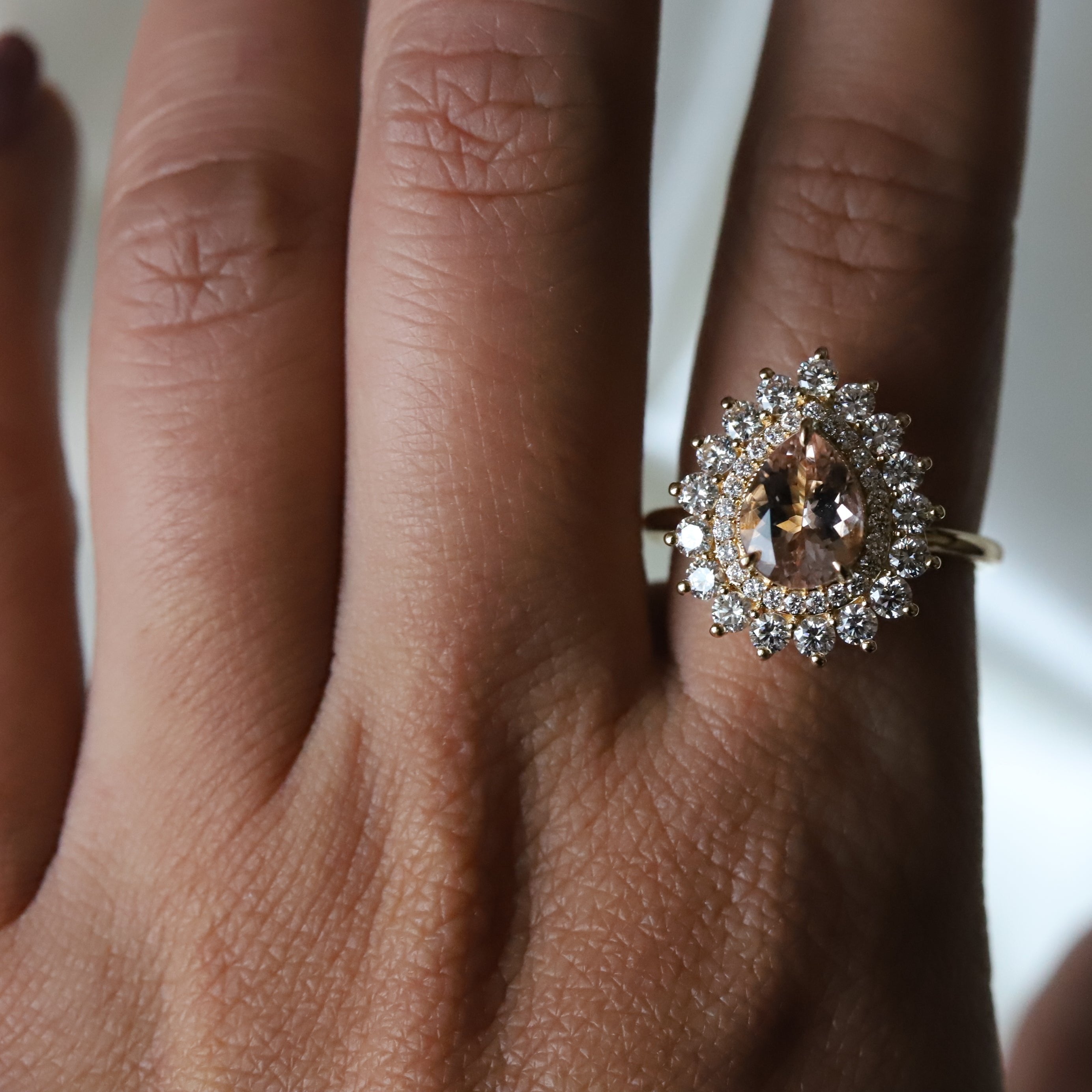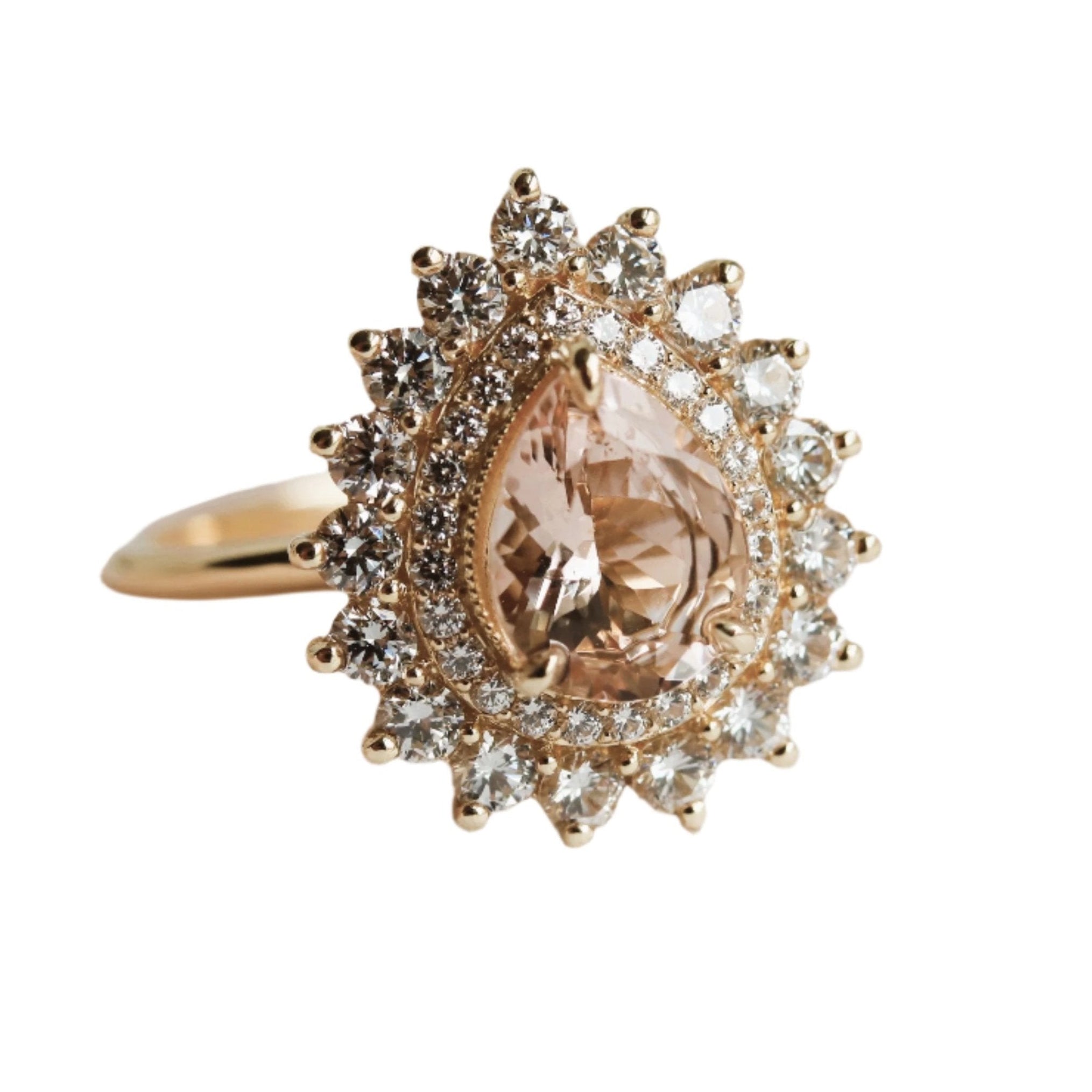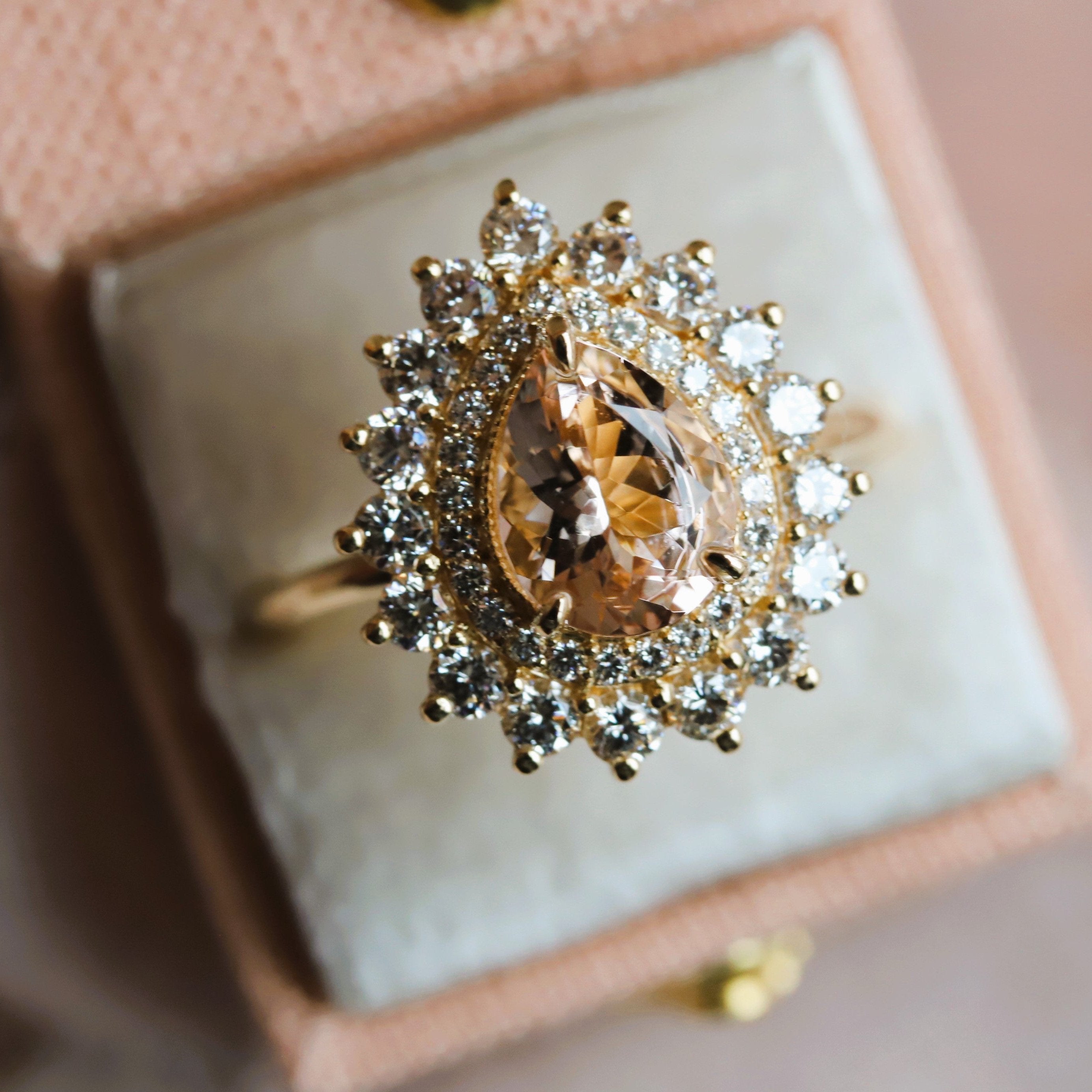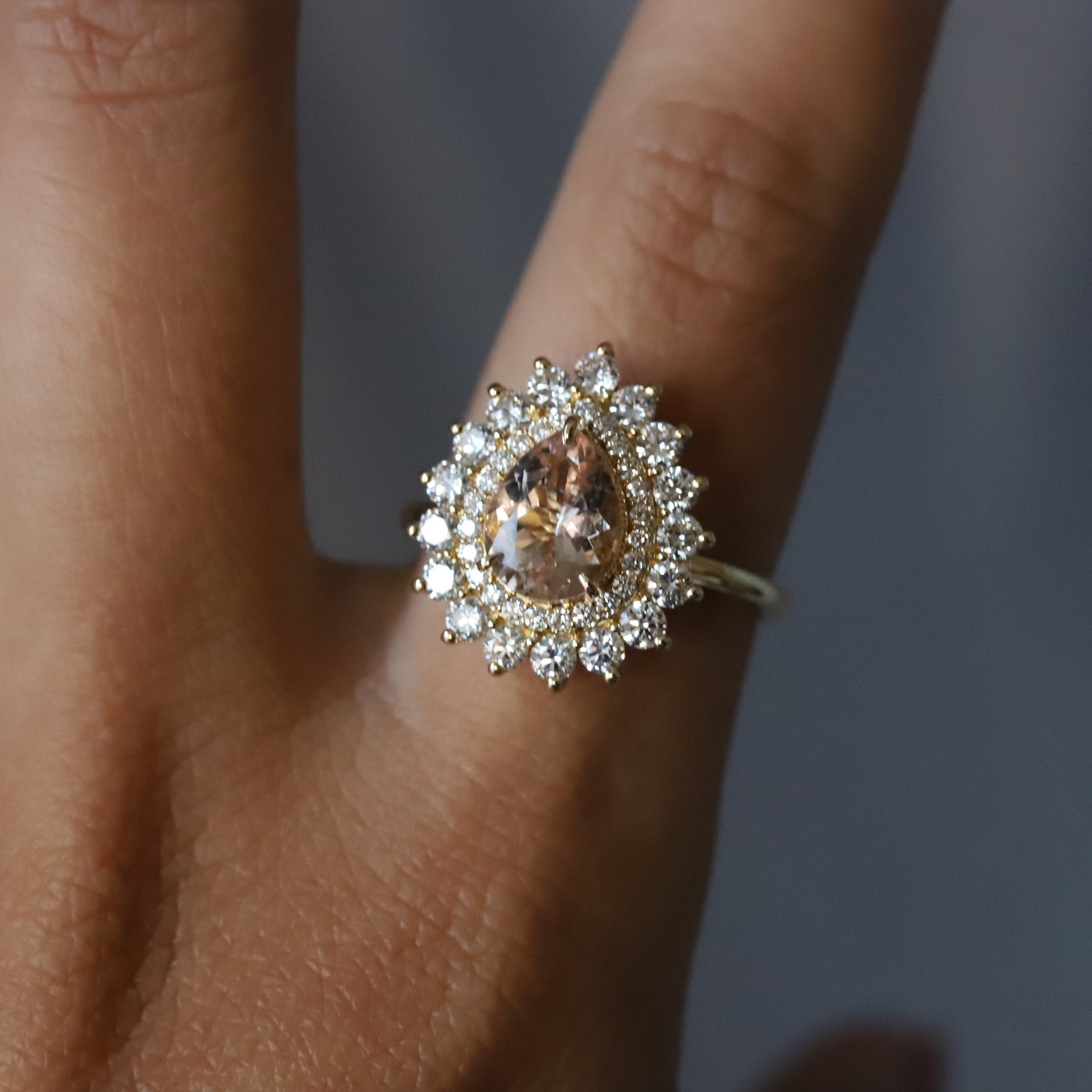 This beautiful Josephine Pear Morganite Double Halo Ring features two circles of sparkling diamonds framing a gorgeous aquamarine center stone. The diamond halo amplifies the brilliance of the stone while adding a touch of elegance.