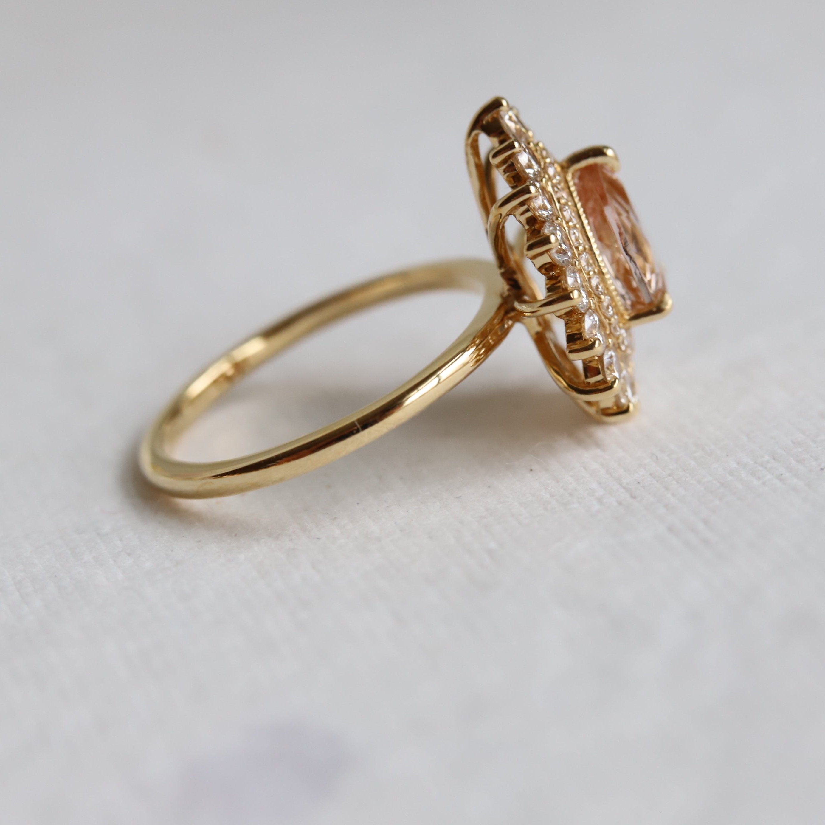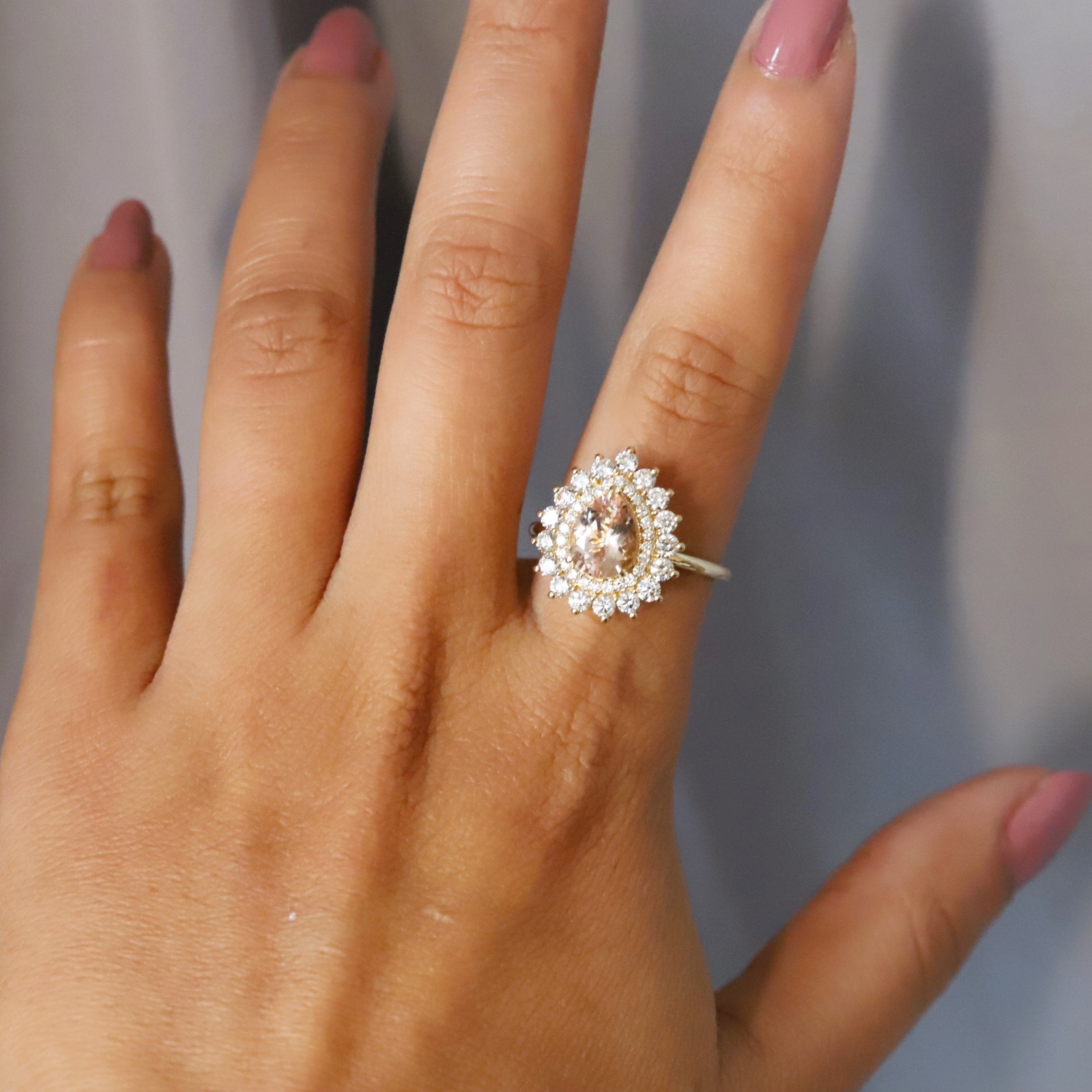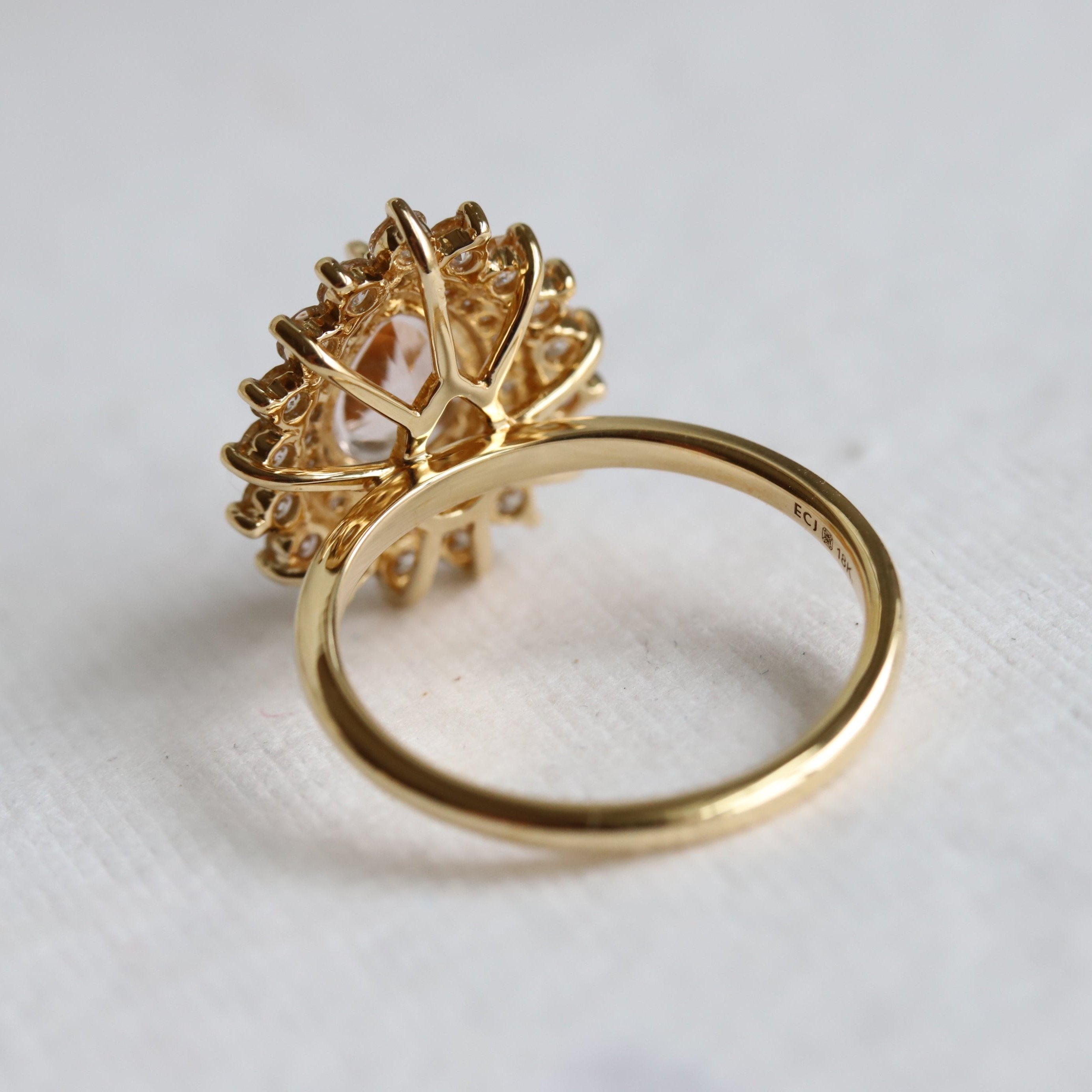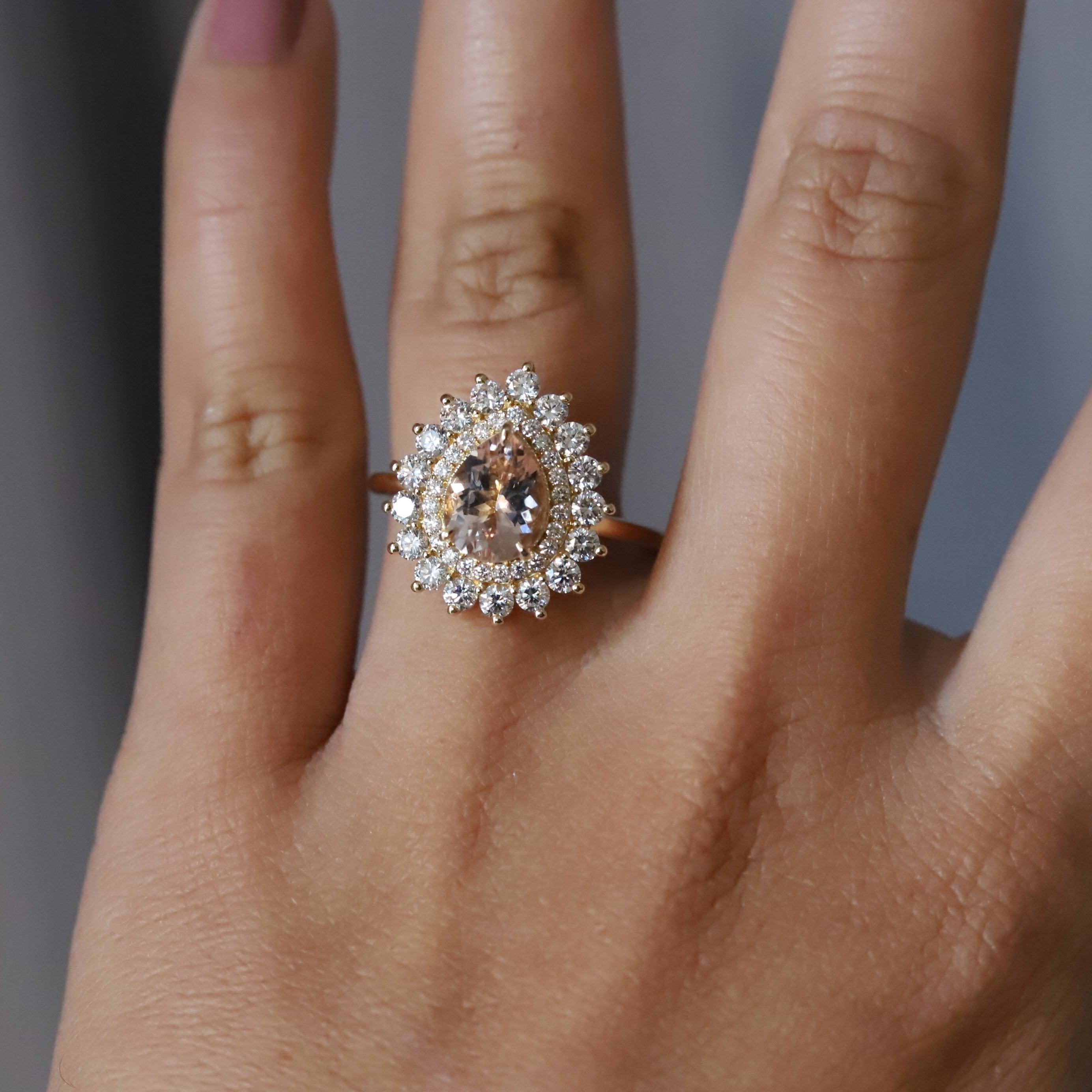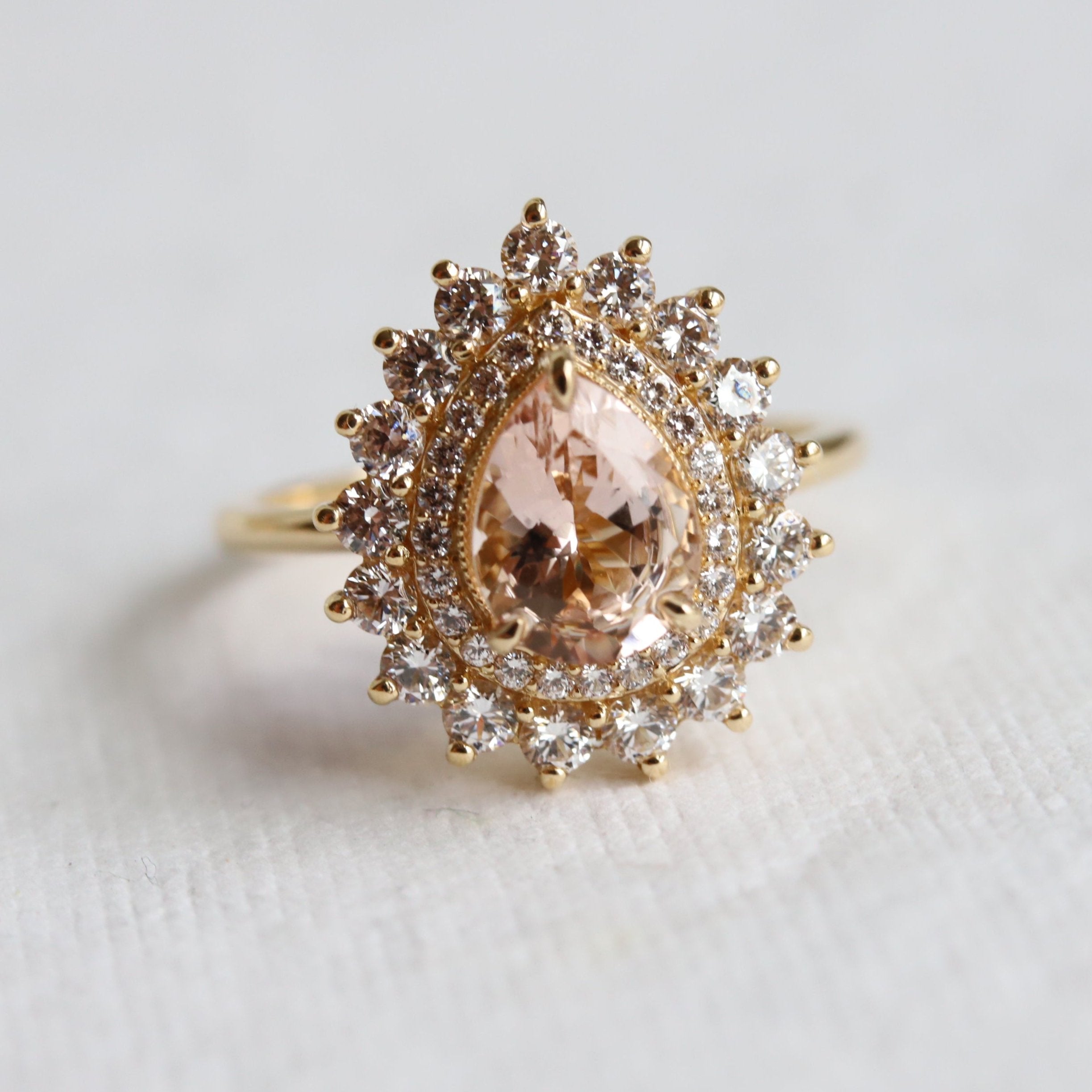 This beautiful Josephine Pear Morganite Double Halo Ring features two circles of sparkling diamonds framing a gorgeous aquamarine center stone. The diamond halo amplifies the brilliance of the stone while adding a touch of elegance.