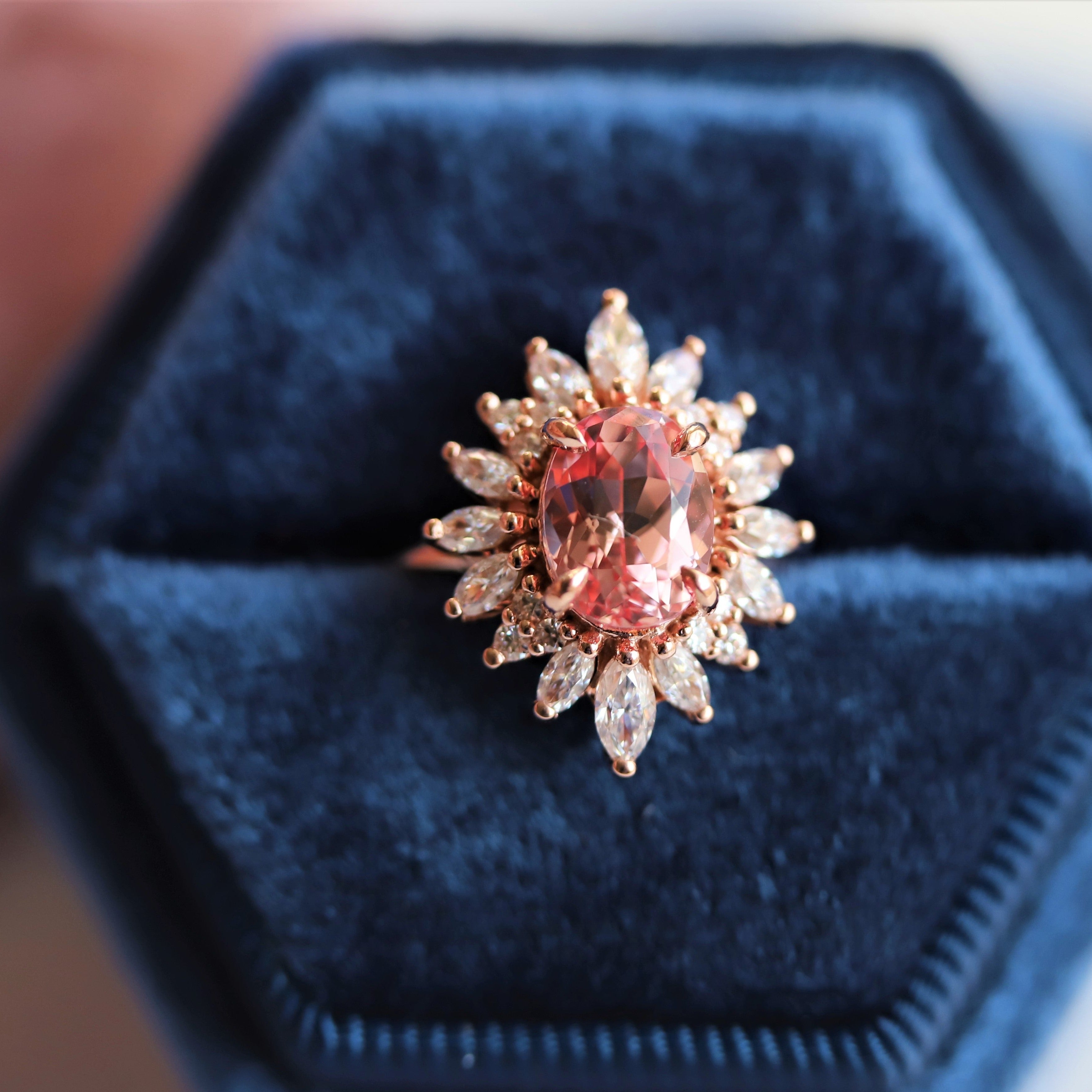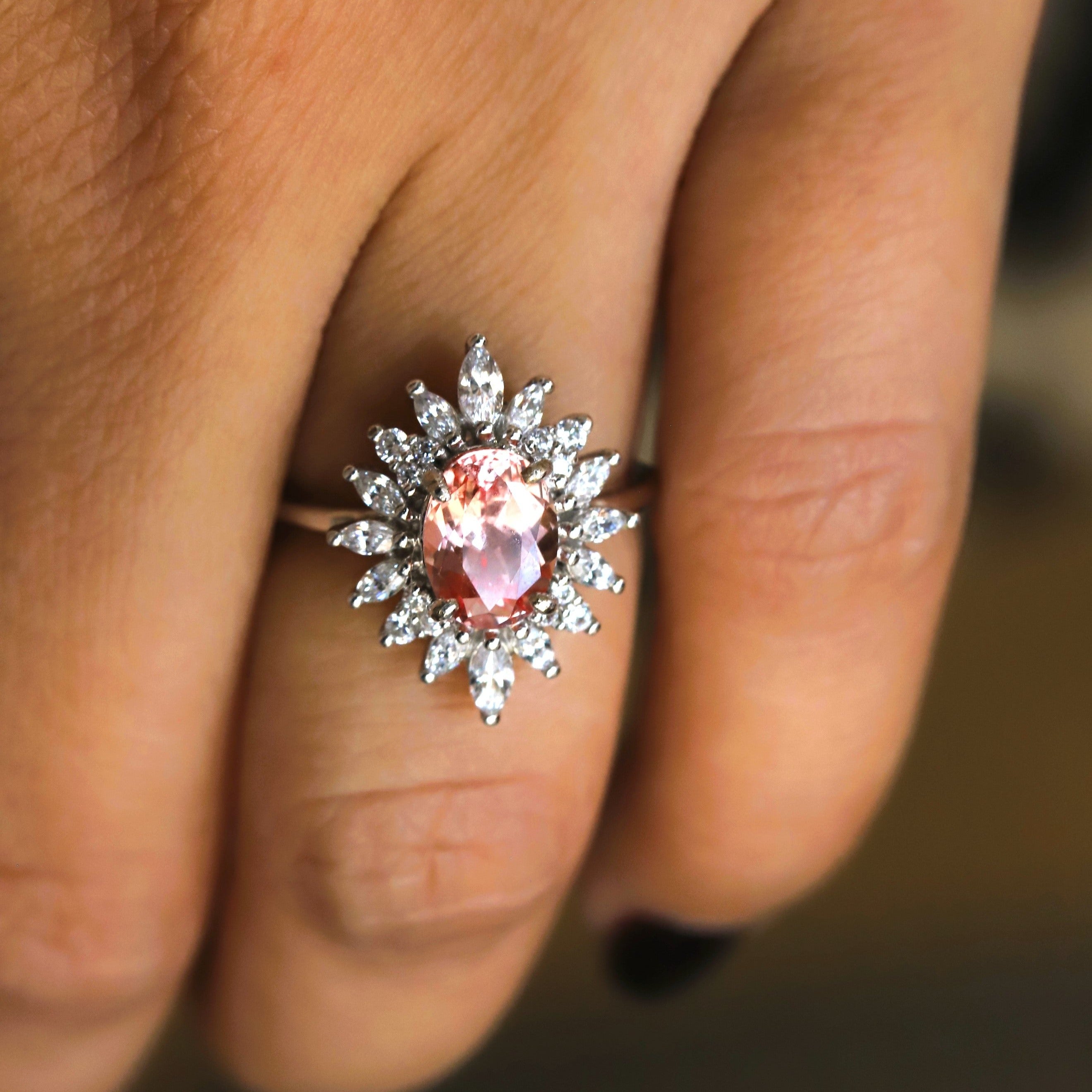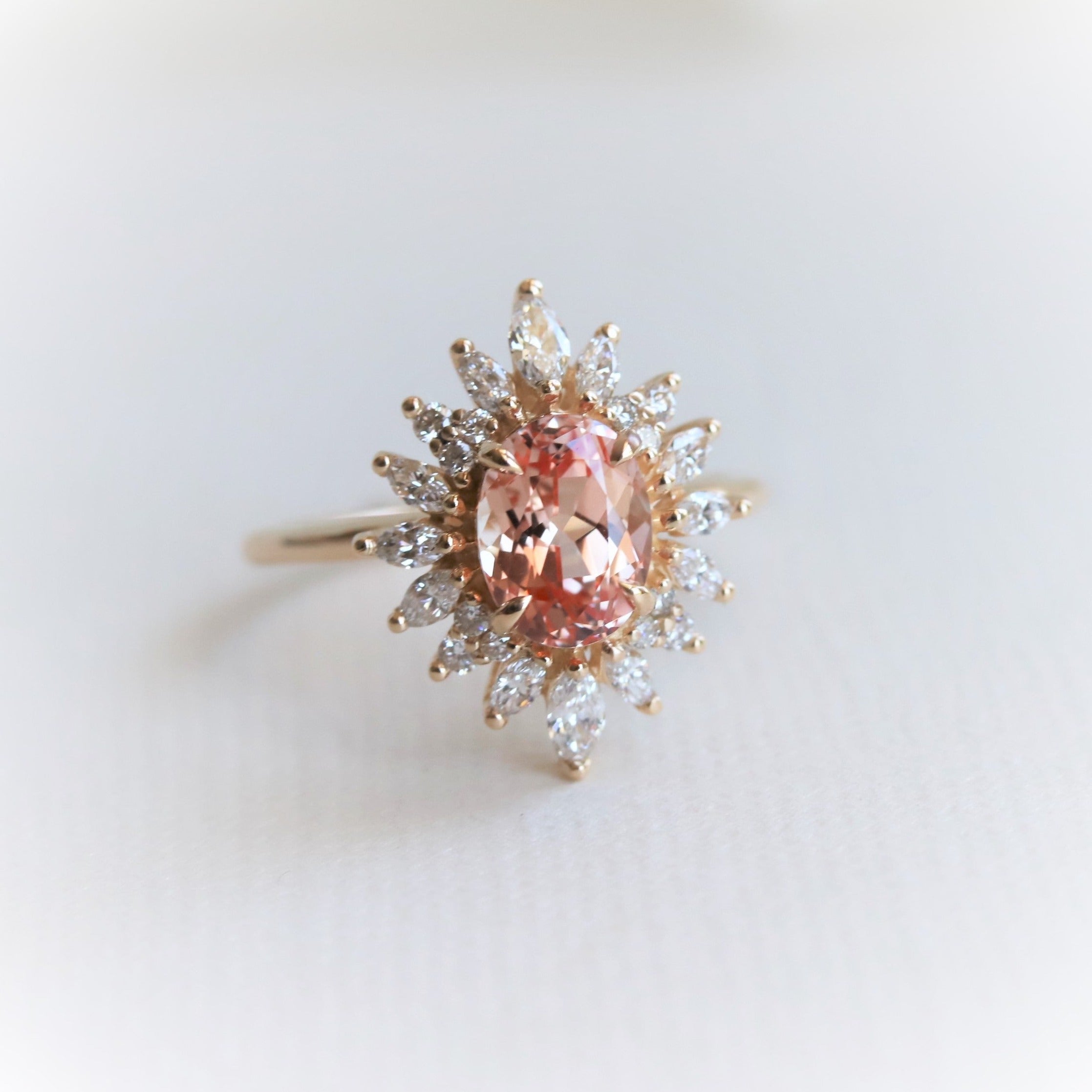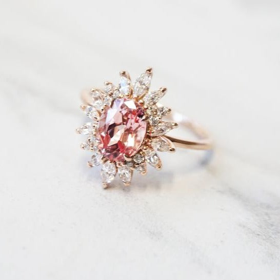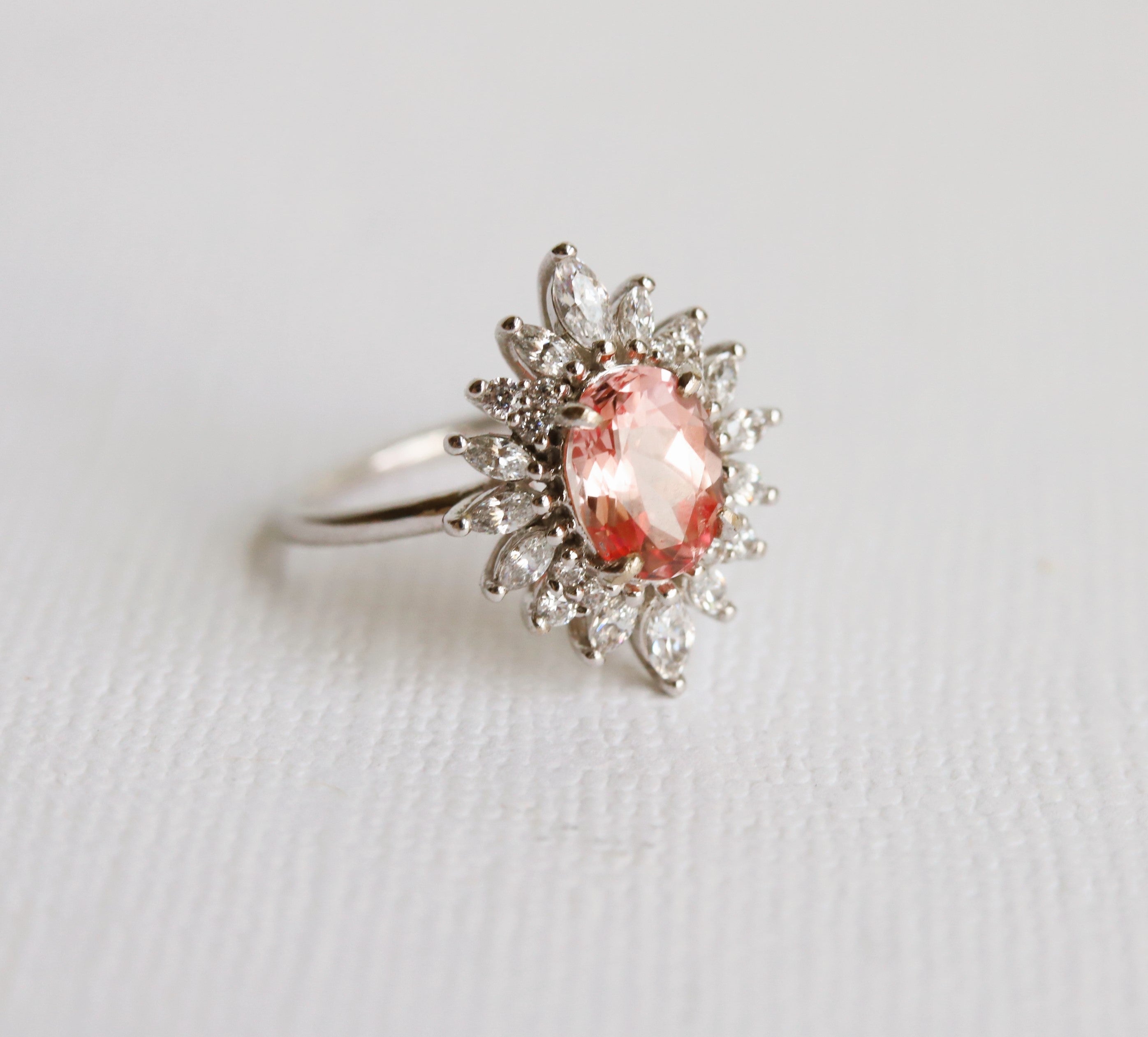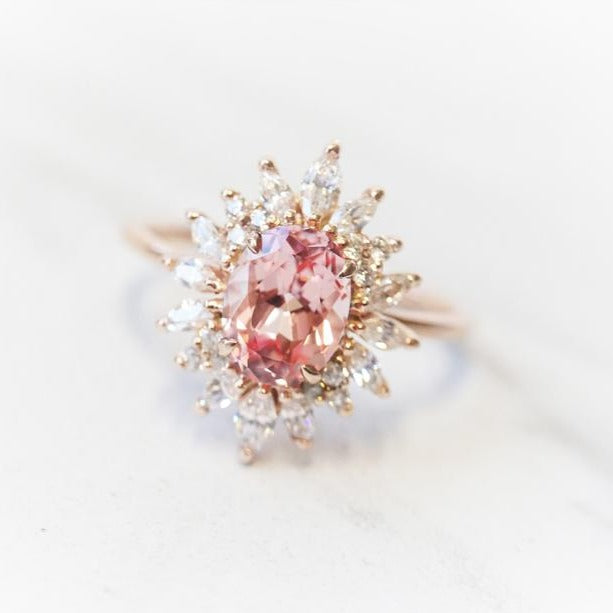 With the desired color of morganite and the hardness of corundum, champagne sapphire has a rich brilliance and beauty that is unmatched. As a colored gemstone alternative to the engagement ring, many favor champagne sapphire’s peachy pink hue. Chatham lab-grown champagne sapphire has exceptional color, brilliance and clarity. The stone is set in our Lana oval-shaped setting, it is secured in a four-prong in the center, framed by a glittering cluster of marquise and round sparkling side stone of your choice. Created on a graceful slim band, this gorgeous ring awaits your selection.