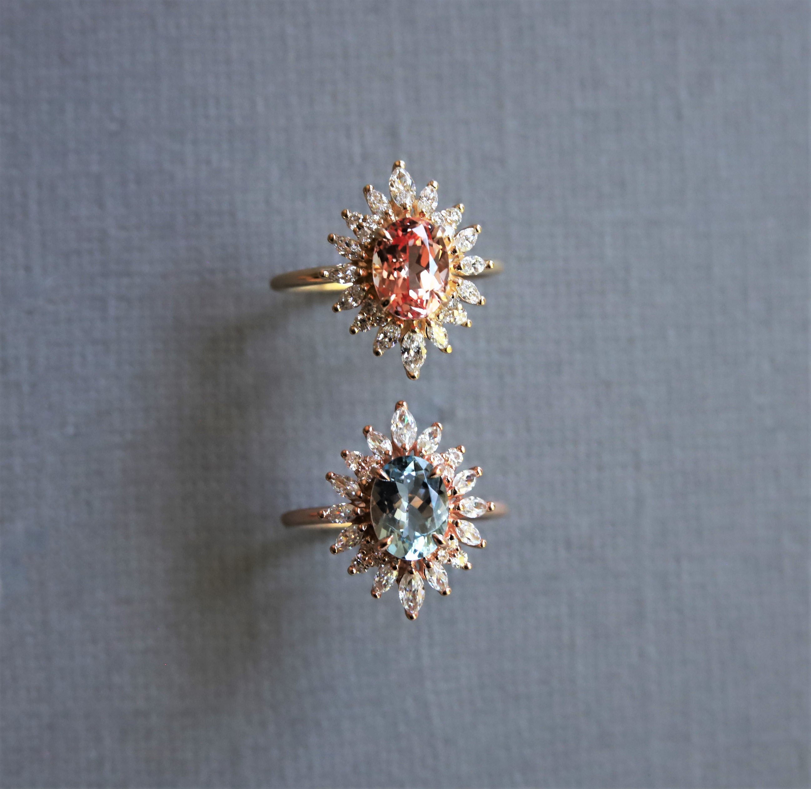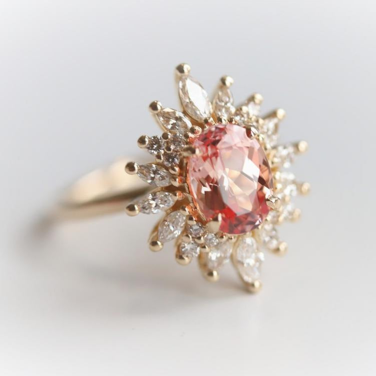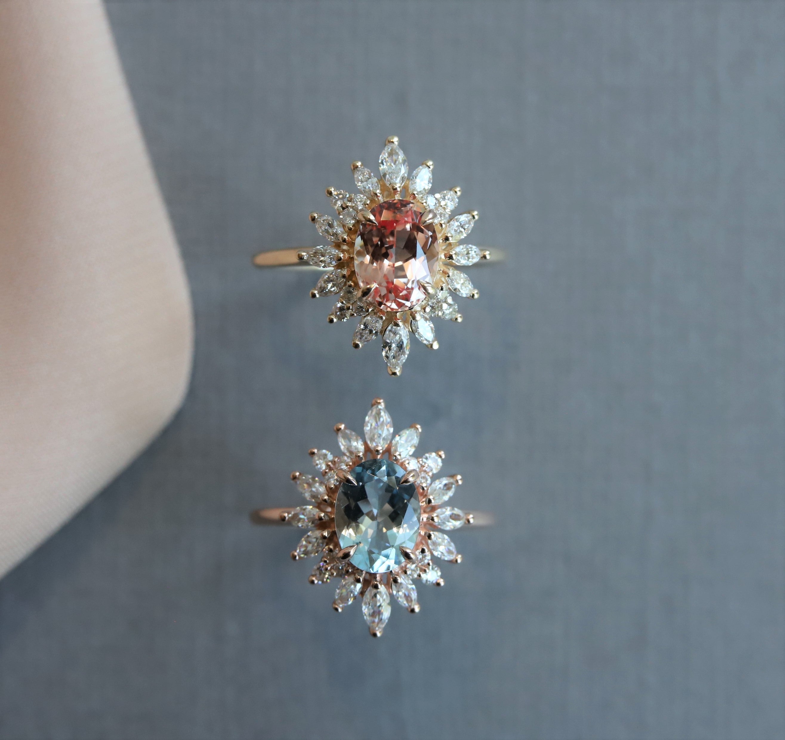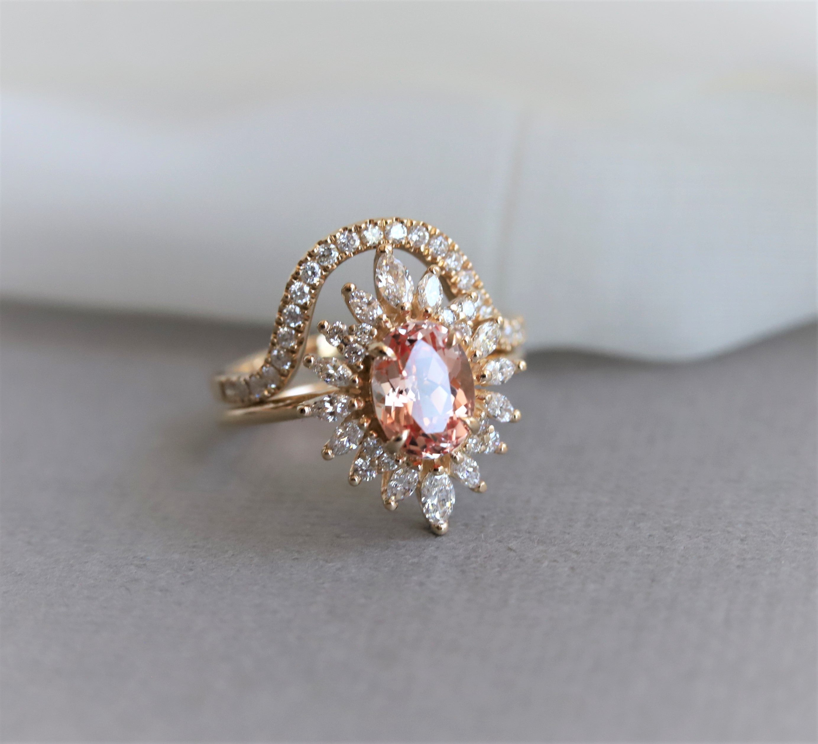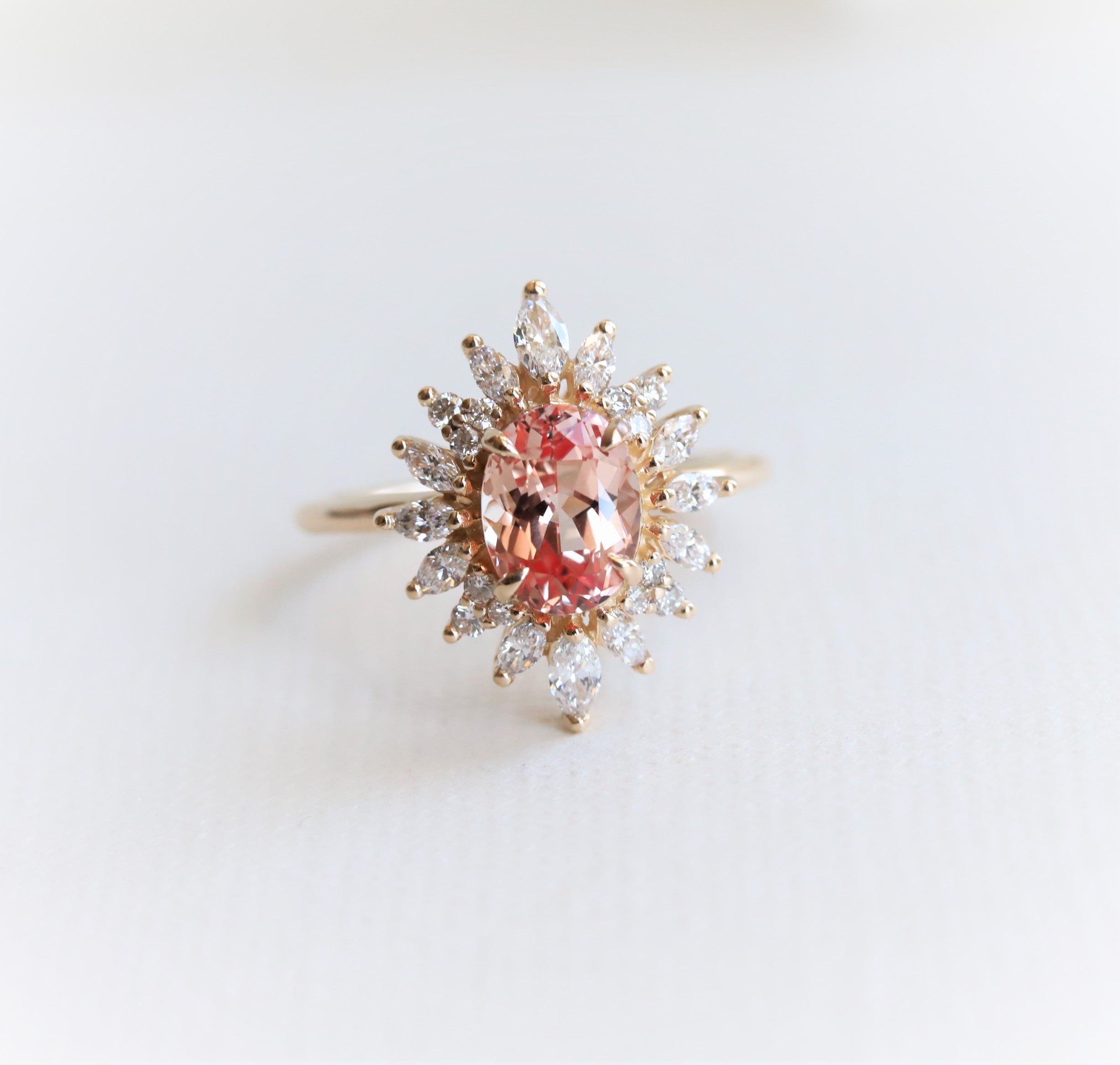 With the desired color of morganite and the hardness of corundum, champagne sapphire has a rich brilliance and beauty that is unmatched. As a colored gemstone alternative to the engagement ring, many favor champagne sapphire’s peachy pink hue. Chatham lab-grown champagne sapphire has exceptional color, brilliance and clarity. The stone is set in our Lana oval-shaped setting, it is secured in a four-prong in the center, framed by a glittering cluster of marquise and round sparkling side stone of your choice. Created on a graceful slim band, this gorgeous ring awaits your selection.