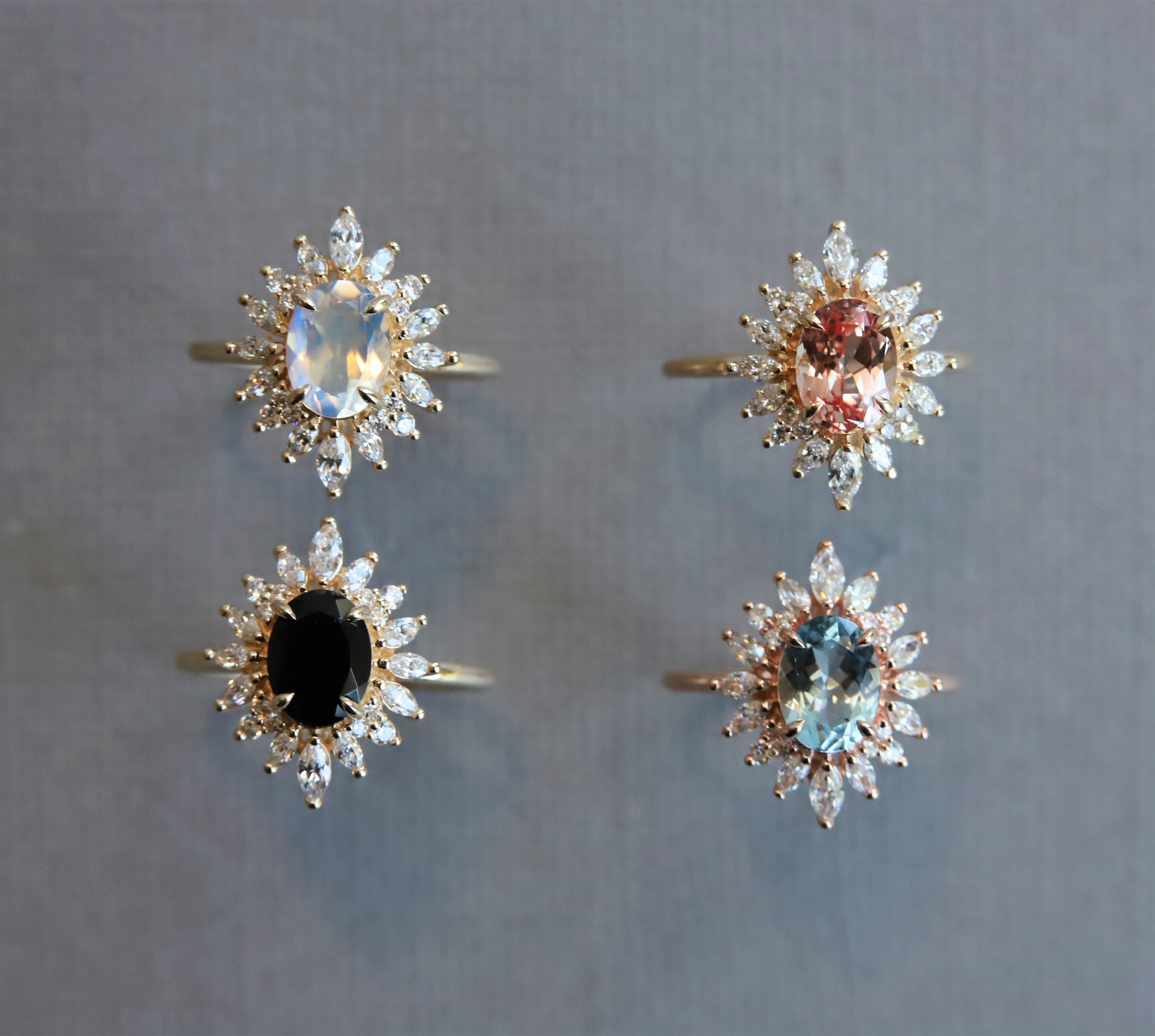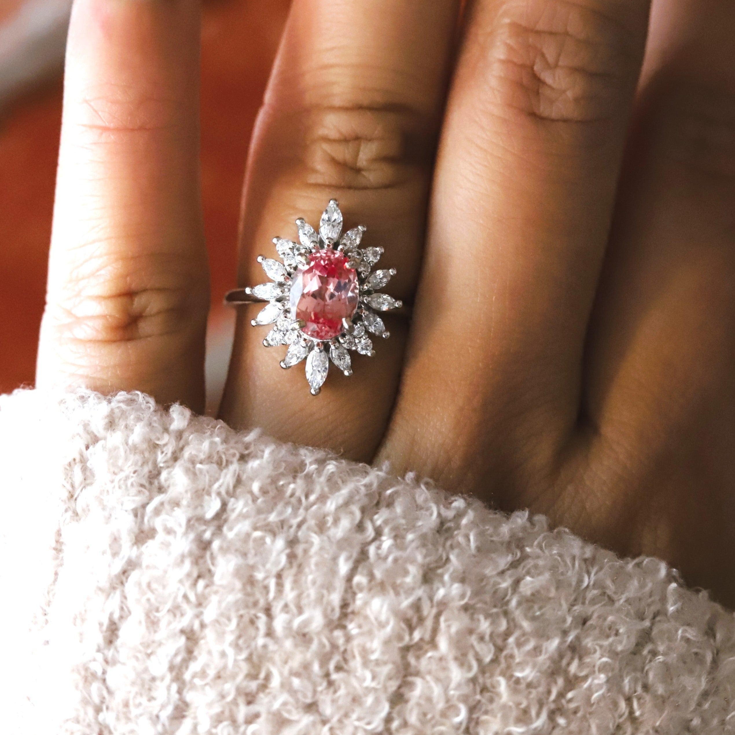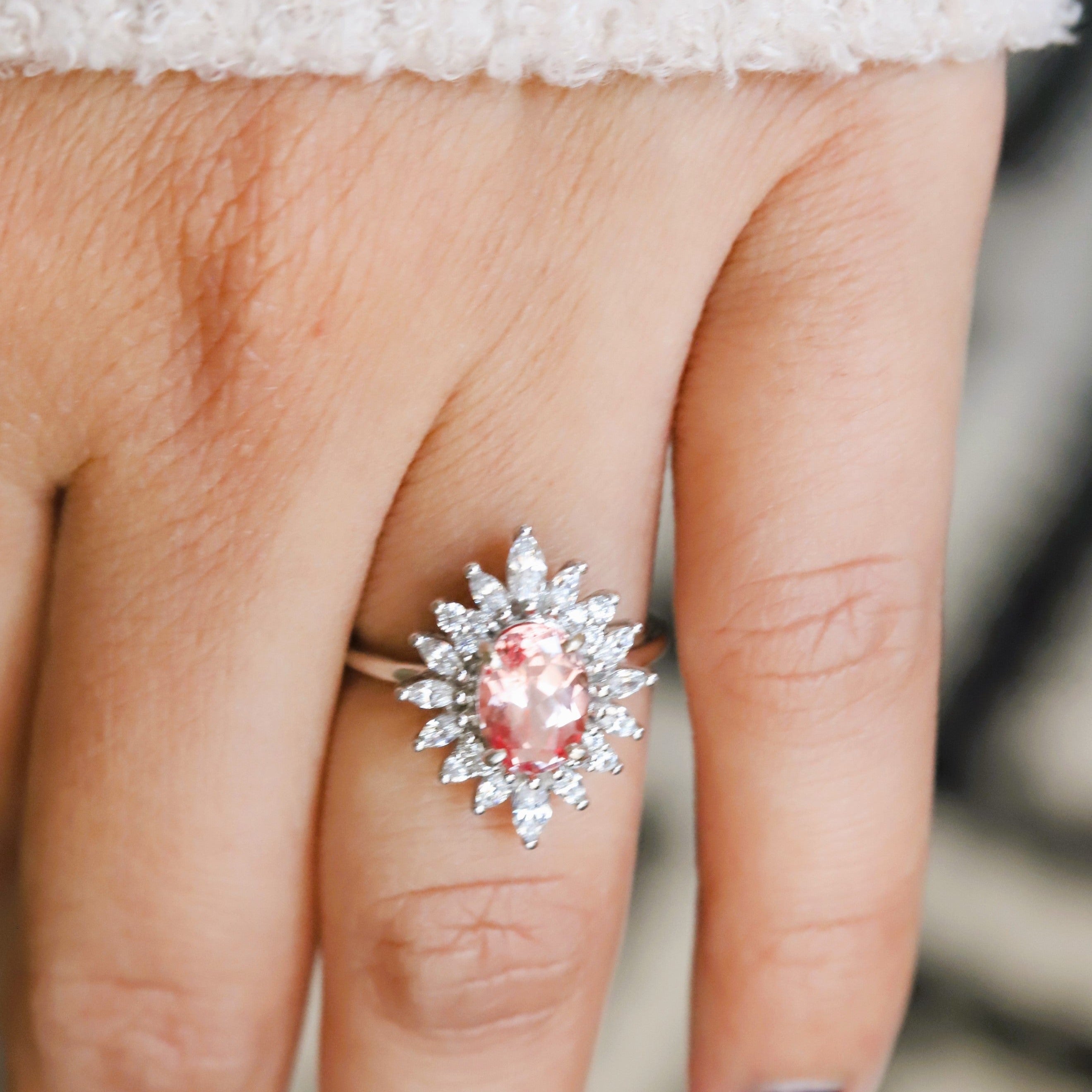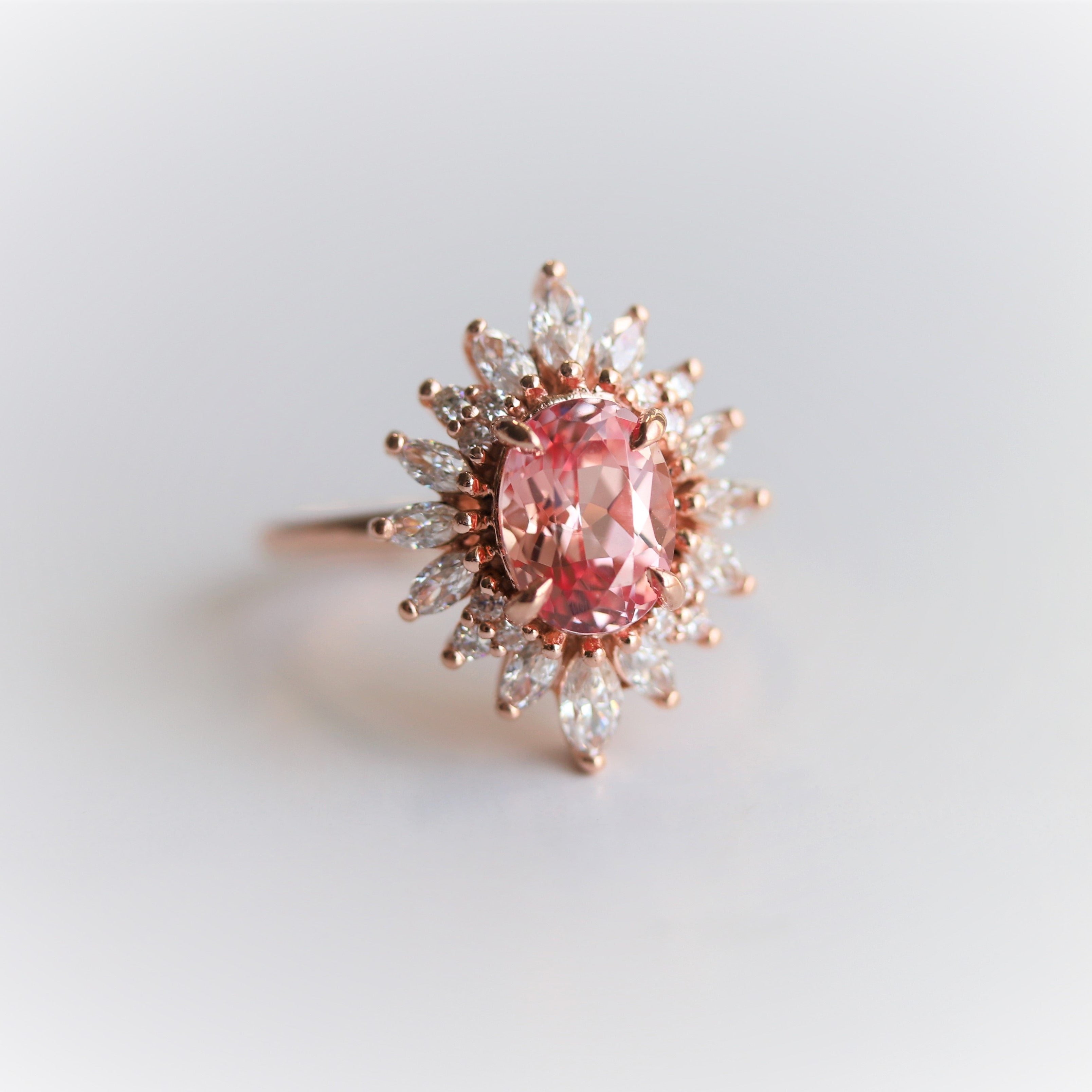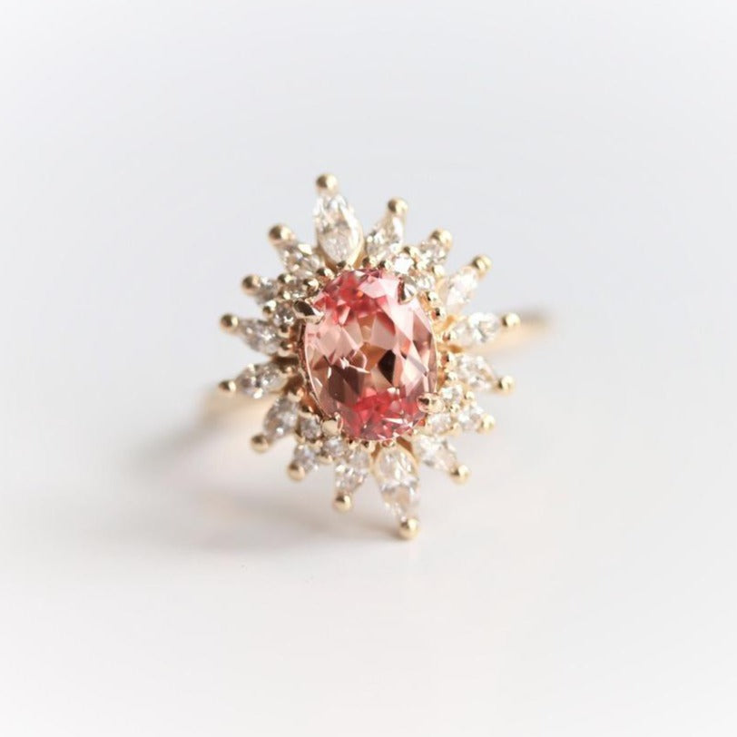 With the desired color of morganite and the hardness of corundum, champagne sapphire has a rich brilliance and beauty that is unmatched. As a colored gemstone alternative to the engagement ring, many favor champagne sapphire’s peachy pink hue. Chatham lab-grown champagne sapphire has exceptional color, brilliance and clarity. The stone is set in our Lana oval-shaped setting, it is secured in a four-prong in the center, framed by a glittering cluster of marquise and round sparkling side stone of your choice. Created on a graceful slim band, this gorgeous ring awaits your selection.
