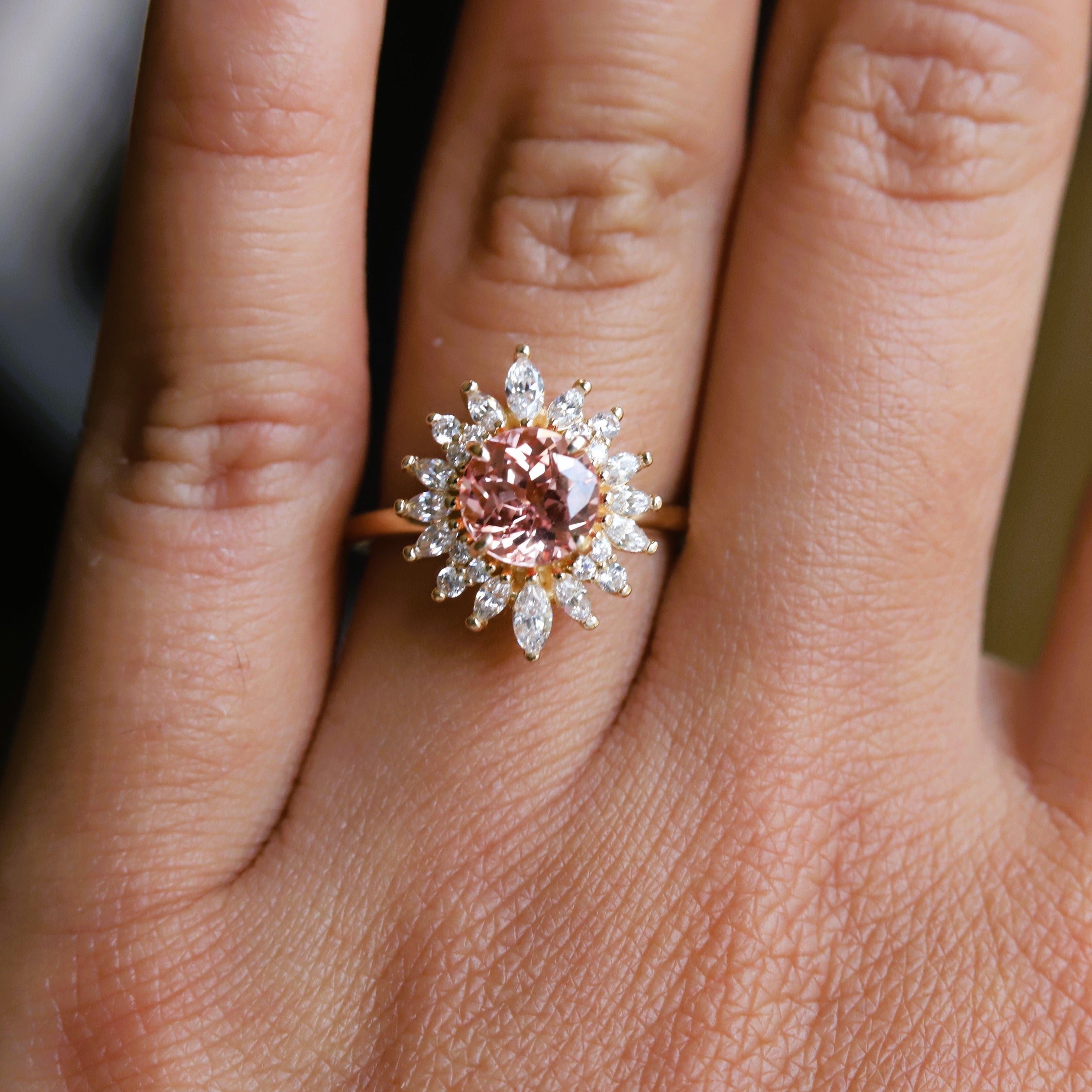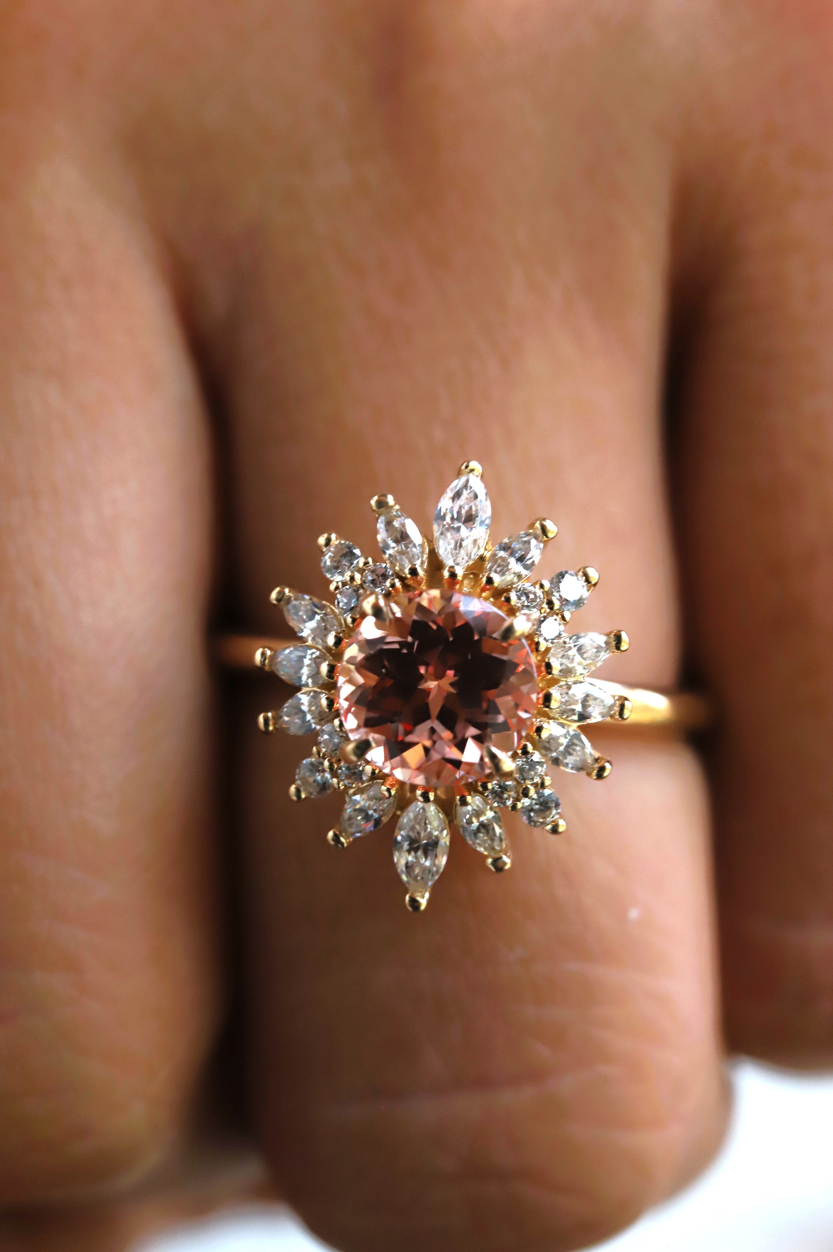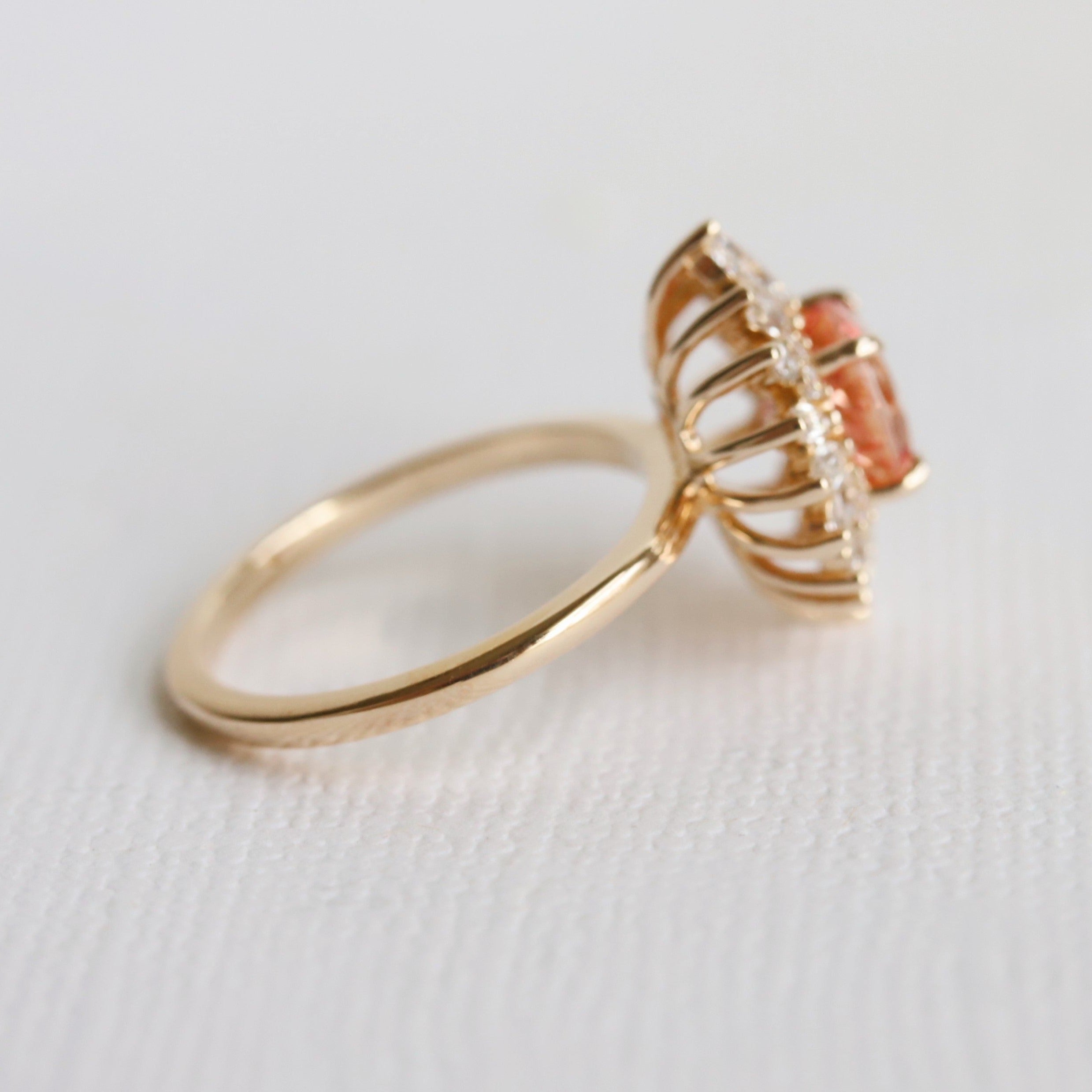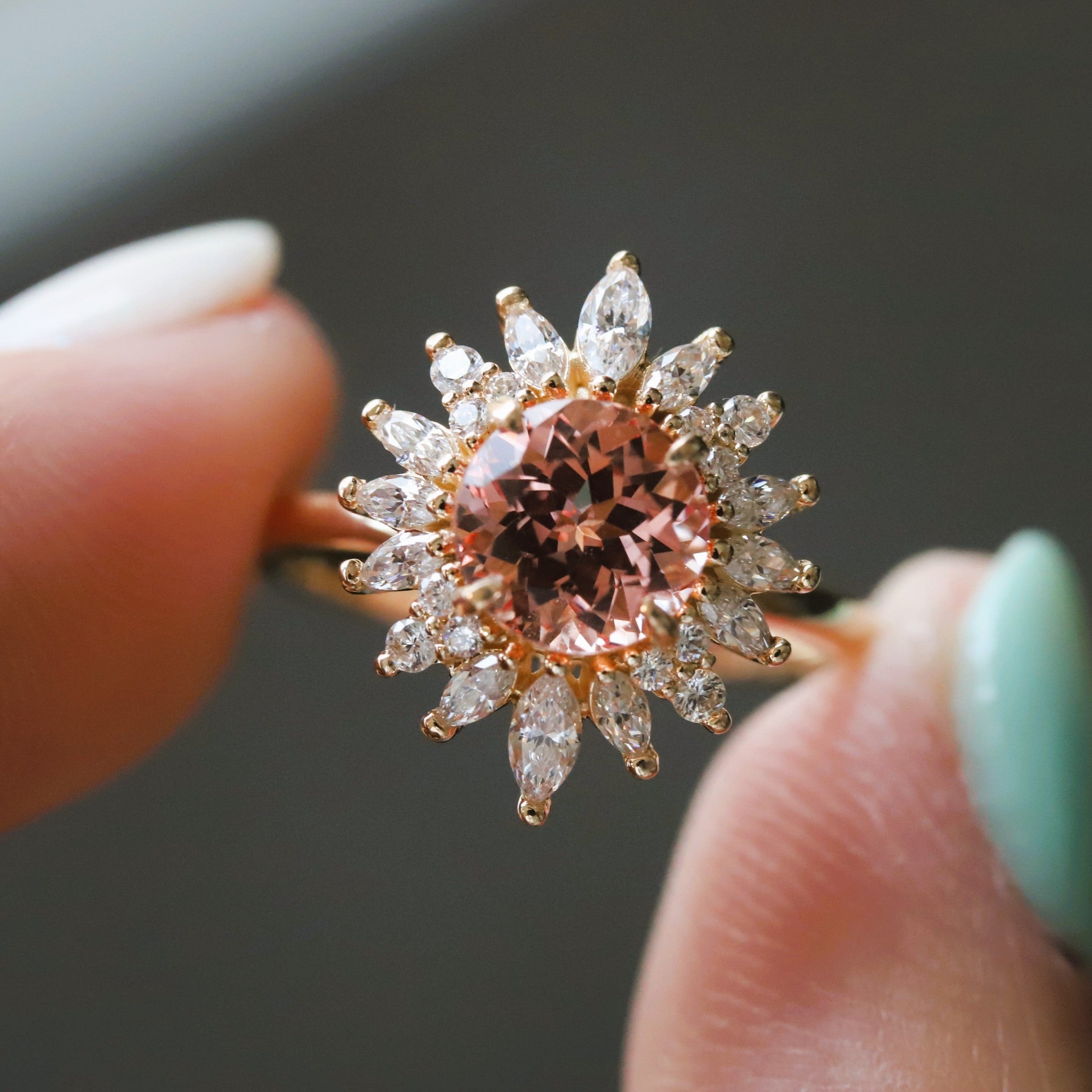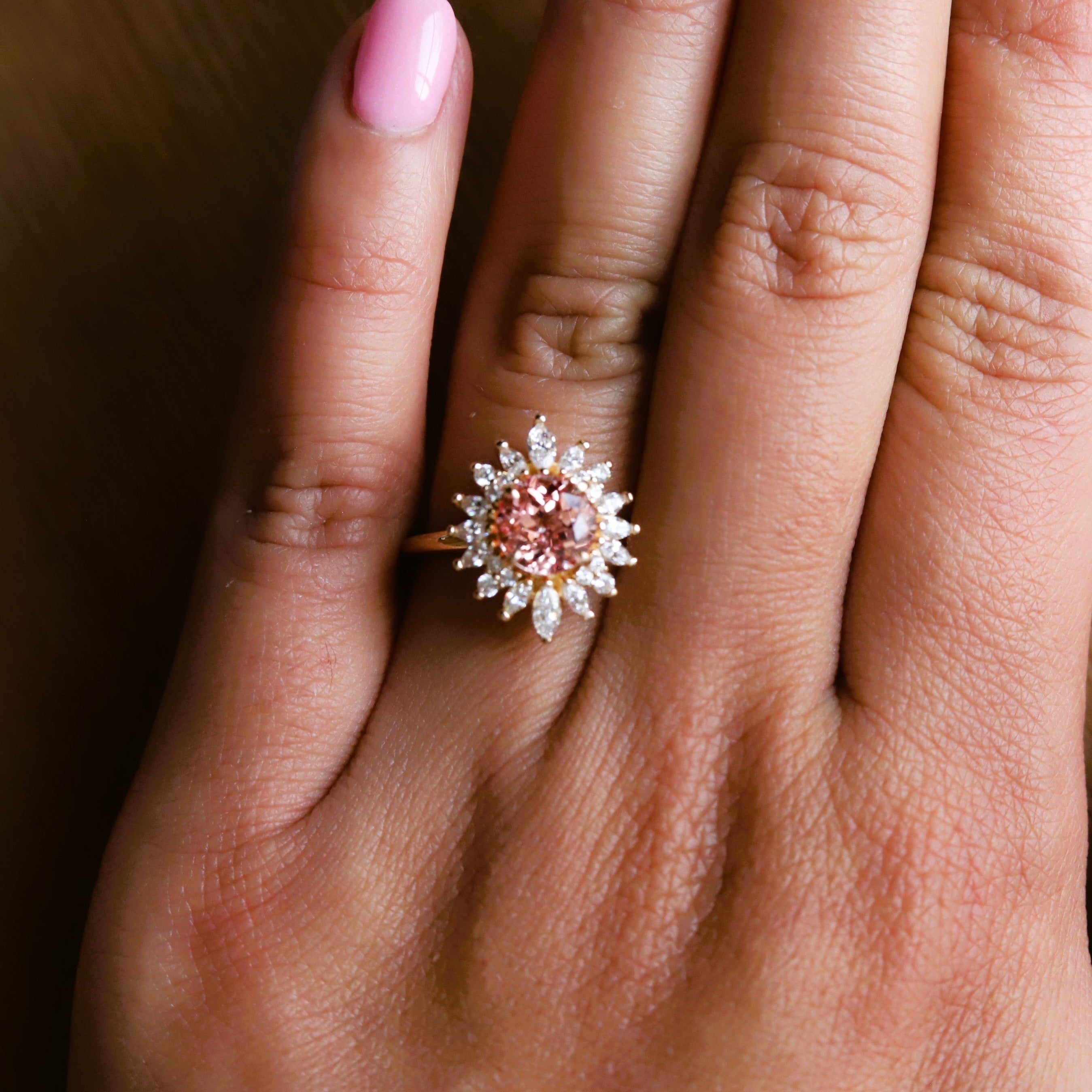 An affordable alternative to natural peach sapphire, and a more durable alternative to morganite. This Chatham™ Lab Created Champagne Sapphire is set in the center of our iconic Lana setting, surrounded by a dazzling halo of marquise and round stones. The shimmering cluster of side diamonds adds allure, while the slim band offers both elegance and comfort. Perfect for any occasion, this meticulously crafted ring is destined to be cherished for generations.