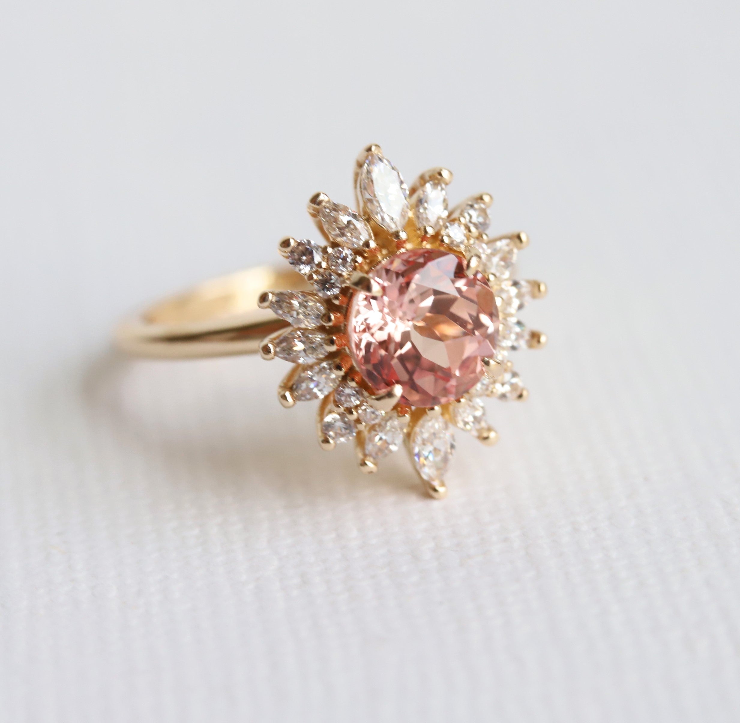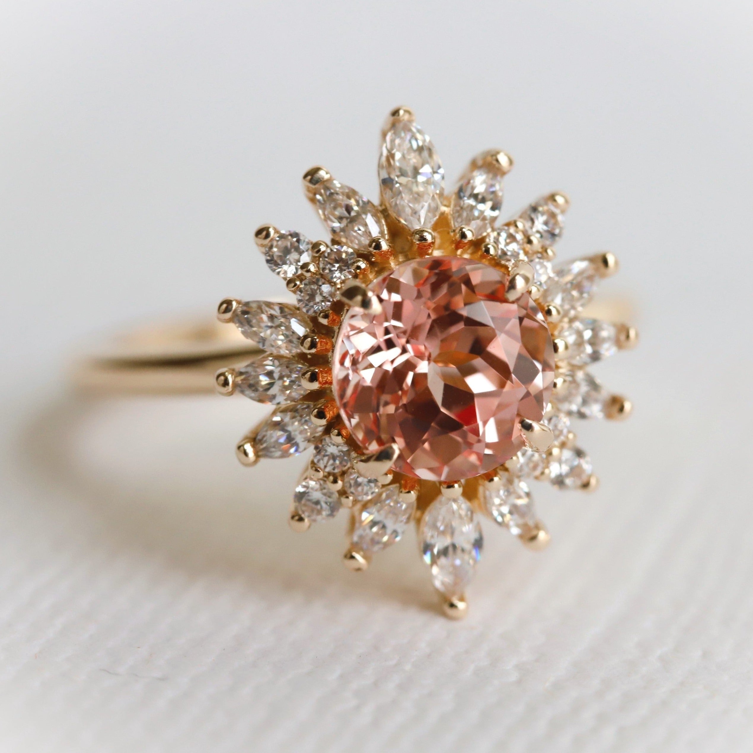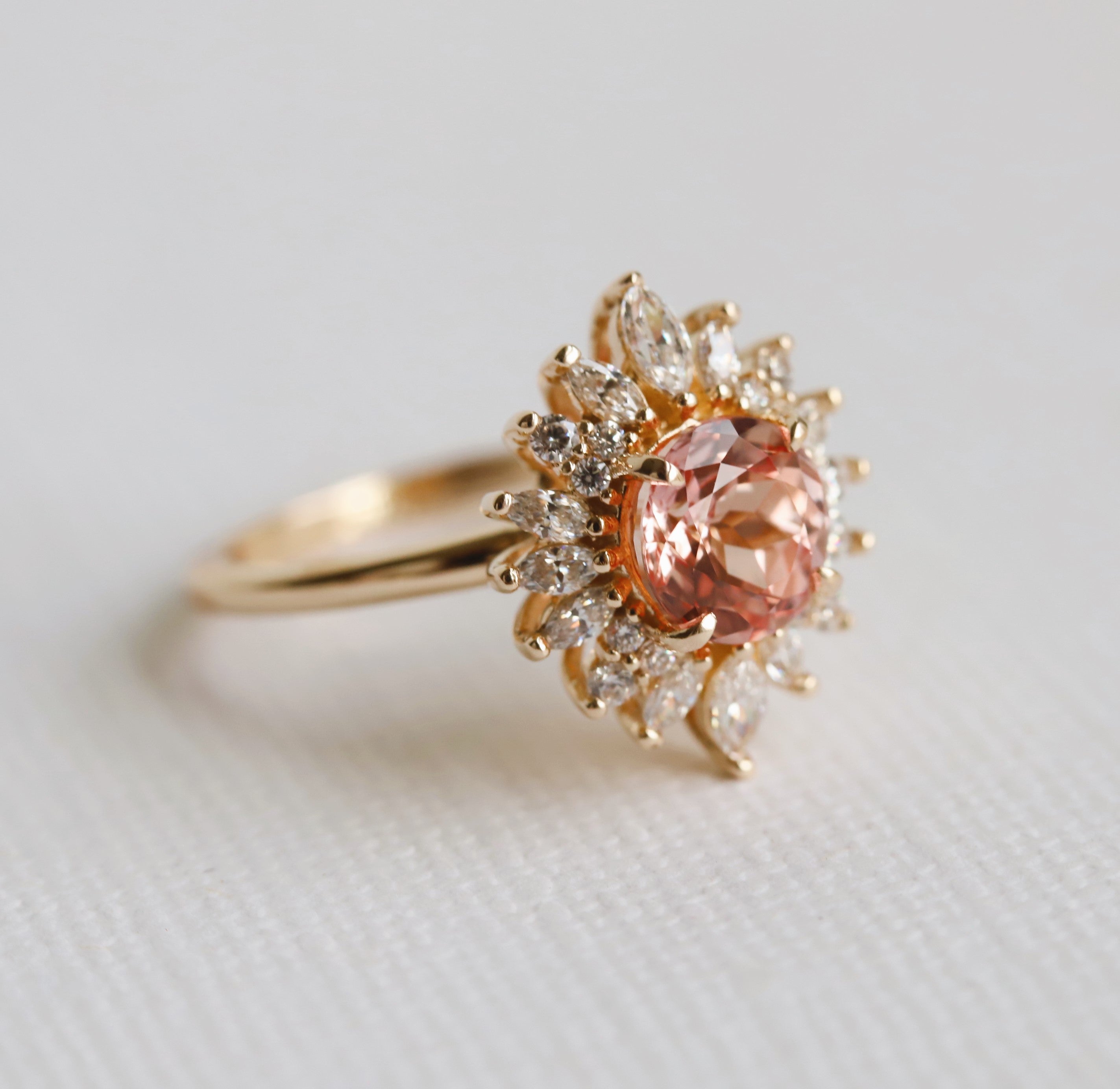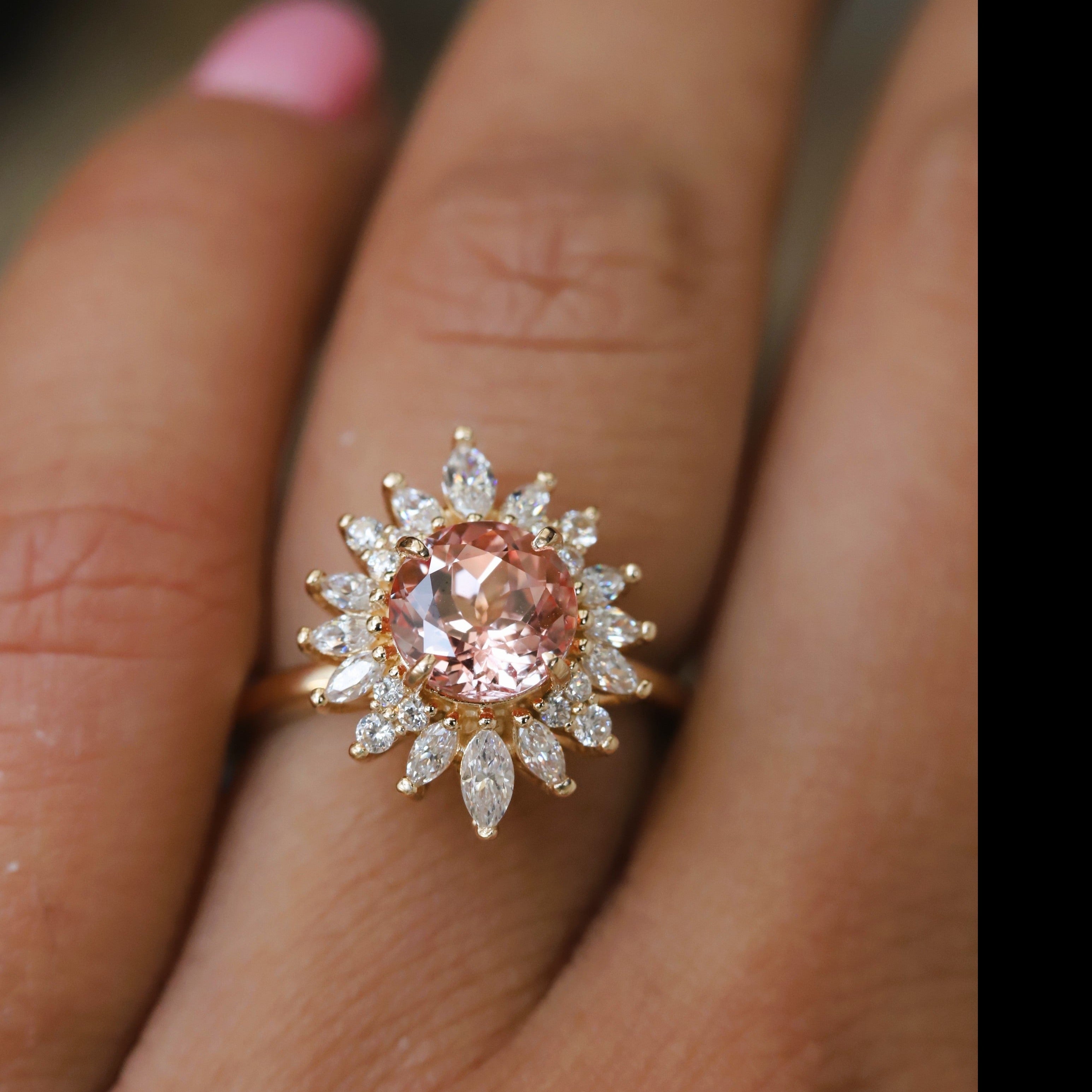 An affordable alternative to natural peach sapphire, and a more durable alternative to morganite. This Chatham™ Lab Created Champagne Sapphire is set in the center of our iconic Lana setting, surrounded by a dazzling halo of marquise and round stones. The shimmering cluster of side diamonds adds allure, while the slim band offers both elegance and comfort. Perfect for any occasion, this meticulously crafted ring is destined to be cherished for generations.