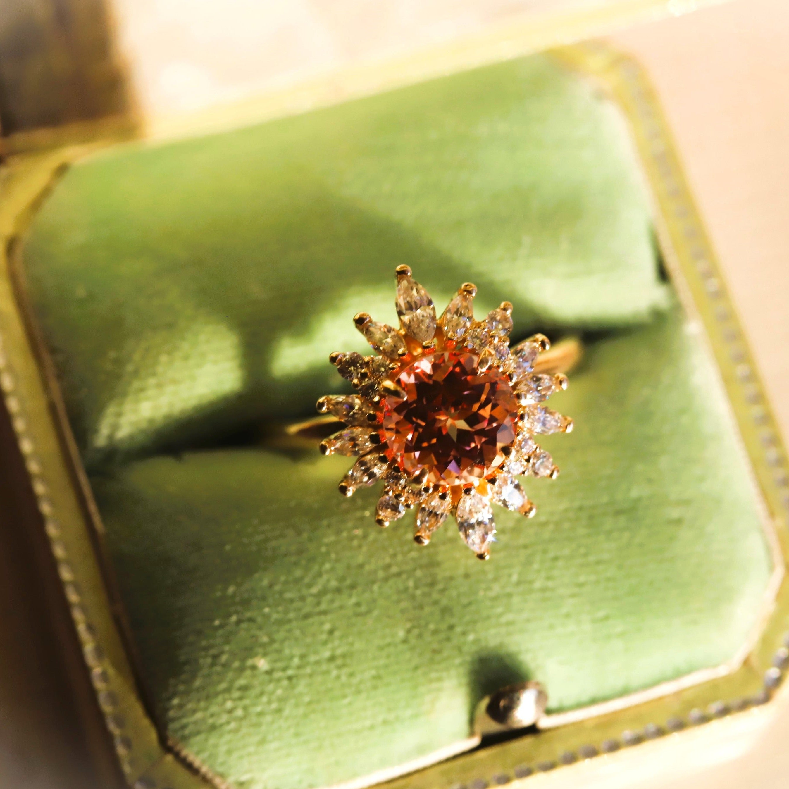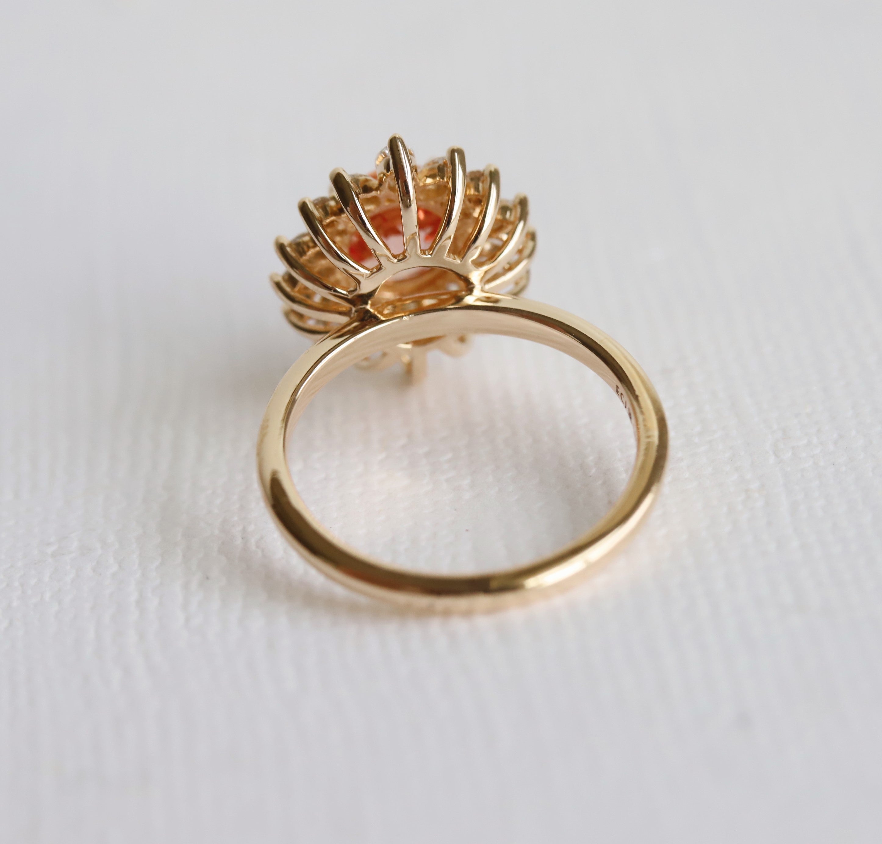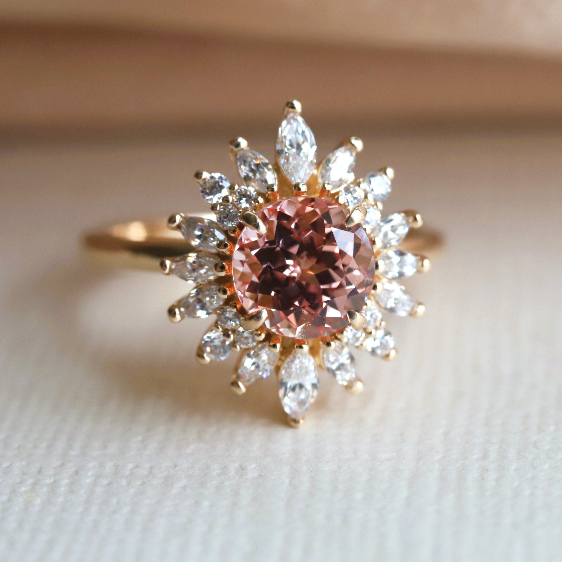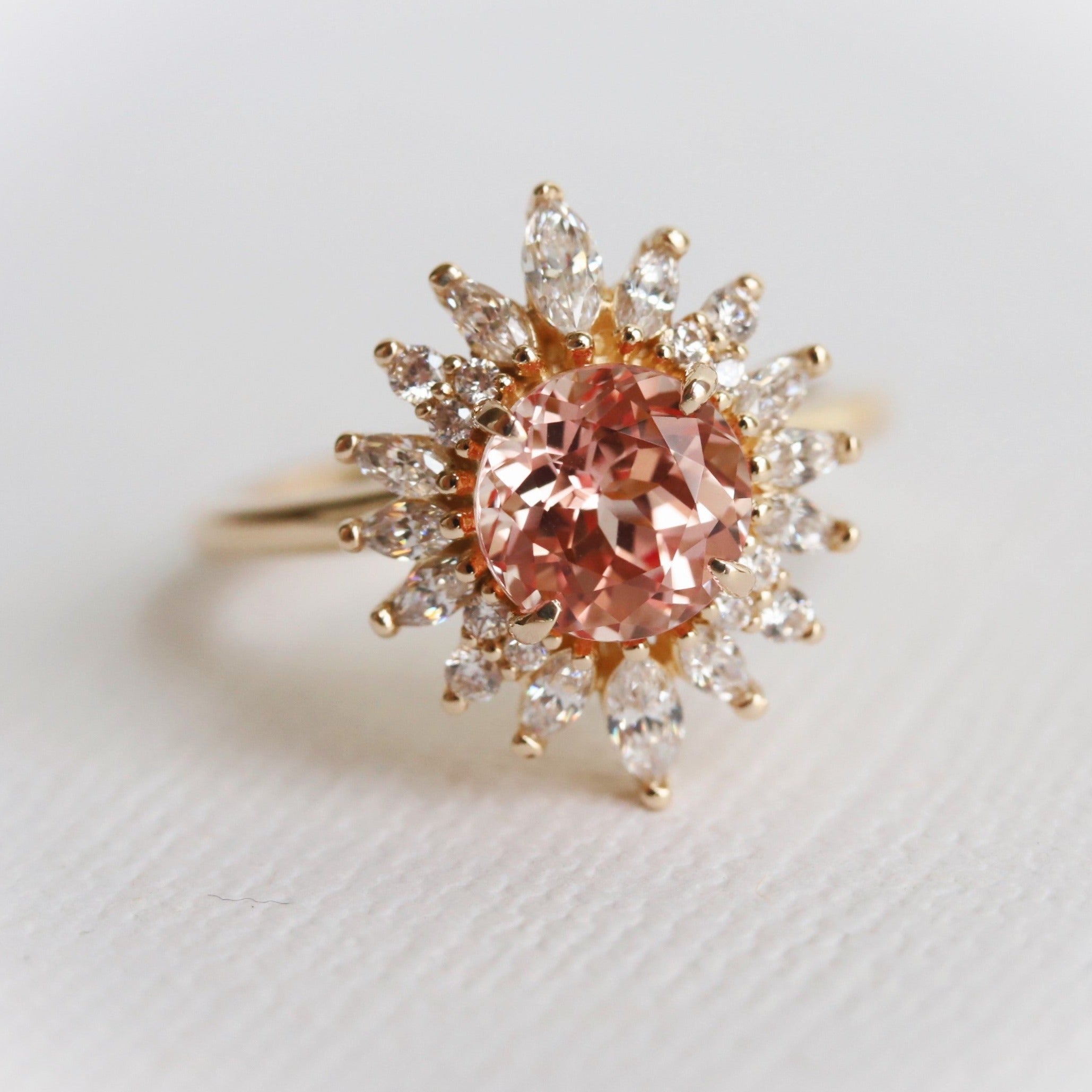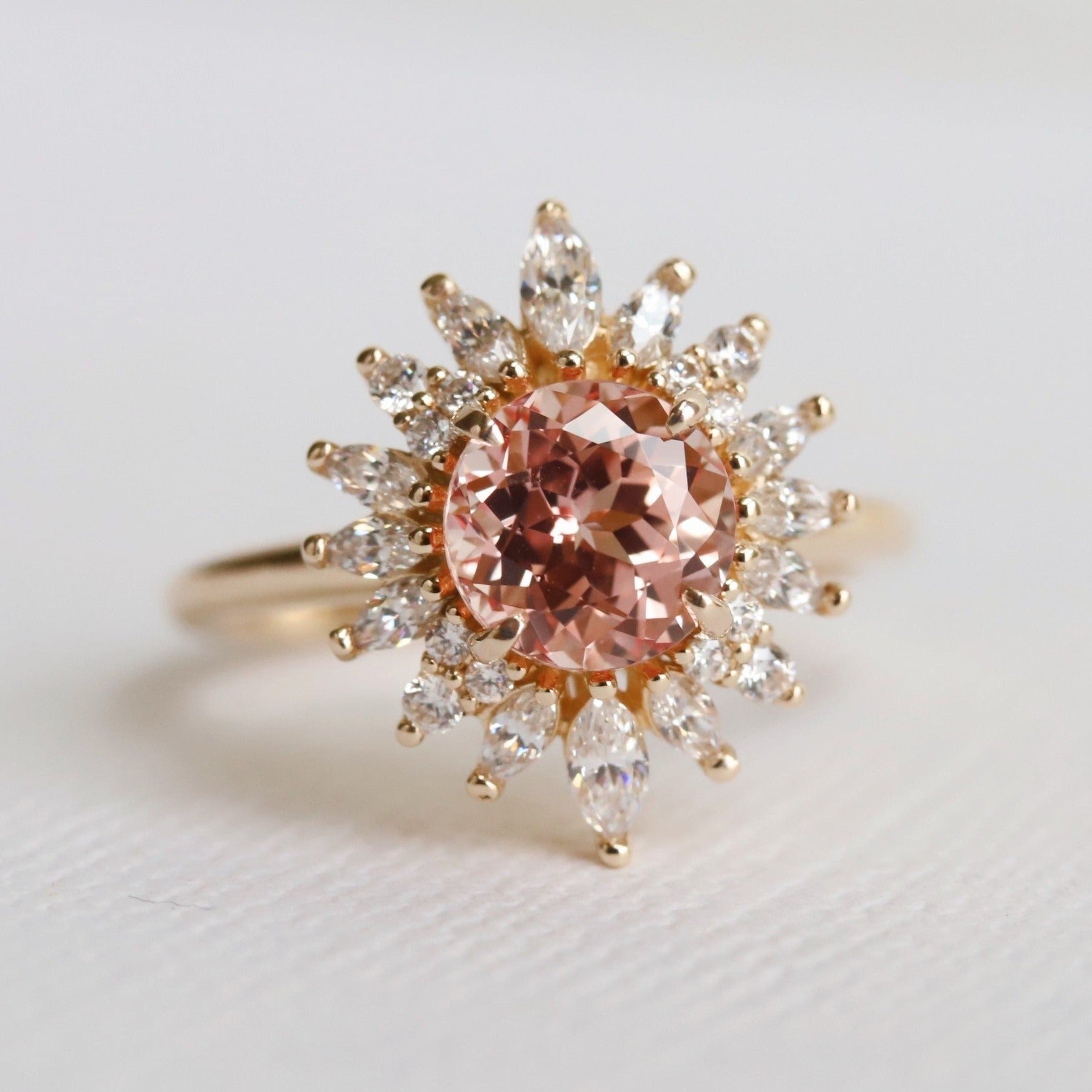 An affordable alternative to natural peach sapphire, and a more durable alternative to morganite. This Chatham™ Lab Created Champagne Sapphire is set in the center of our iconic Lana setting, surrounded by a dazzling halo of marquise and round stones. The shimmering cluster of side diamonds adds allure, while the slim band offers both elegance and comfort. Perfect for any occasion, this meticulously crafted ring is destined to be cherished for generations.