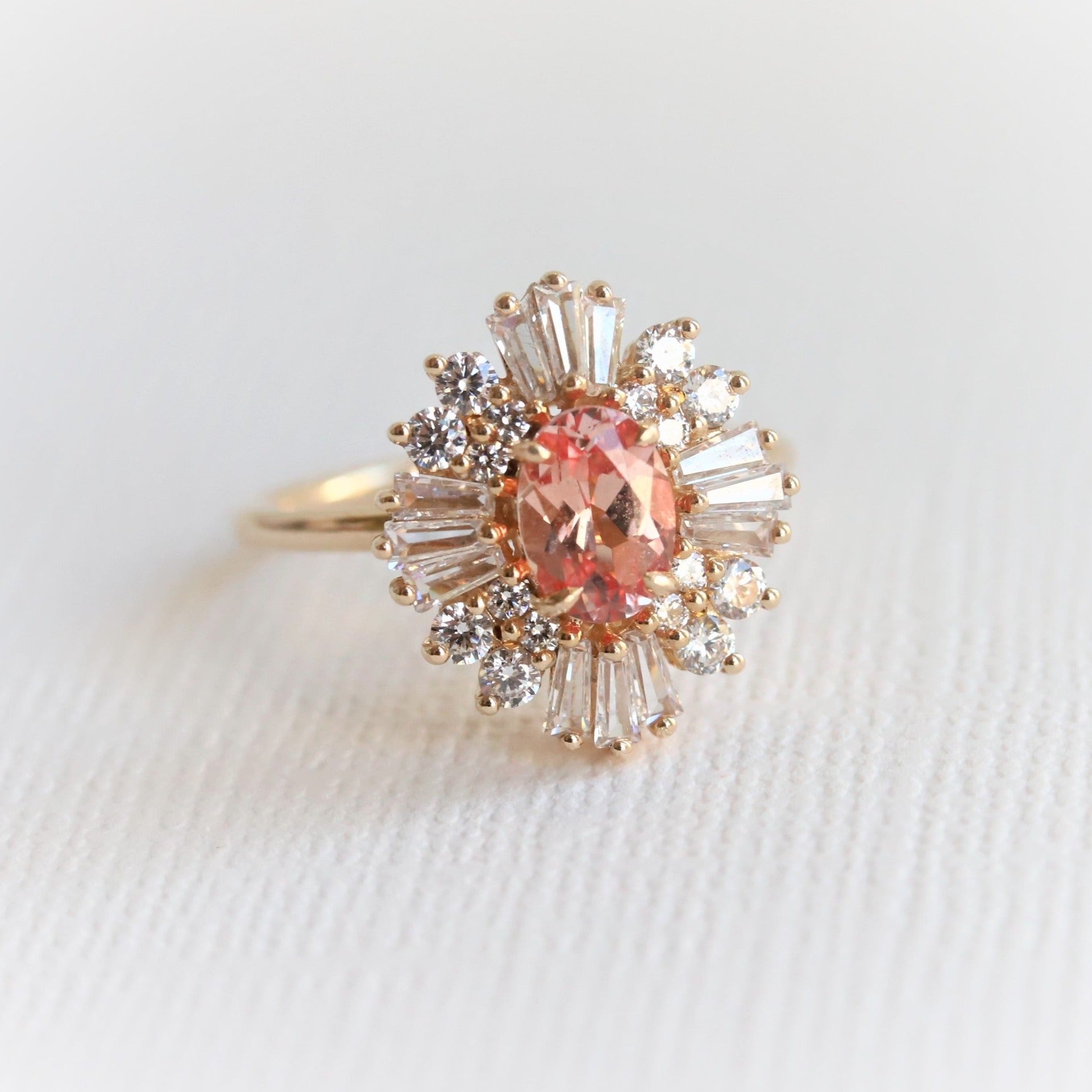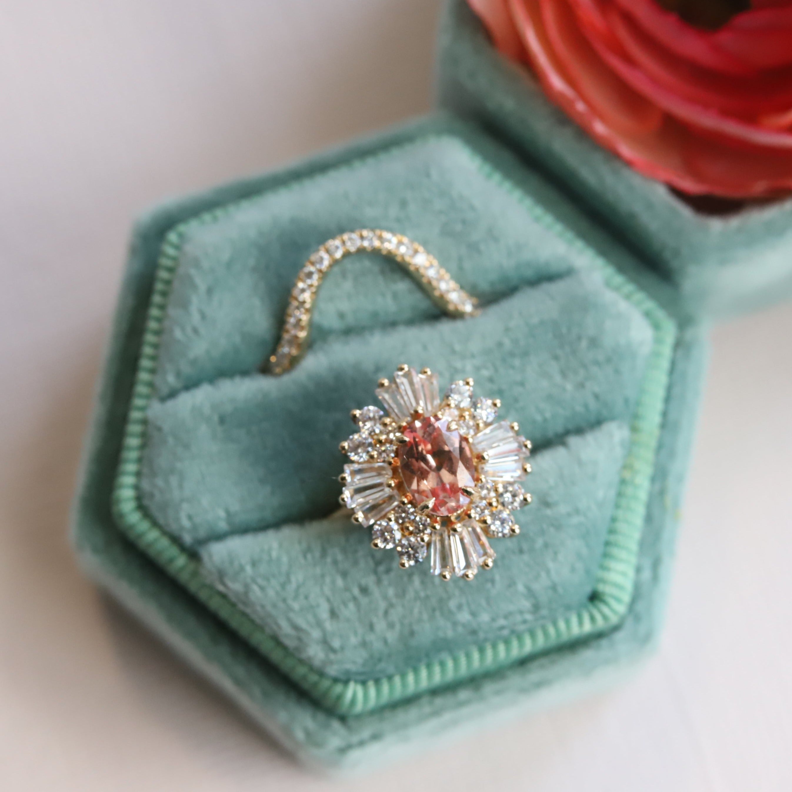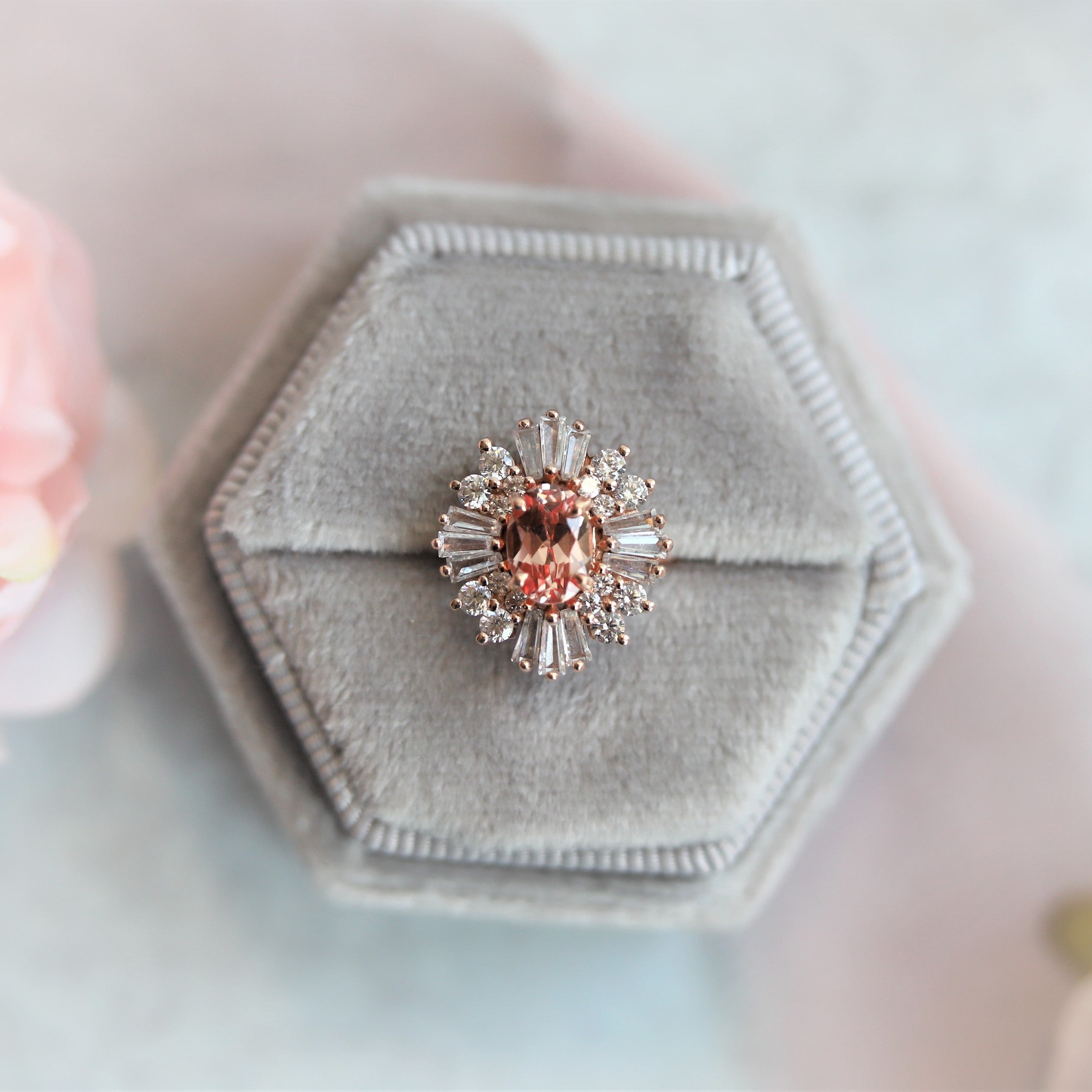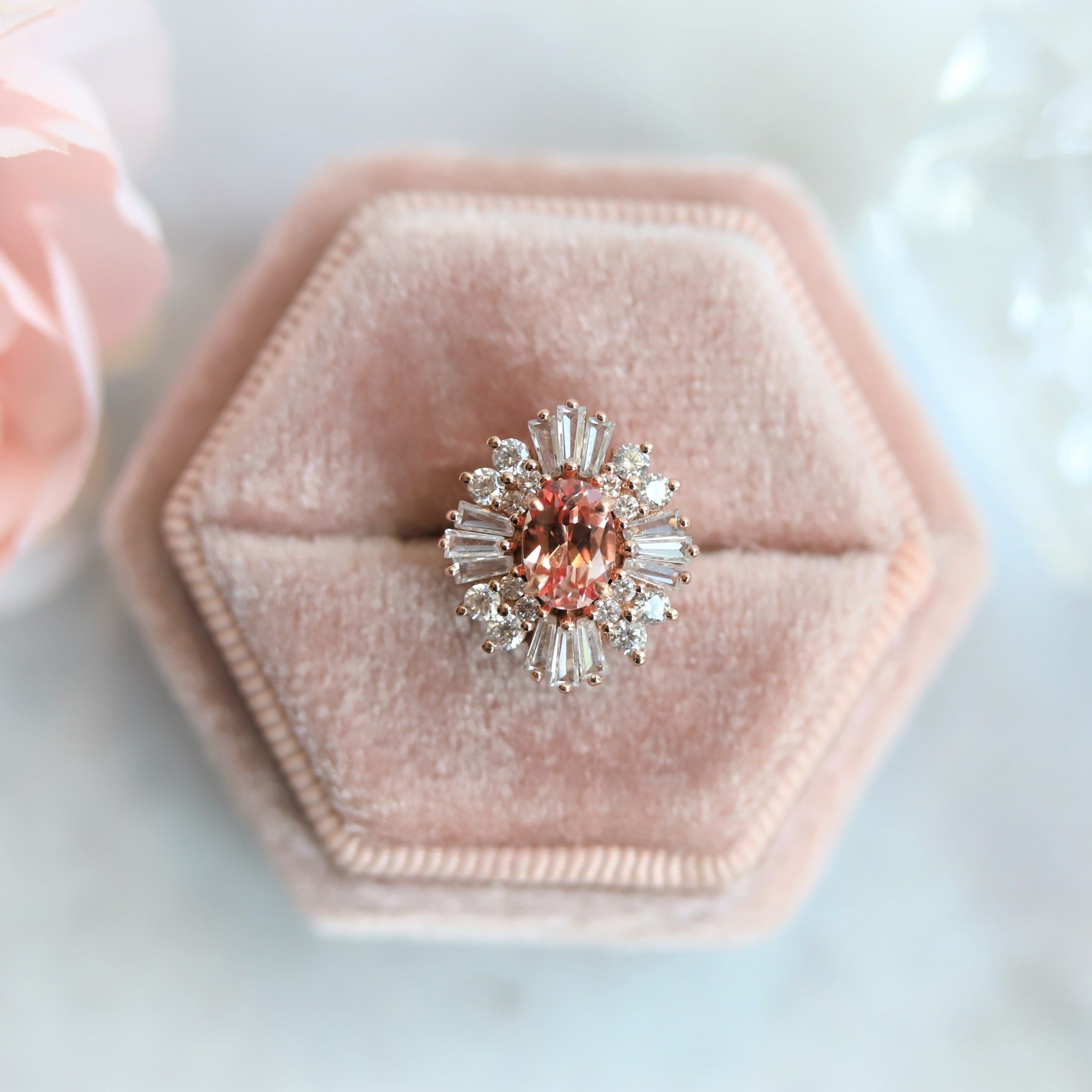 A champagne sapphire of remarkable beauty takes center stage in this refined engagement ring. This lab-grown gemstone from Chatham combines the romantic peachy-rose allure associated with morganite alongside the exceptional hardness of corundum—offering both aesthetic elegance and practical durability. Brilliant and flawlessly clear, the oval stone is secured within the Victoria setting's four-prong embrace, where it's complemented by a glittering surround of tapered baguettes and round side stones. The slender band provides a graceful foundation, creating a design of quiet sophistication that will endure as a cherished heirloom.