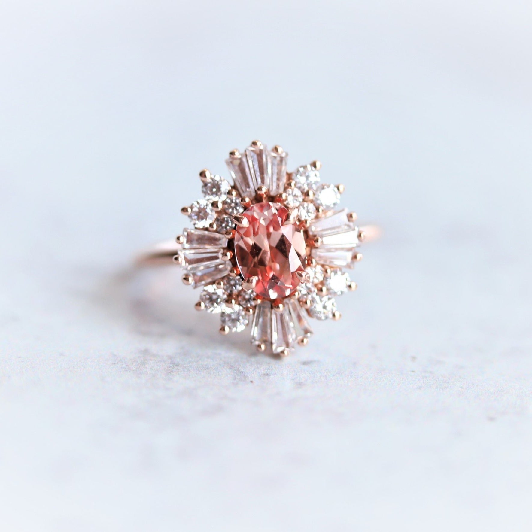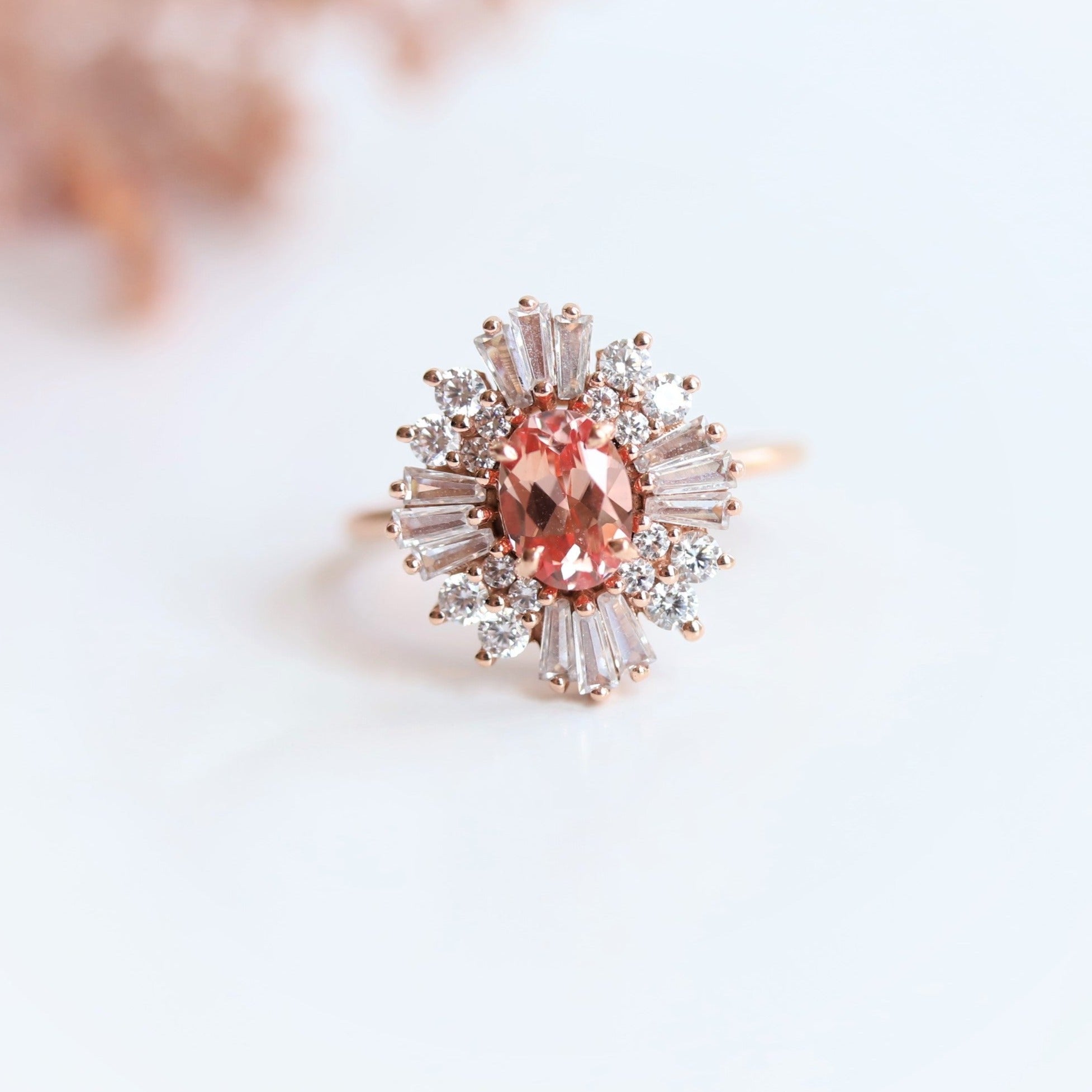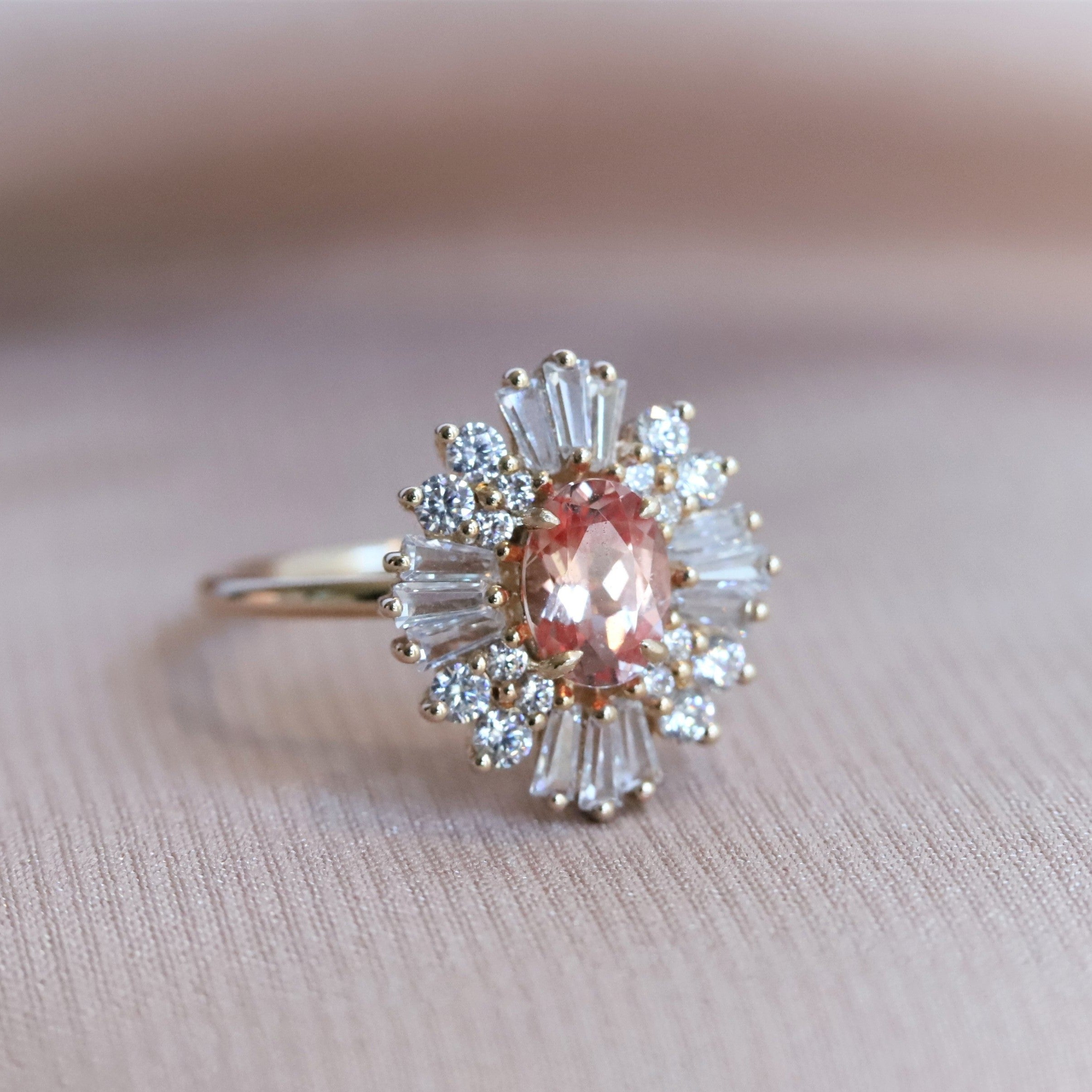 A champagne sapphire of remarkable beauty takes center stage in this refined engagement ring. This lab-grown gemstone from Chatham combines the romantic peachy-rose allure associated with morganite alongside the exceptional hardness of corundum—offering both aesthetic elegance and practical durability. Brilliant and flawlessly clear, the oval stone is secured within the Victoria setting's four-prong embrace, where it's complemented by a glittering surround of tapered baguettes and round side stones. The slender band provides a graceful foundation, creating a design of quiet sophistication that will endure as a cherished heirloom.