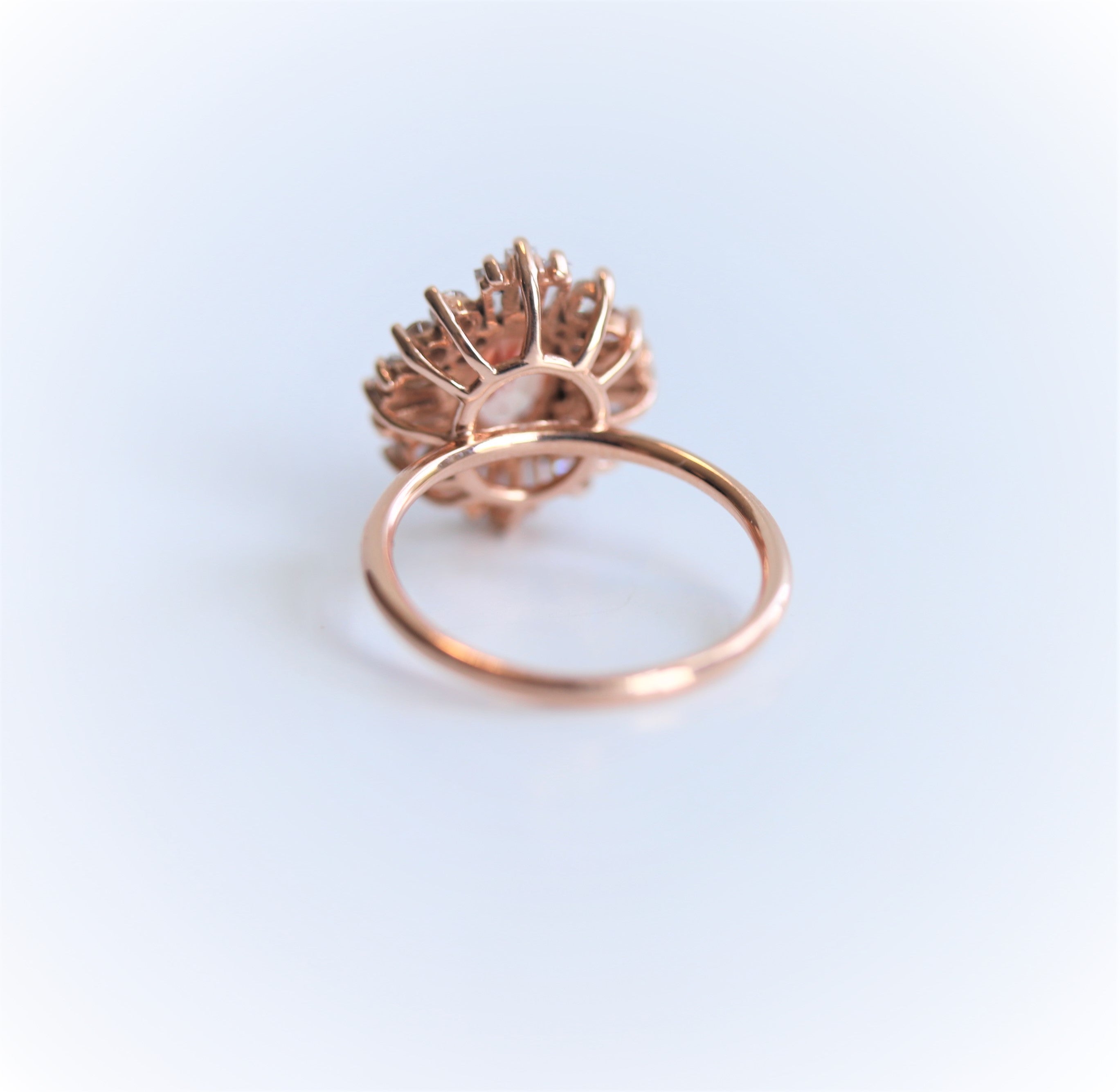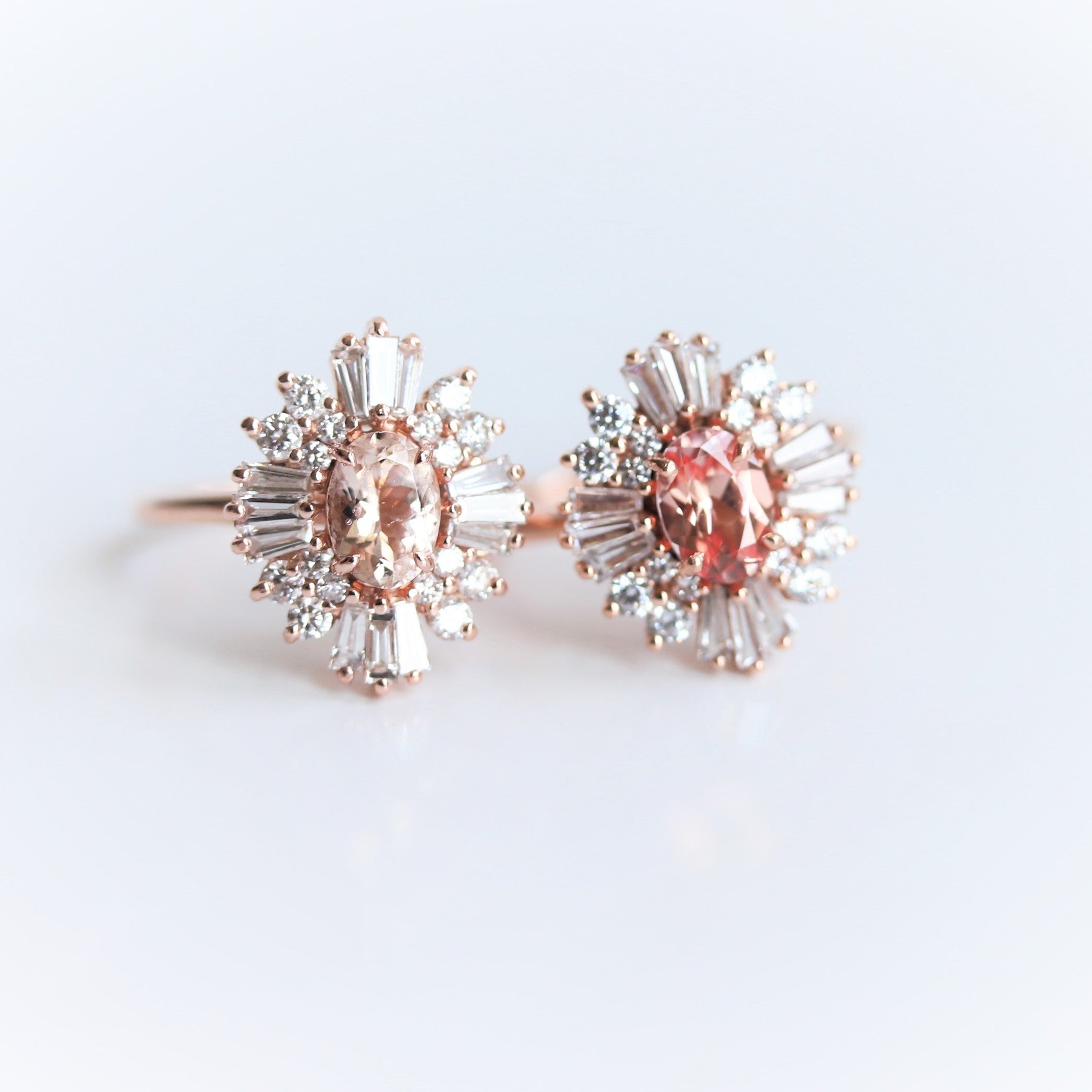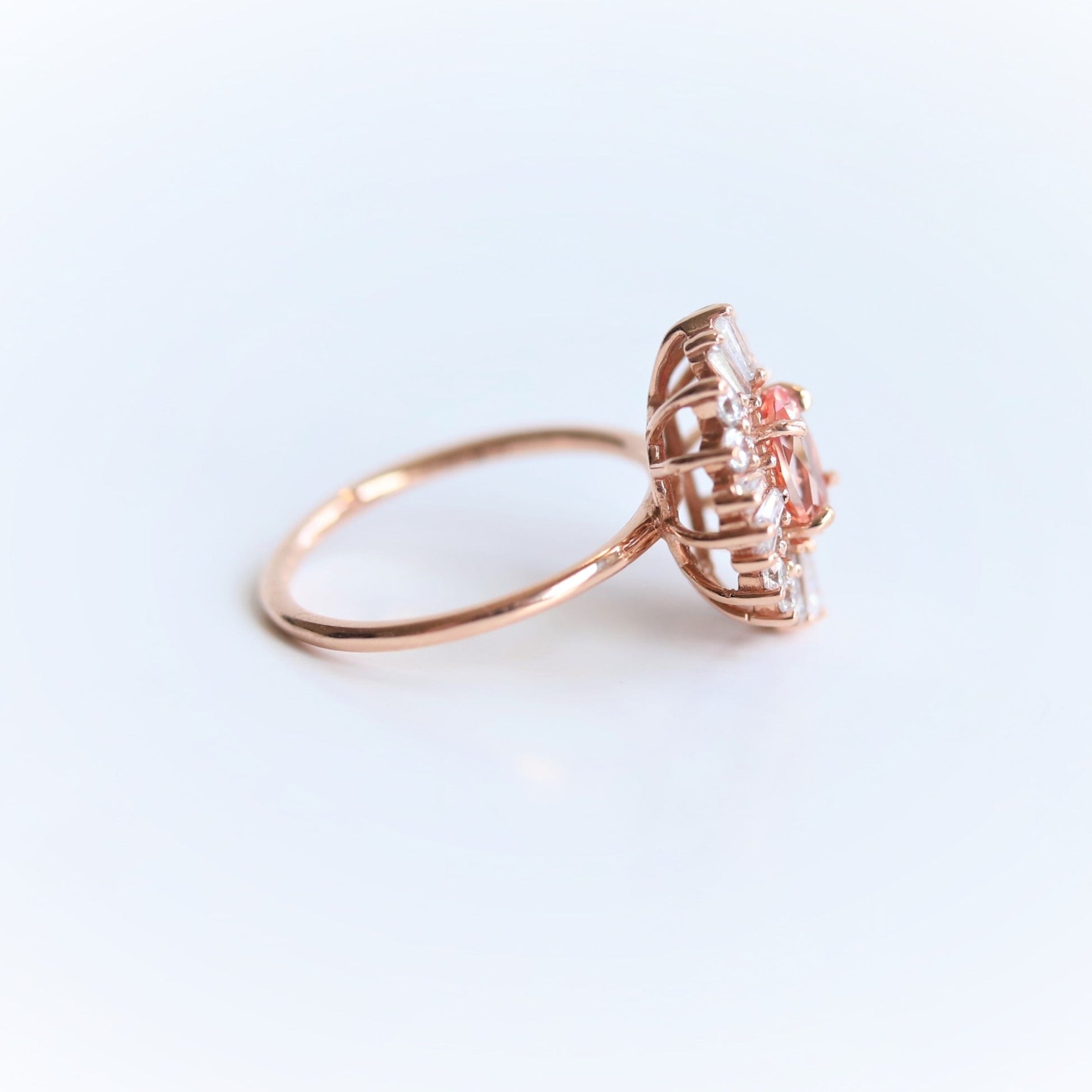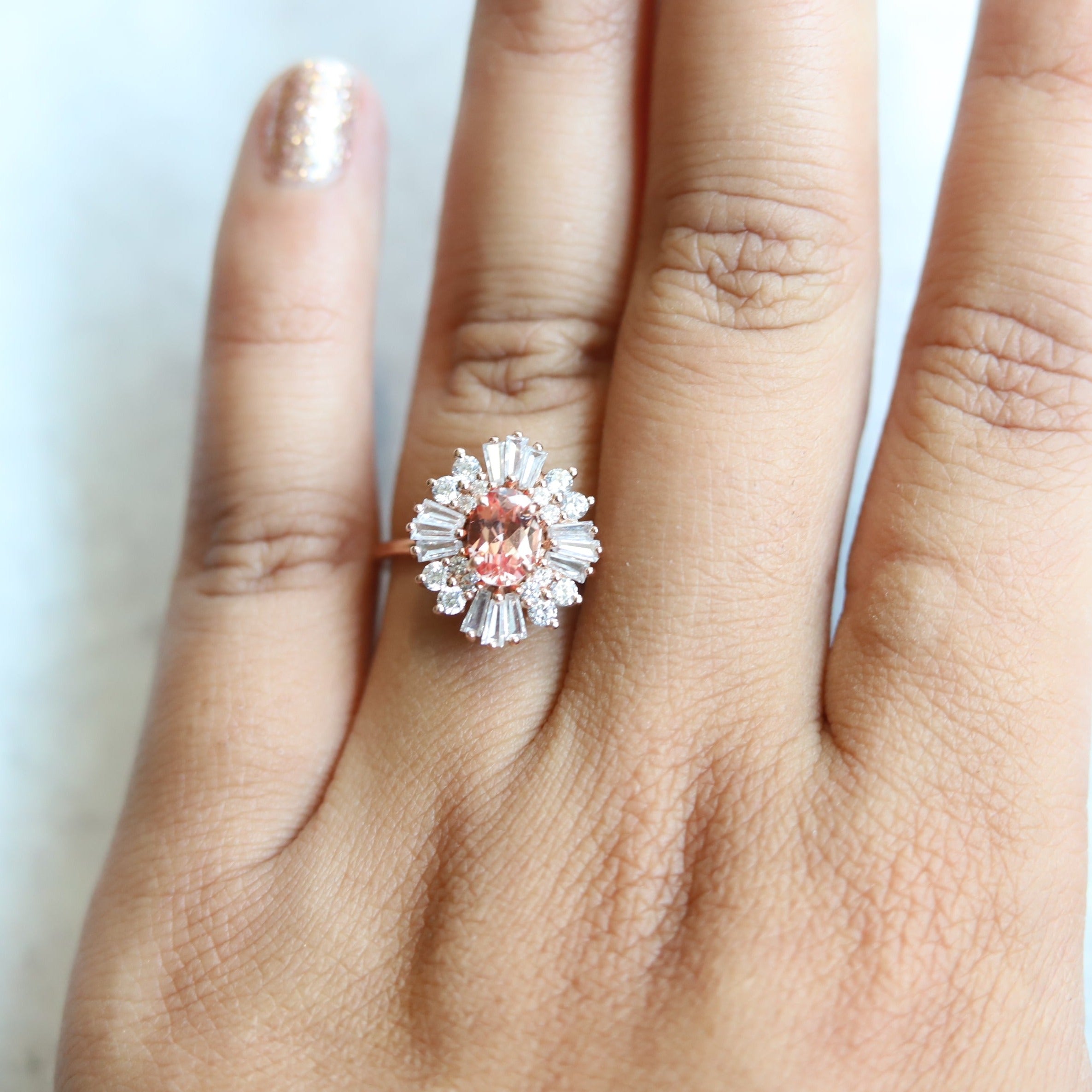 A champagne sapphire of remarkable beauty takes center stage in this refined engagement ring. This lab-grown gemstone from Chatham combines the romantic peachy-rose allure associated with morganite alongside the exceptional hardness of corundum—offering both aesthetic elegance and practical durability. Brilliant and flawlessly clear, the oval stone is secured within the Victoria setting's four-prong embrace, where it's complemented by a glittering surround of tapered baguettes and round side stones. The slender band provides a graceful foundation, creating a design of quiet sophistication that will endure as a cherished heirloom.